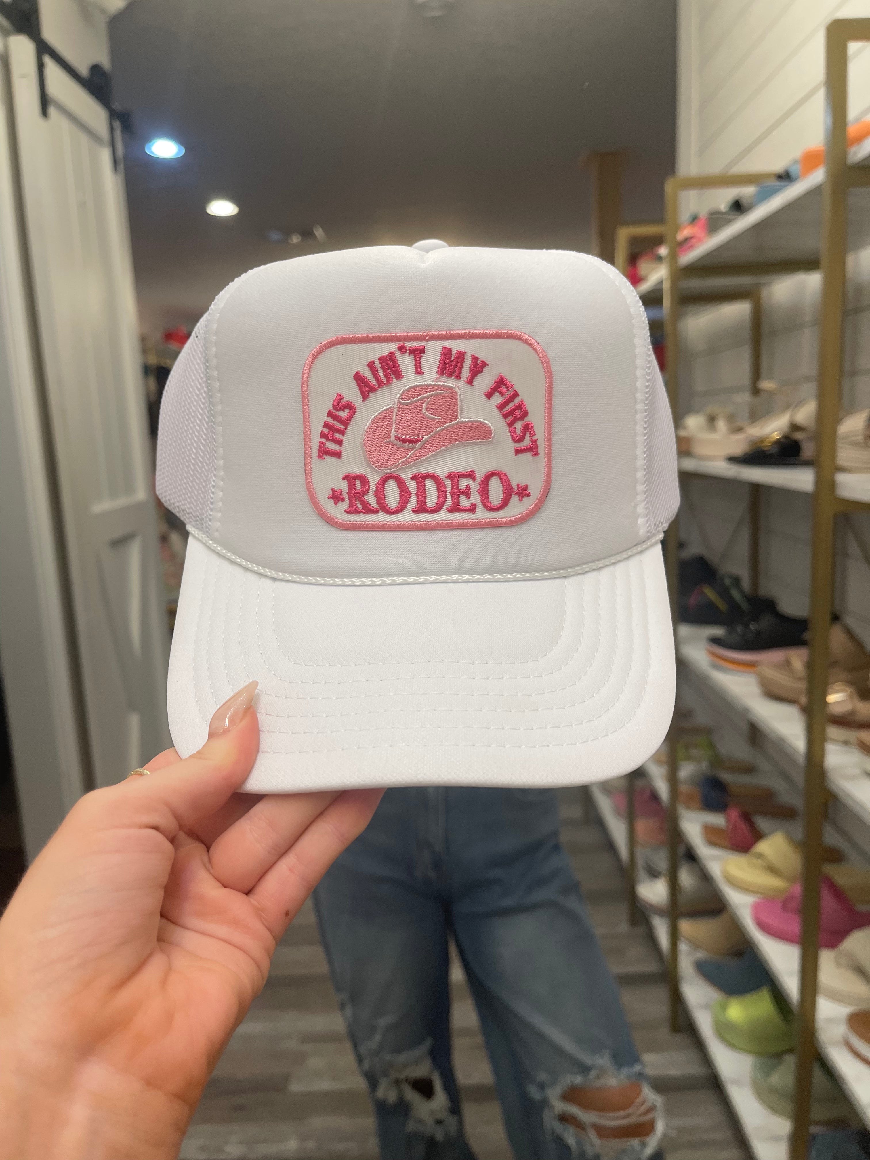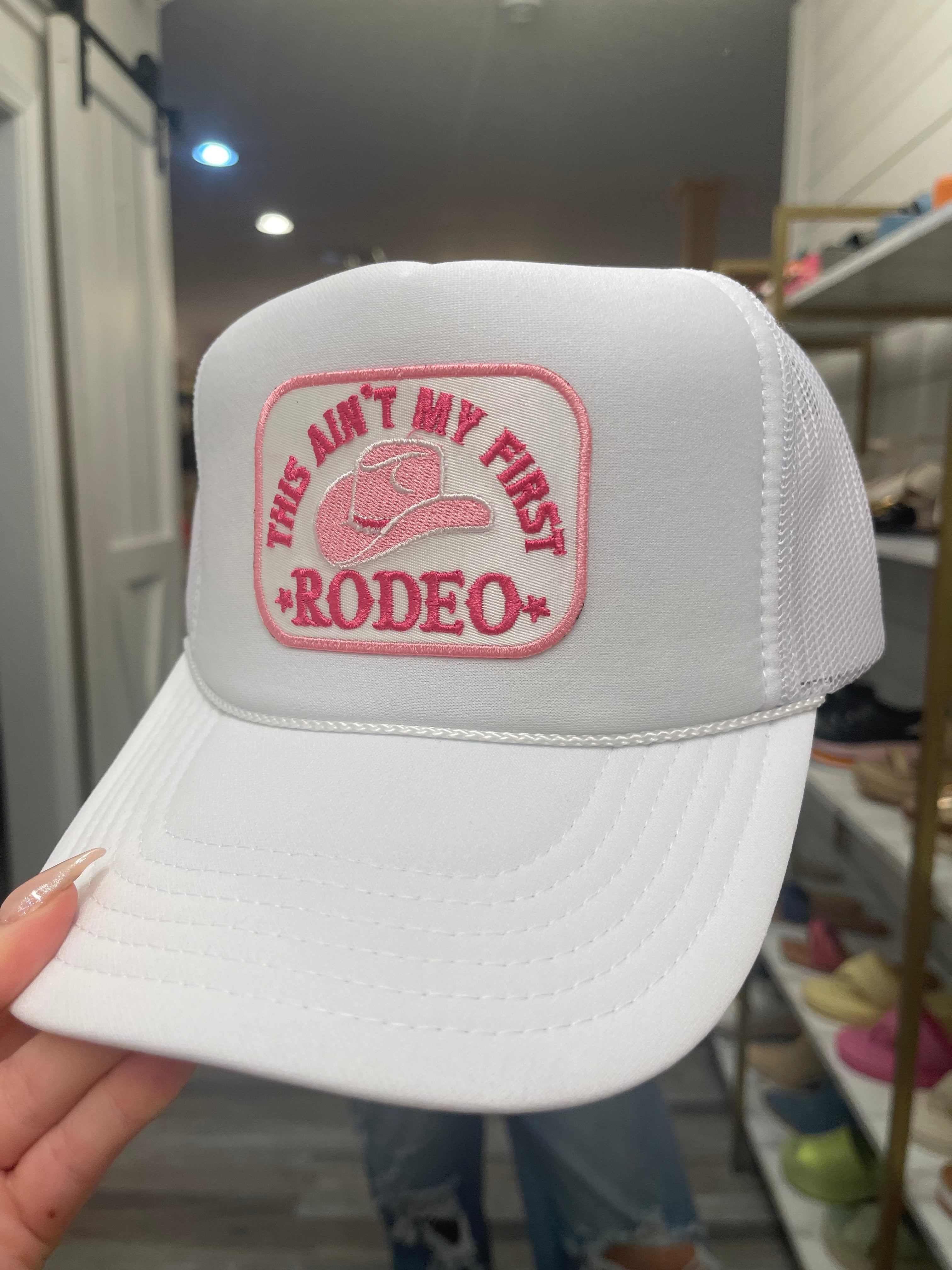 Aint My First Rodeo embroidered patch on your favorite foam trucker hat. Trucker hat has a foam front, mesh back with adjustable snapback enclosure. Add a light pink trucker hat chain for the perfect combination!