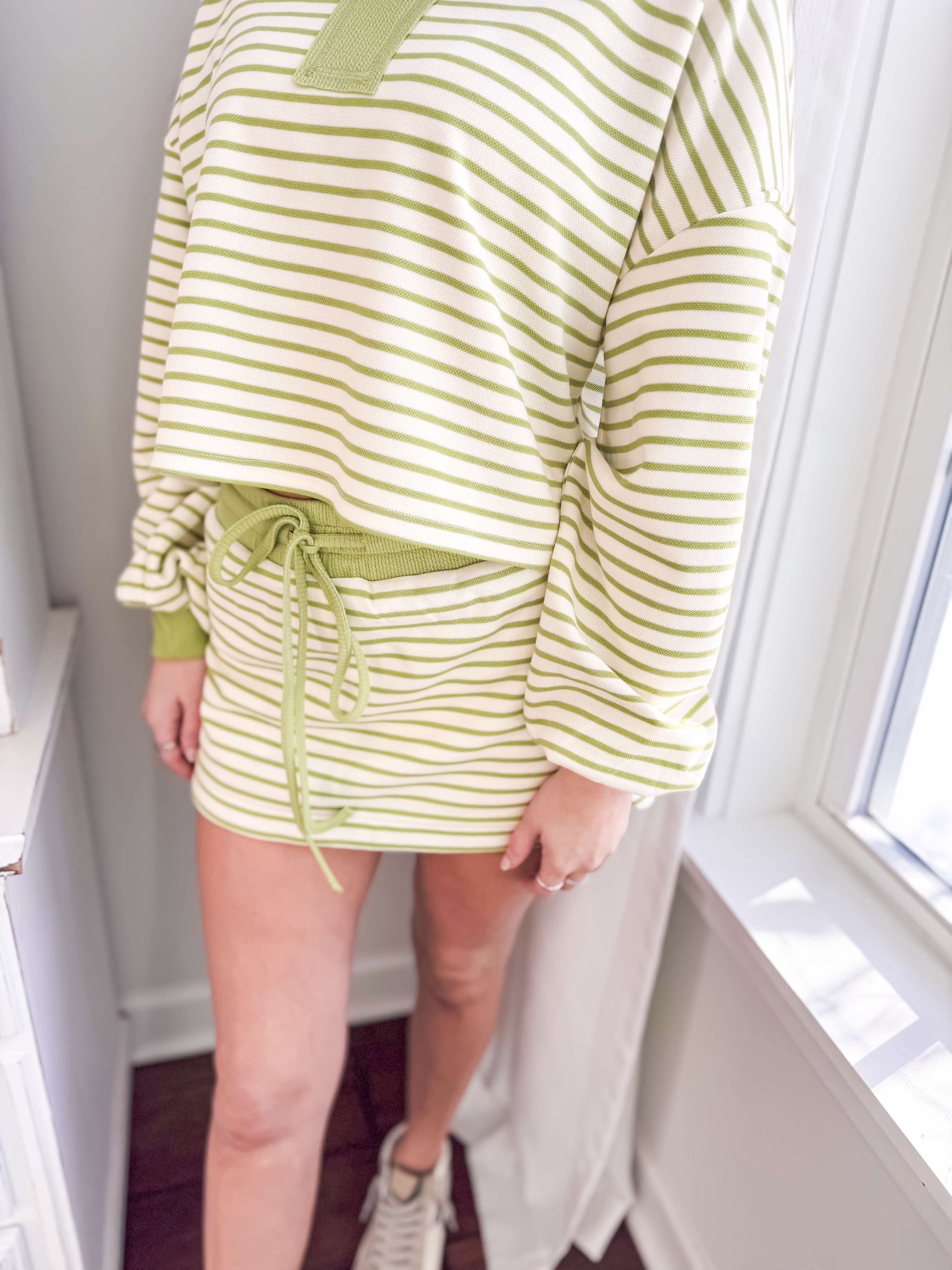 BOTTOM - Product Detail: This knit mini skirt features horizontal stripes in contrasting colors, a comfortable elastic waistband with an adjustable drawstring tie, side slits for added mobility, a relaxed fit, and a soft short lining for extra coverage and comfort.