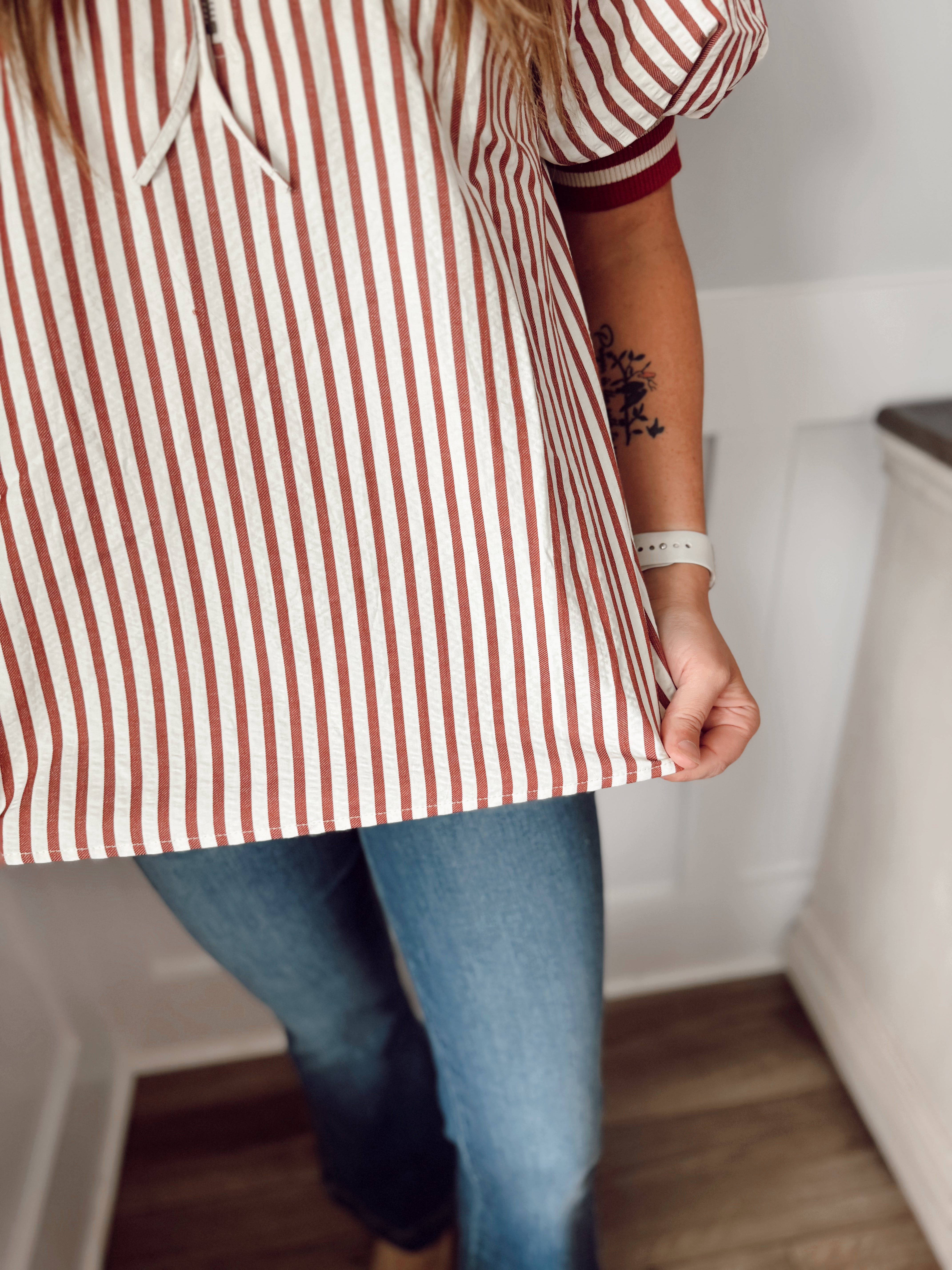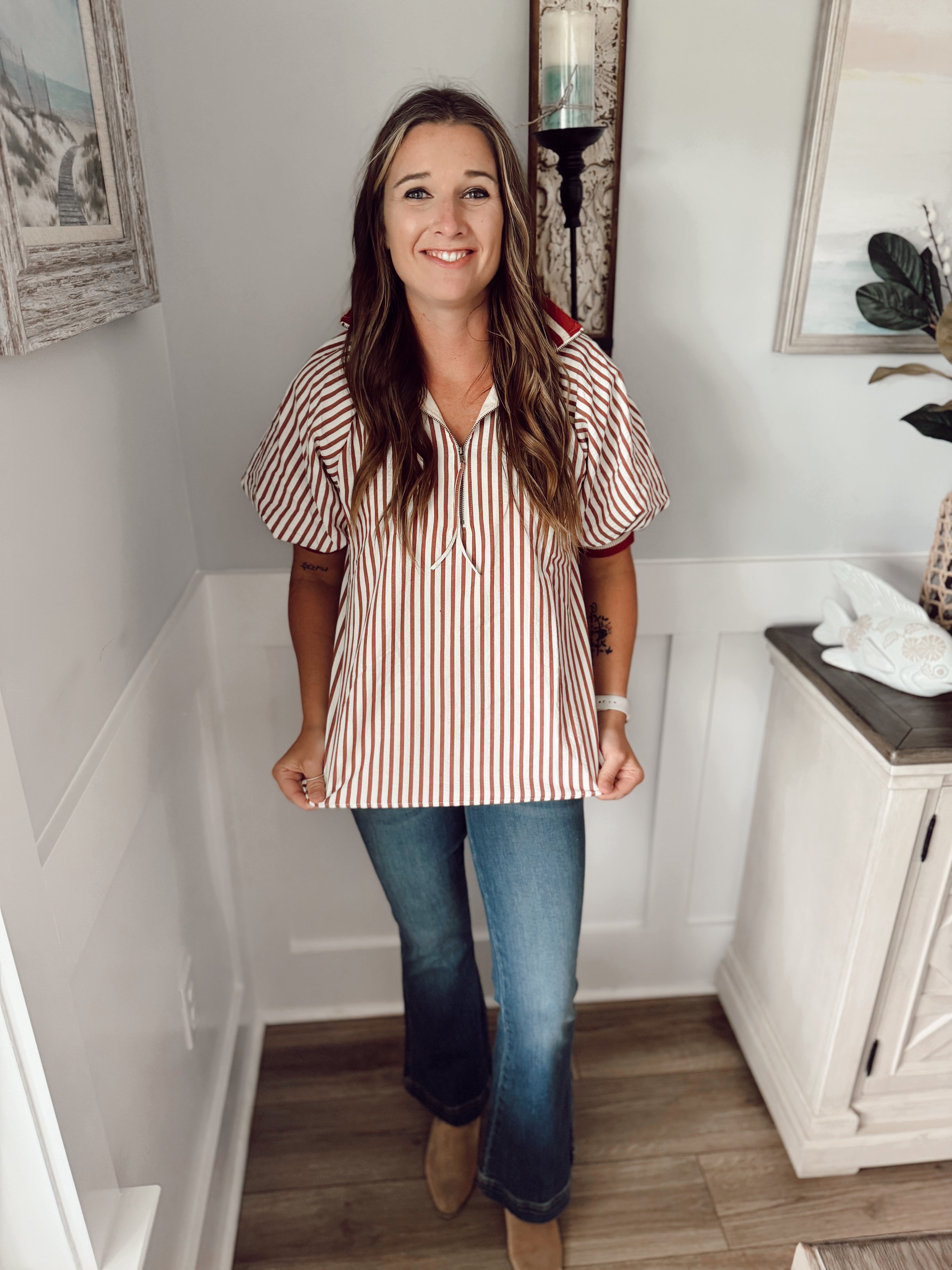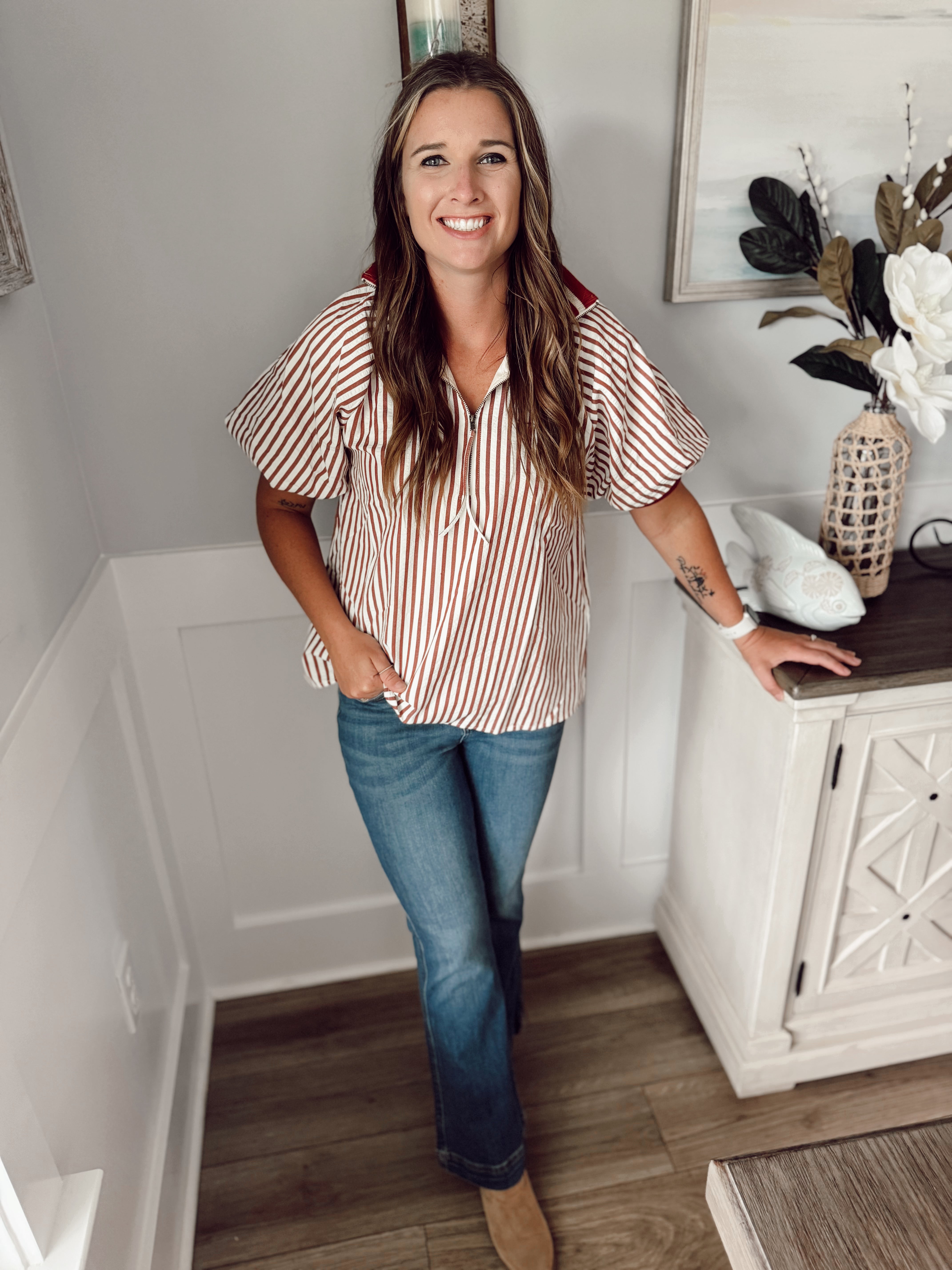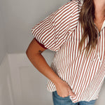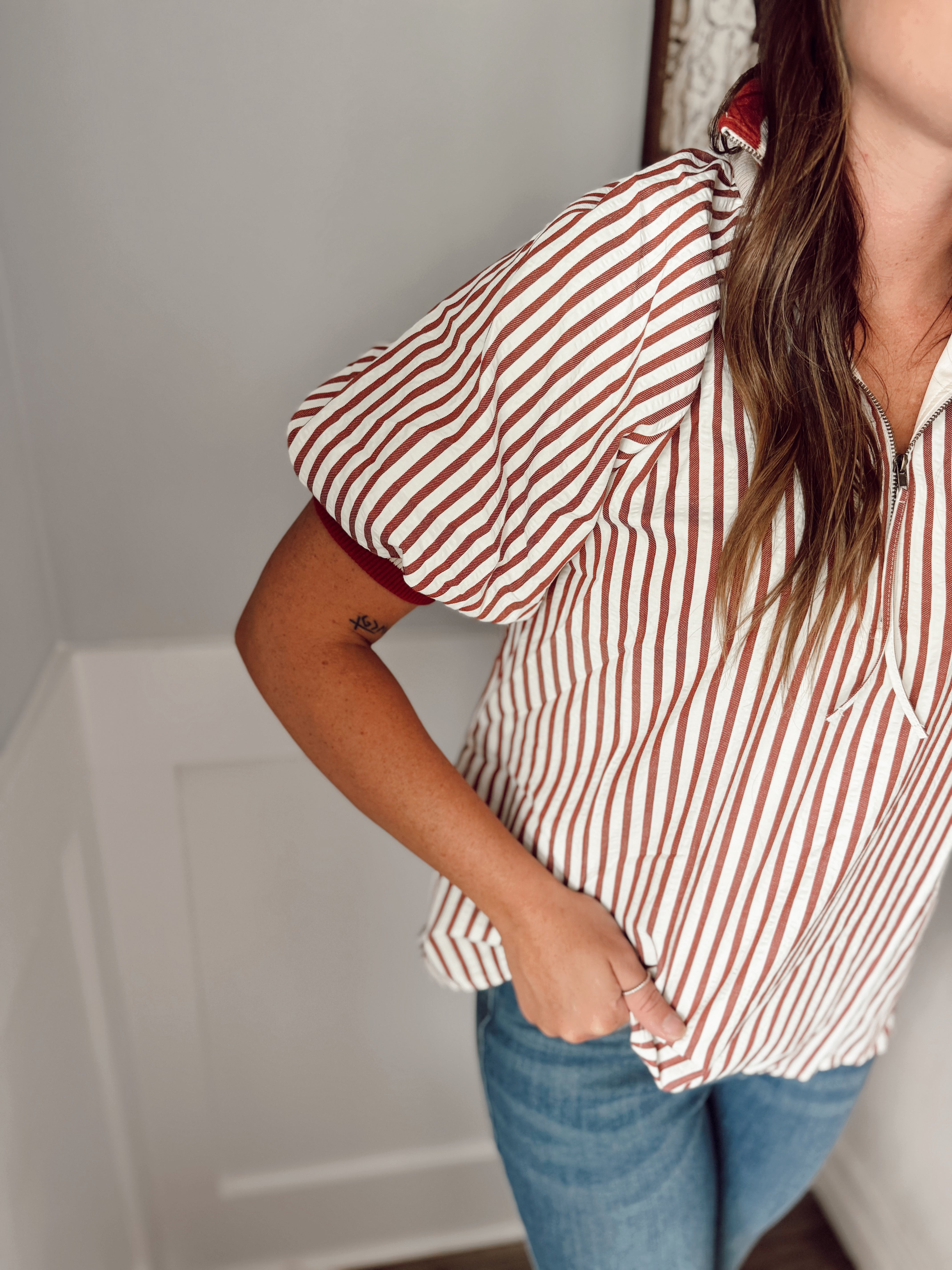 Stripe pattern half-zip closure short puff sleeve top featuring multicolor accent band. Unlined. Woven. Non-sheer. Lightweight