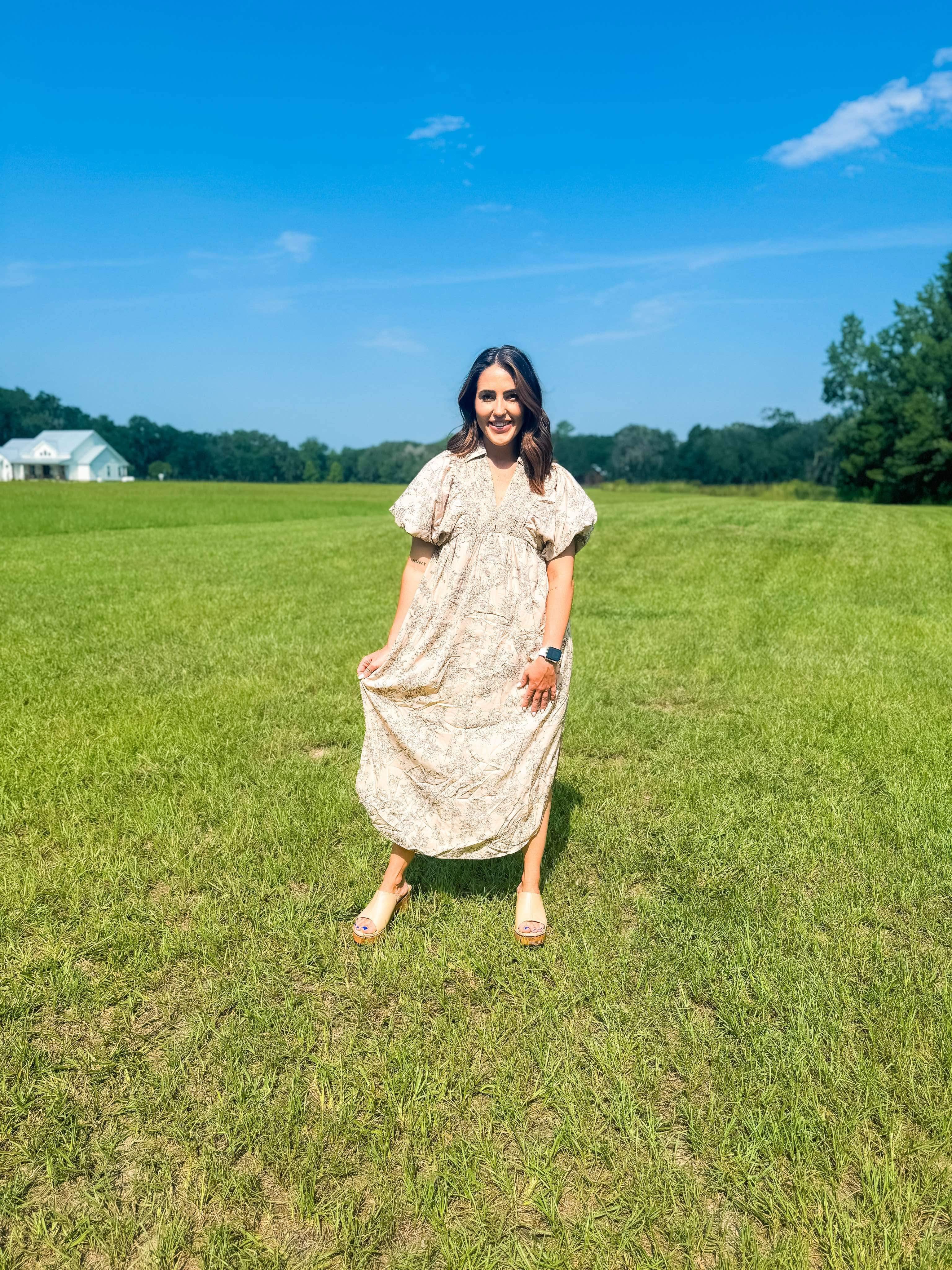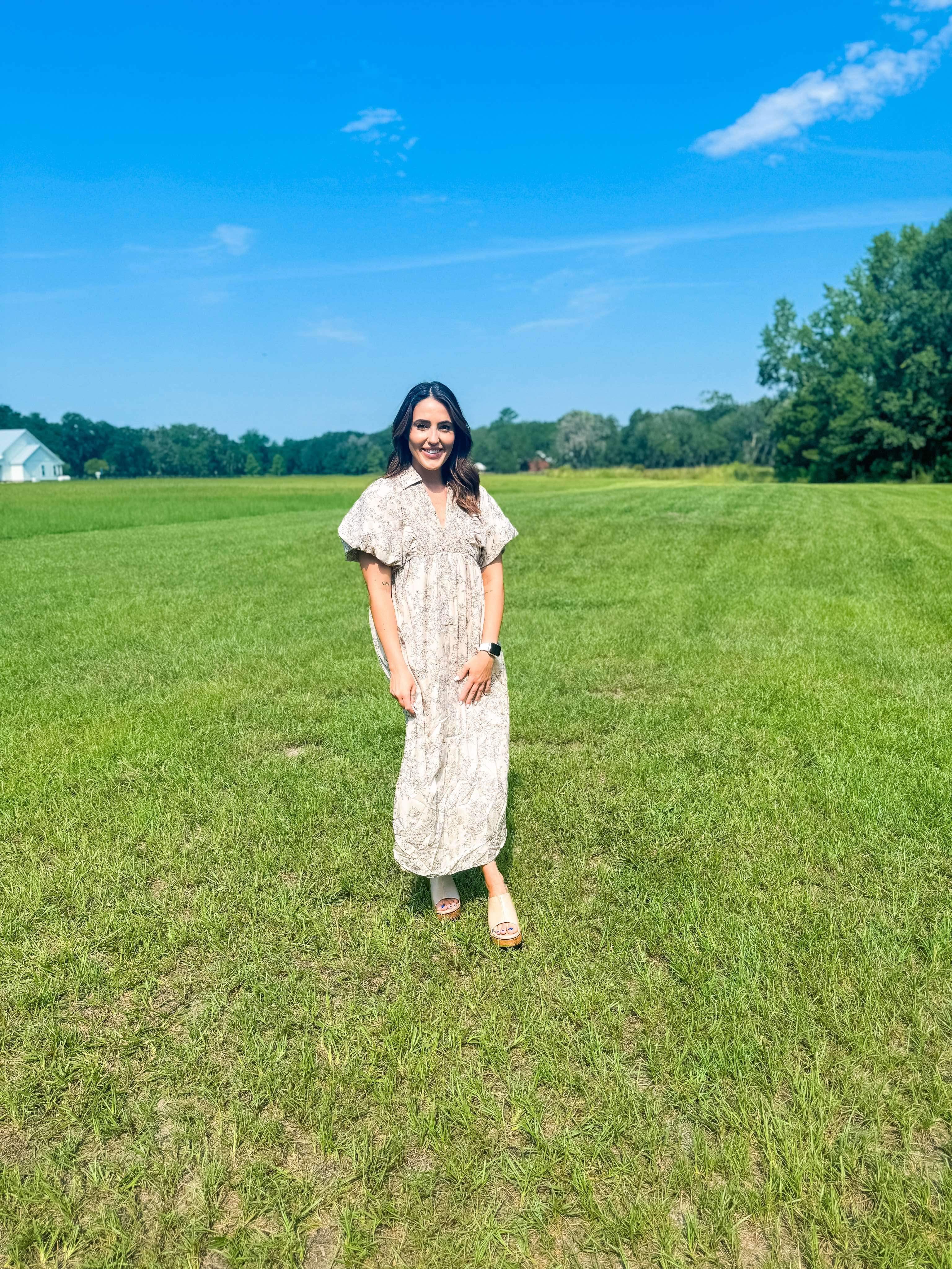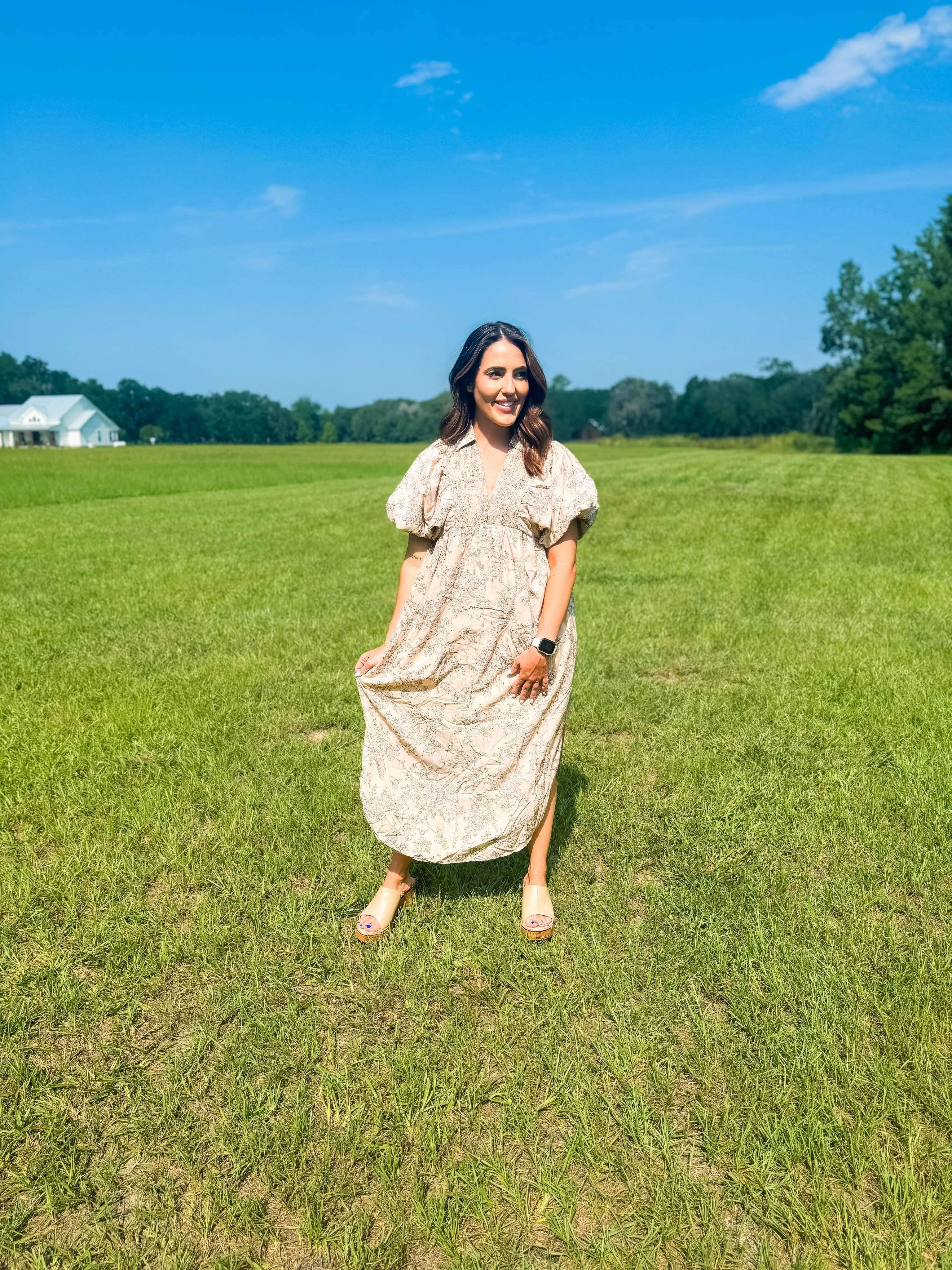 Floral print v-neck bubble sleeve collared midi dress featuring smocking and button detail at front. Slit at sides. Hook and eye closure at front. Elastic at cuff. Lined. Woven. Non-sheer. Lightweight.