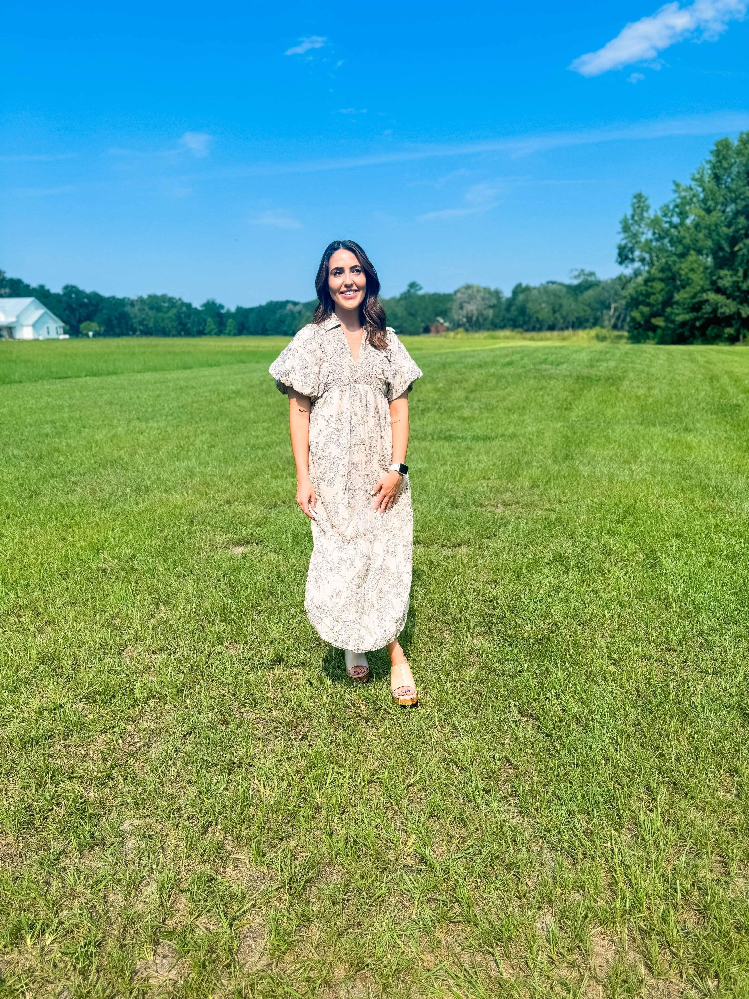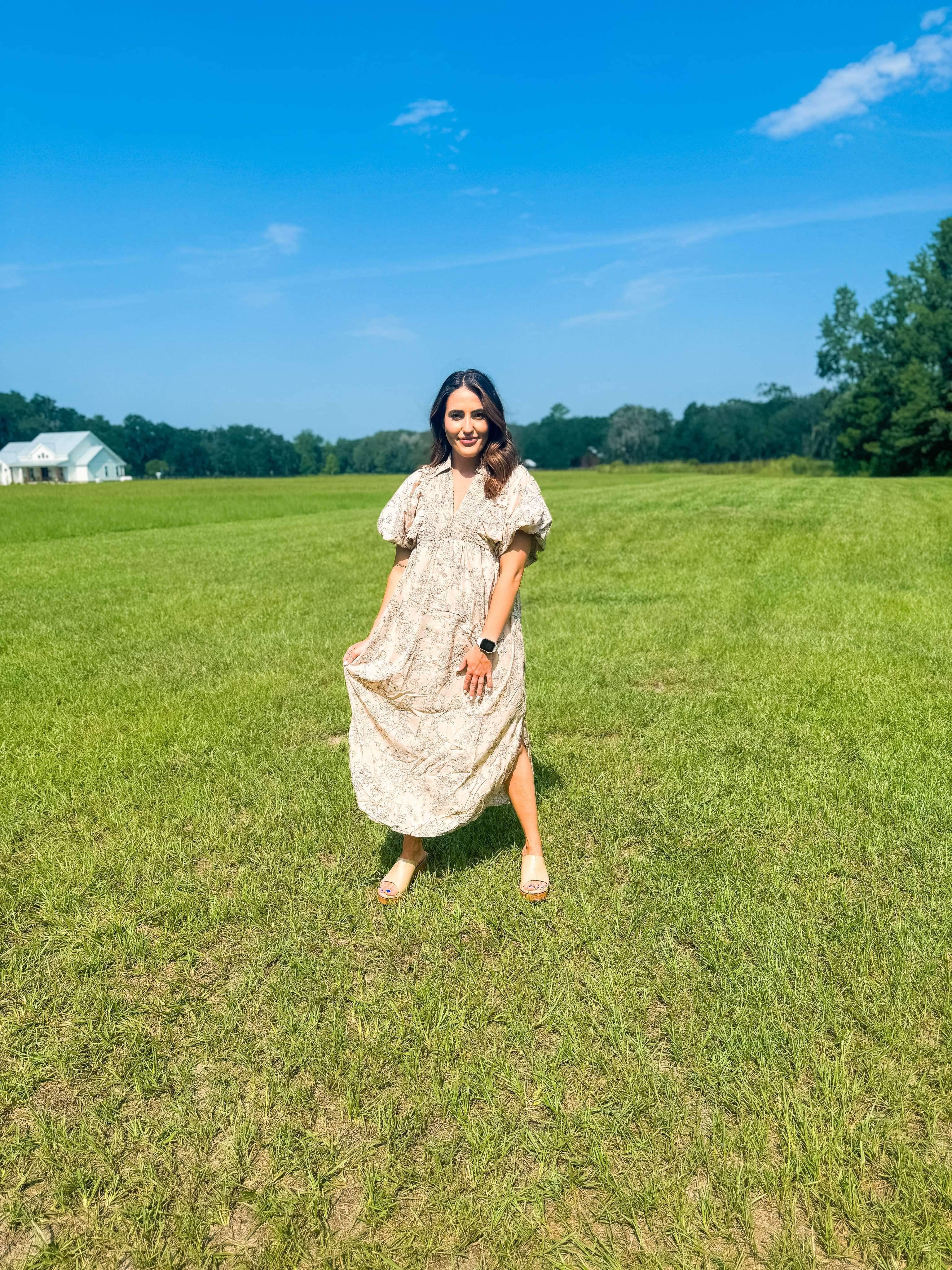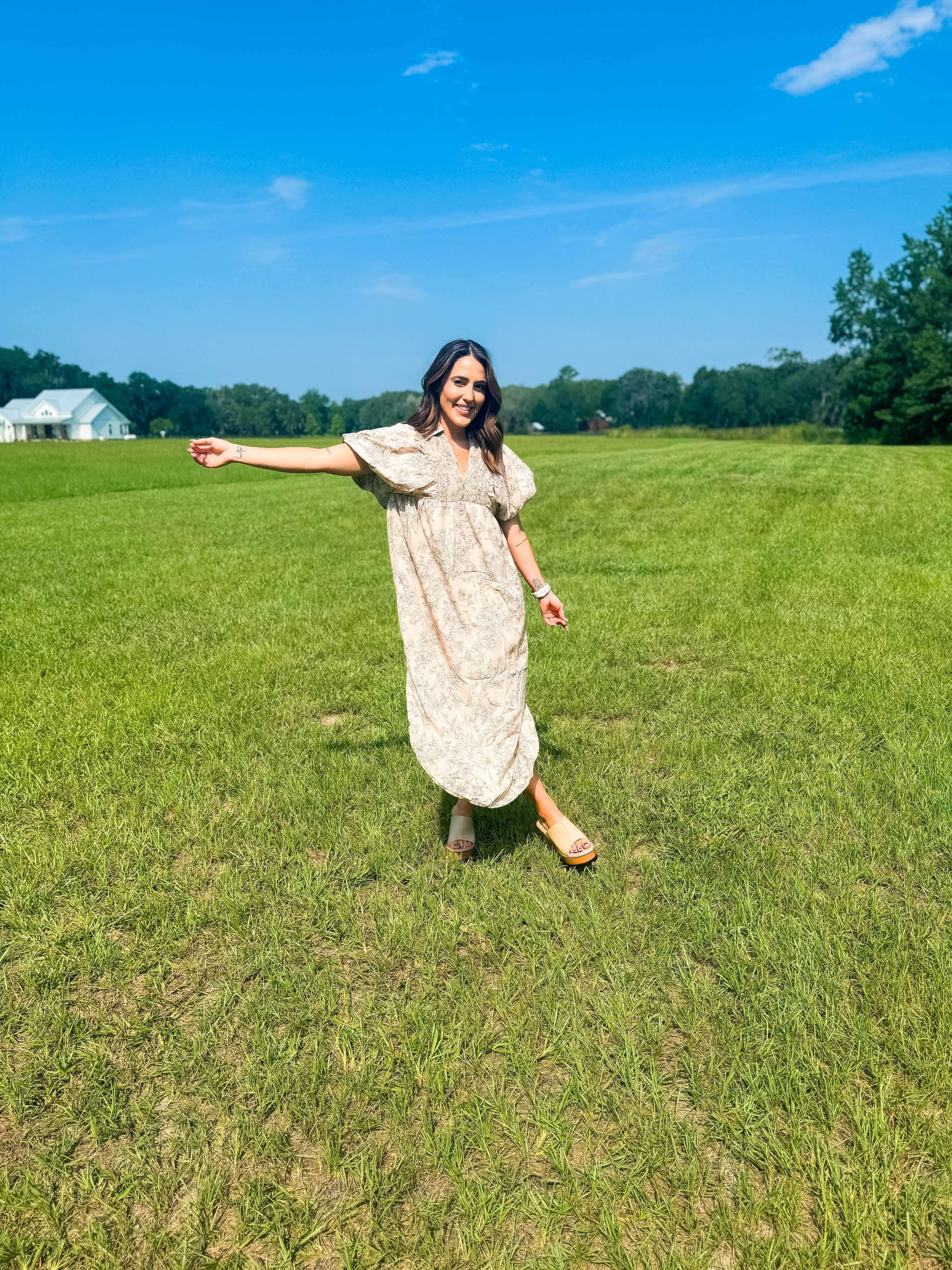Floral print v-neck bubble sleeve collared midi dress featuring smocking and button detail at front. Slit at sides. Hook and eye closure at front. Elastic at cuff. Lined. Woven. Non-sheer. Lightweight.