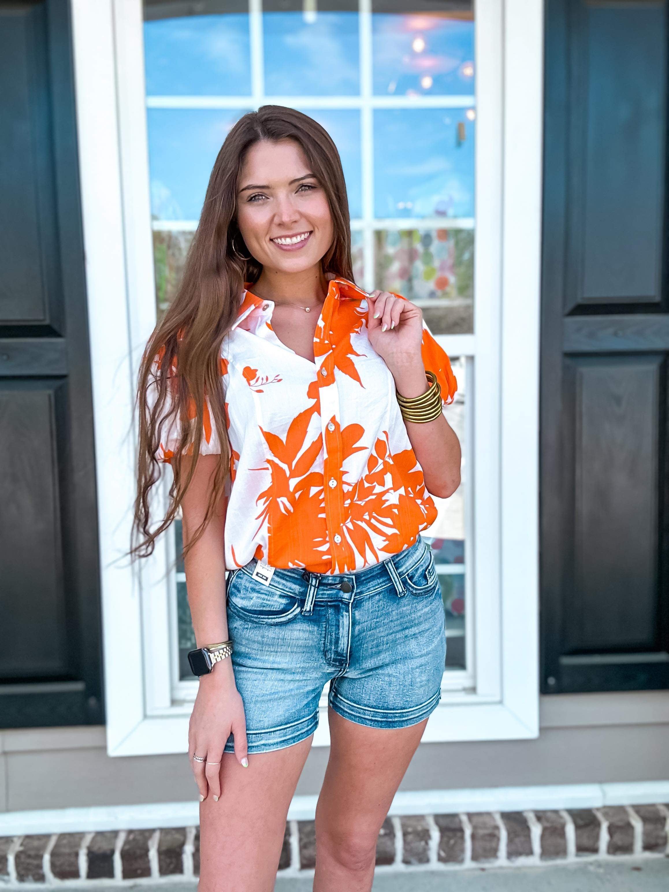 Leaf print button down collared top featuring bubble sleeve. Unlined. Woven. Non-sheer. Lightweight.