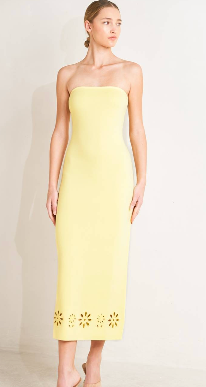 A solid sweater knit dress with strapless neckline and