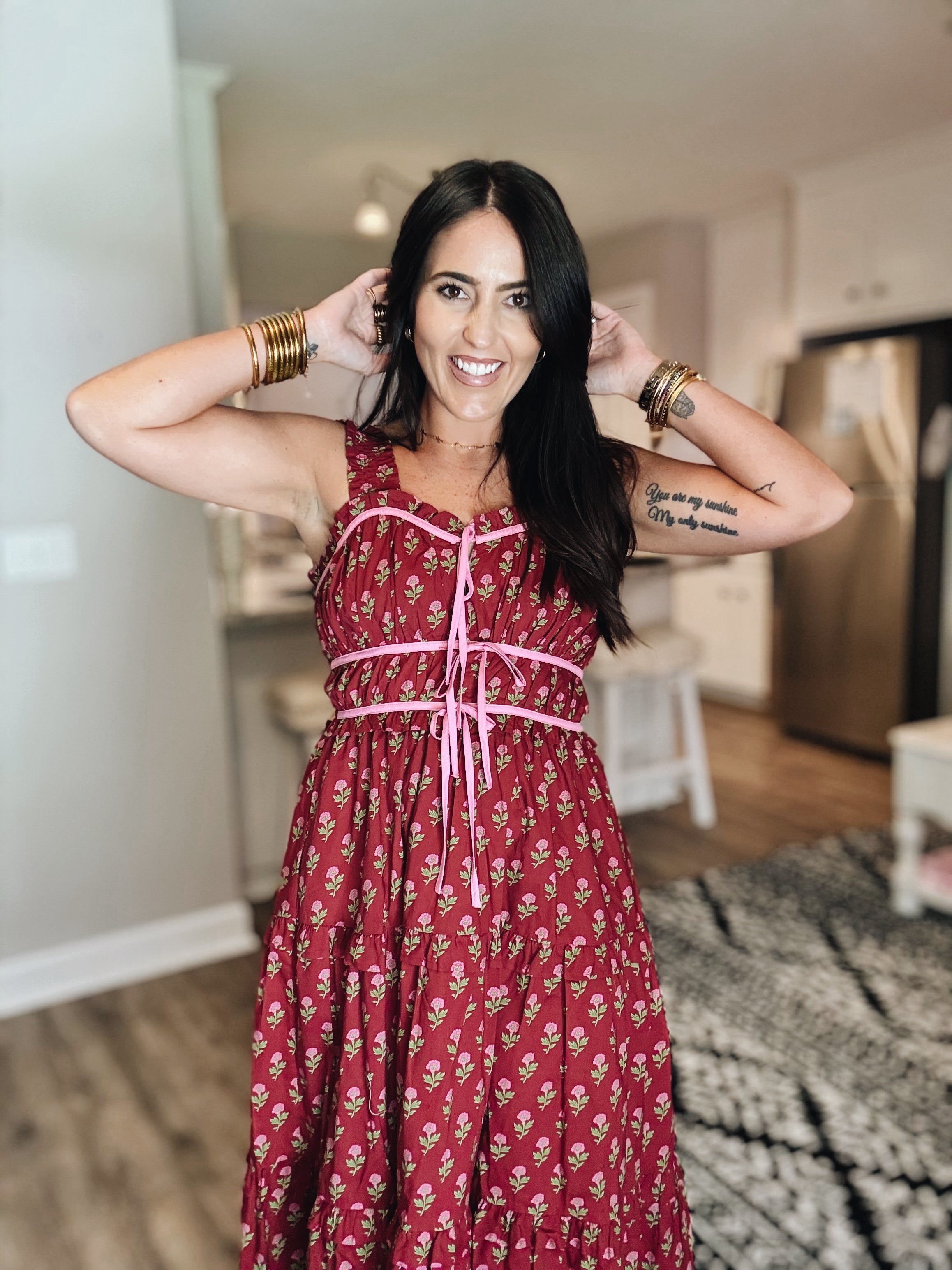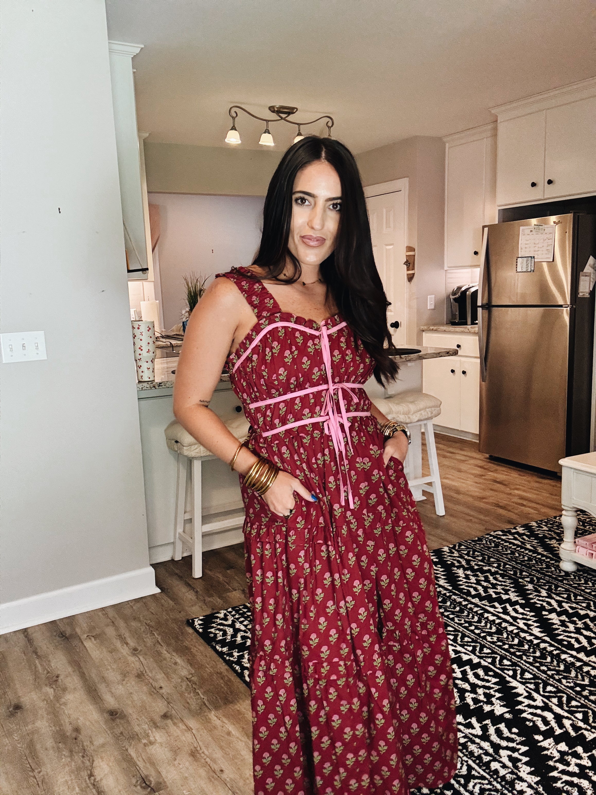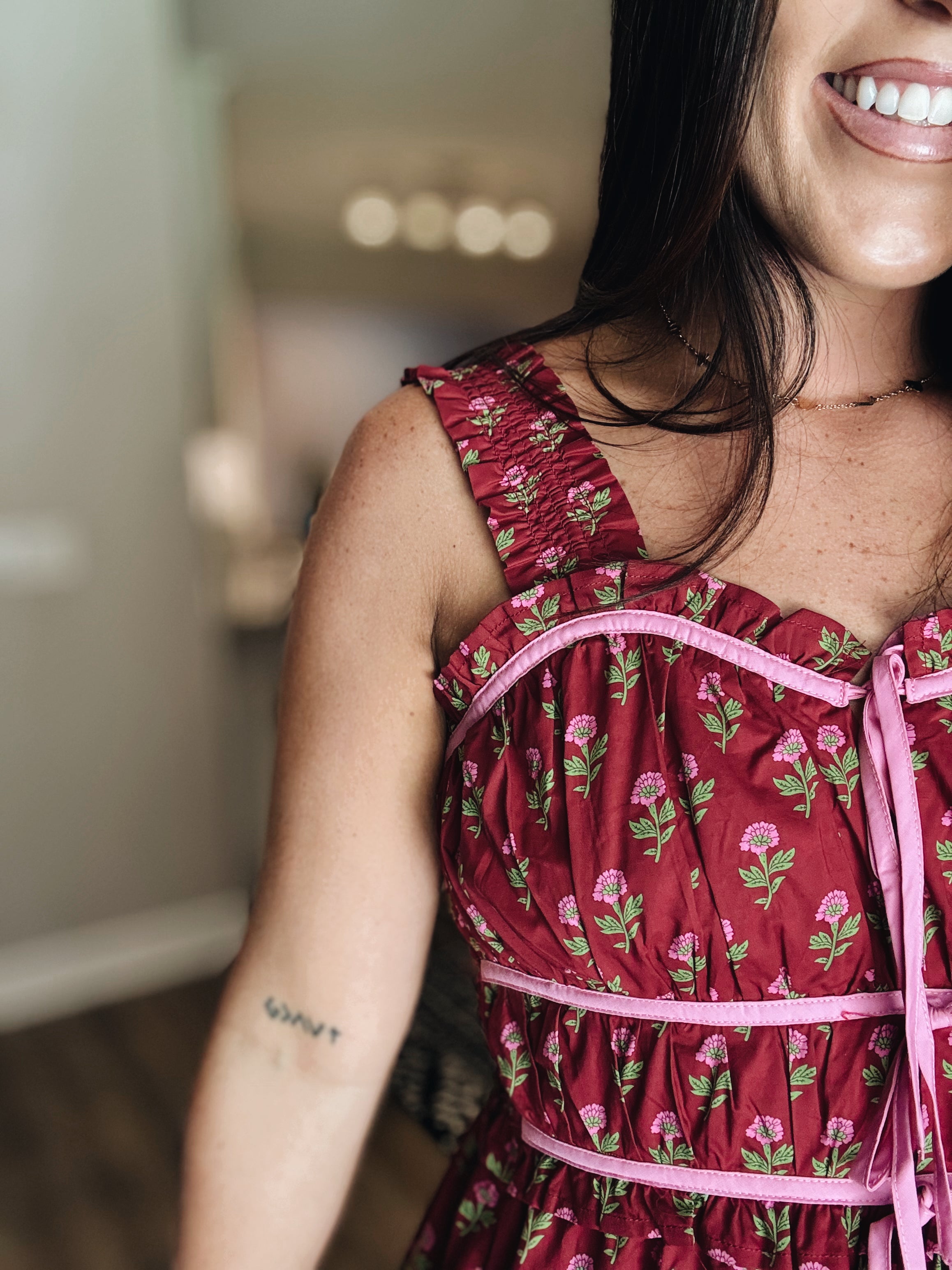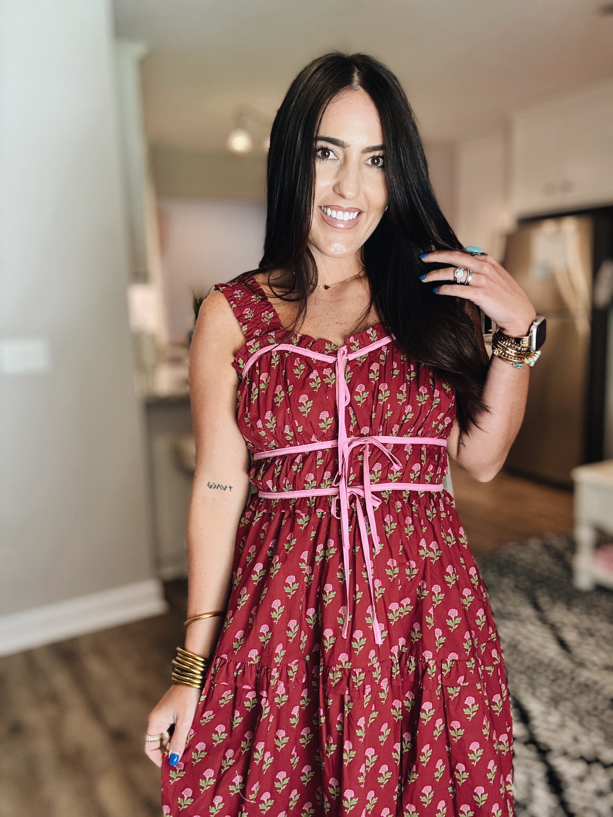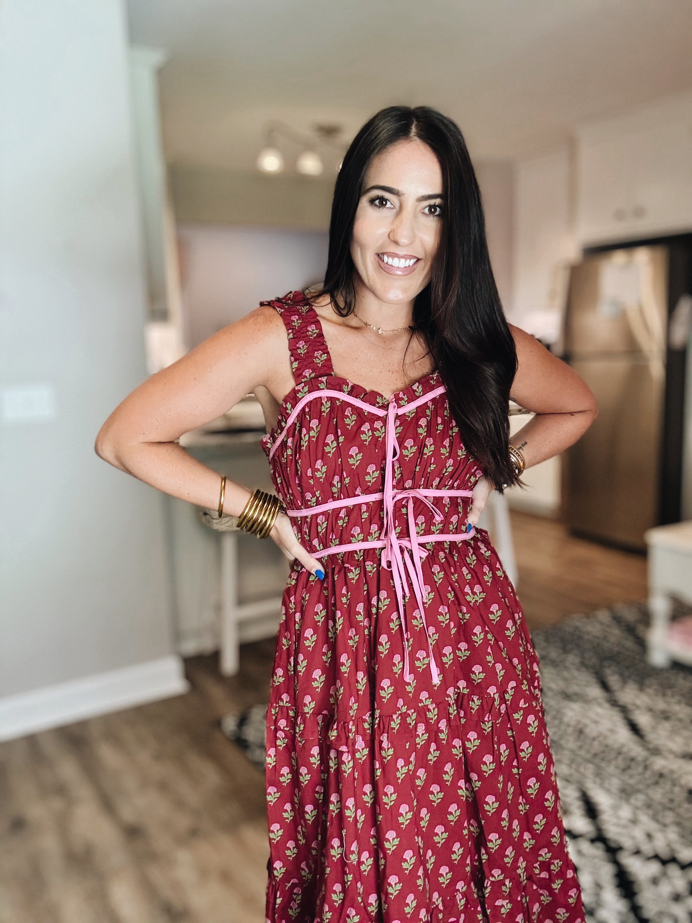 Floral print pullover tiered midi dress featuring high empire accented fixed bow at front below adjustable tie at neckline. Smocked shoulder straps. Elasticated back panel. Pockets at sides. Lined. Woven. Non-sheer. Lightweight.
