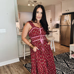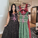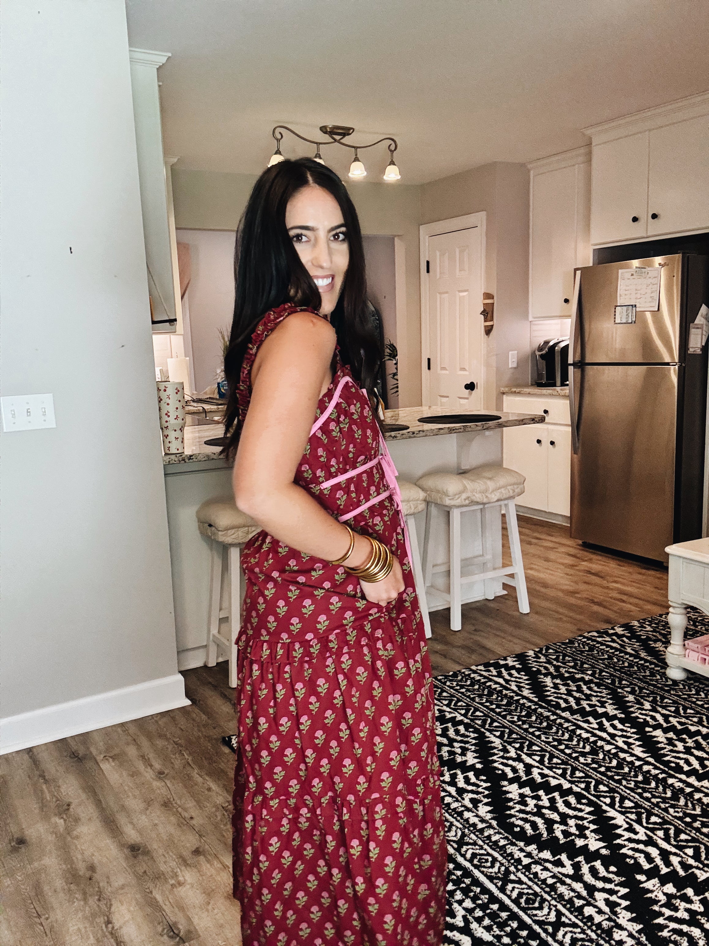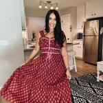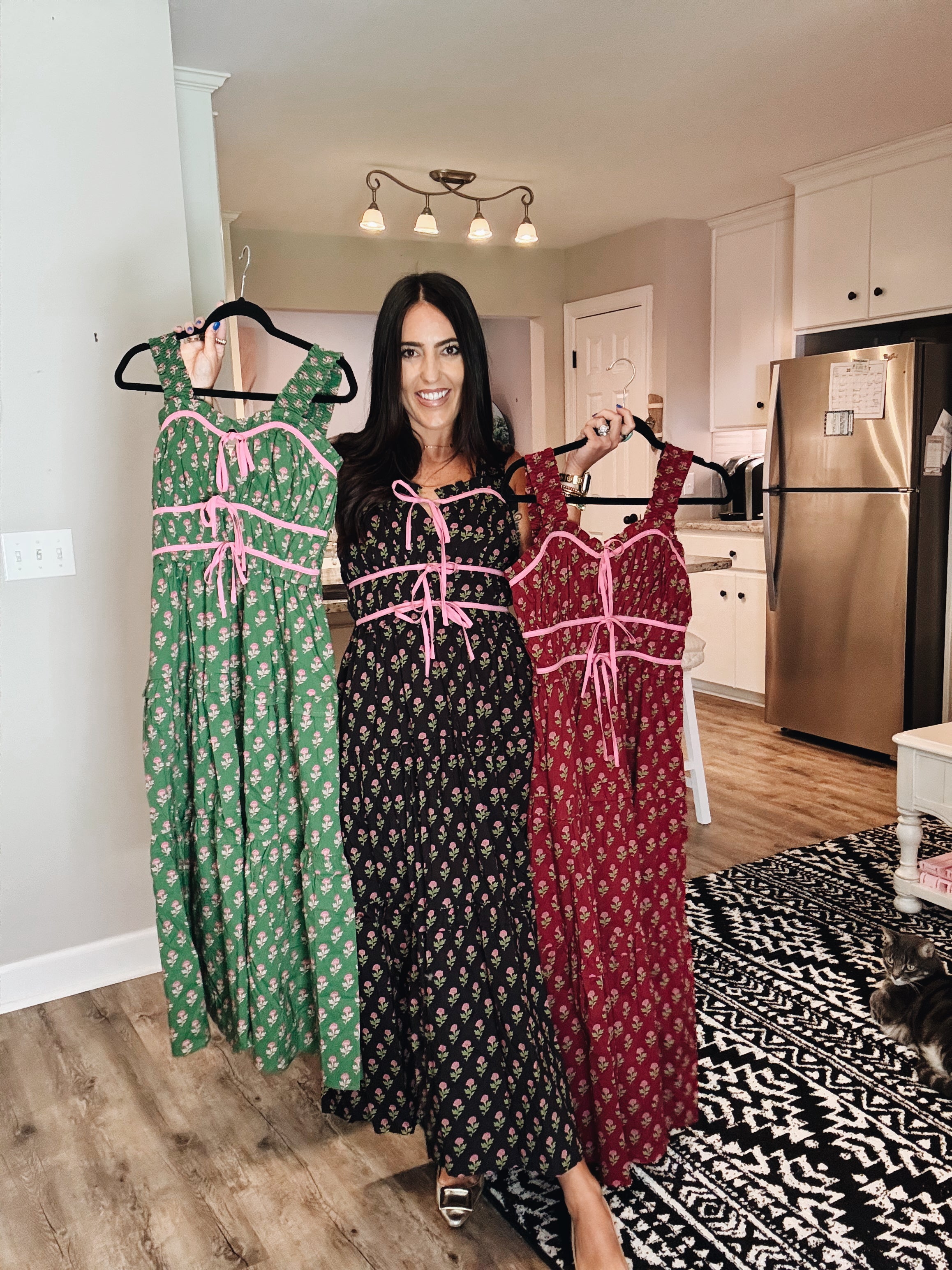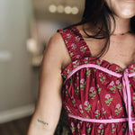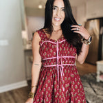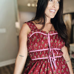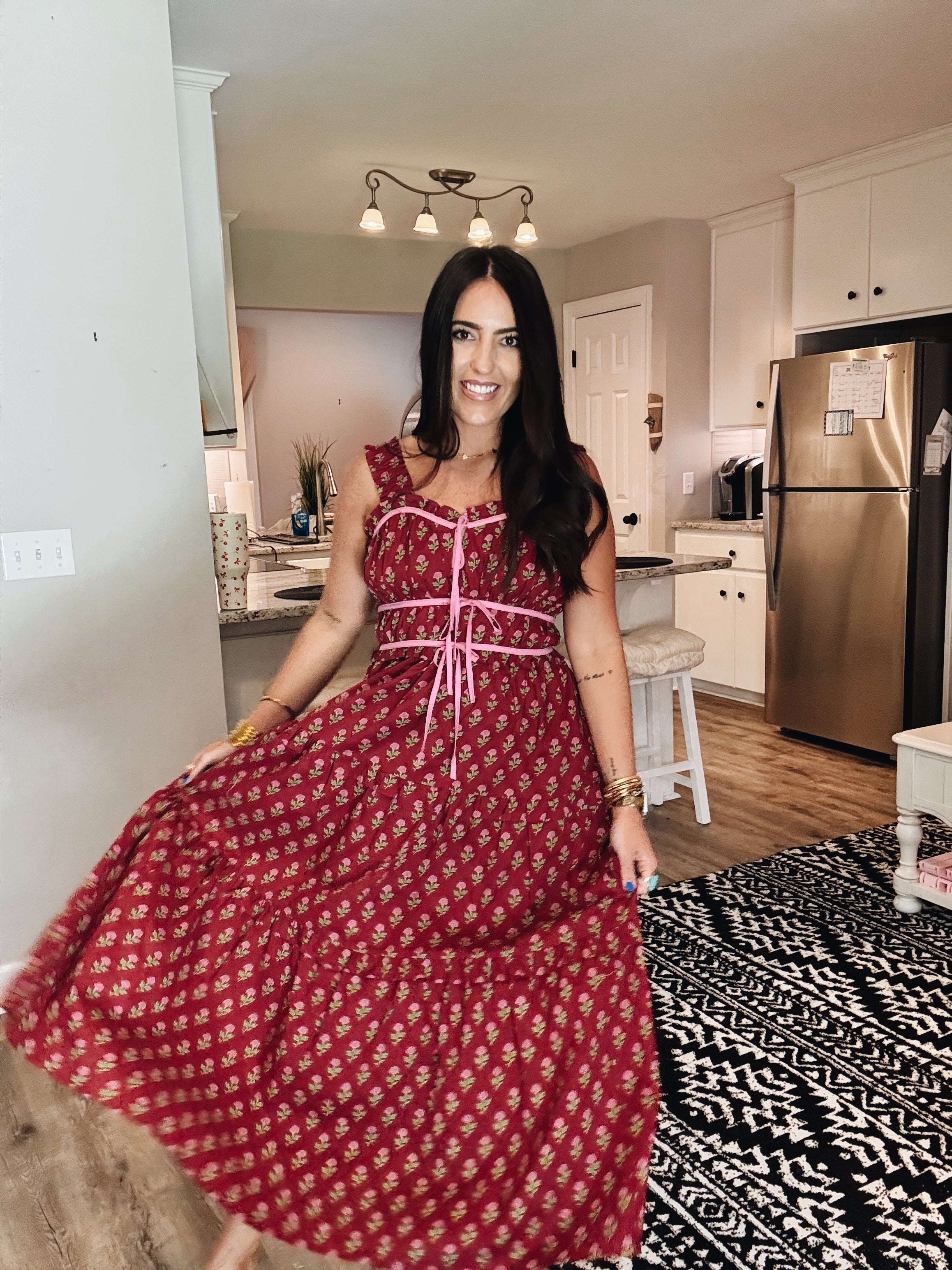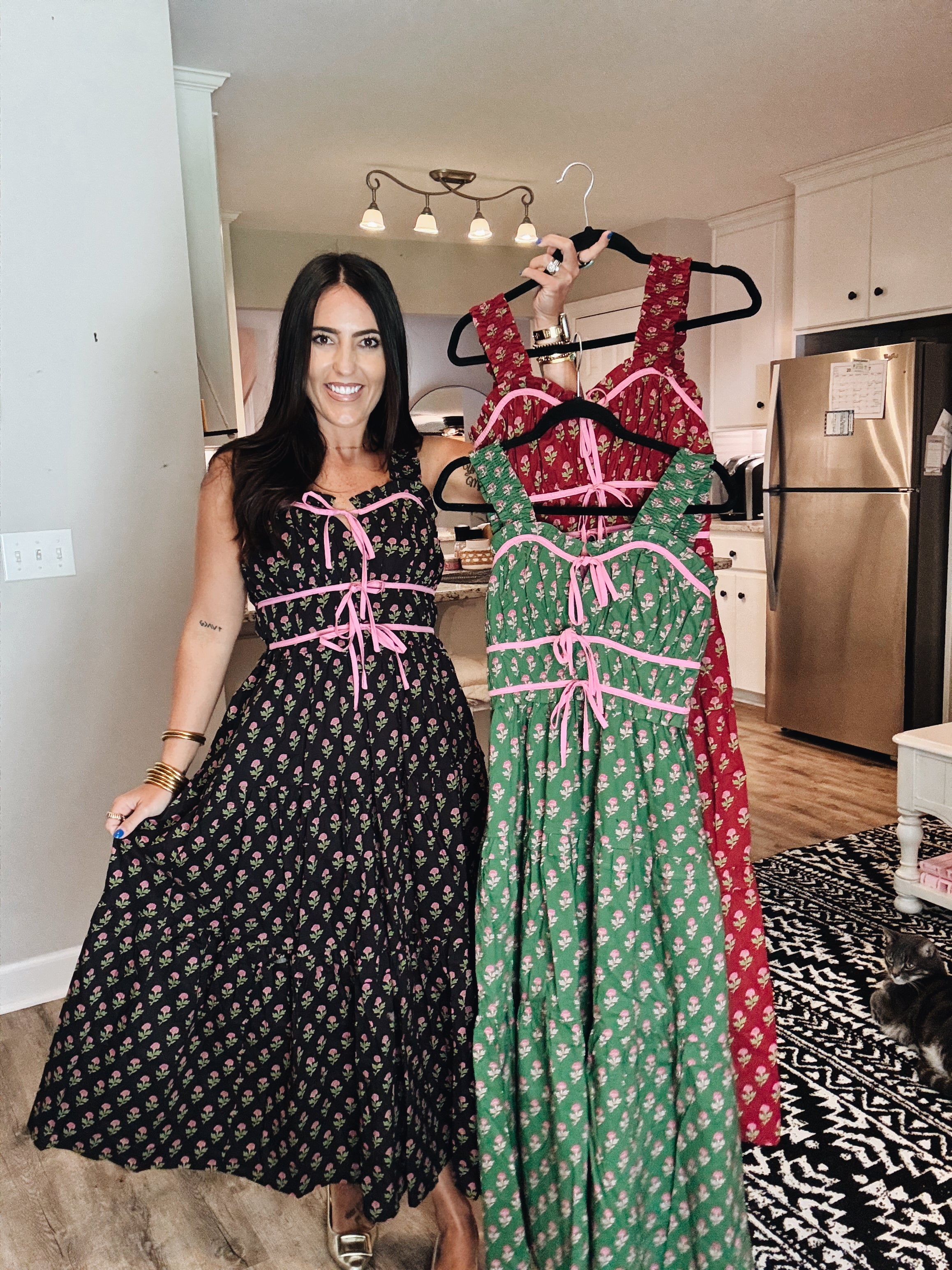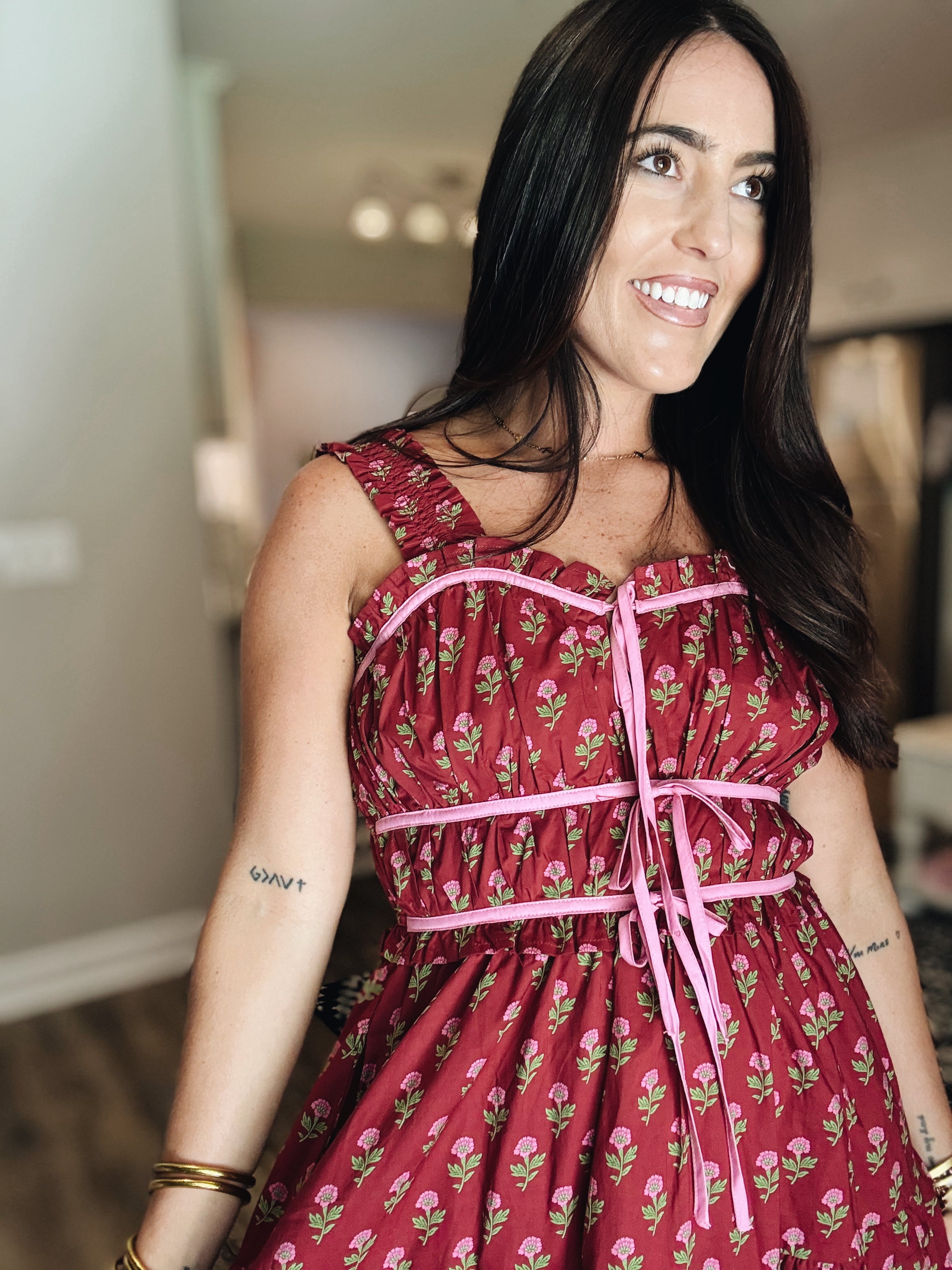 Floral print pullover tiered midi dress featuring high empire accented fixed bow at front below adjustable tie at neckline. Smocked shoulder straps. Elasticated back panel. Pockets at sides. Lined. Woven. Non-sheer. Lightweight.