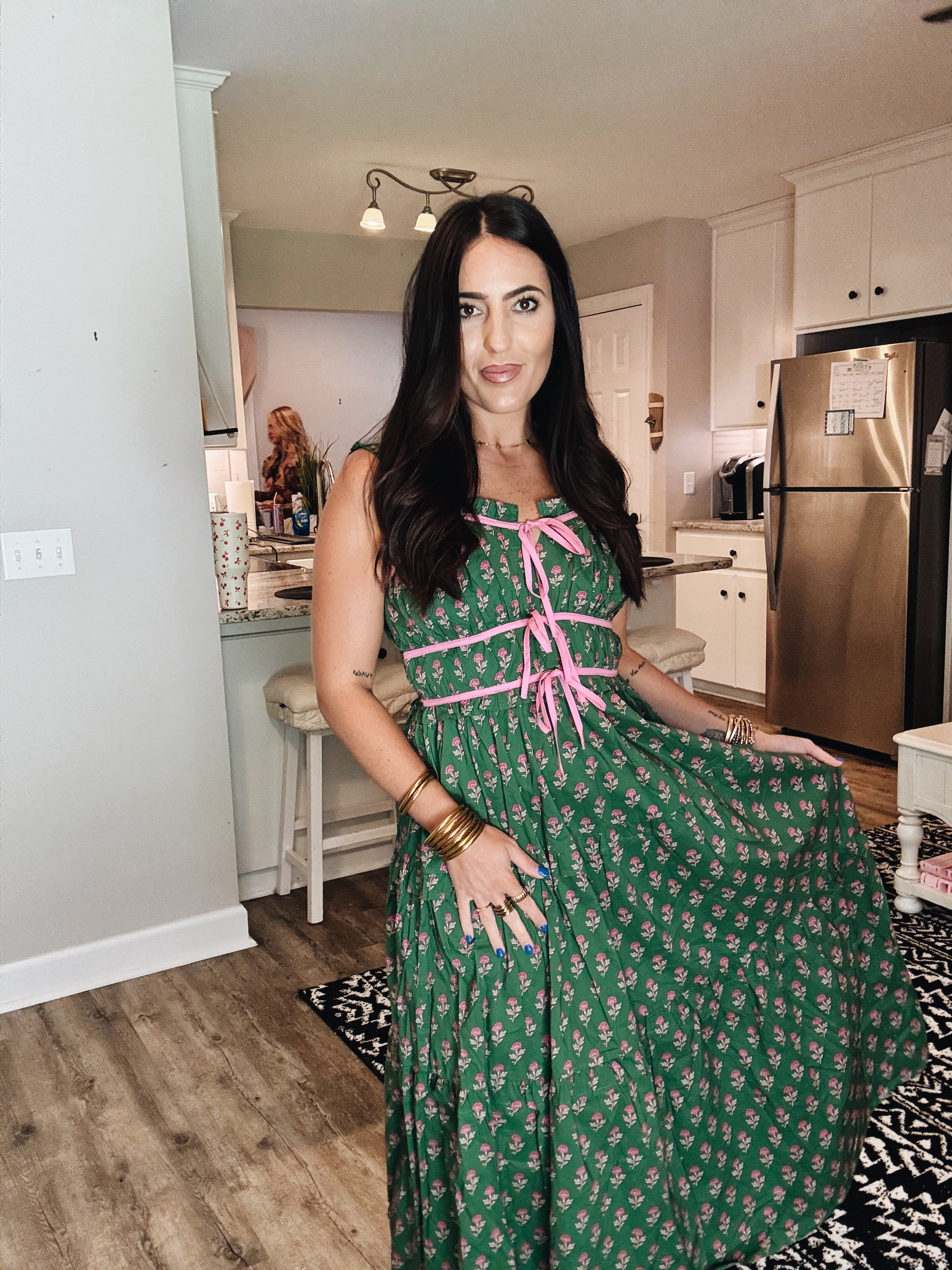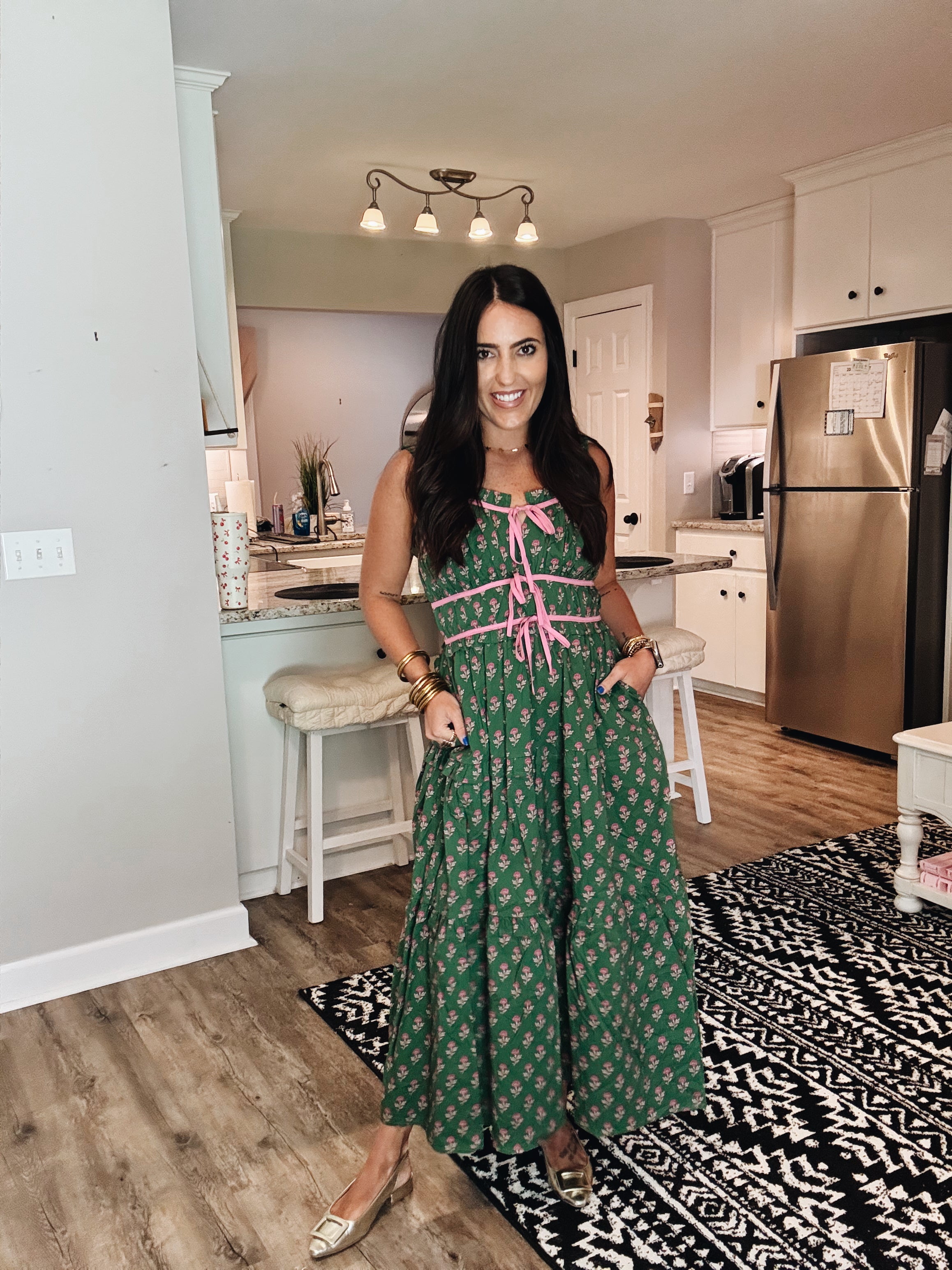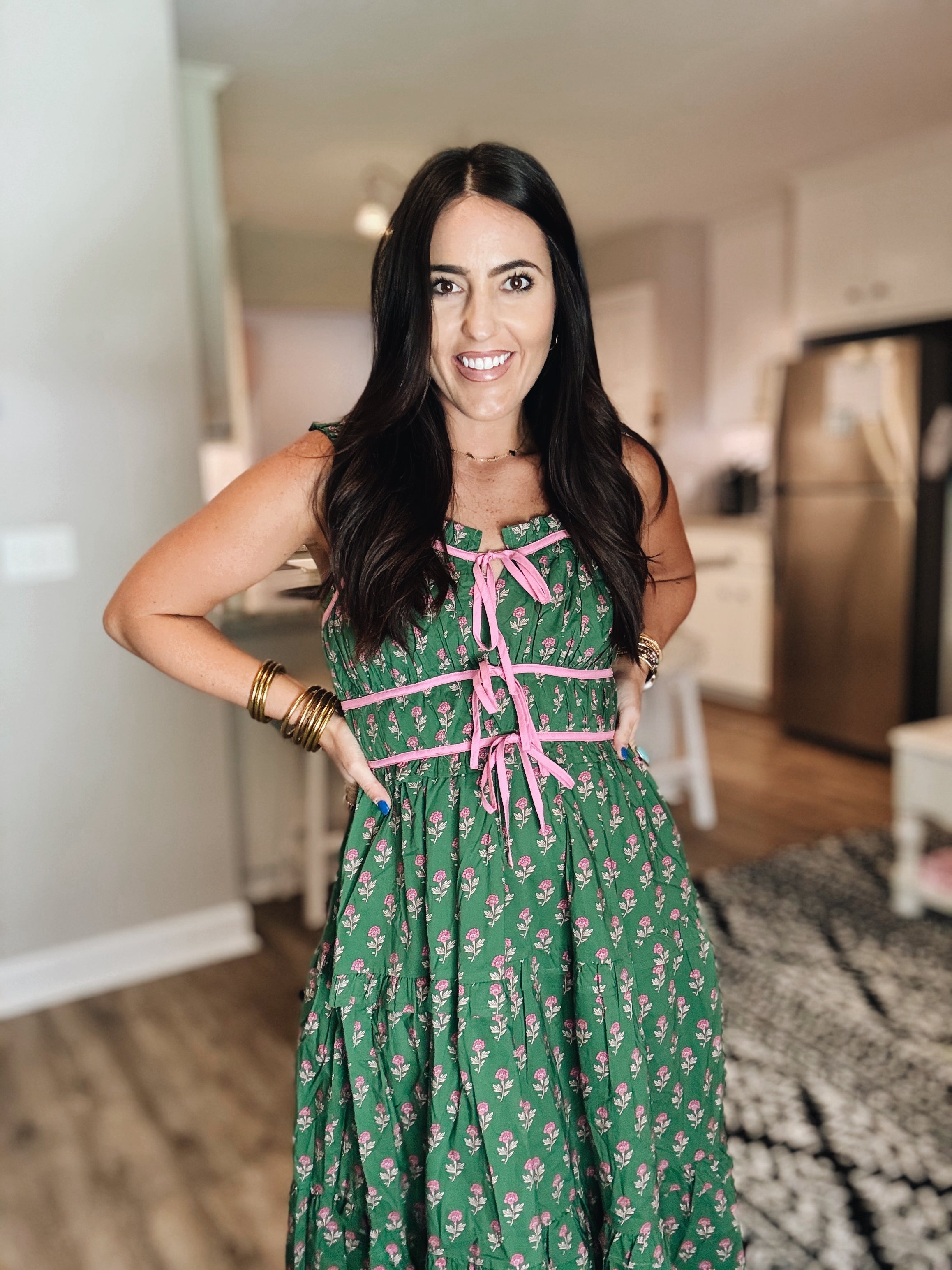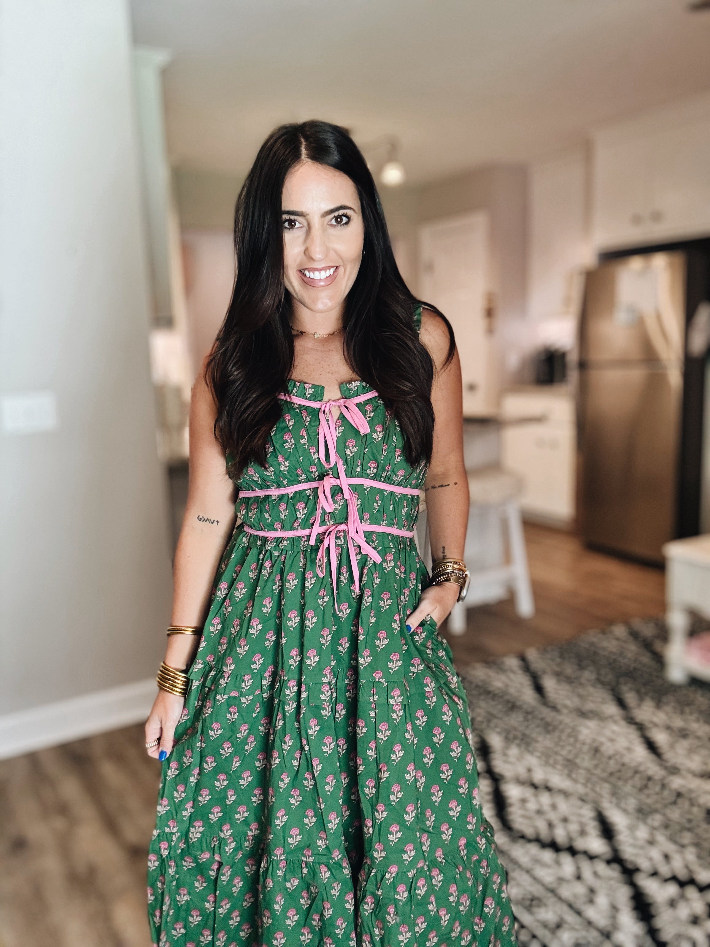 Floral print pullover tiered midi dress featuring high empire accented fixed bow at front below adjustable tie at neckline. Smocked shoulder straps. Elasticated back panel. Pockets at sides. Lined. Woven. Non-sheer. Lightweight.