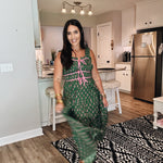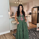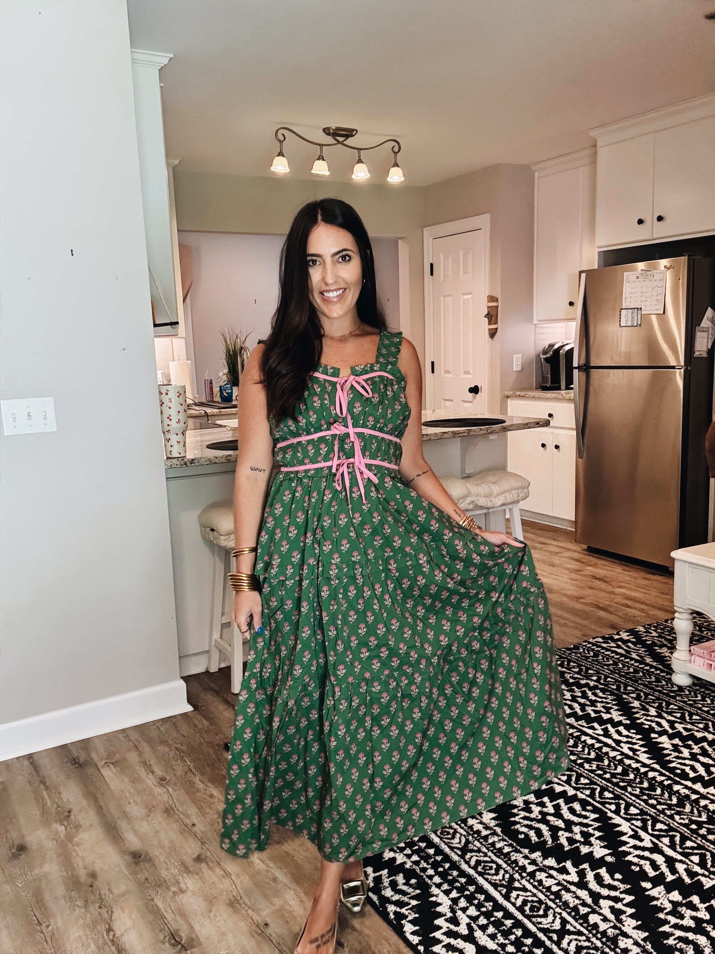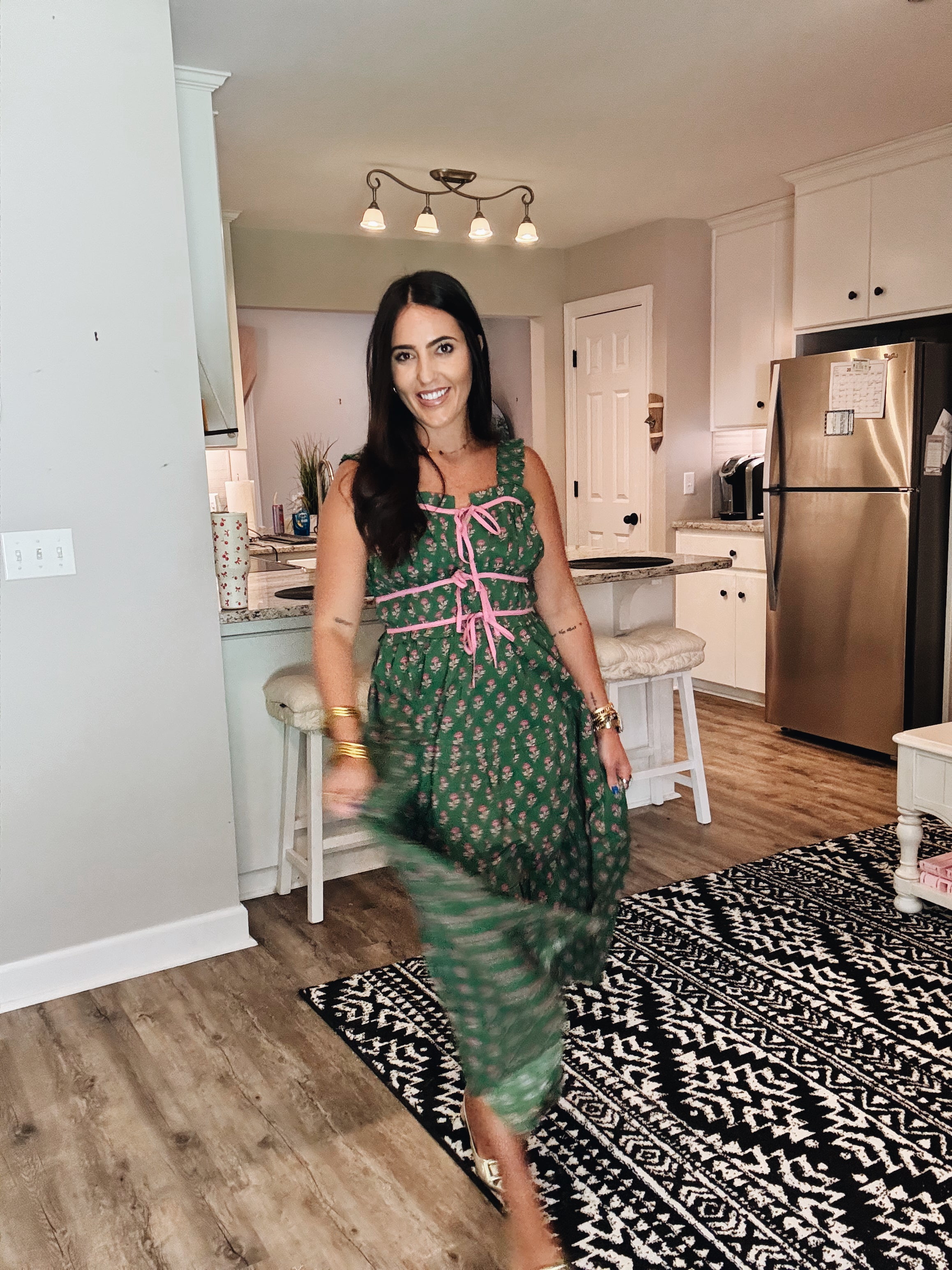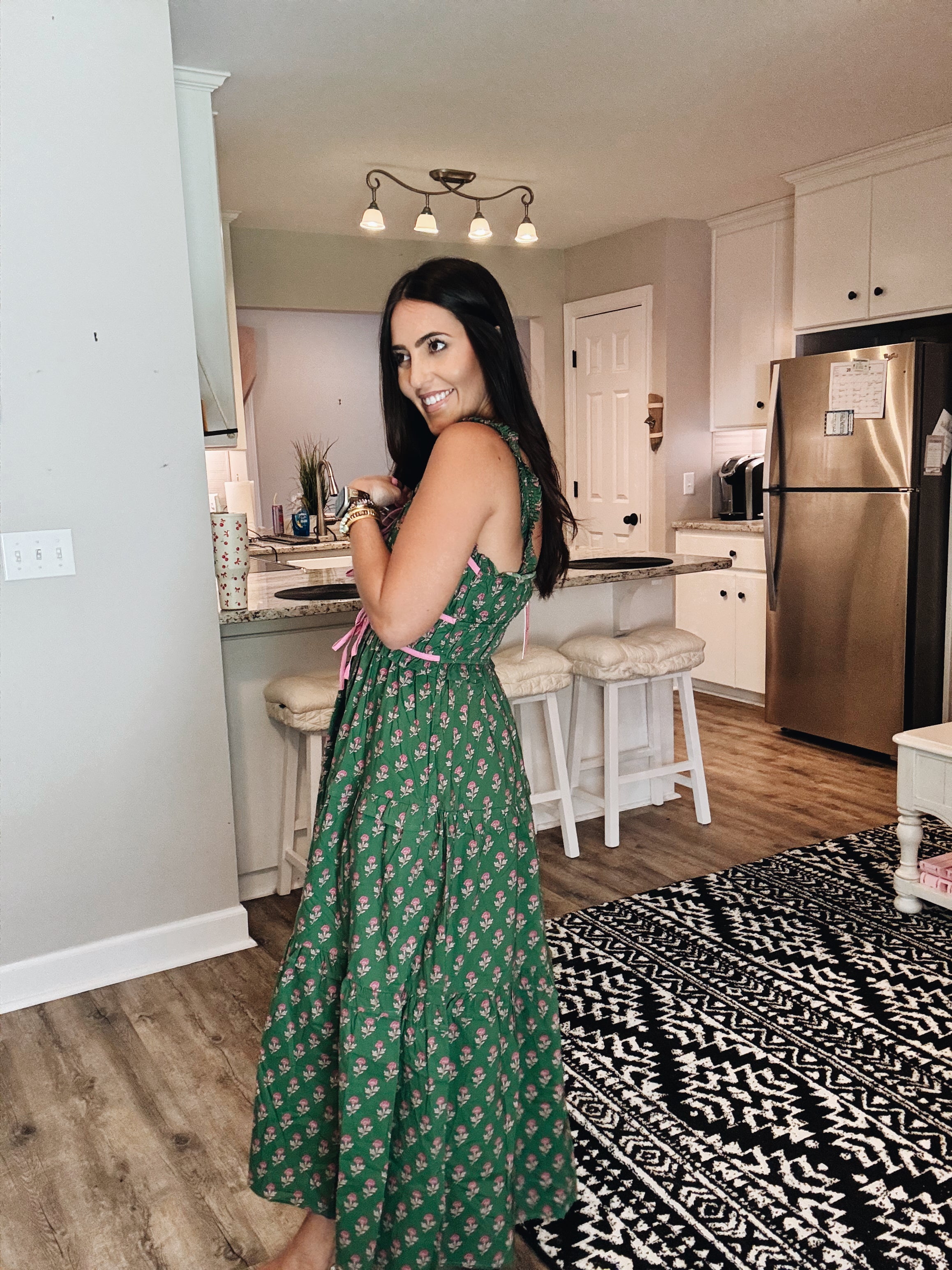 Floral print pullover tiered midi dress featuring high empire accented fixed bow at front below adjustable tie at neckline. Smocked shoulder straps. Elasticated back panel. Pockets at sides. Lined. Woven. Non-sheer. Lightweight.