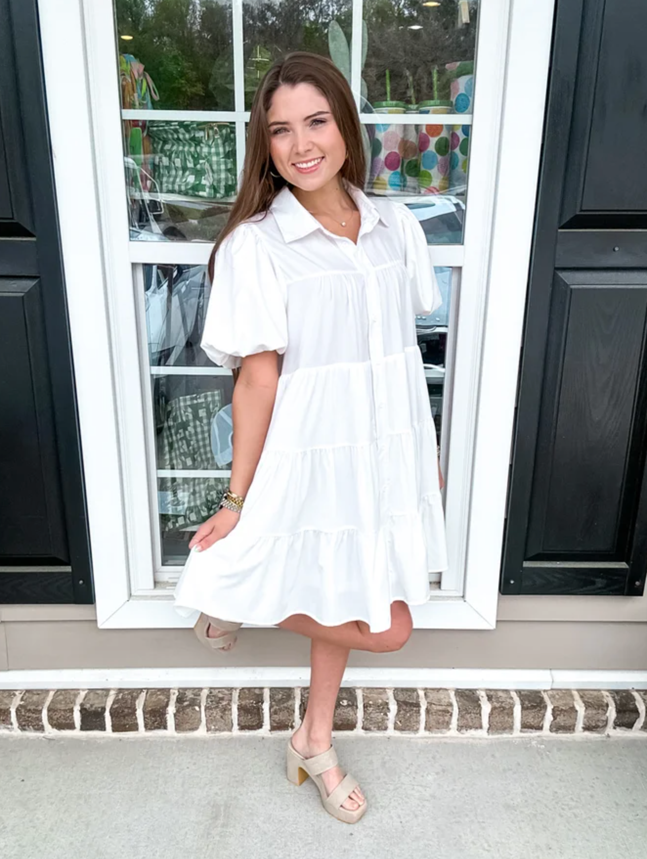 Solid button up tiered mini dress featuring puff sleeves. Lined. Woven. Non-sheer. Lightweight.