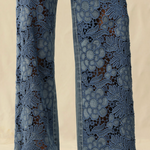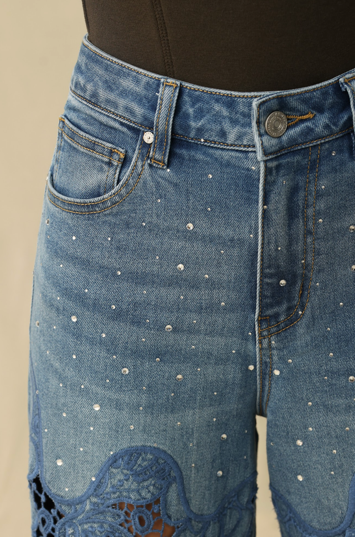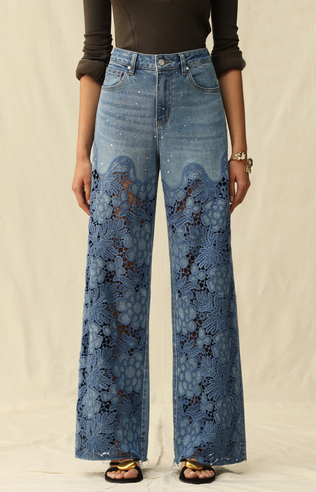 High rise wide leg jeans with rhinestone embellishments and floral motif embroidery to instantly showcase your personal charm.