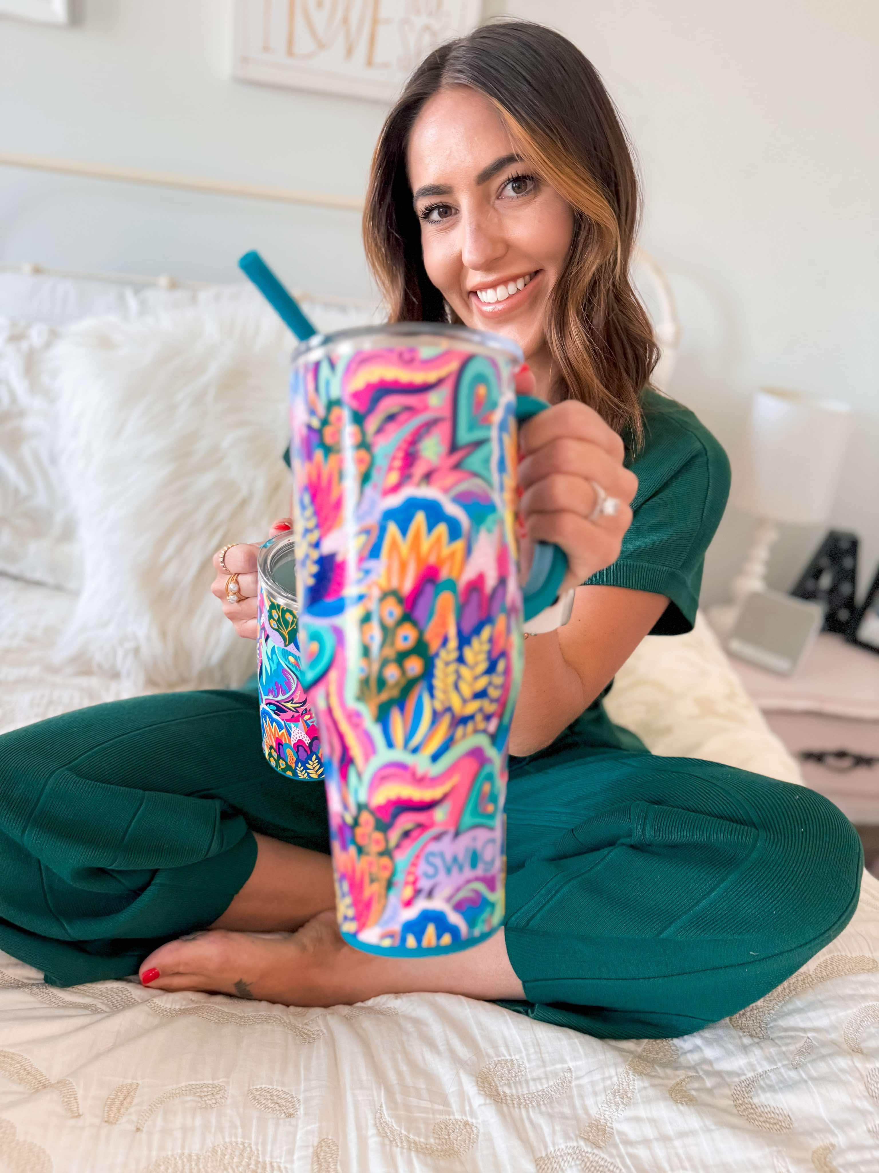 Mega sips, mega chill! π§ Bold and funky fauna come to life in this rich teal and fall hue design.