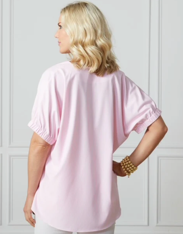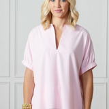 Boxy fit. Loose stretchy sleeve. Longer in back.