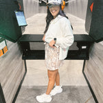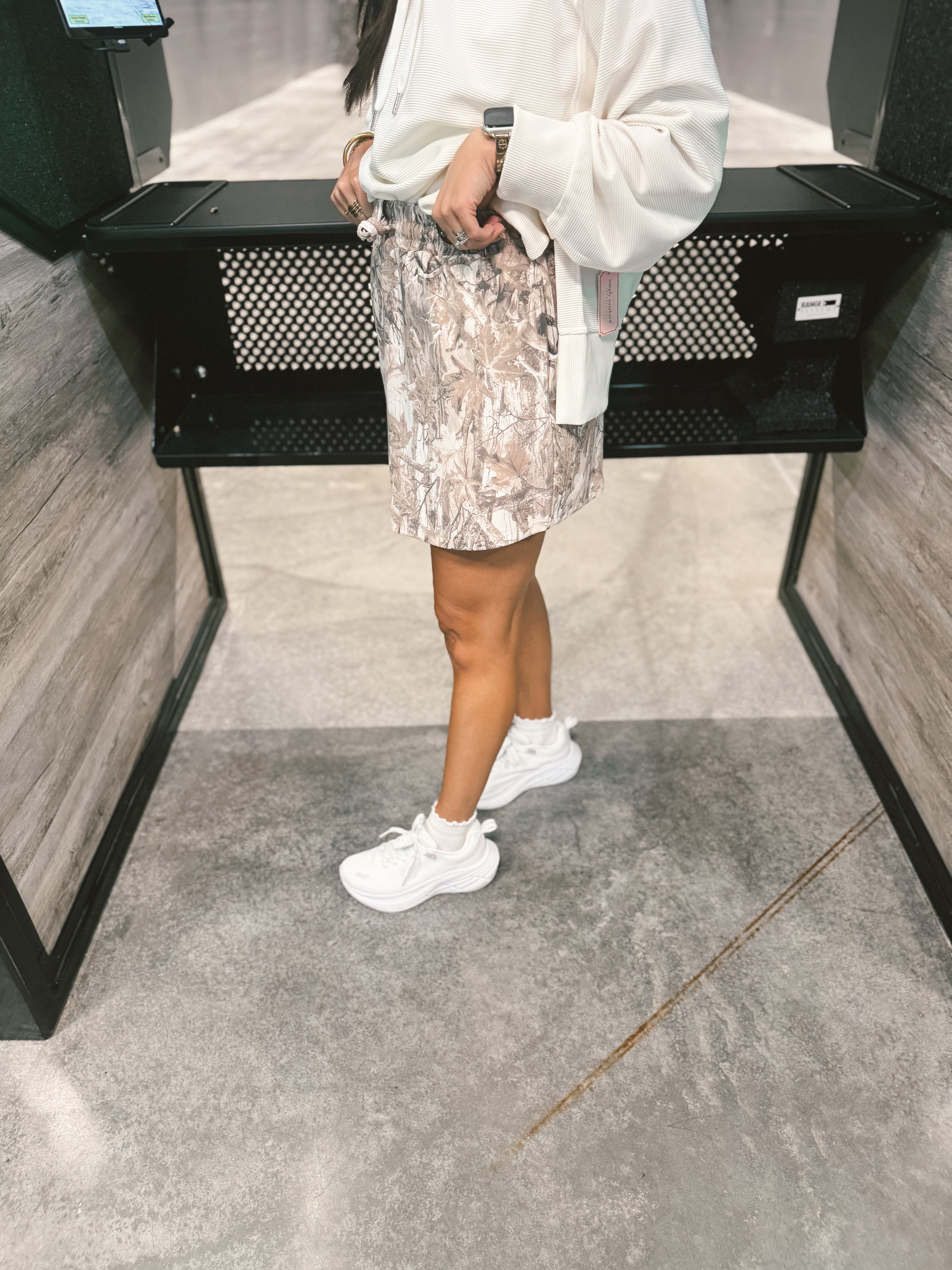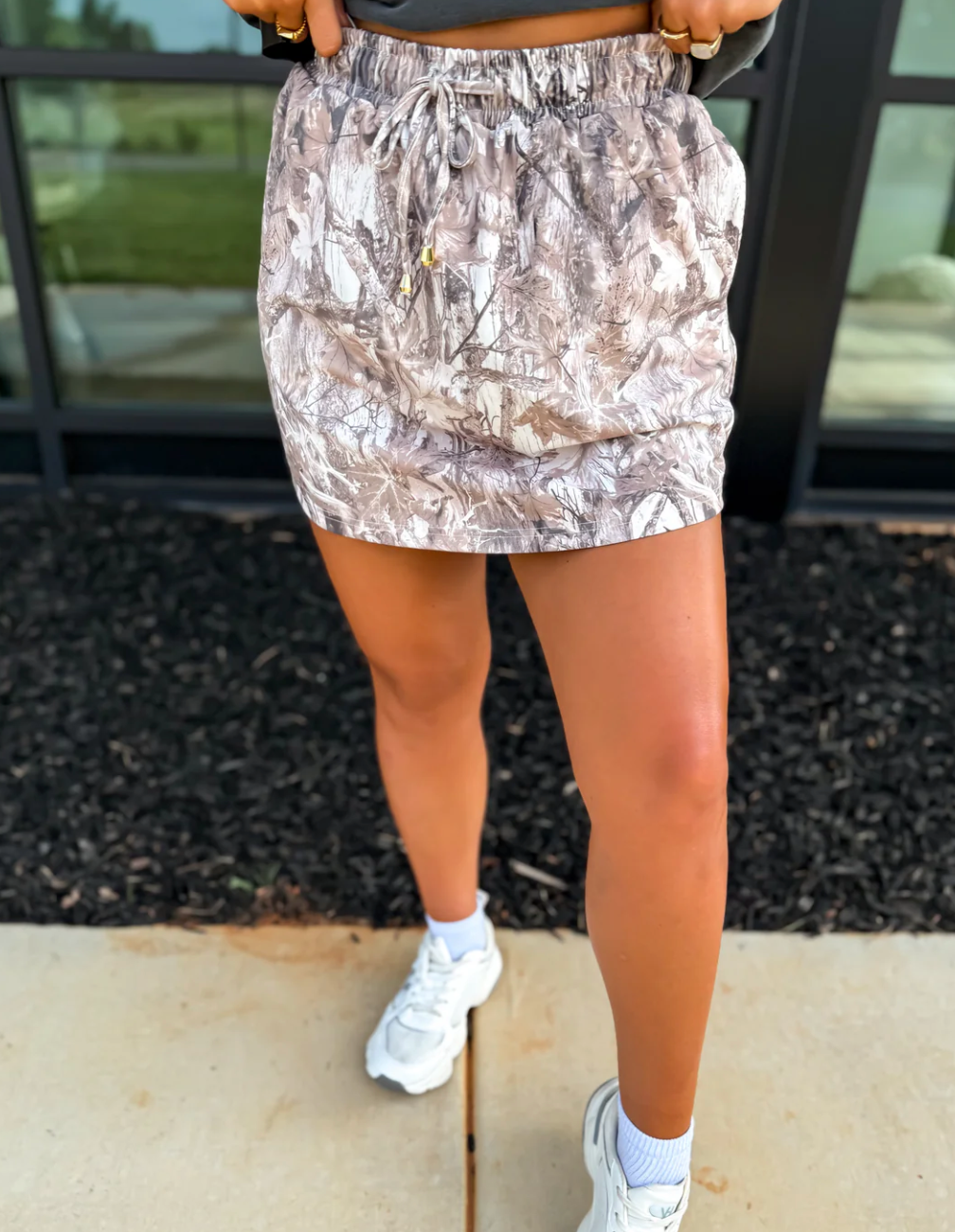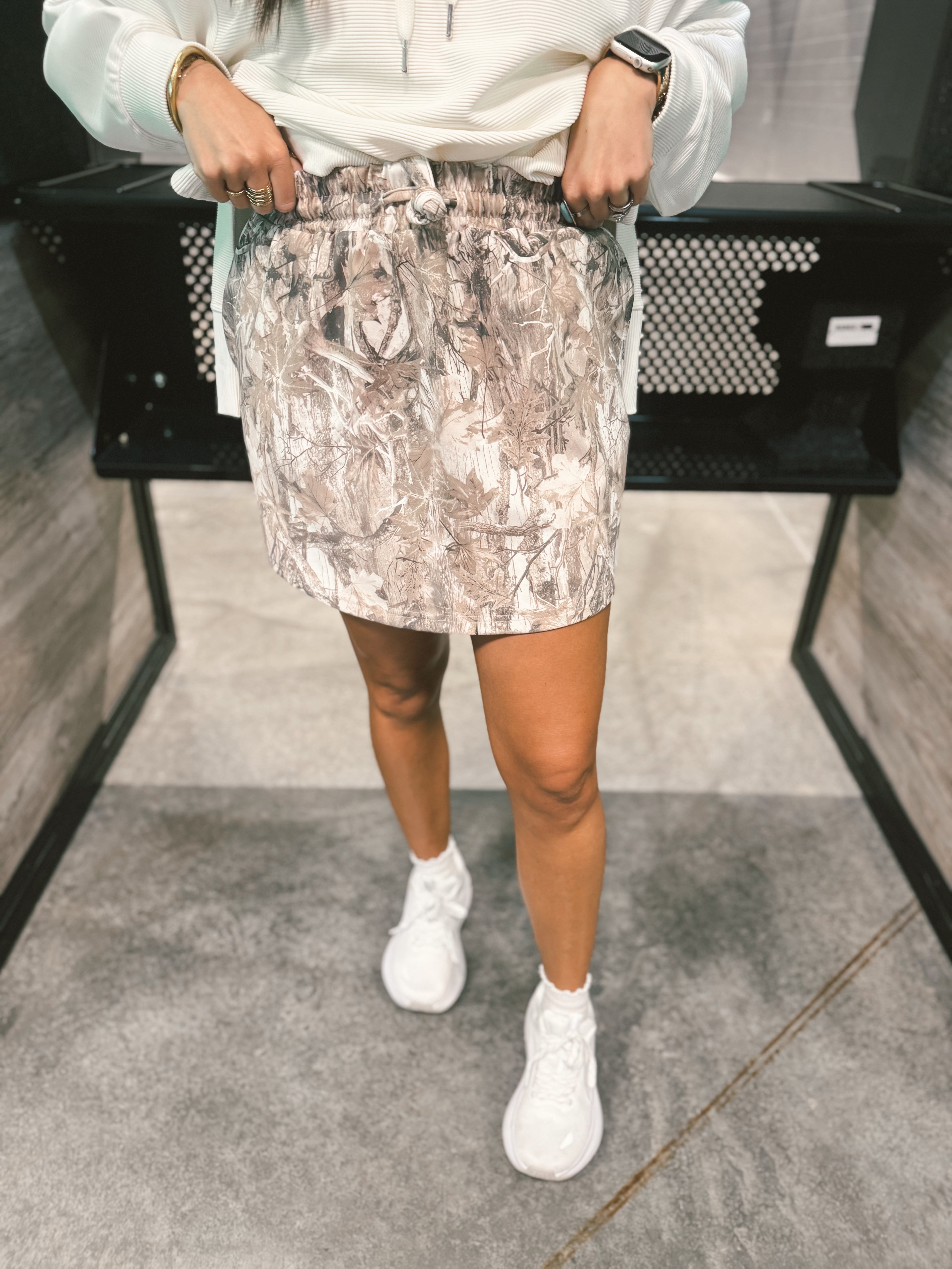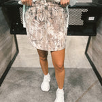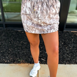 This Birdie Dark Camo Skort features built-in brown shorts made from super soft, stretchy active material for ultimate comfort and mobility. Designed with an adjustable tie waistband, elastic waist, and functional pockets, it combines sporty style with everyday practicality. Perfect for staying active while looking effortlessly put together.