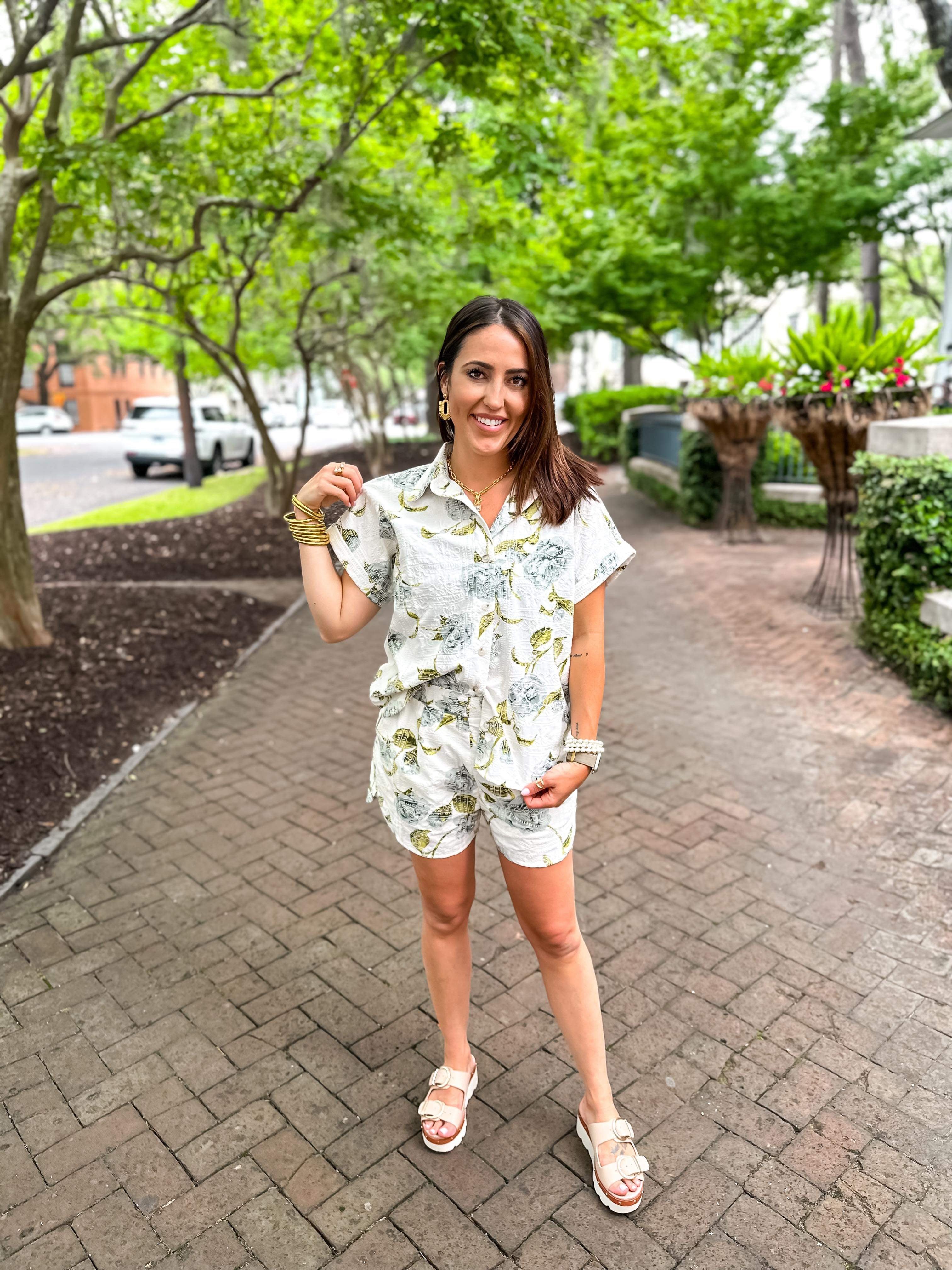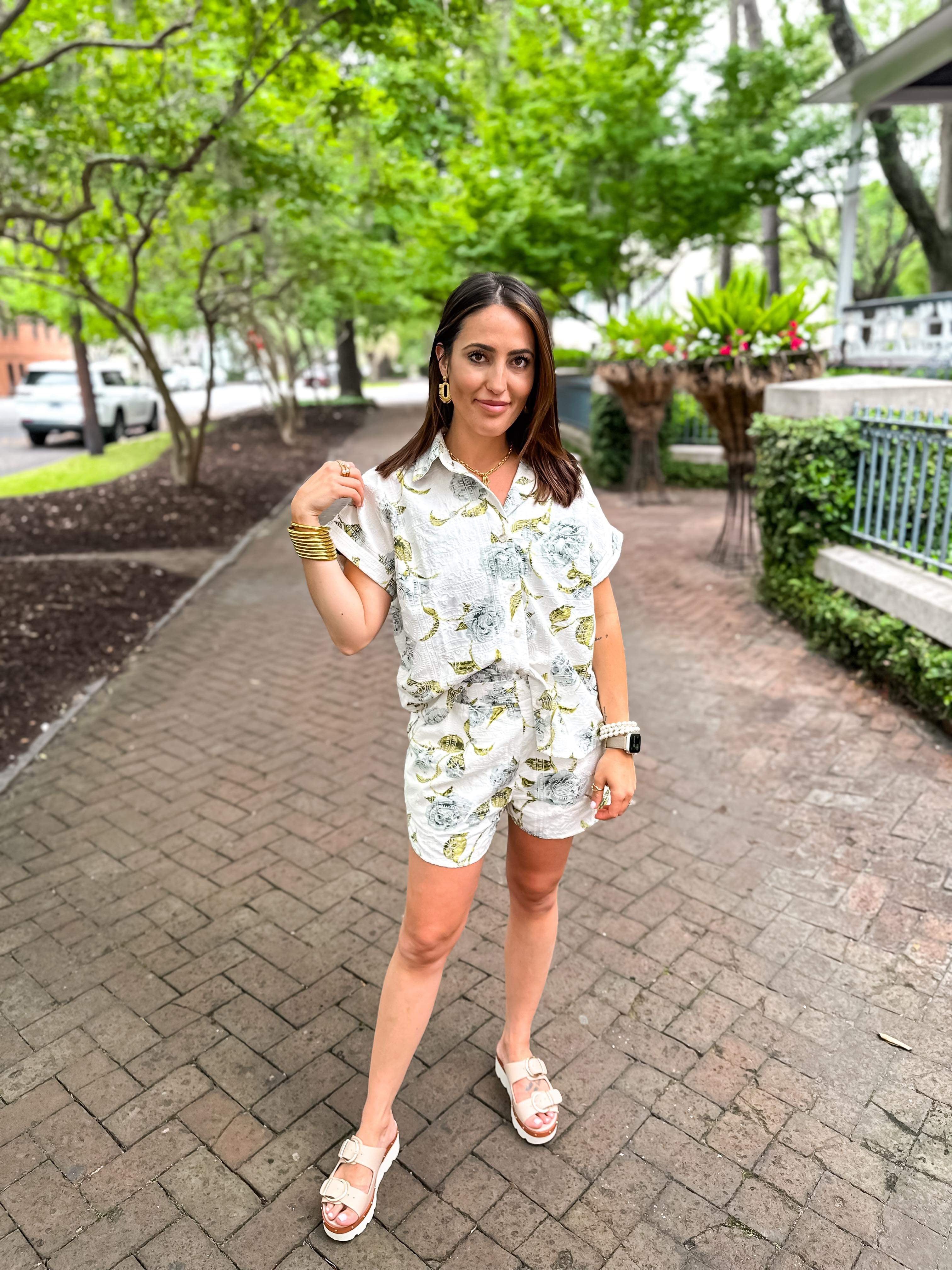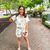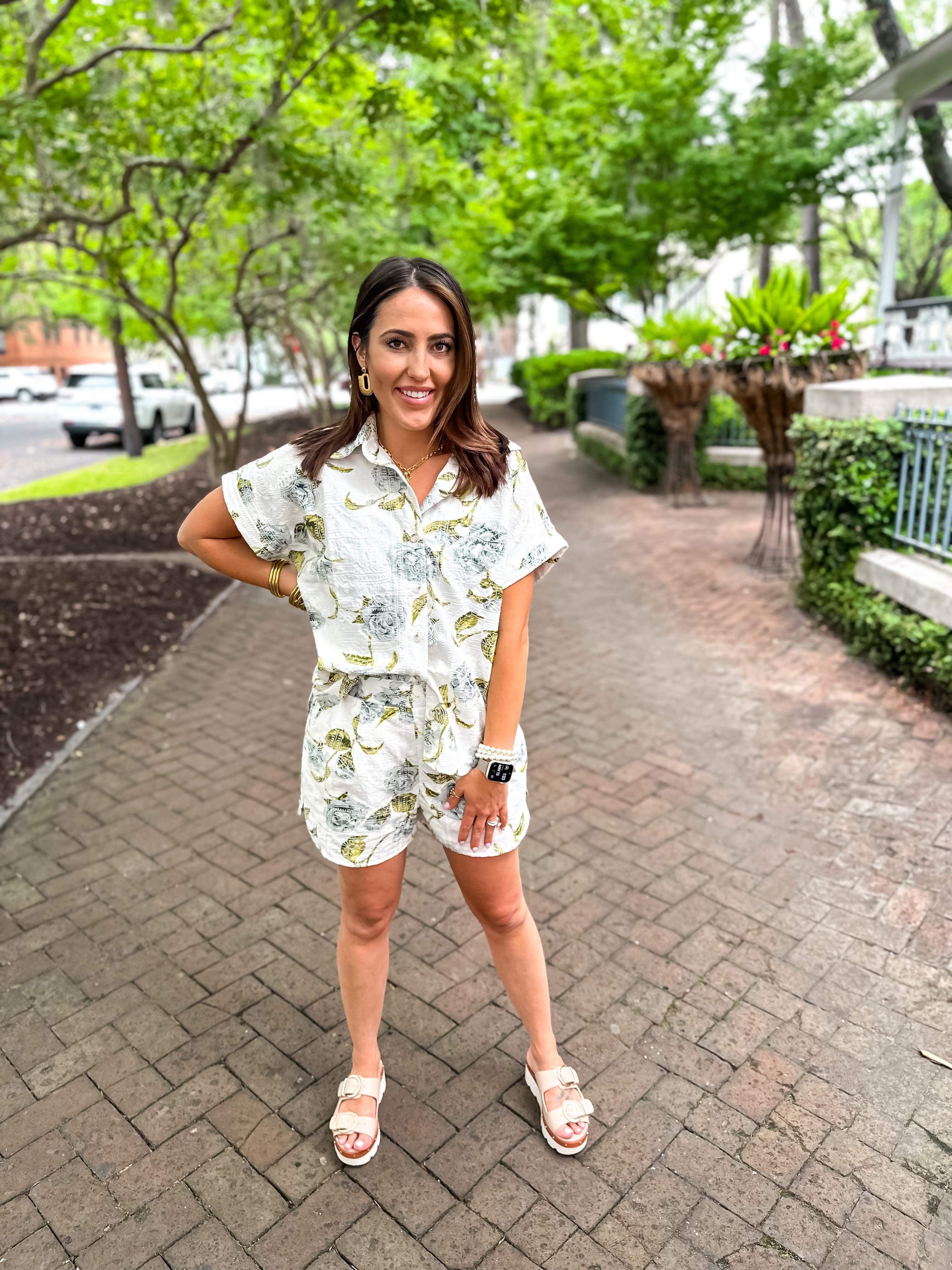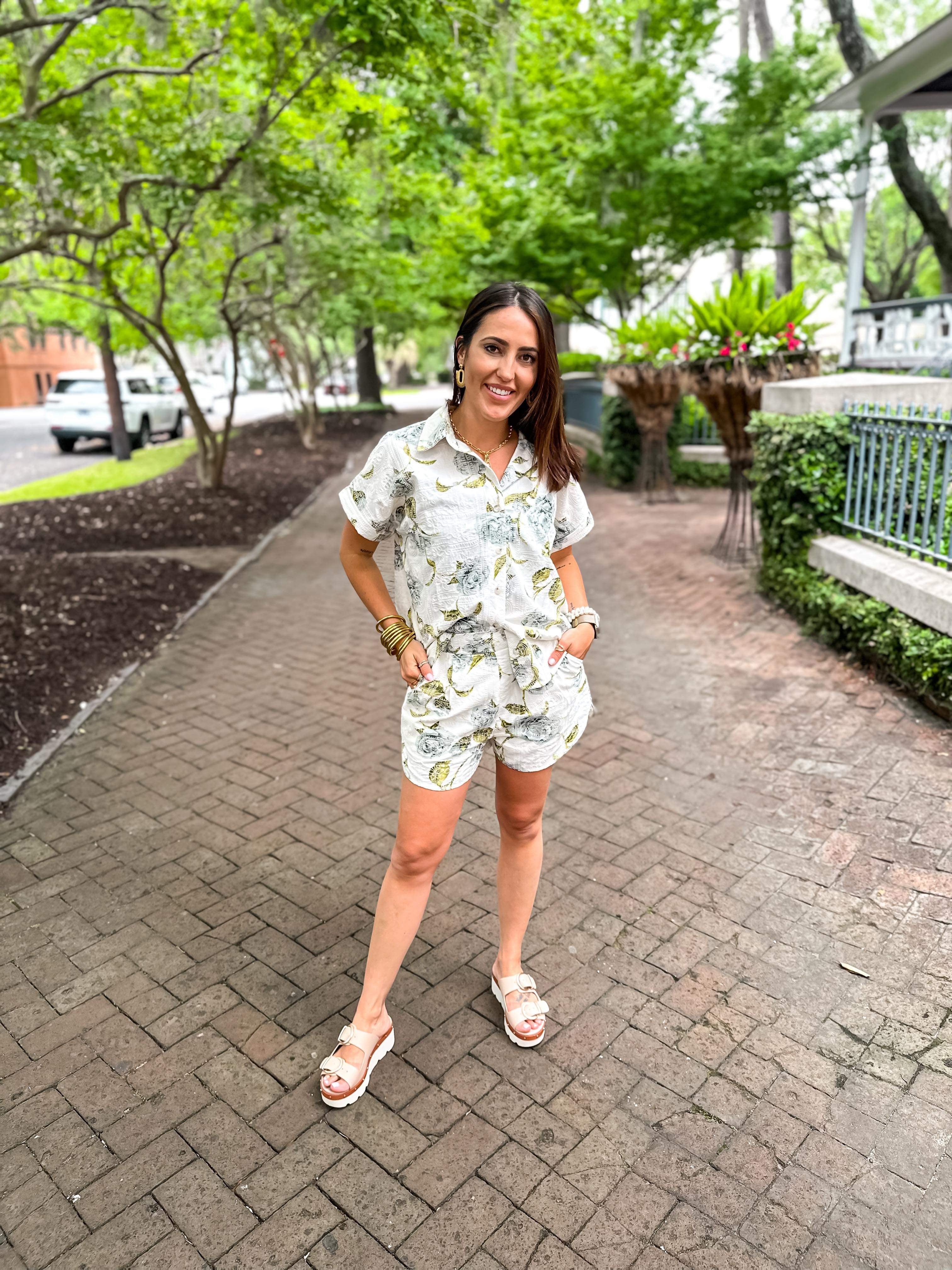 Floral print high-waisted shorts featuring floral stitching throughout. Smocking at waist. Lined. Woven. Non-sheer. Lightweight.