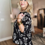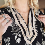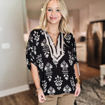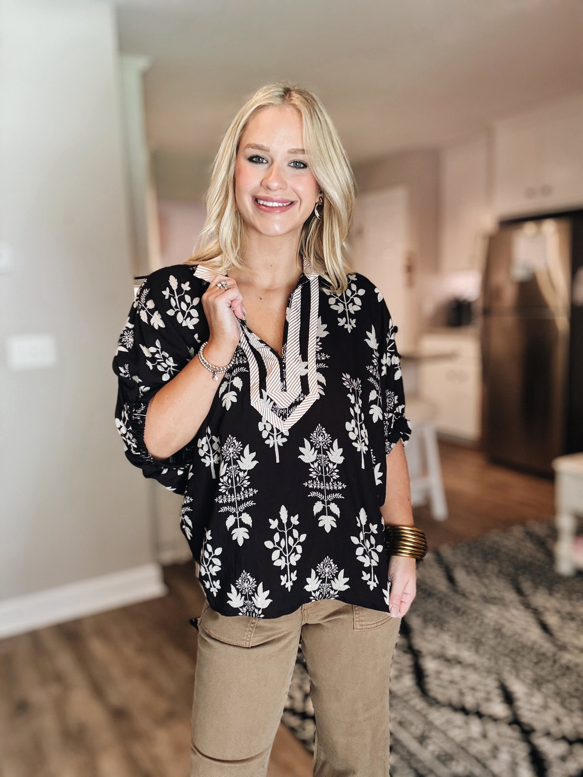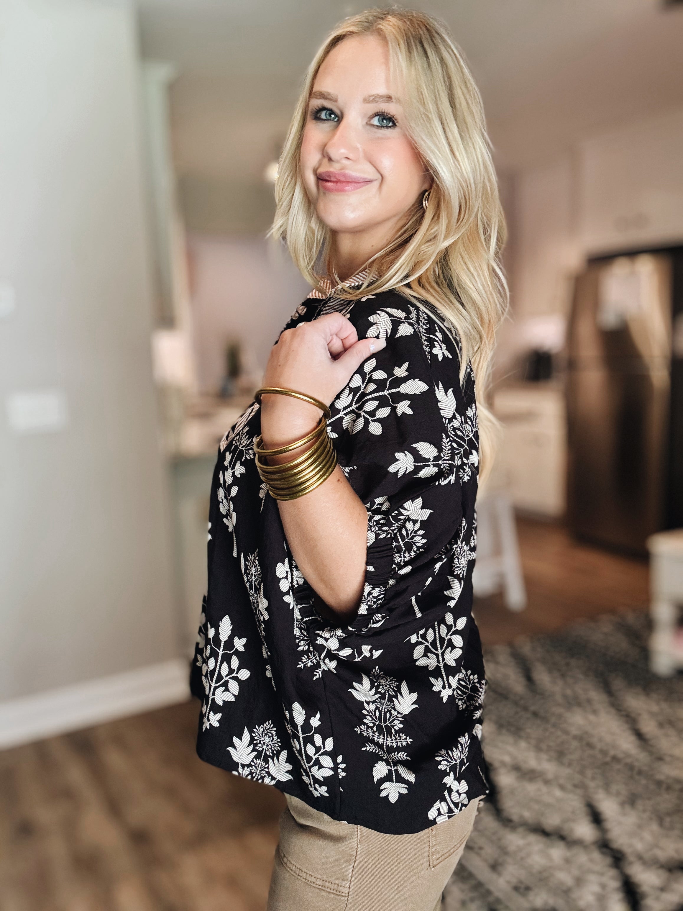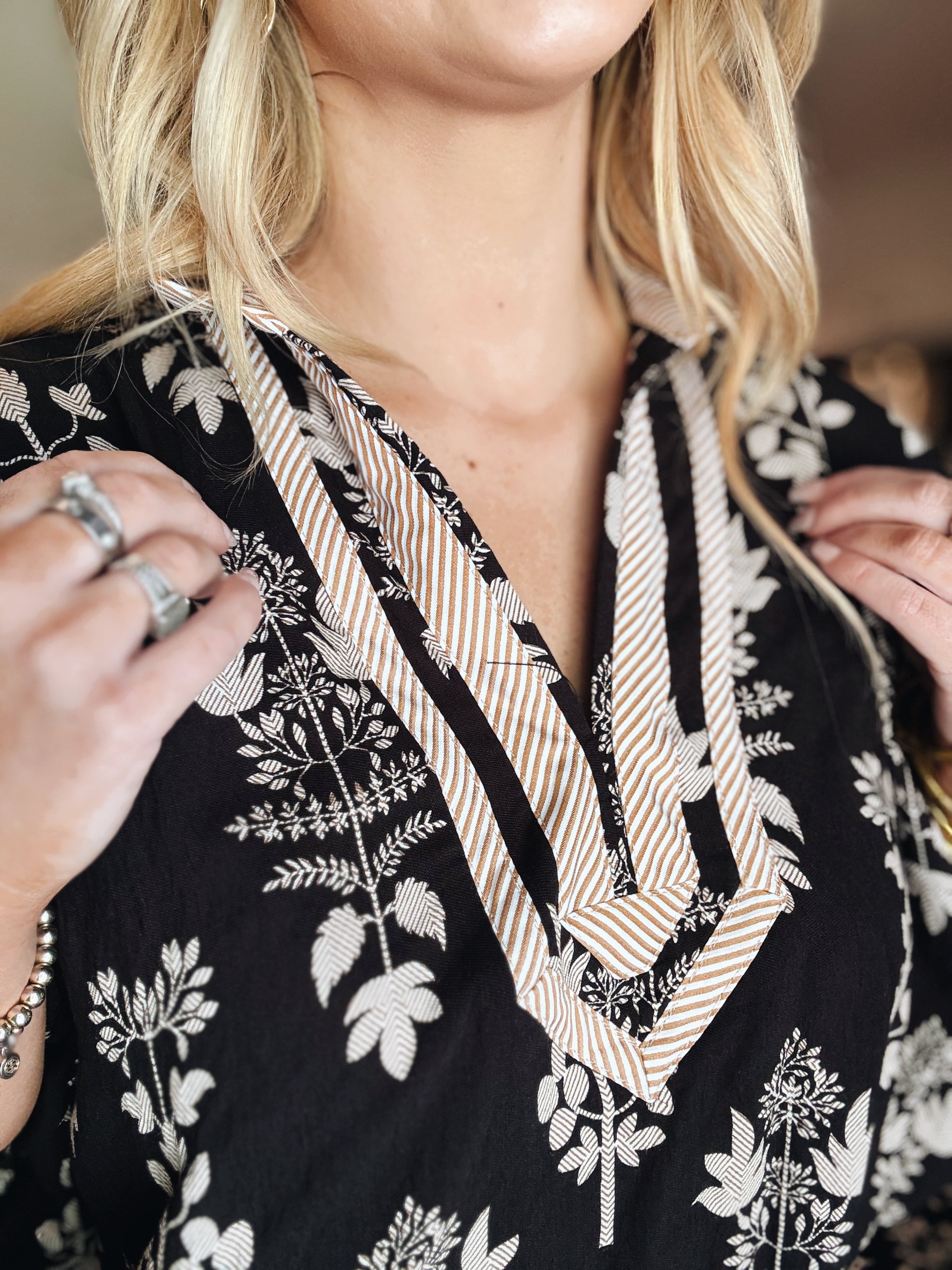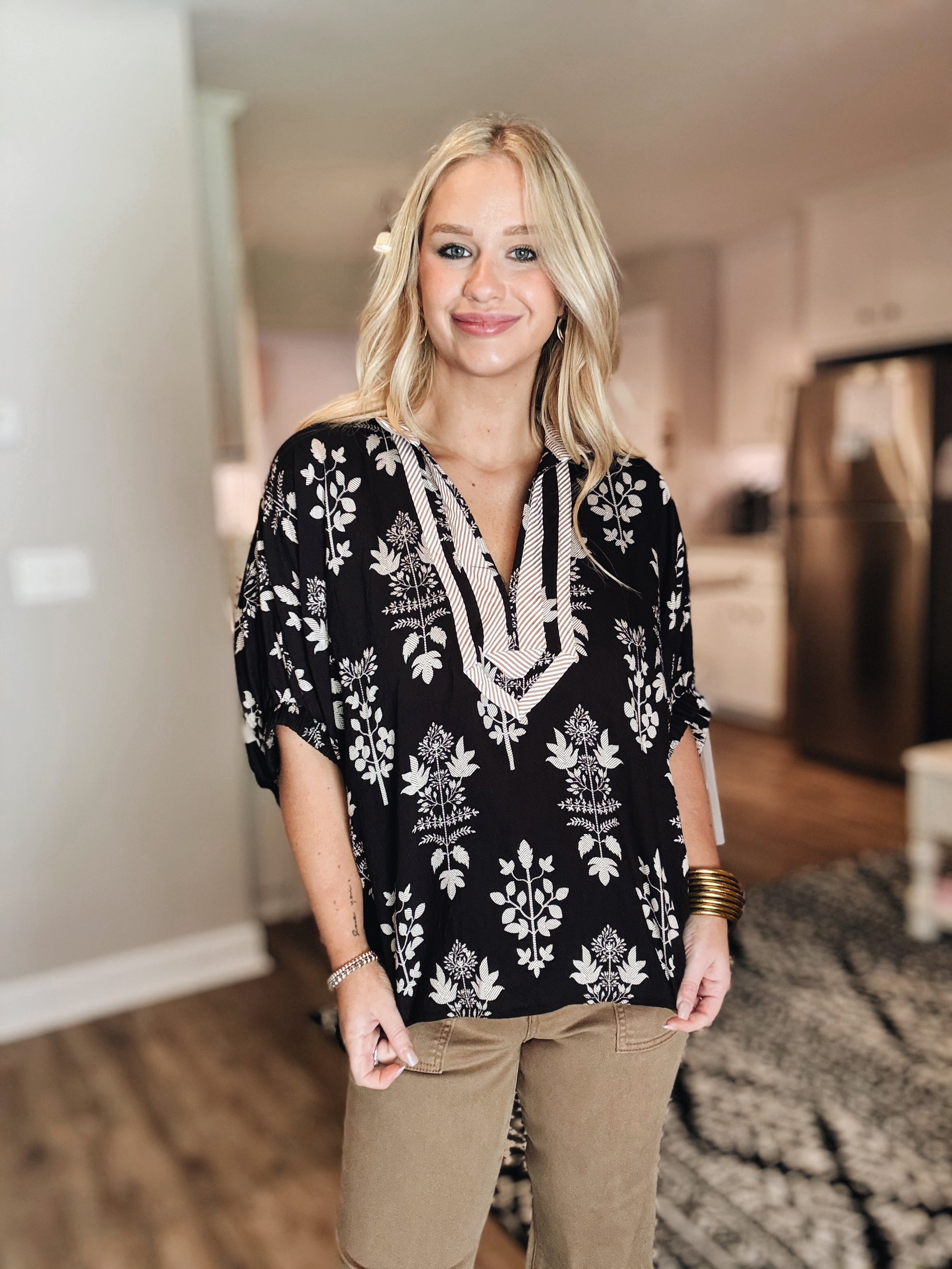 Abstract botanical print short dolman sleeve top featuring contrast accent caftan-inspired V-neck band. Unlined. Woven. Non-sheer. Lightweight.