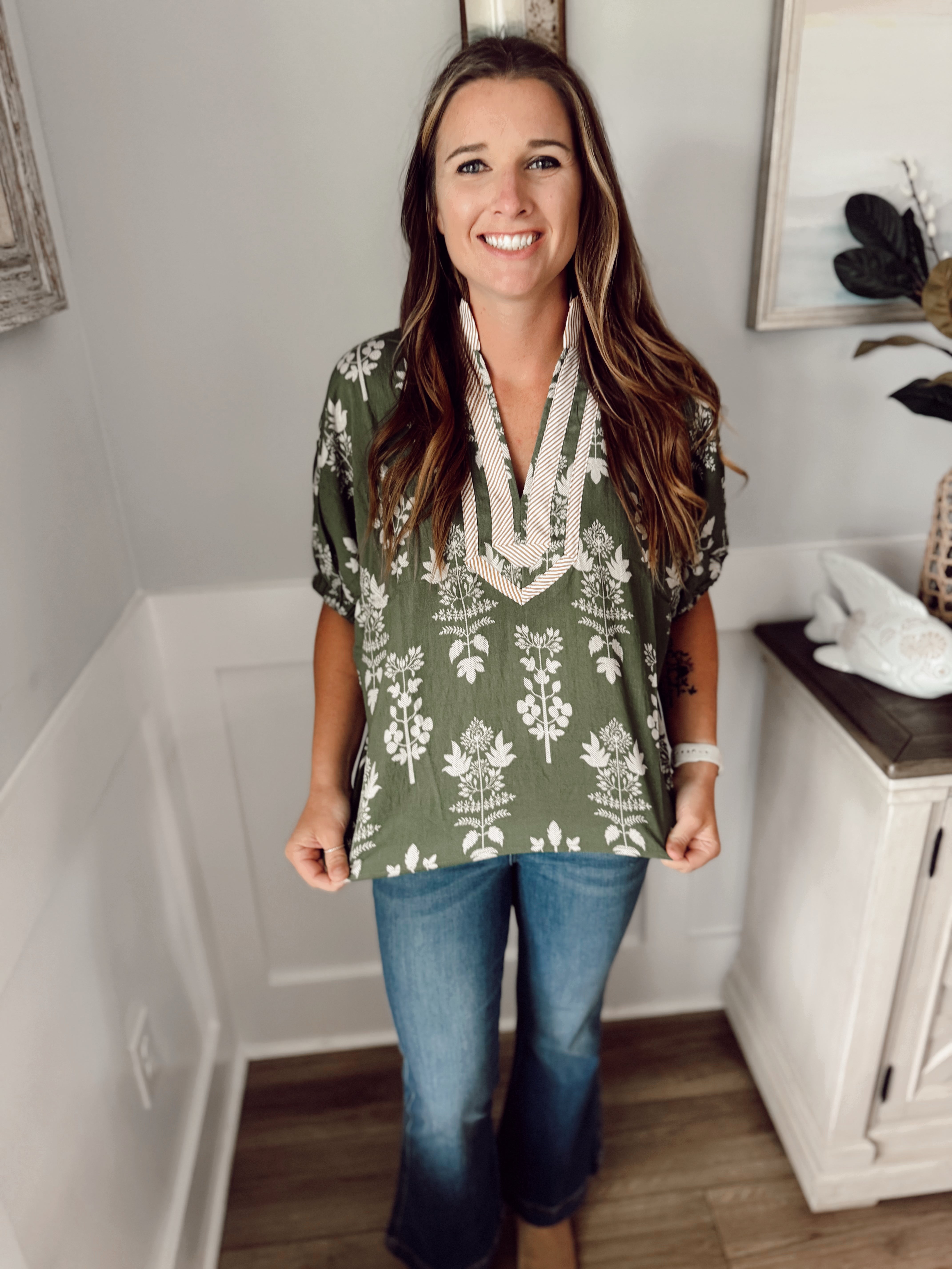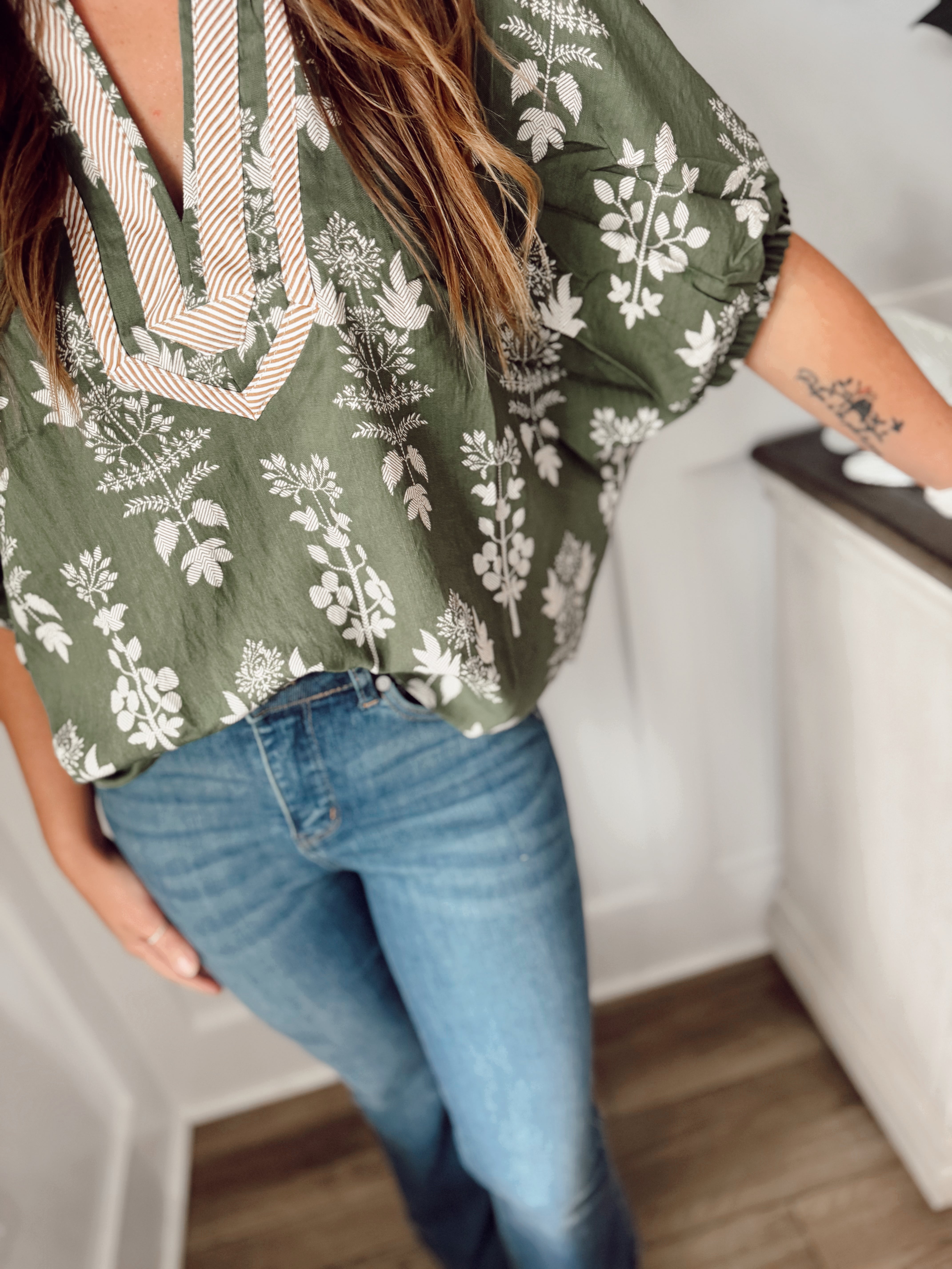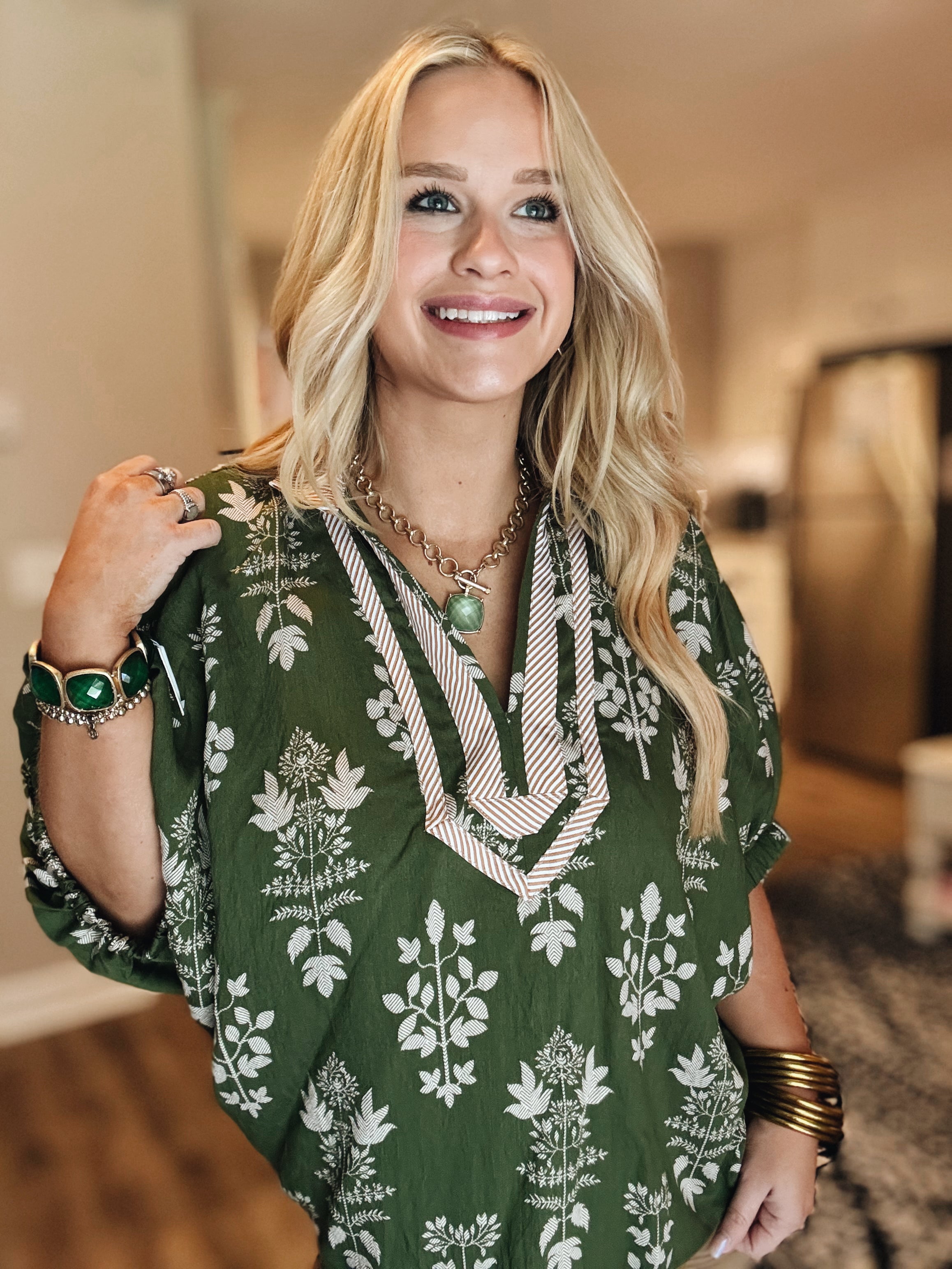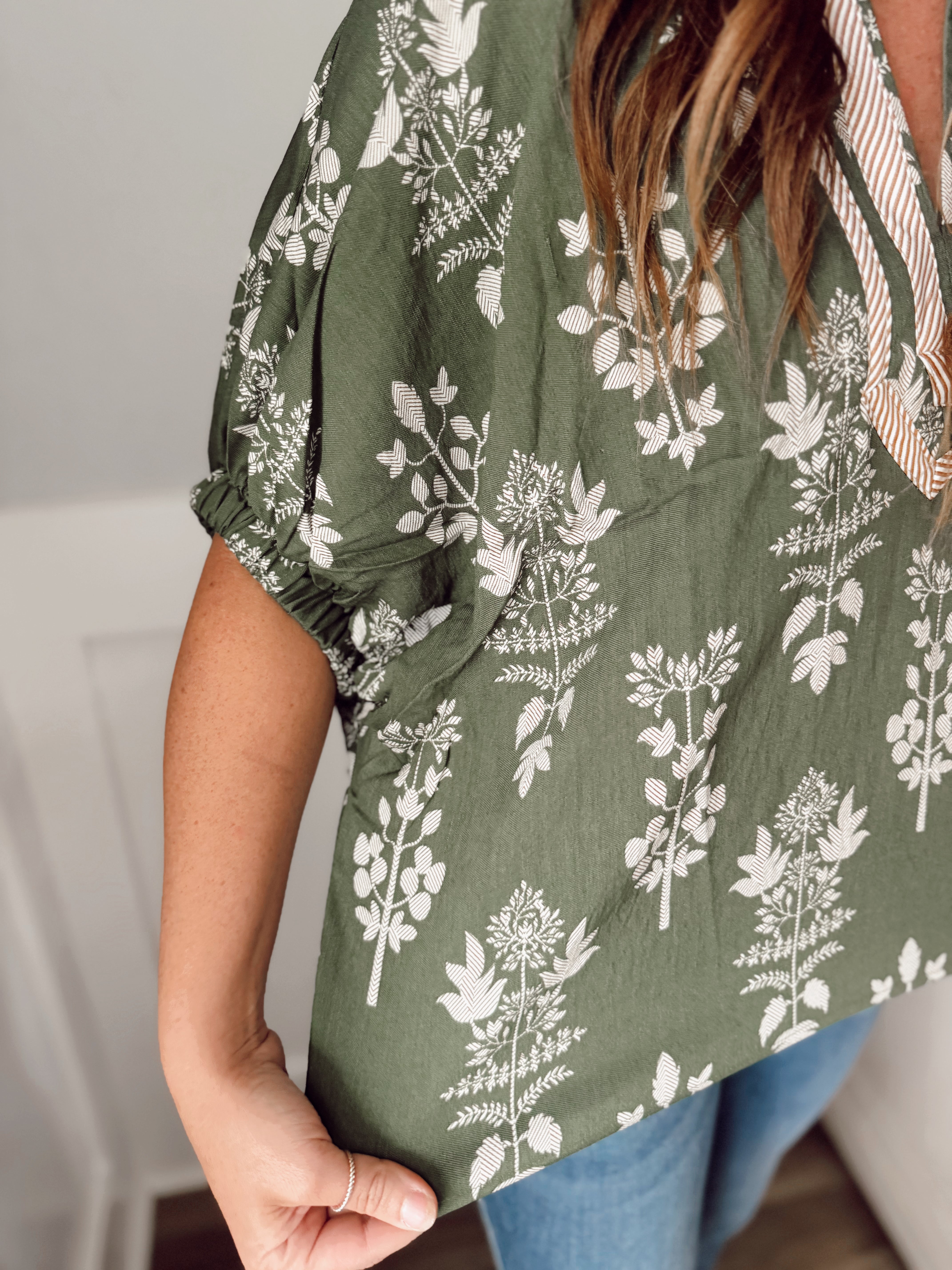 Abstract botanical print short dolman sleeve top featuring contrast accent caftan-inspired V-neck band. Unlined. Woven. Non-sheer. Lightweight.