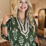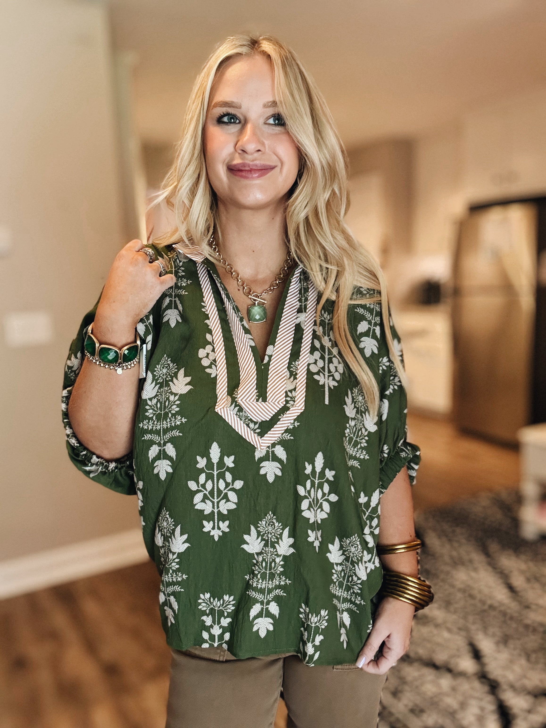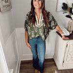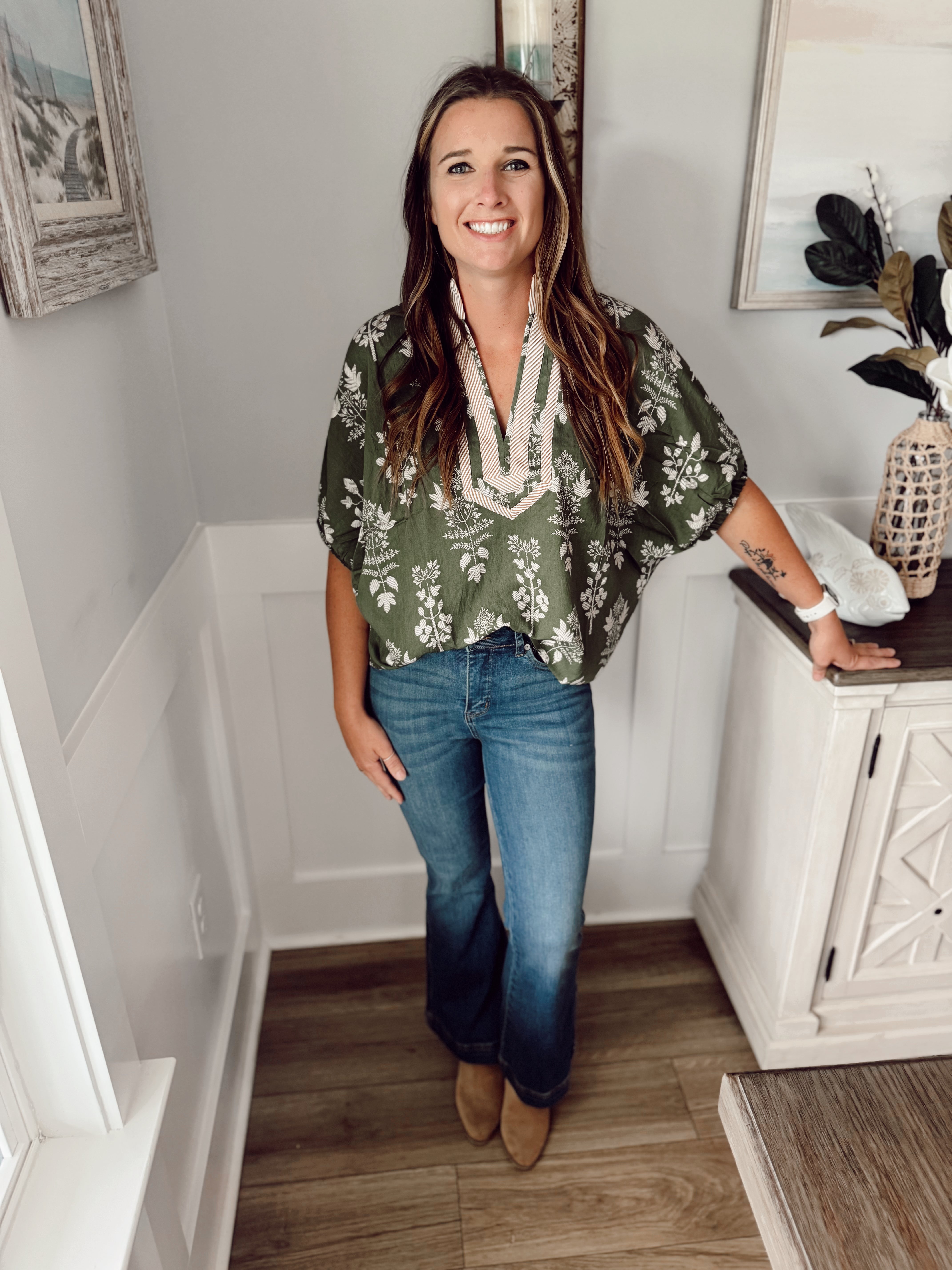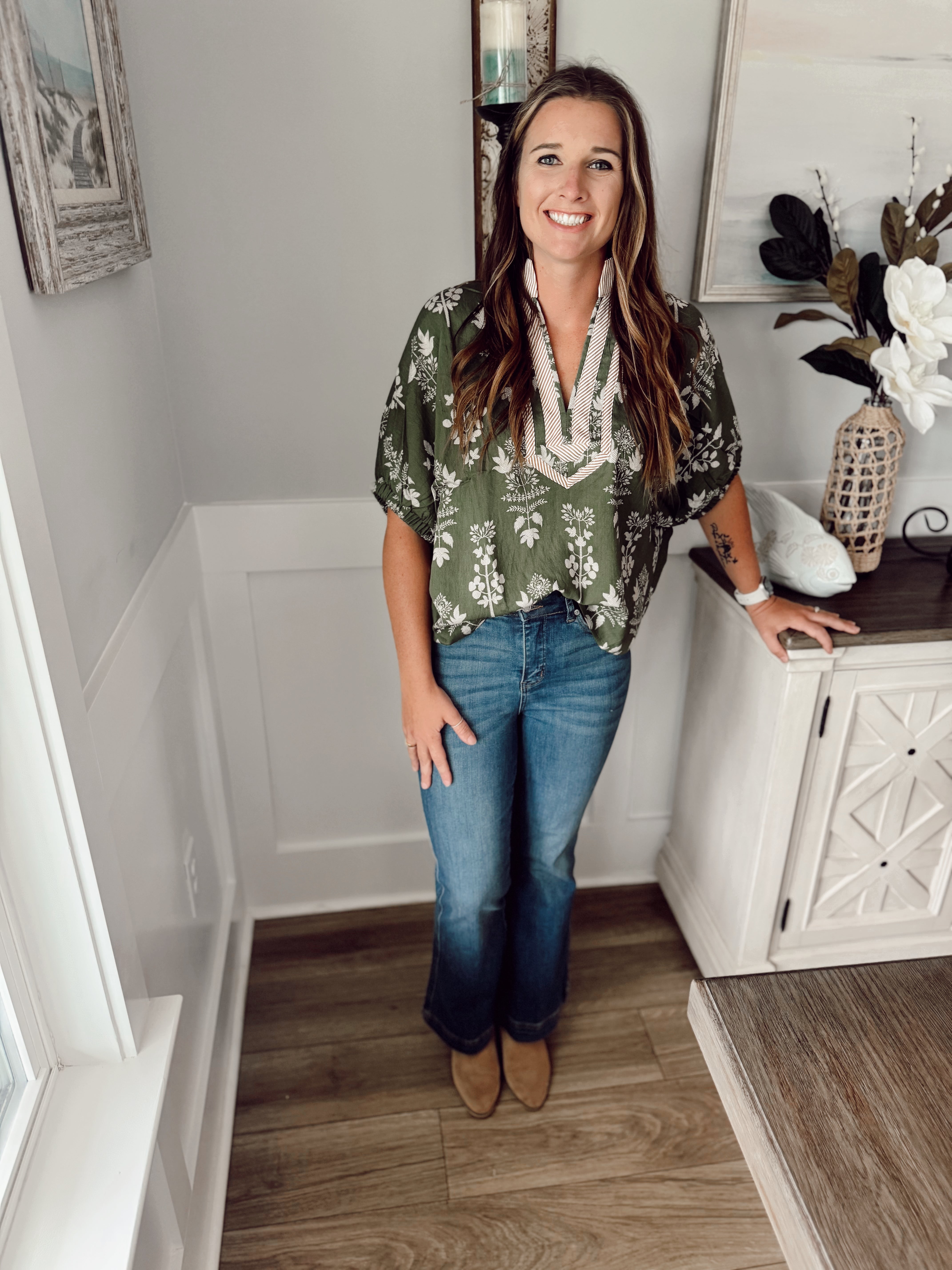 Abstract botanical print short dolman sleeve top featuring contrast accent caftan-inspired V-neck band. Unlined. Woven. Non-sheer. Lightweight.