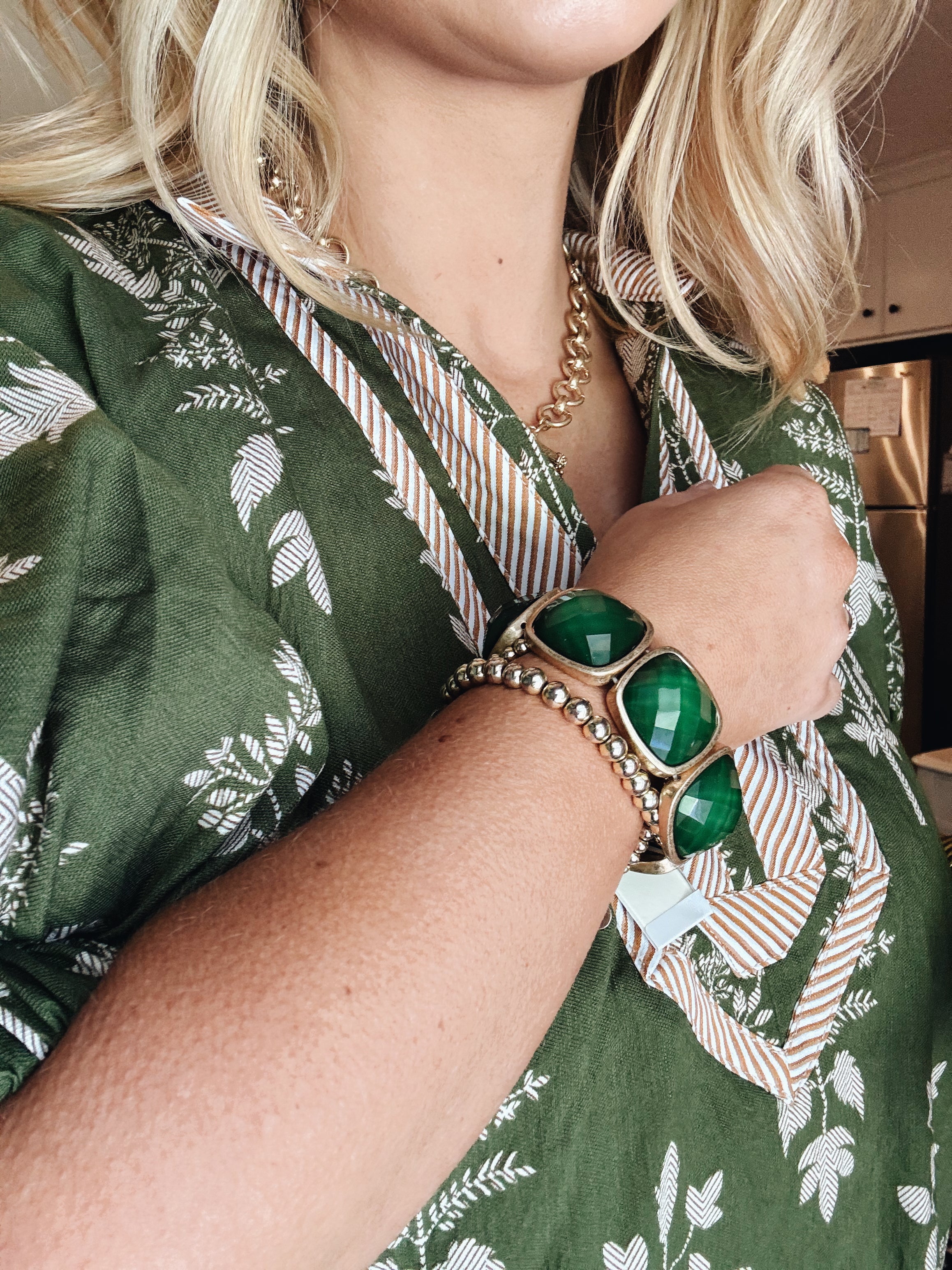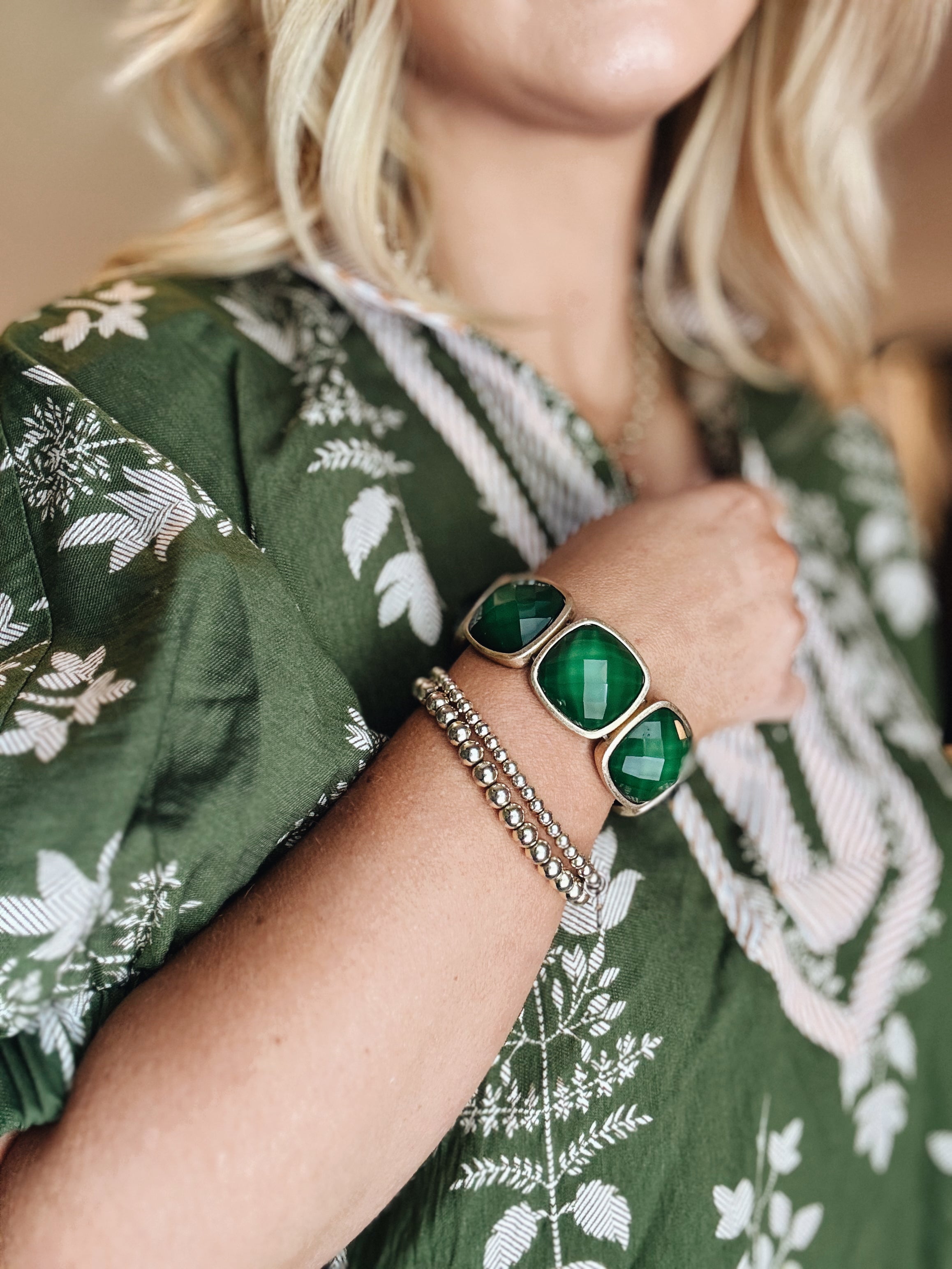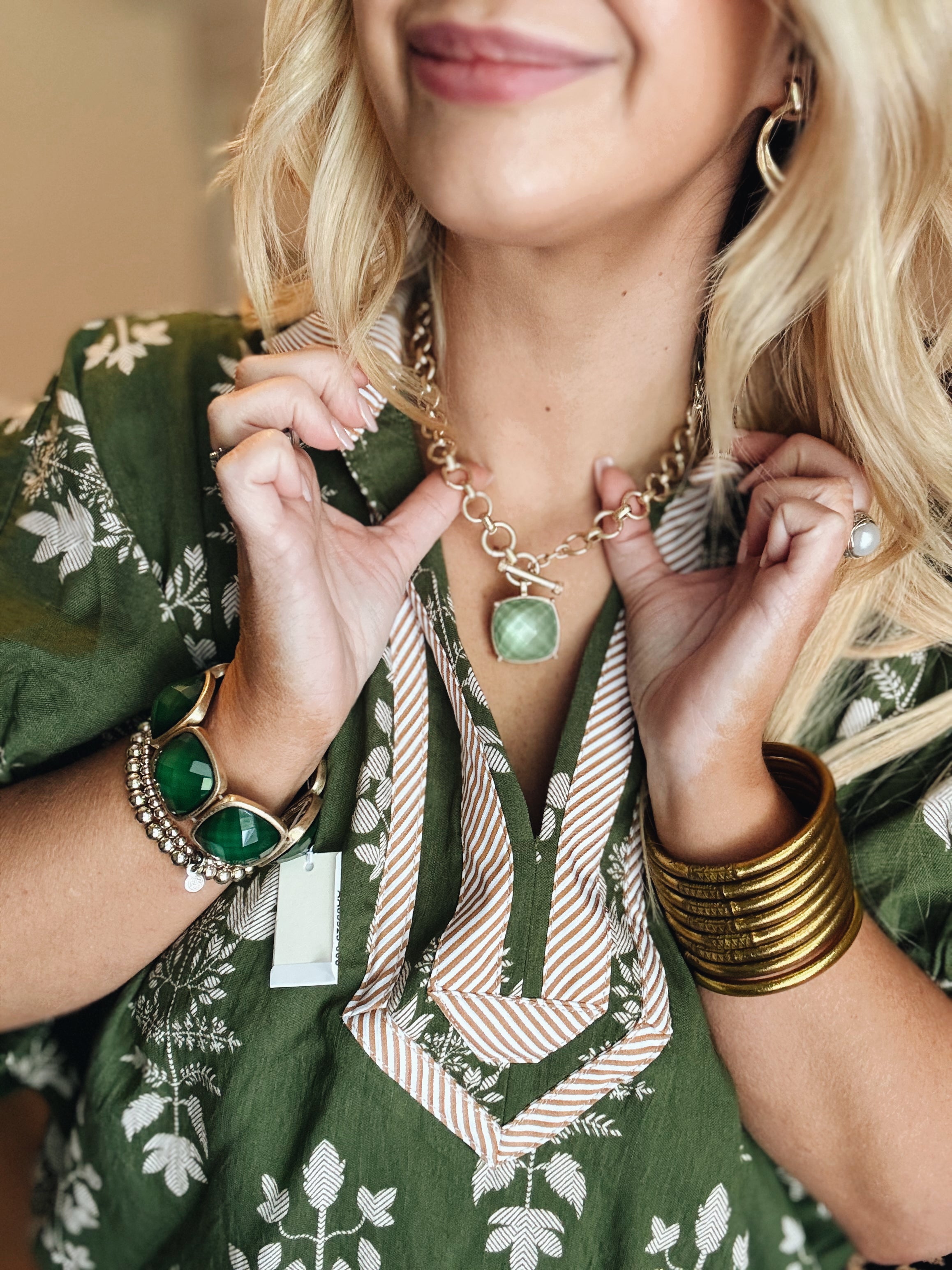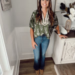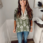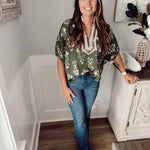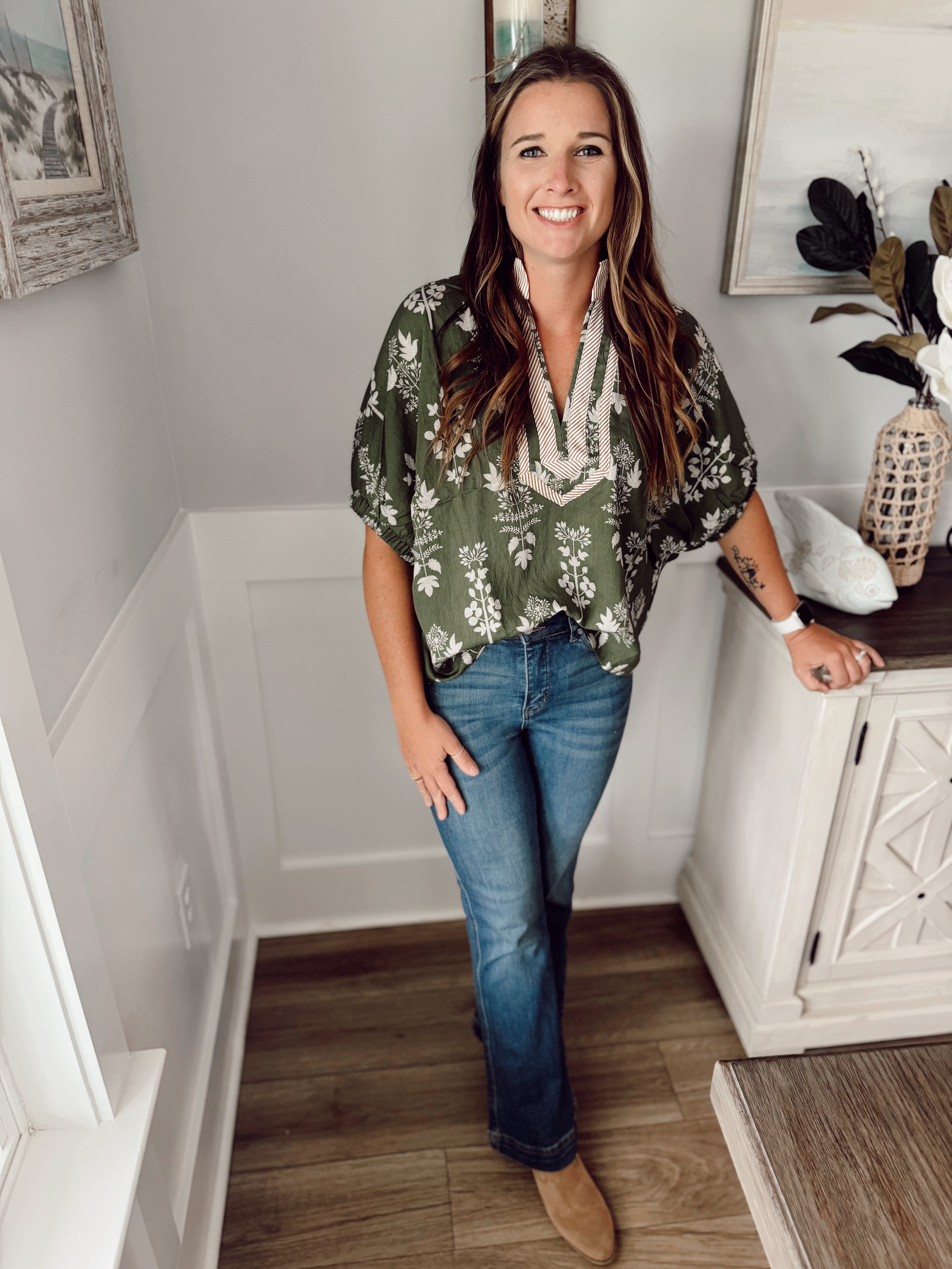 Abstract botanical print short dolman sleeve top featuring contrast accent caftan-inspired V-neck band. Unlined. Woven. Non-sheer. Lightweight.