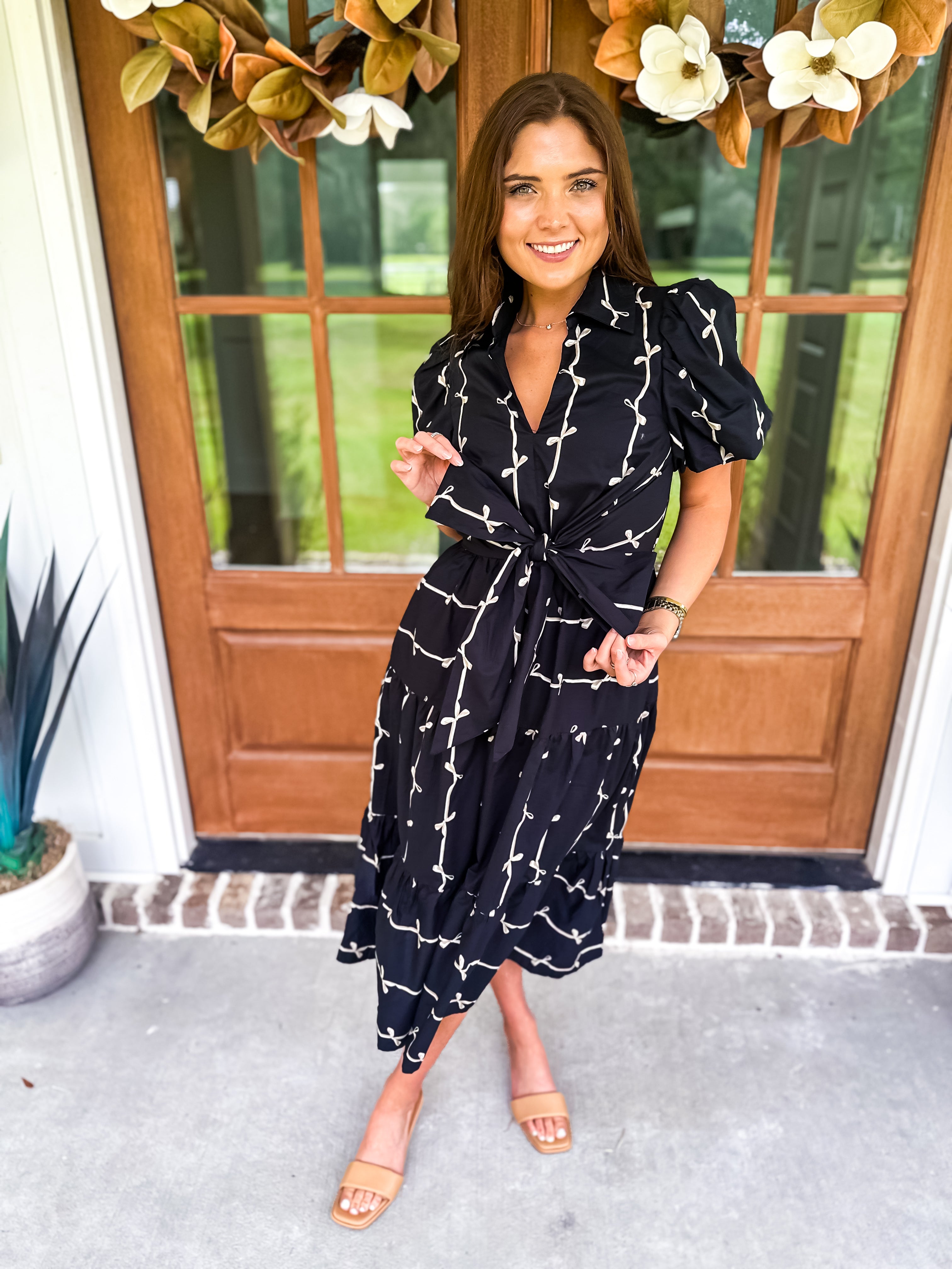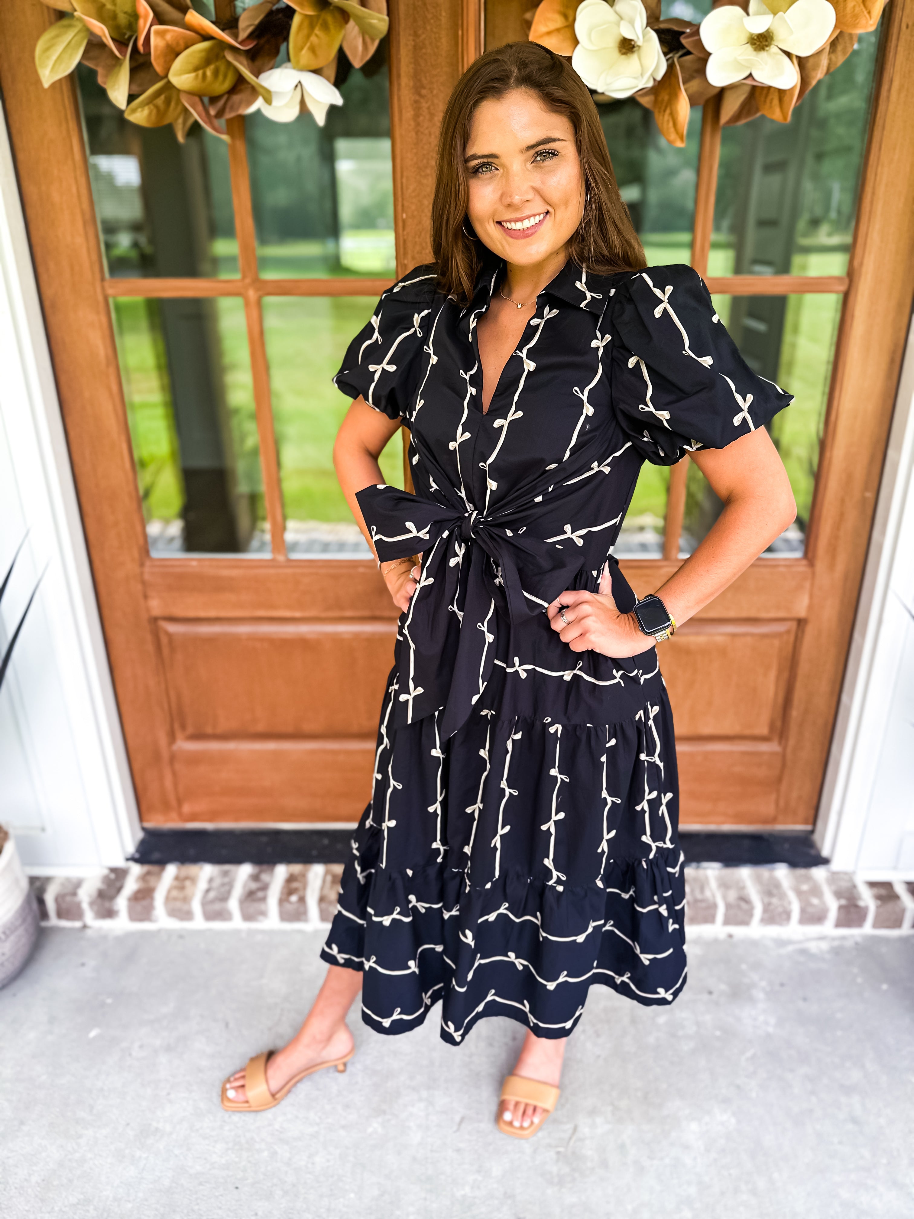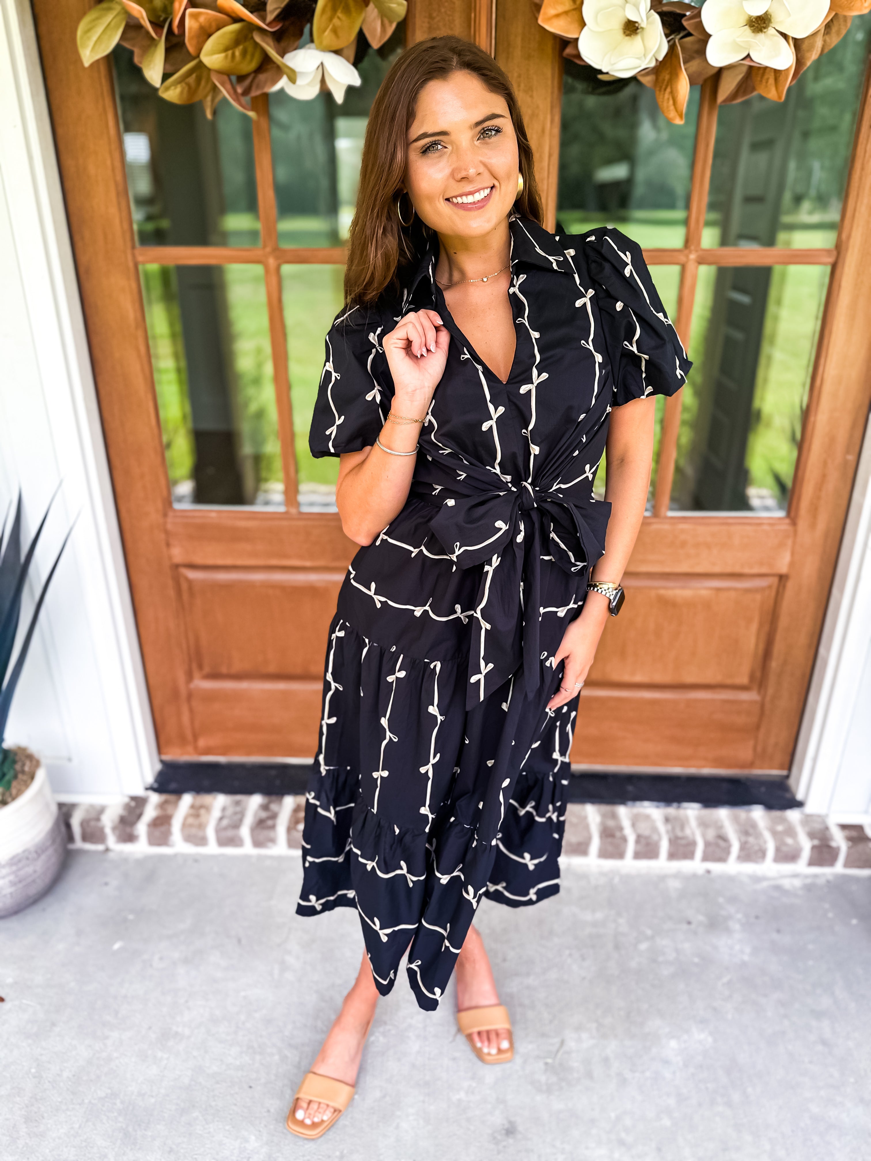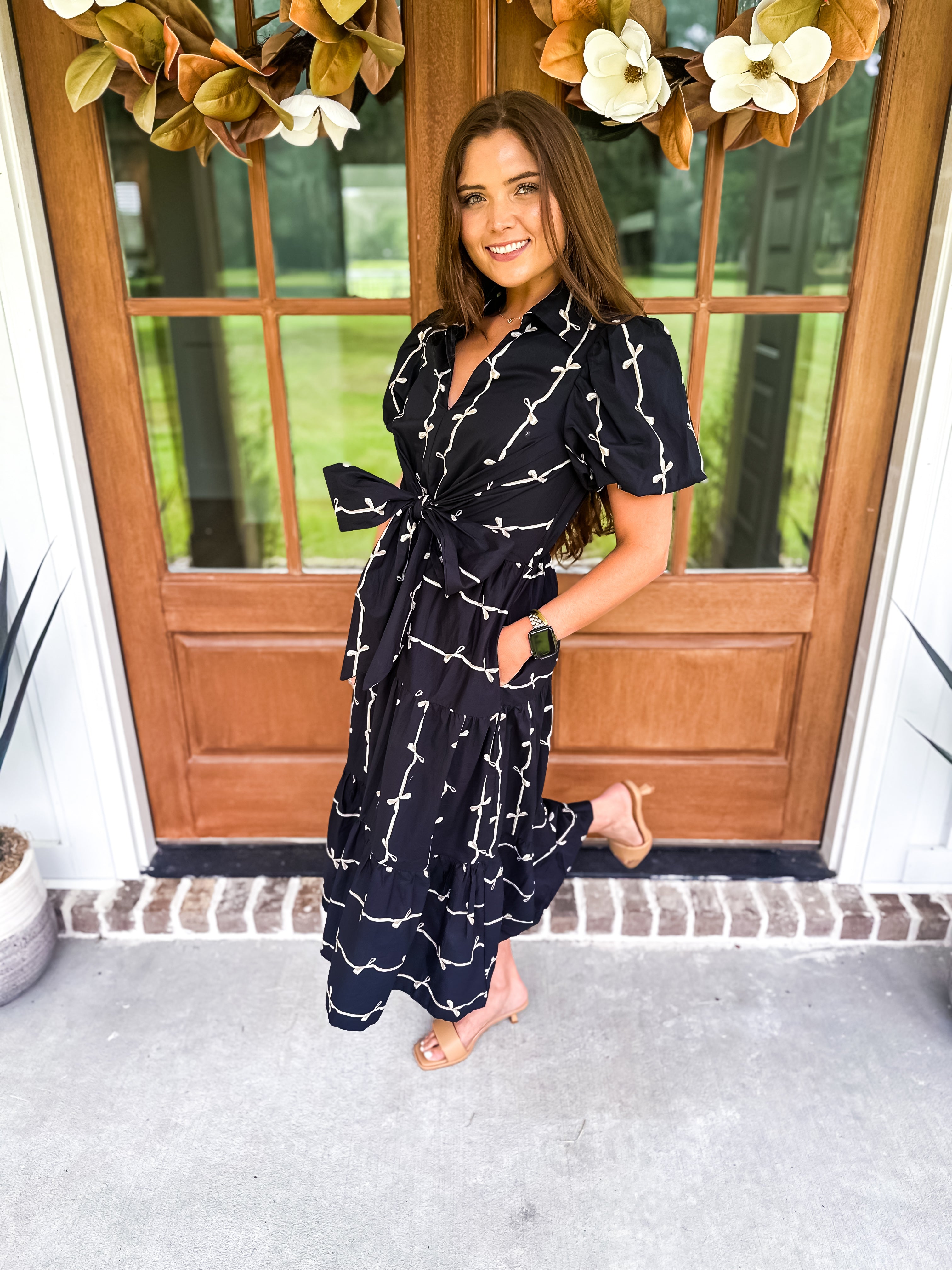 Printed short puff sleeve v neck midi dress featuring pockets at side. Self tie detail at waist. Lined. Woven. Non-sheer. Lightweight.