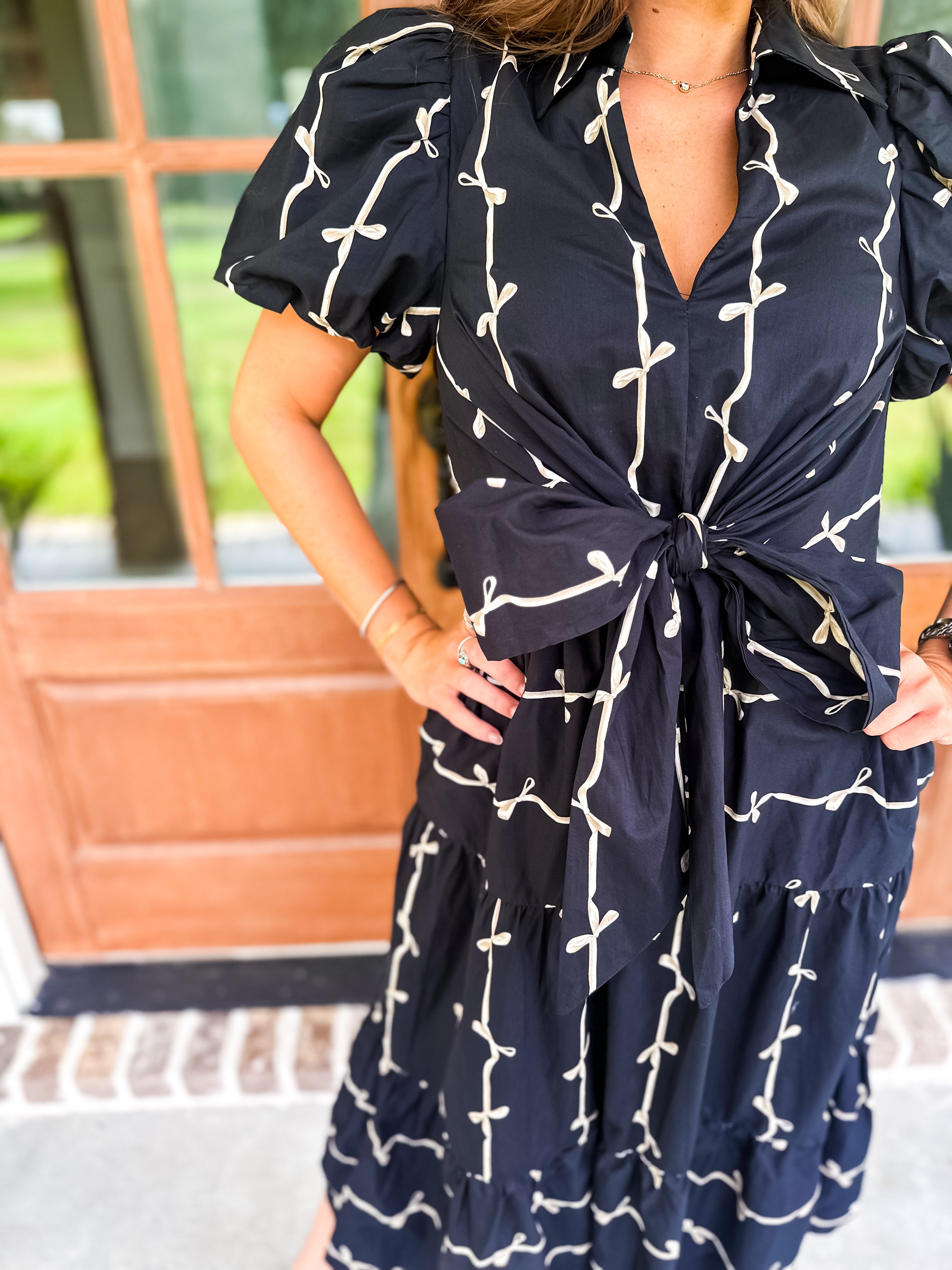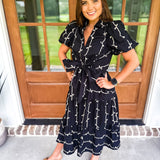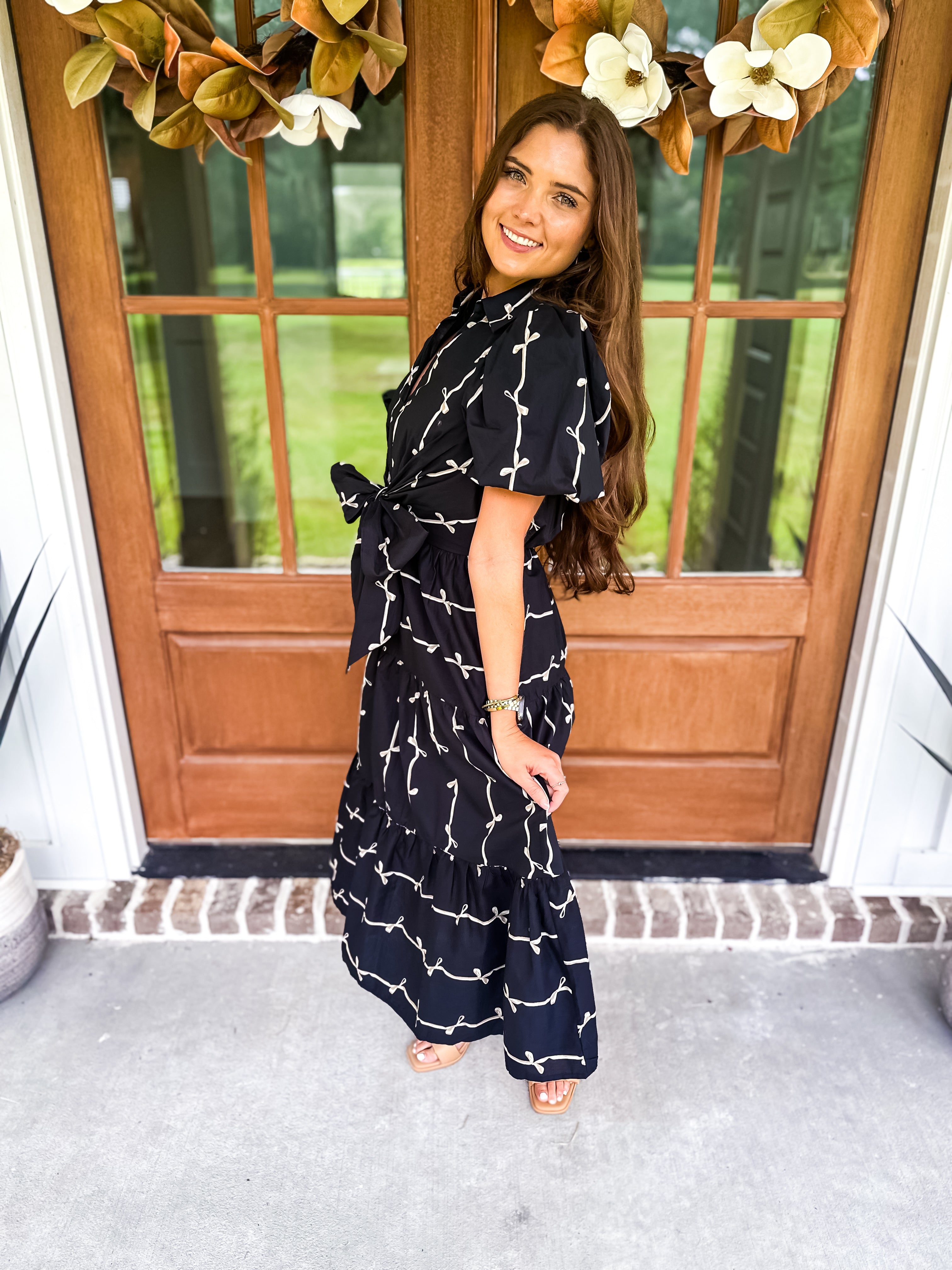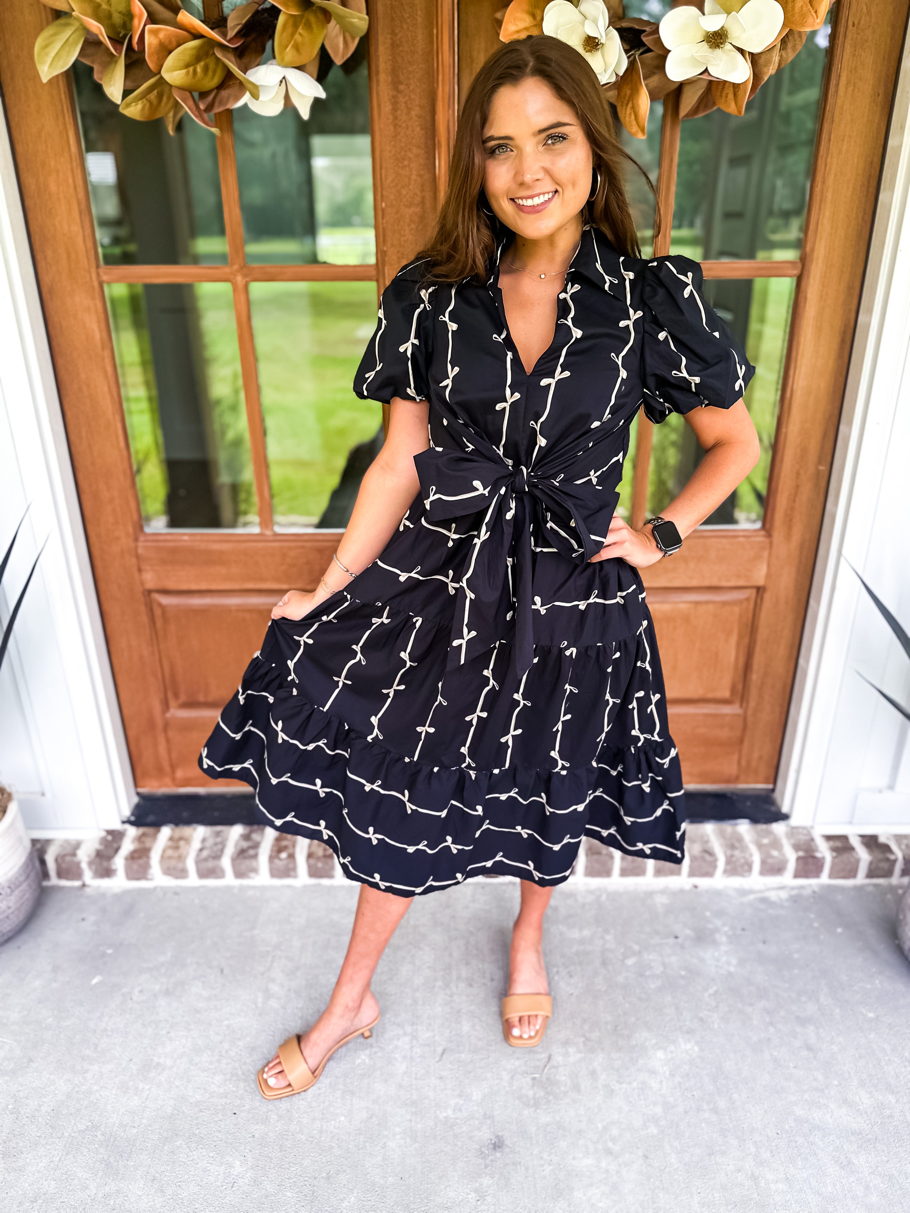 Printed short puff sleeve v neck midi dress featuring pockets at side. Self tie detail at waist. Lined. Woven. Non-sheer. Lightweight.