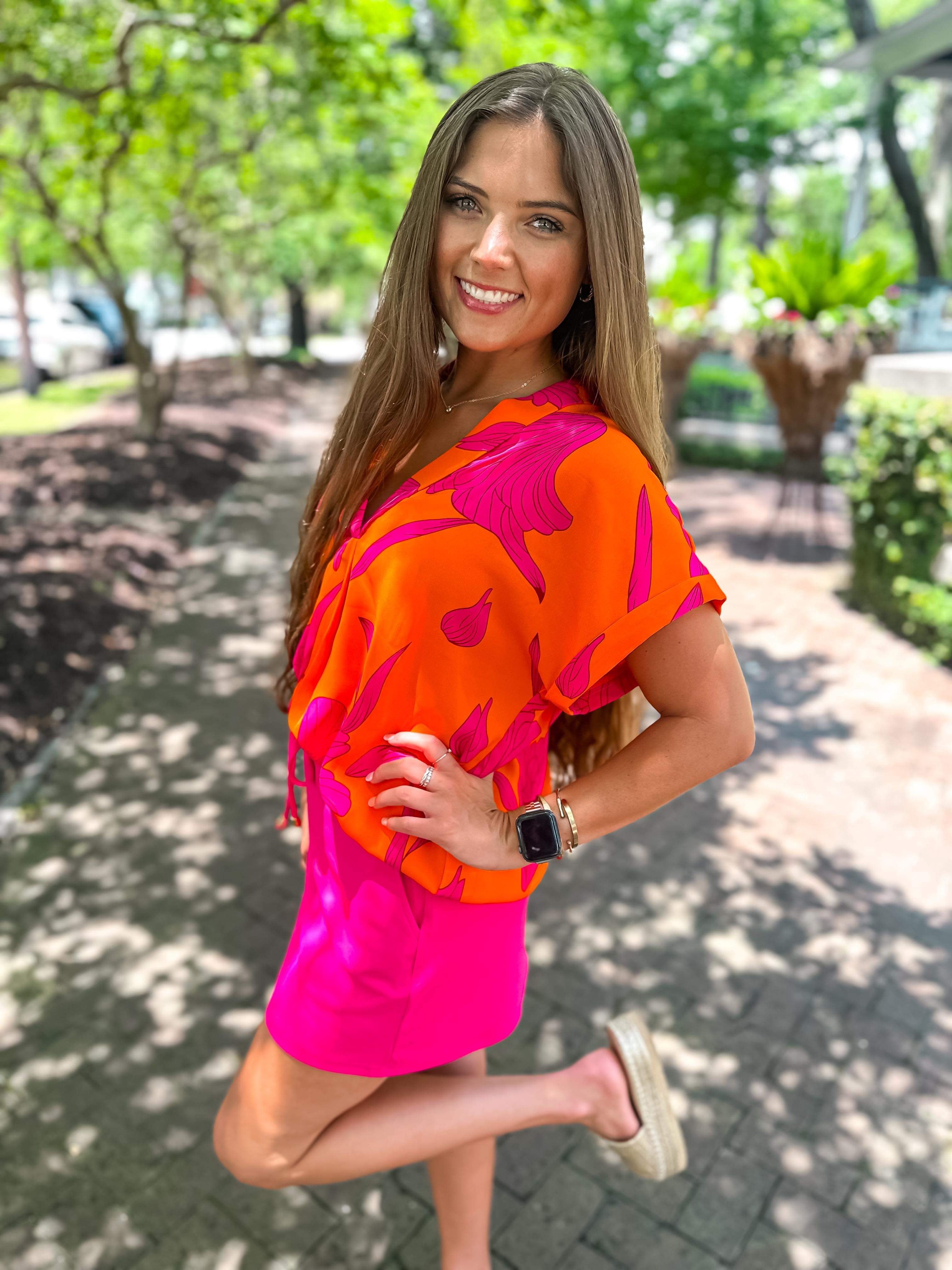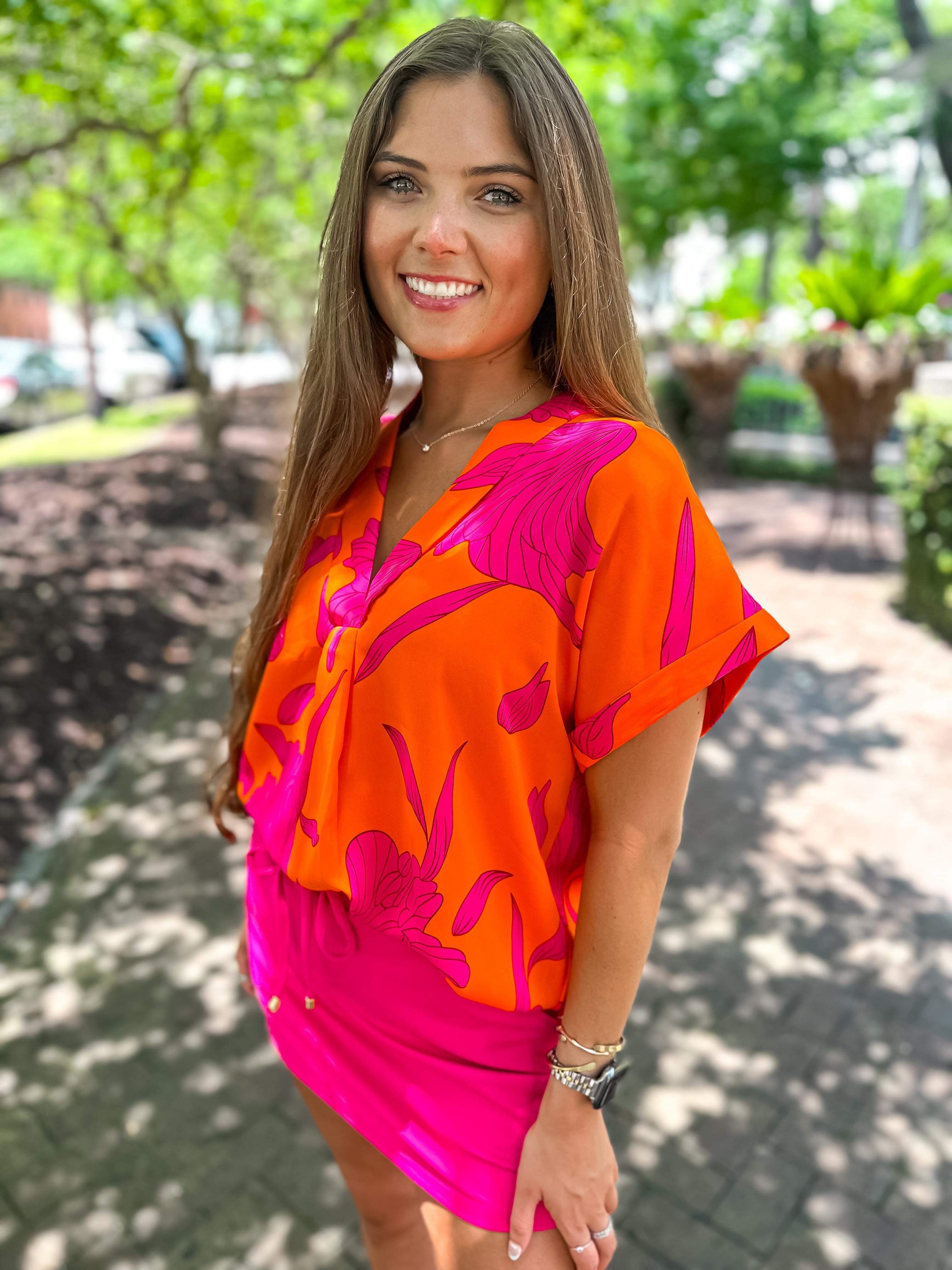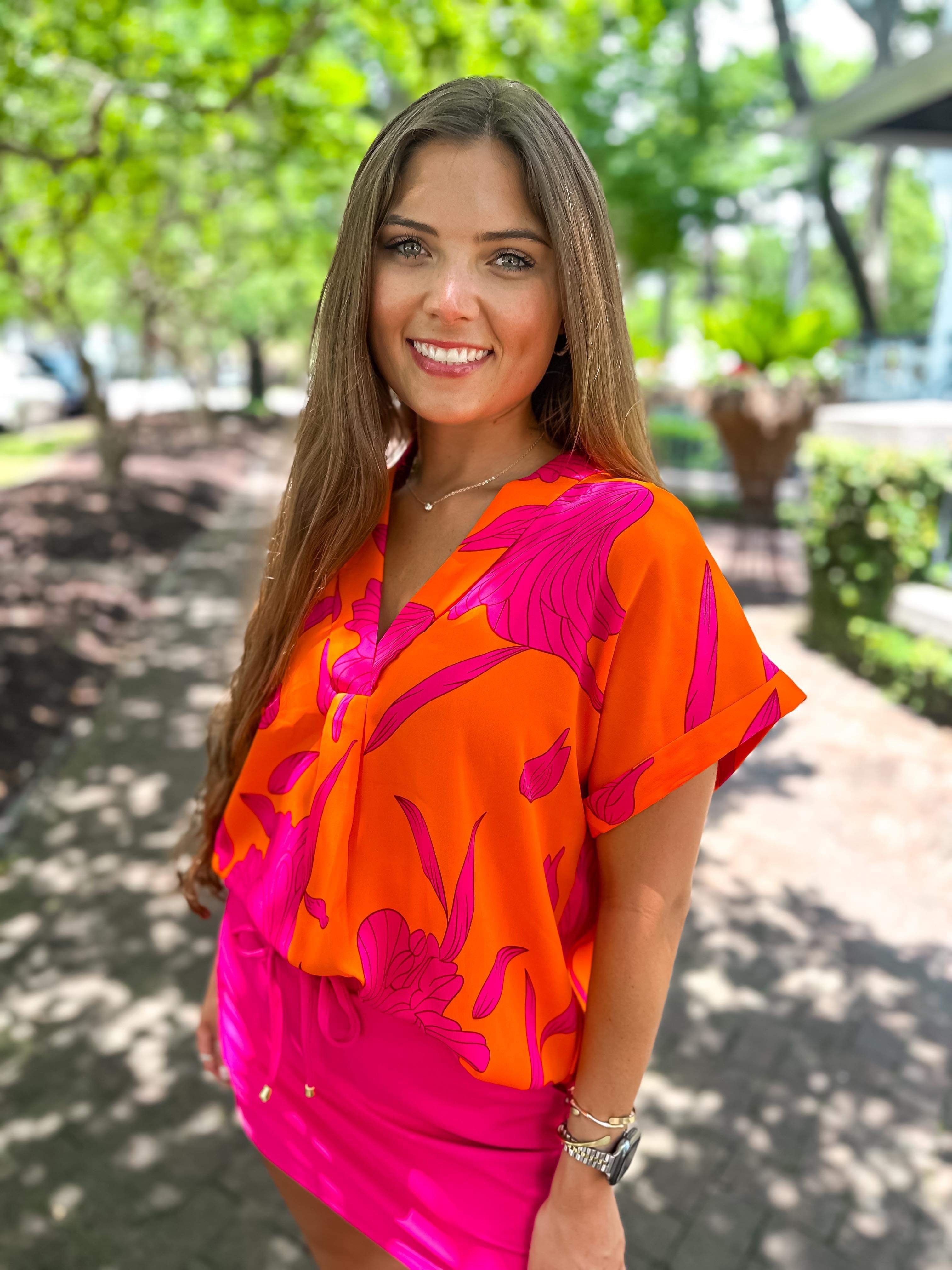 Floral print v-neck short sleeve top featuring permanent rolled cuffs. Unlined. Woven. Non-sheer. Lightweight.