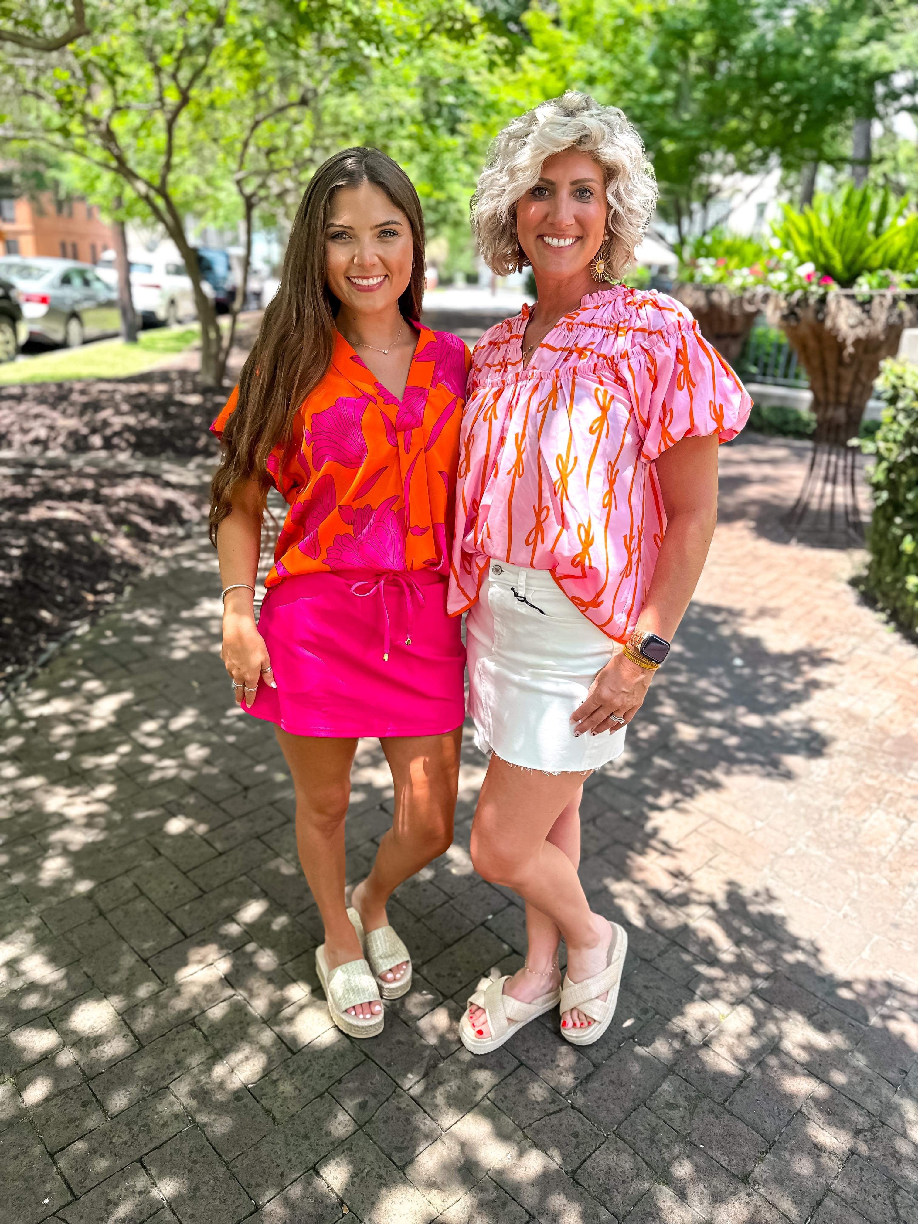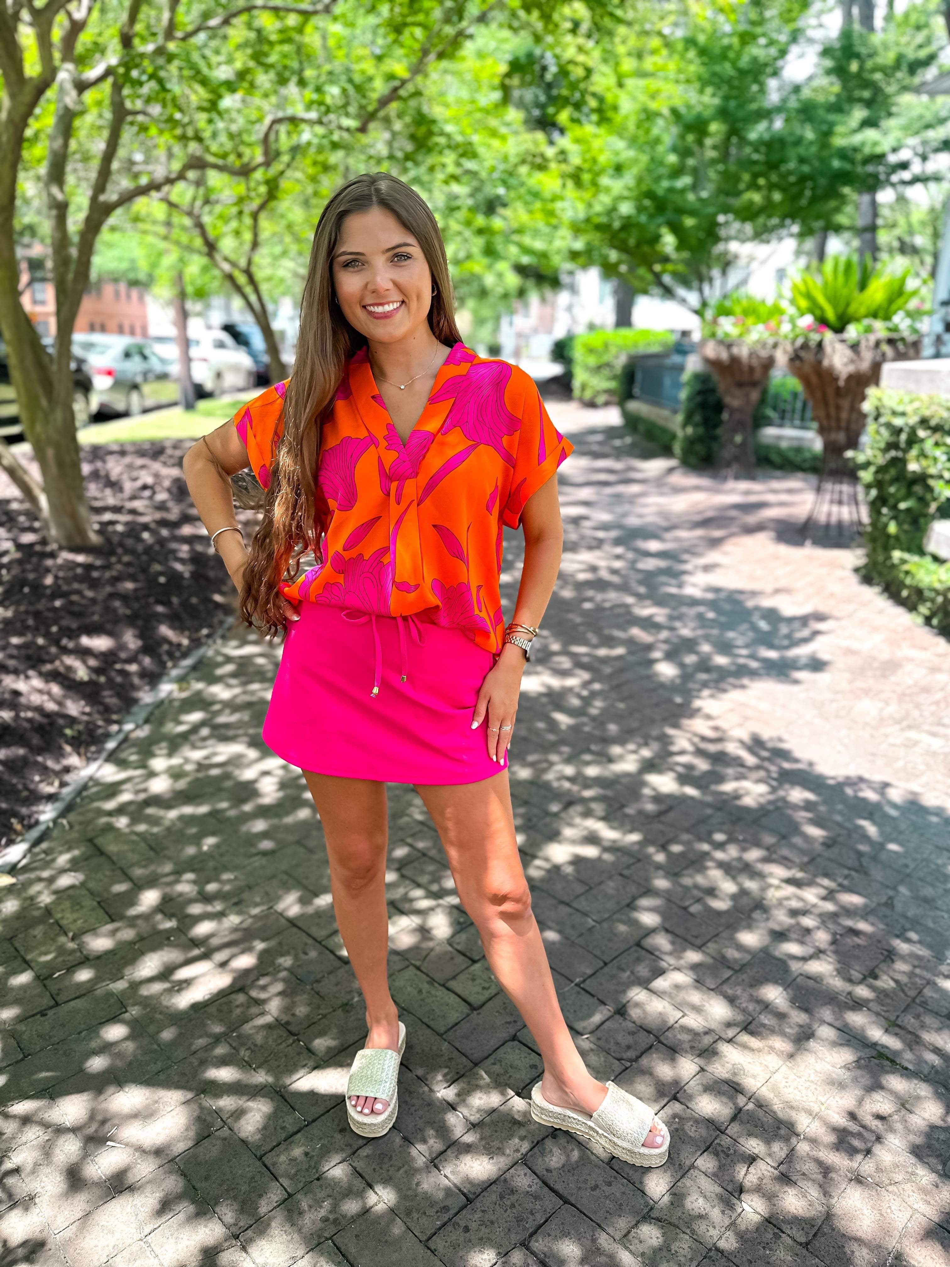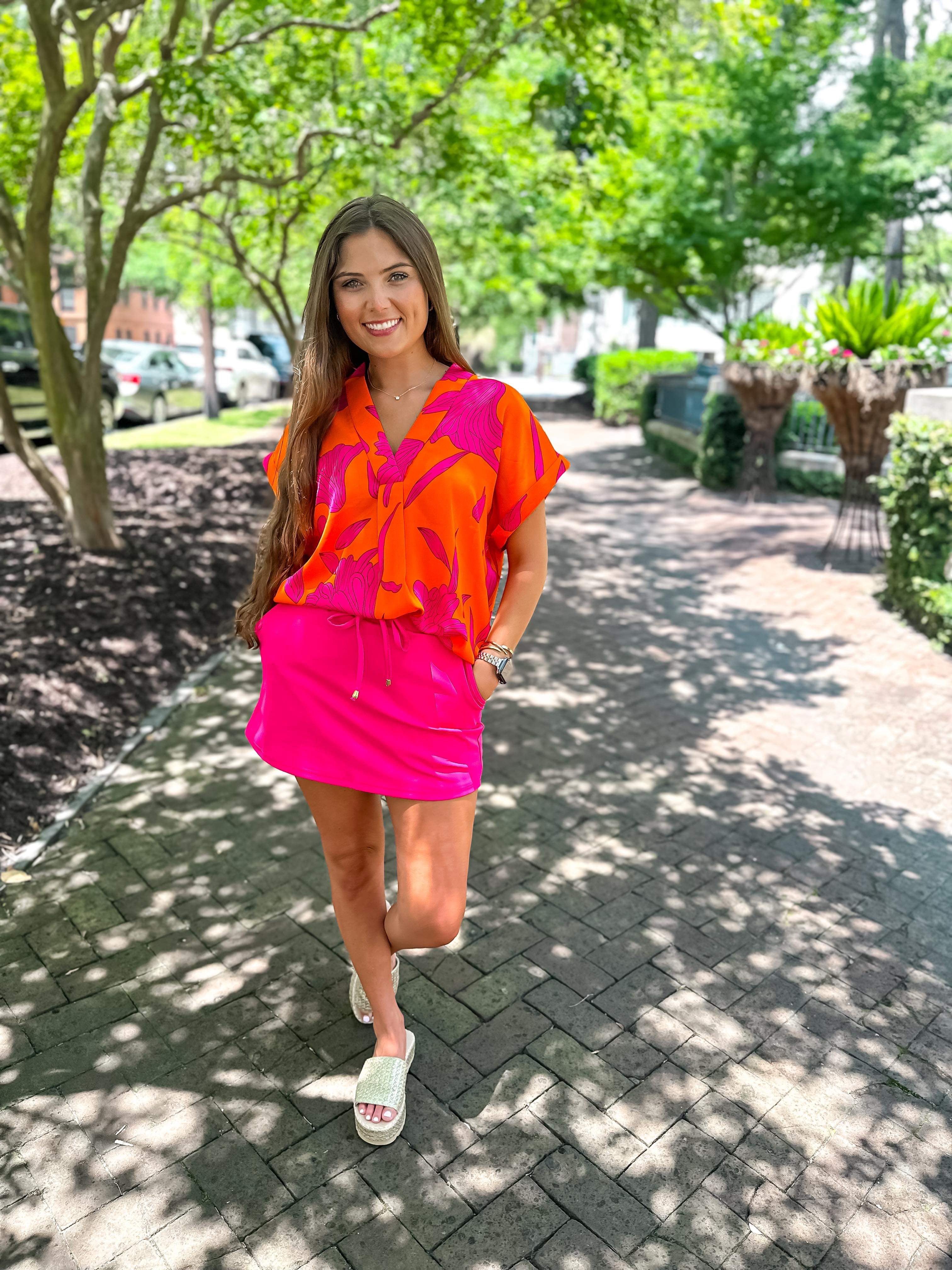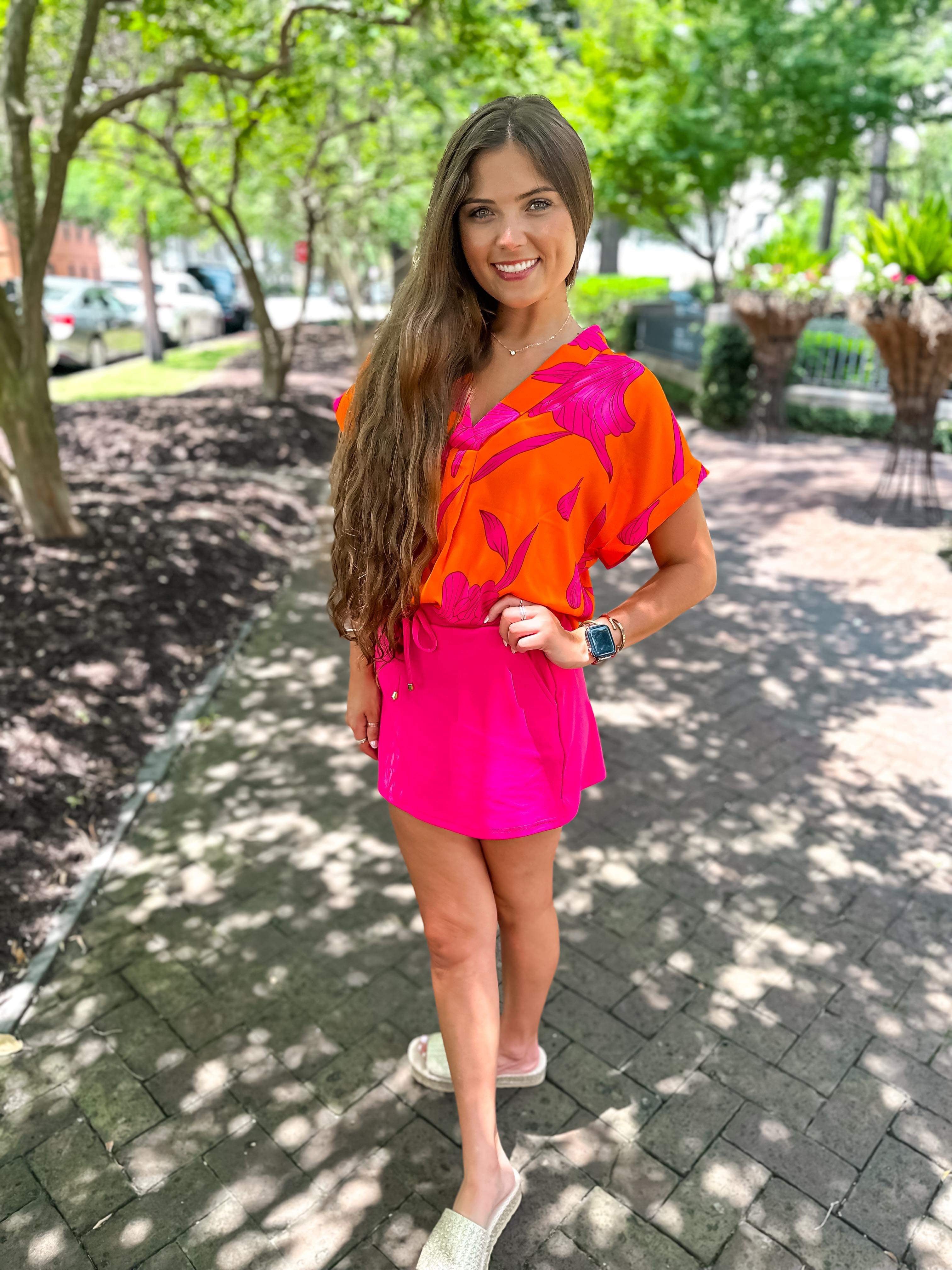 Floral print v-neck short sleeve top featuring permanent rolled cuffs. Unlined. Woven. Non-sheer. Lightweight.