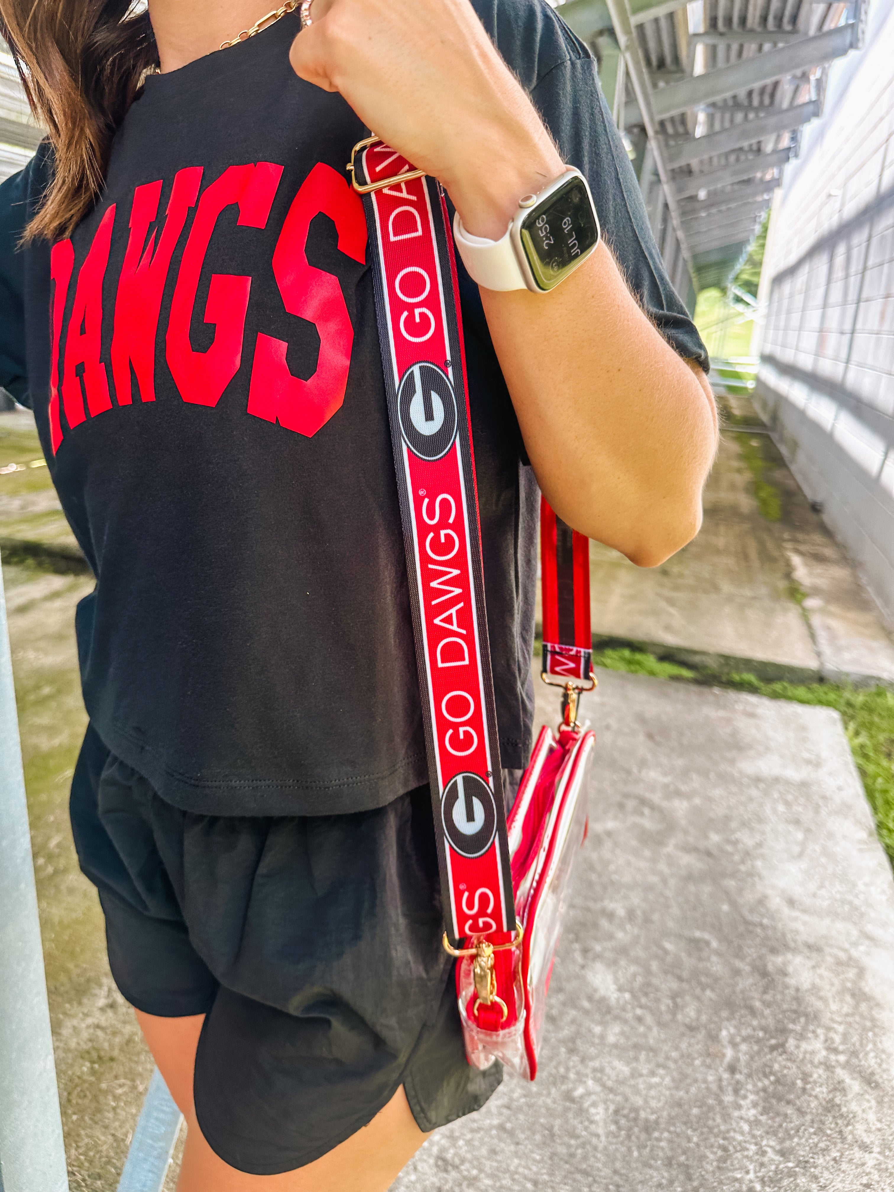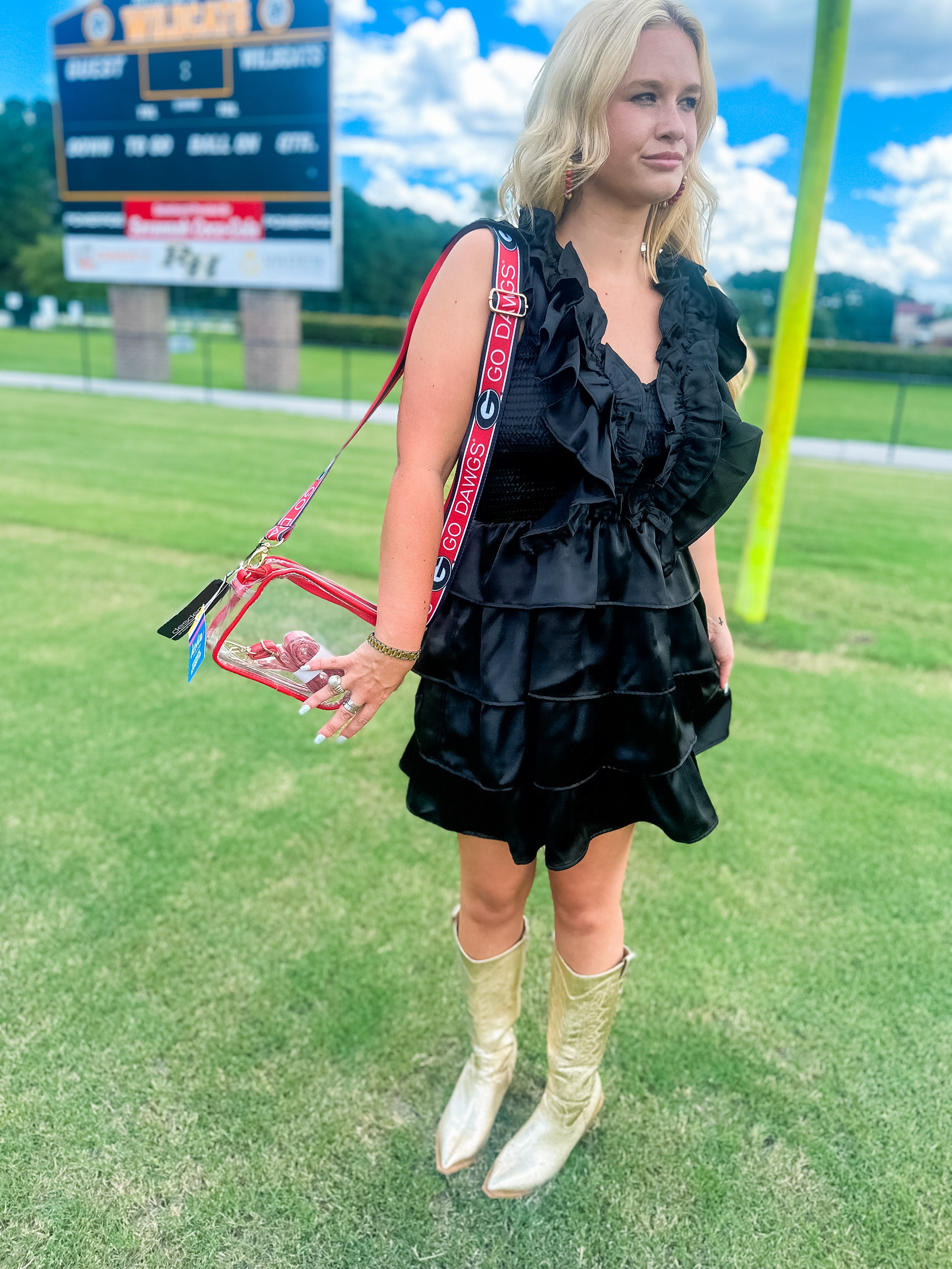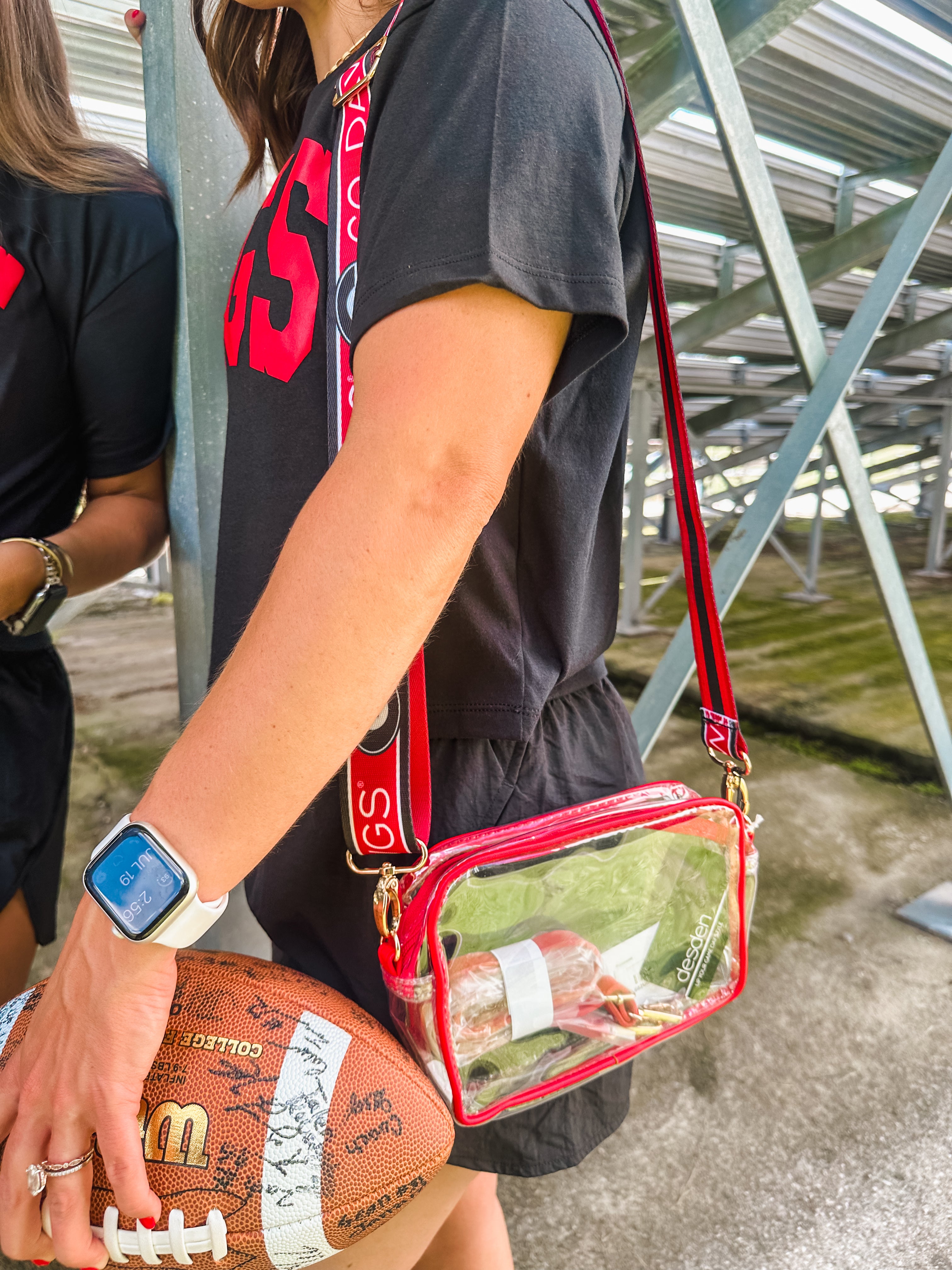 Crafted of clear vinyl and soft vegan leather, featuring brass hardware accents * Stadium Approved Sized at 8" x 6" x 2" * Includes 2 adjustable purse straps for changing up your look in a snap * Easily wipes clean * zipper closure