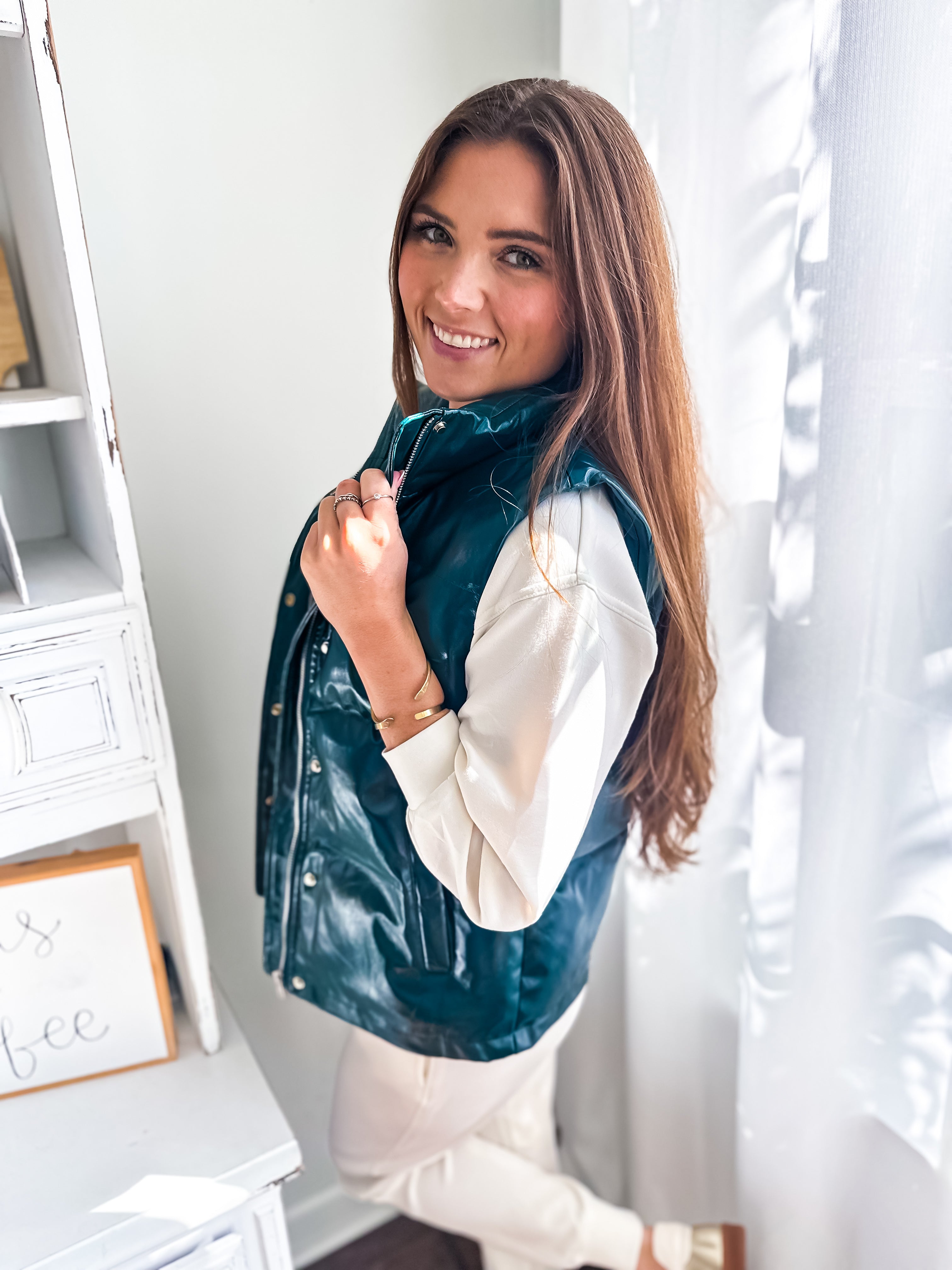 Puffer Vests don't get more stylish than this! Our Helen Vest features a zip up and snap closure, vegan leather, and two side pockets! Pair her with skinnies, bodysuit and booties to complete your date night look!