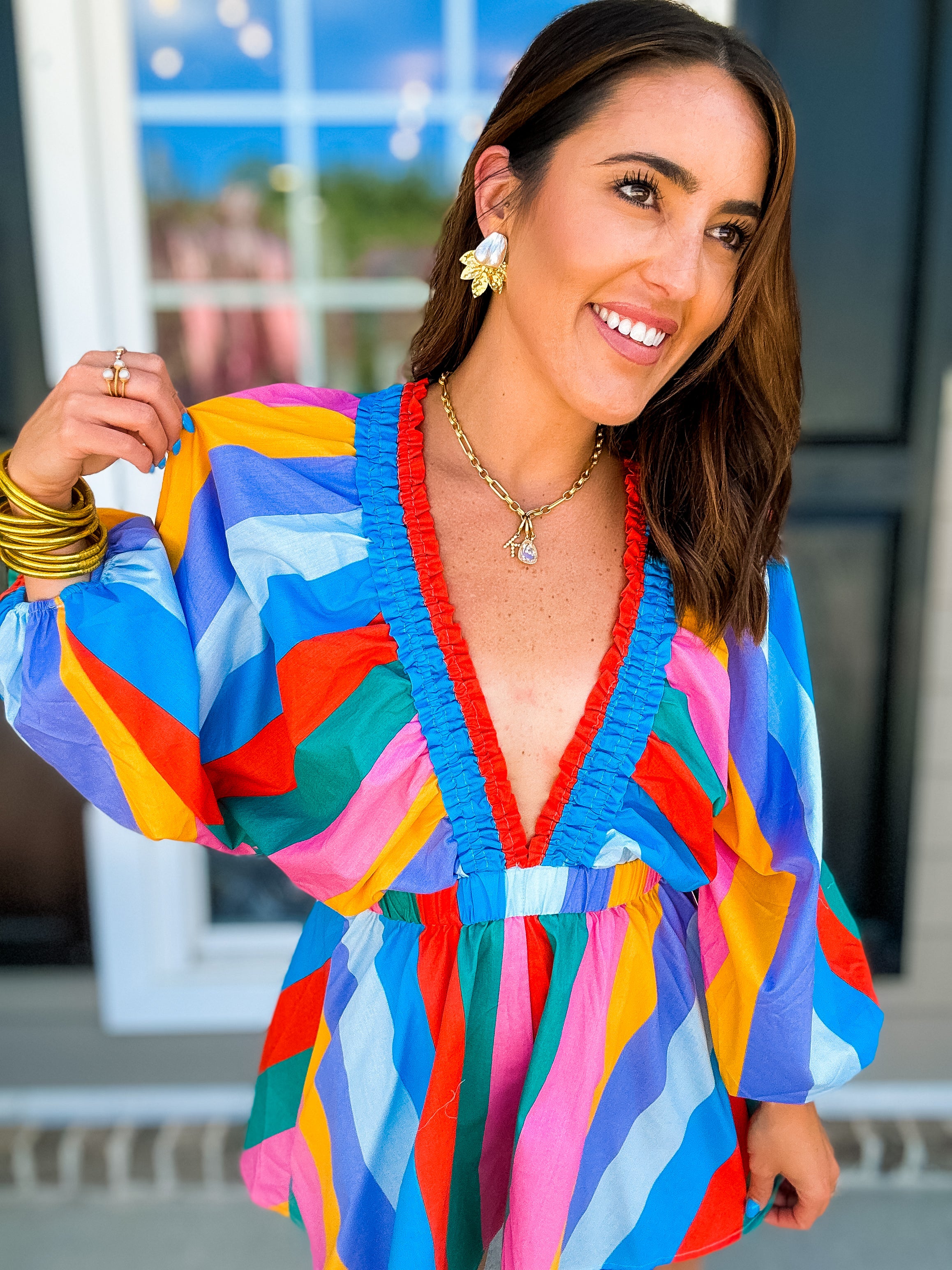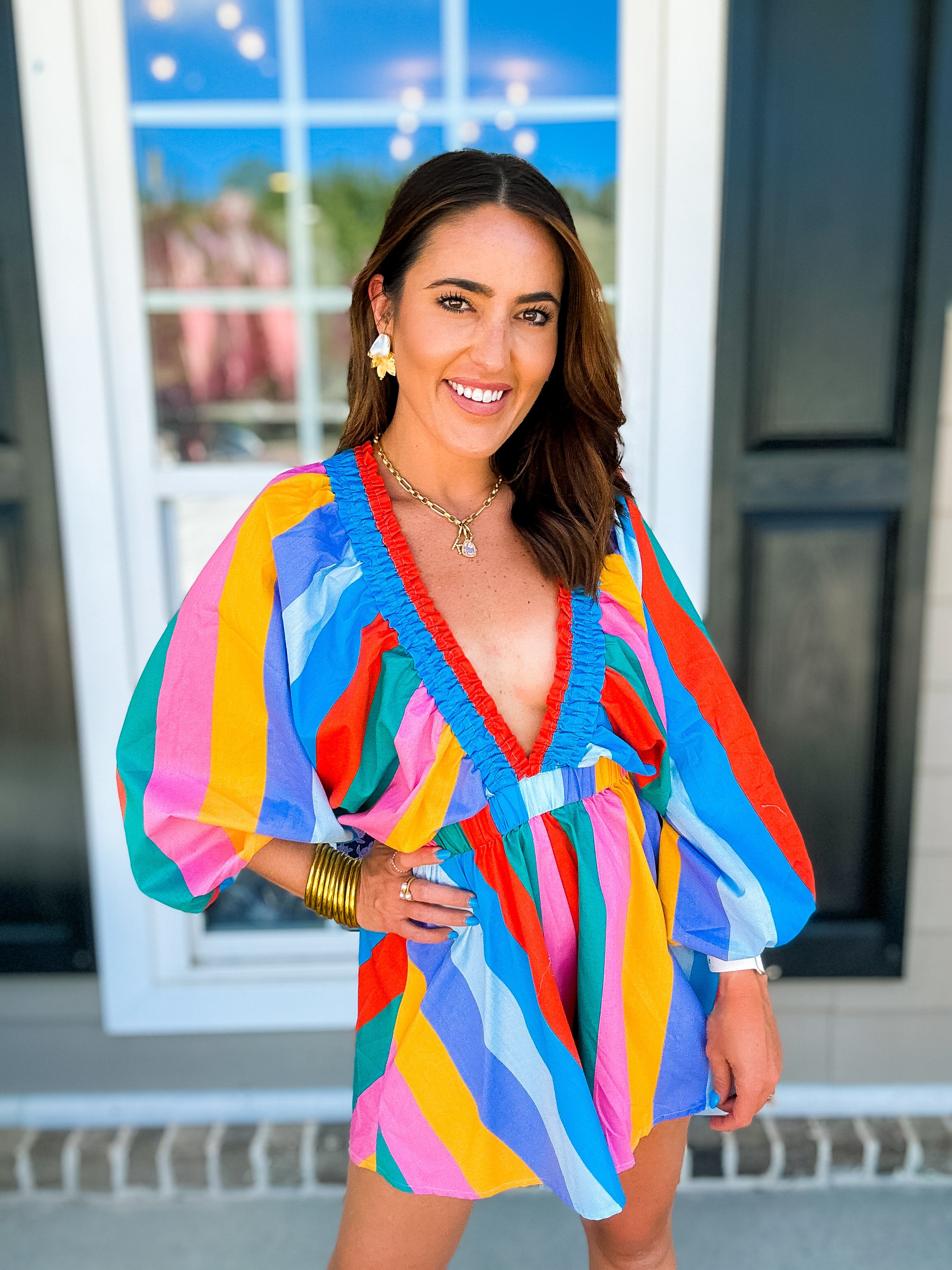 Feel perfect in the Palm Beach Romper! Show off your girly side in the Jelly Bean stripes, complete with a fabulously plunging V neck, balloon sleeves, and a comfortable elastic waistband. No zippers or hooks needed - just slip it on and plunge into summer!
