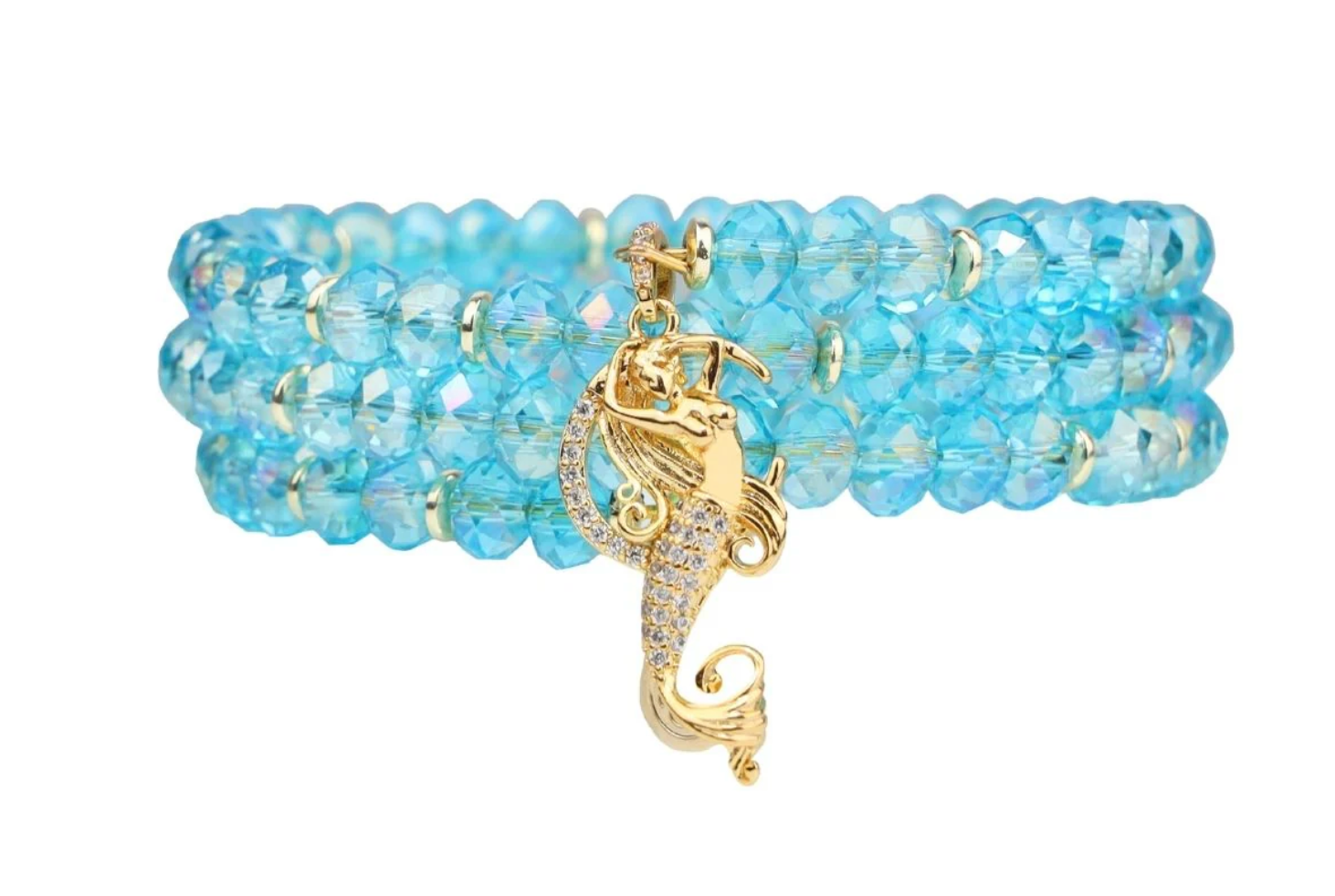 Under the sea, life gets better when you get wetter (take it from me!) and on your wrist sits…our Ariel Wrist Wrap. Charming azure crystals capture sky blue in water, and our Ariel Wrist Wrap is also flecked with gold rondelles, giving it a wonderful shine. Of course, it would not be complete without our divine “little mermaid” charm as a reminder of the mythological beauties of the sea. One size fits all. Handcrafted in the USA in the BuDhaGirl workshops.