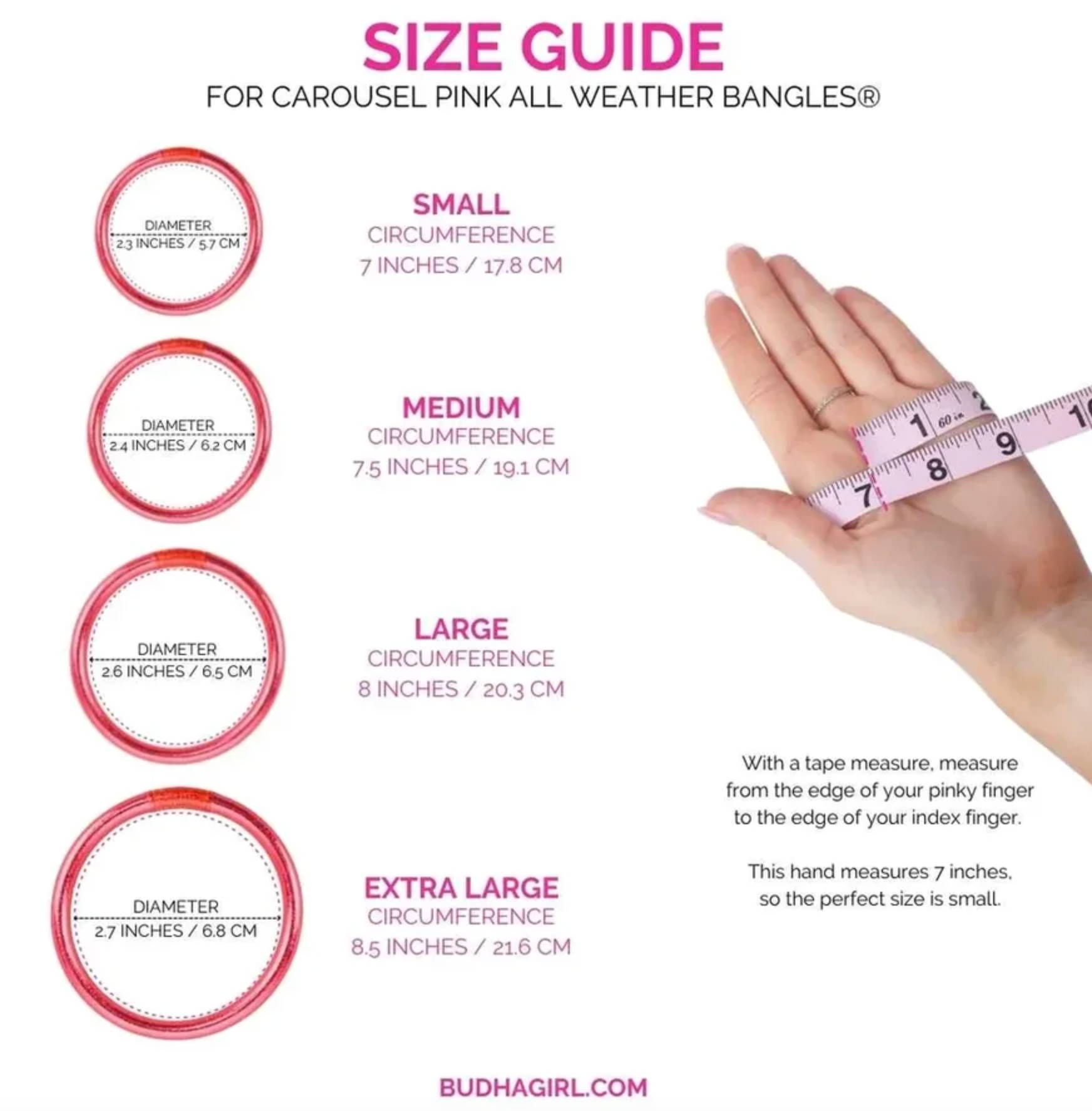 BuDhaGirl Carousel Pink All Weather Bangle bracelets are made of polyvinyl carbonate tubing that is a semi-flexible material, so there is a little give when you slide the bangles over your hand. The key to deciding your size...how the bangles go over your hand, not the size of your wrist.