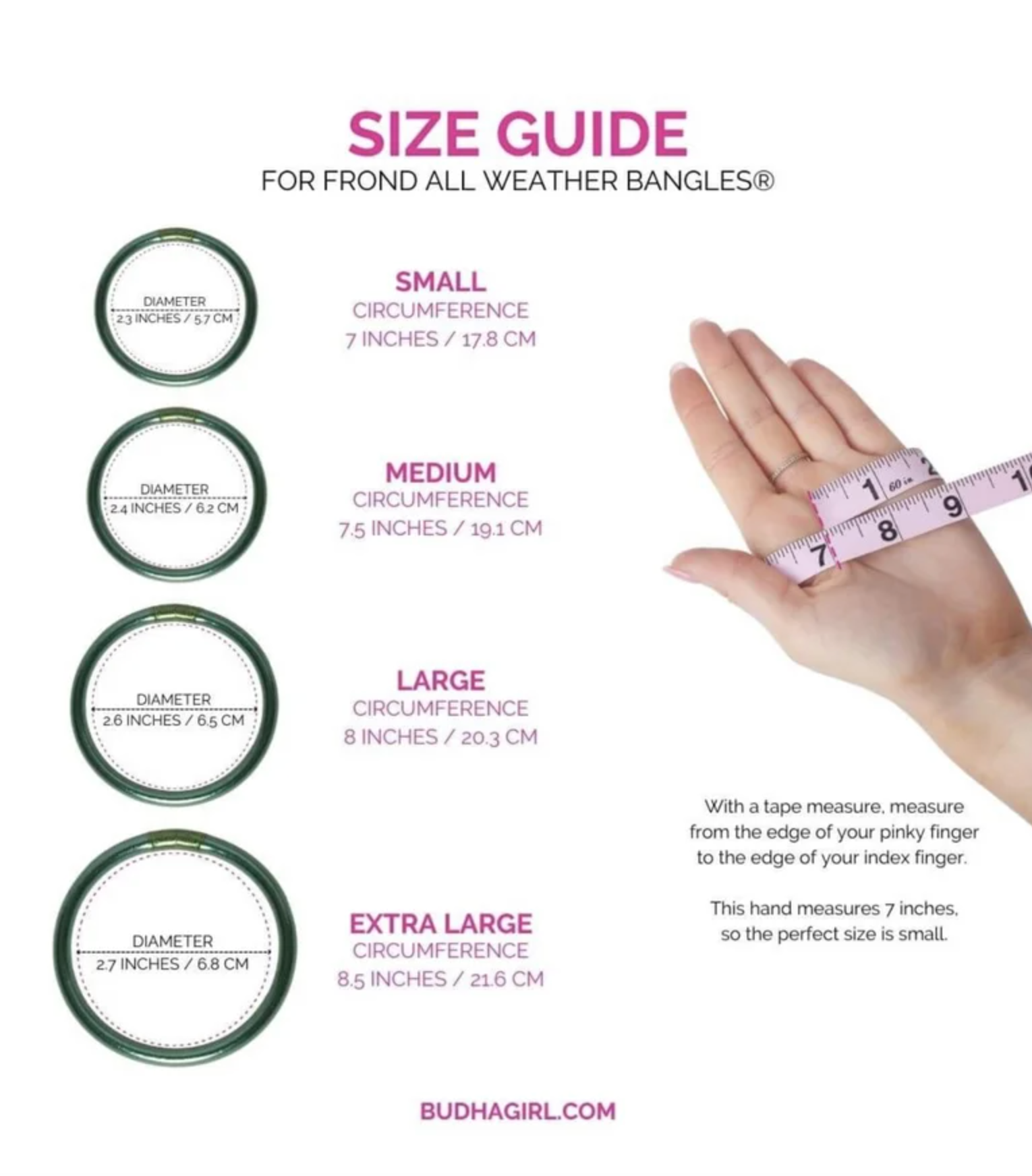 BuDhaGirl Frond All Weather Bangle bracelets are made of polyvinyl carbonate tubing that is a semi-flexible material, so there is a little give when you slide the bangles over your hand. The key to deciding your size...how the bangles go over your hand, not the size of your wrist.