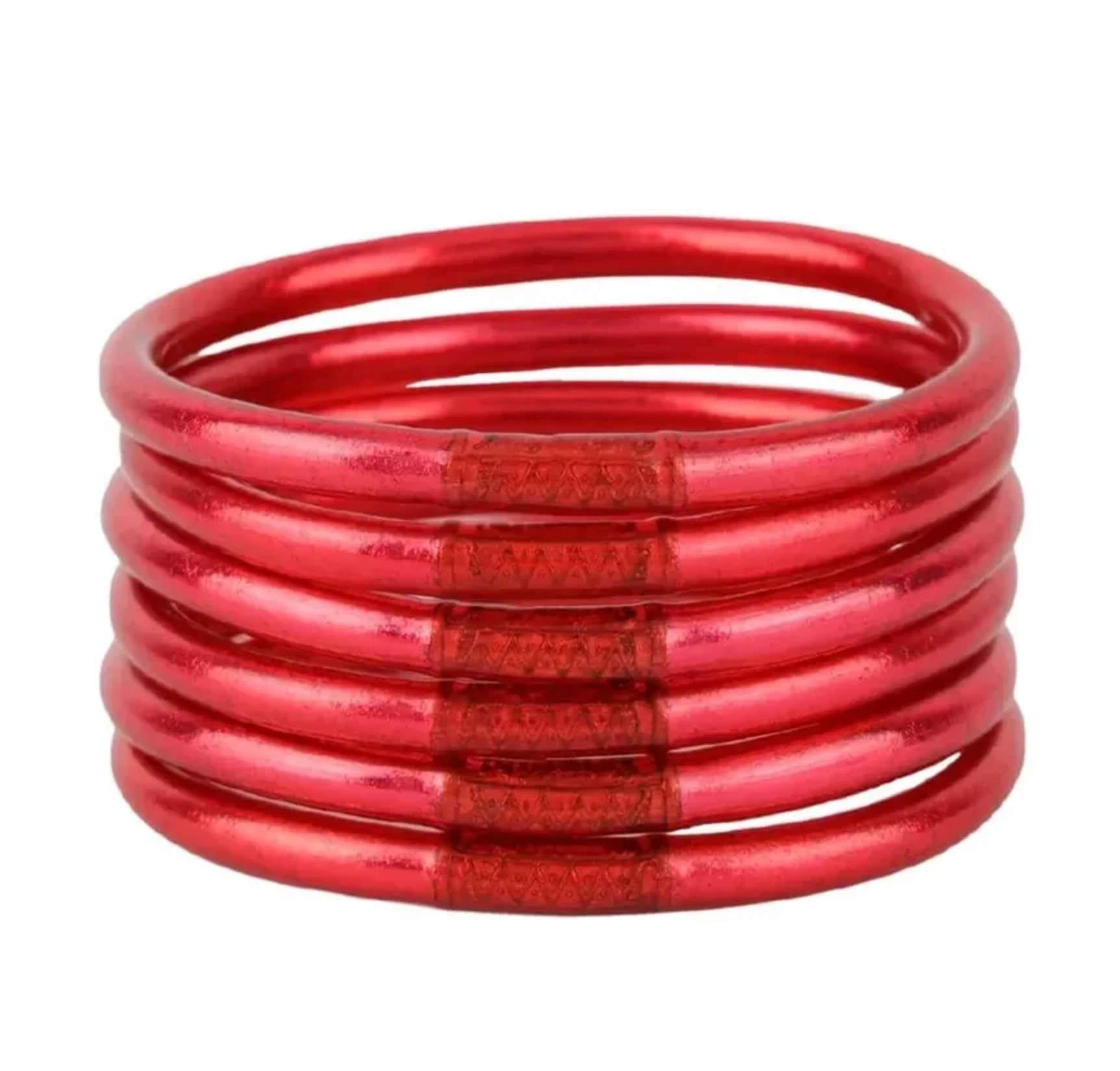 BDG Pink All Weather Bangles® (AWB®)! Our crazy-pretty peony pink bangle bracelets are fabulous as a bold fashion statement a la Schiaparelli or Saint Laurent, or mixed with your set of iconic gold, silver or rose gold All Weather Bangles. These amazing bangles are weightless, soundless, waterproof and TSA proof. Each of the six pink bangle bracelets in the set is meant to represent an intention for your day. As you put them on, affirm your intentions in the morning, and when you remove them in the evening, fill yourself with thoughts of gratefulness. This daily ritual will settle your mind at the beginning and end of each day. Pink All Weather Bangles are made of flexible, polyvinyl carbonate rings that are filled with gold leaf filament and sealed with our exclusive BuDhaGirl Serenity Prayer bead. This unique, non-metal material allows you to go from the pool, to the office, and through the airport all without needing to take them off.