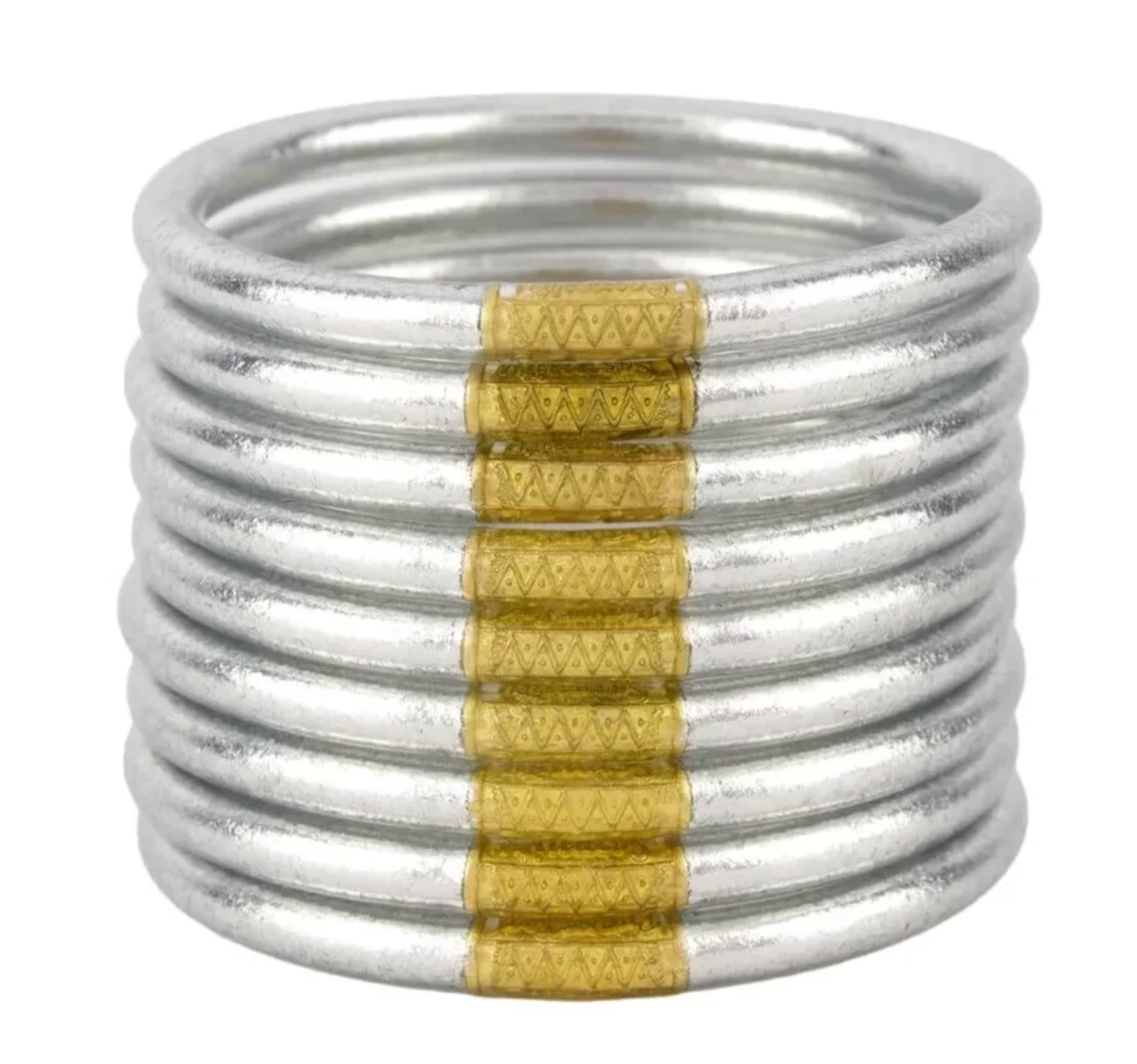 You can wear your Silver All Weather Bangle bracelets anywhere because they are waterproof and soundless. Our Silver All Weather Bangles are made with silver leaf suspended in flexible, polyvinyl carbonate rings, and sealed with our exclusive BuDhaGirl Serenity Prayer bead, allowing them to go from the pool, to the office, and to the airport (they’re TSA proof) all without needing to leave your wrist.