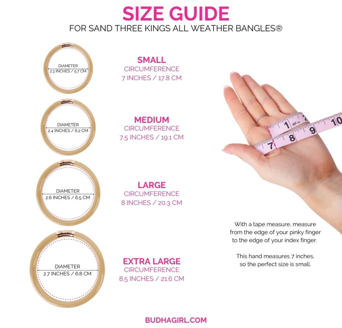 BuDhaGirl’s Sand Three Kings All Weather Bangles® (AWB®) evoke the tranquil warmth of sun-kissed dunes, where the earth meets the sea in a soft, natural palette. Sand carries a textural richness reminiscent of fine grains beneath your feet, effortlessly blending into coastal landscapes. Sand is the ultimate fashion neutral, understated yet refined, offering a timeless elegance that is ultra combinable and a must have for a classic wardrobe. Whether woven into linen, suede, or silk, sand whispers sophistication and pairs beautifully with earthy tones, making it an essential hue for those who embrace effortless chic.