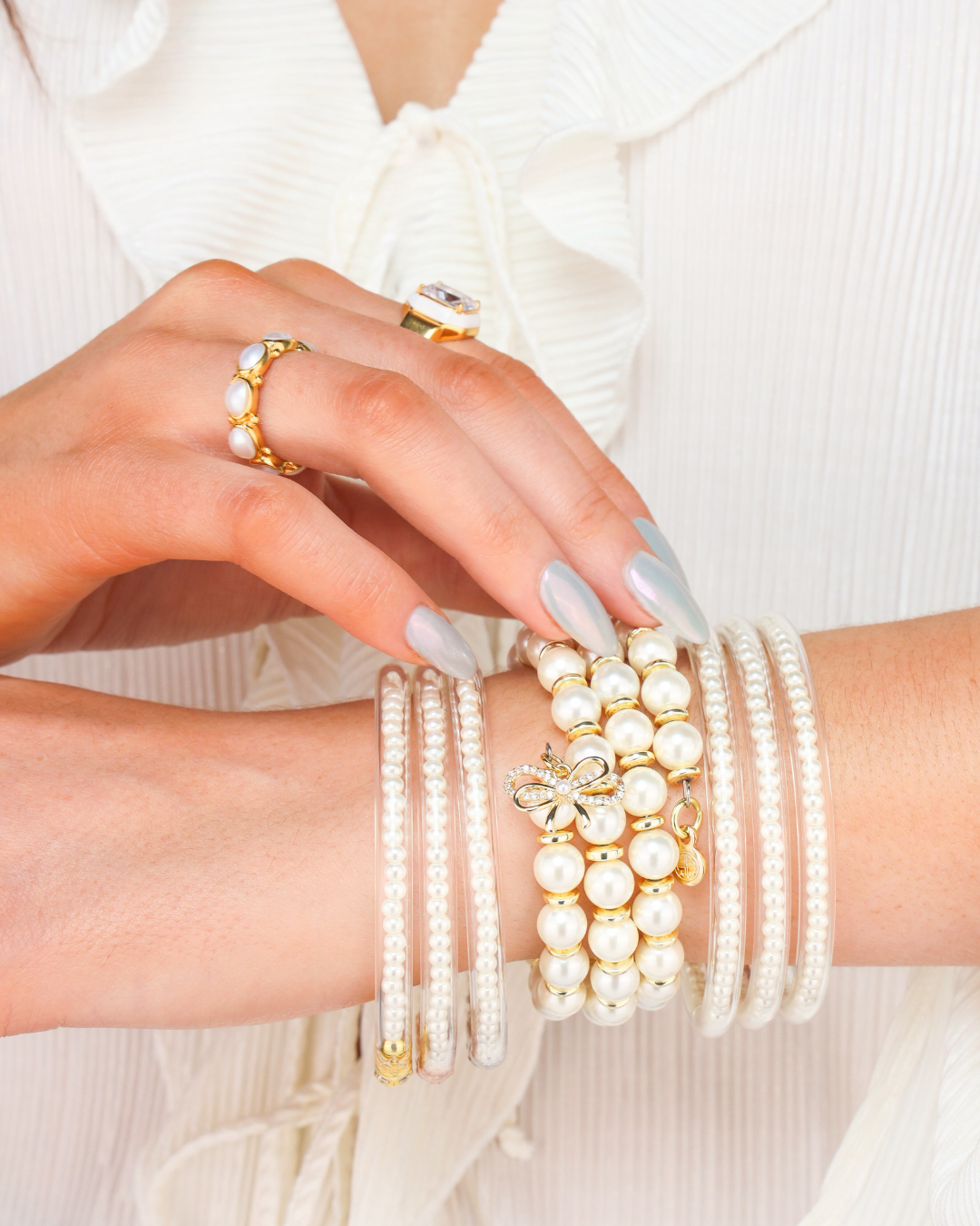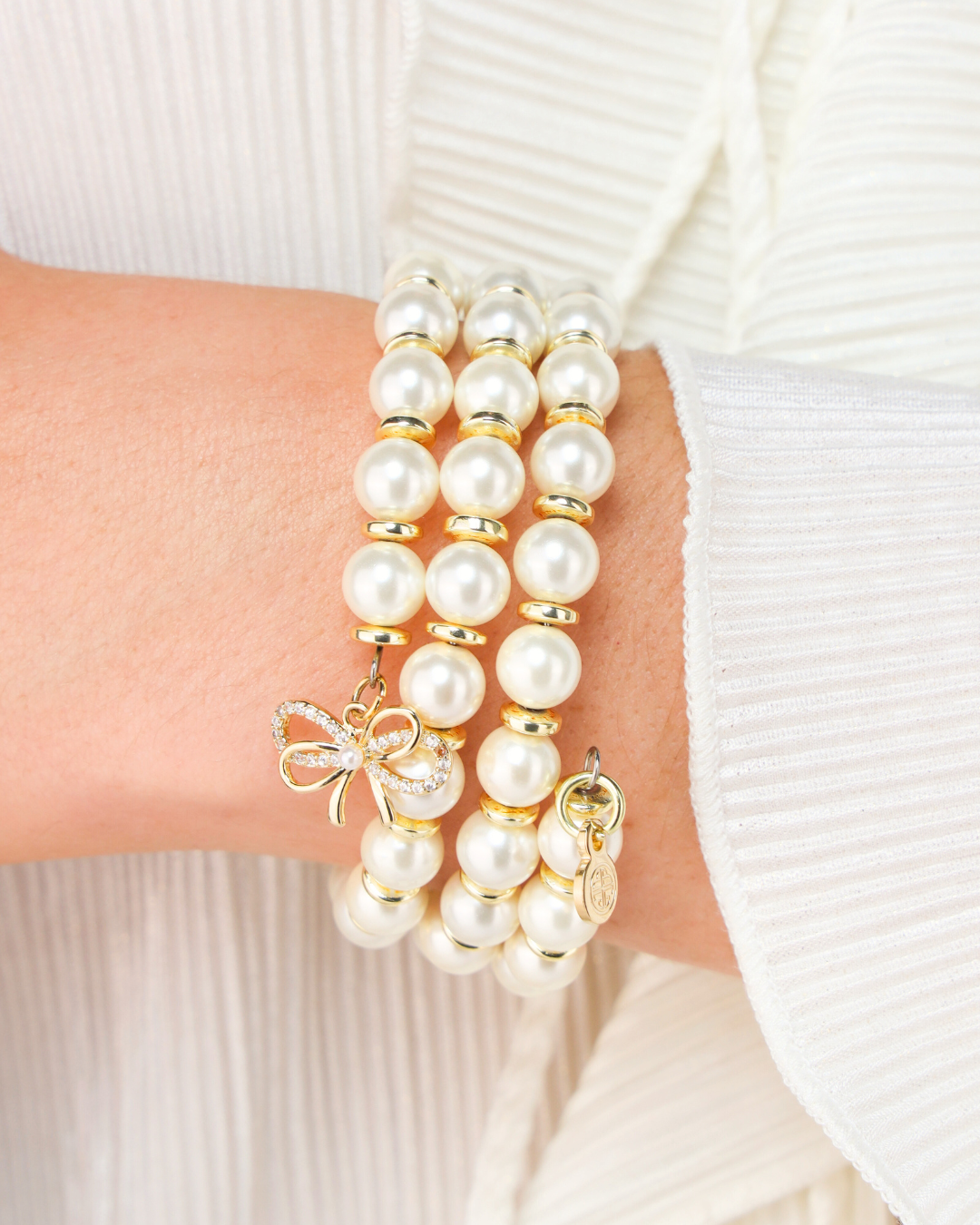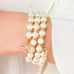 Three turns of luxurious pearls are highlighted with tiny gold rondelles and finished with a precious bow charm in gold with clear crystals. Alone BuDhaGirl’s White Pearl Wrap Bracelet is sophisticated and classic, and paired with White Pearl Three Queens All Weather Bangles® makes for a mesmerizing combination!