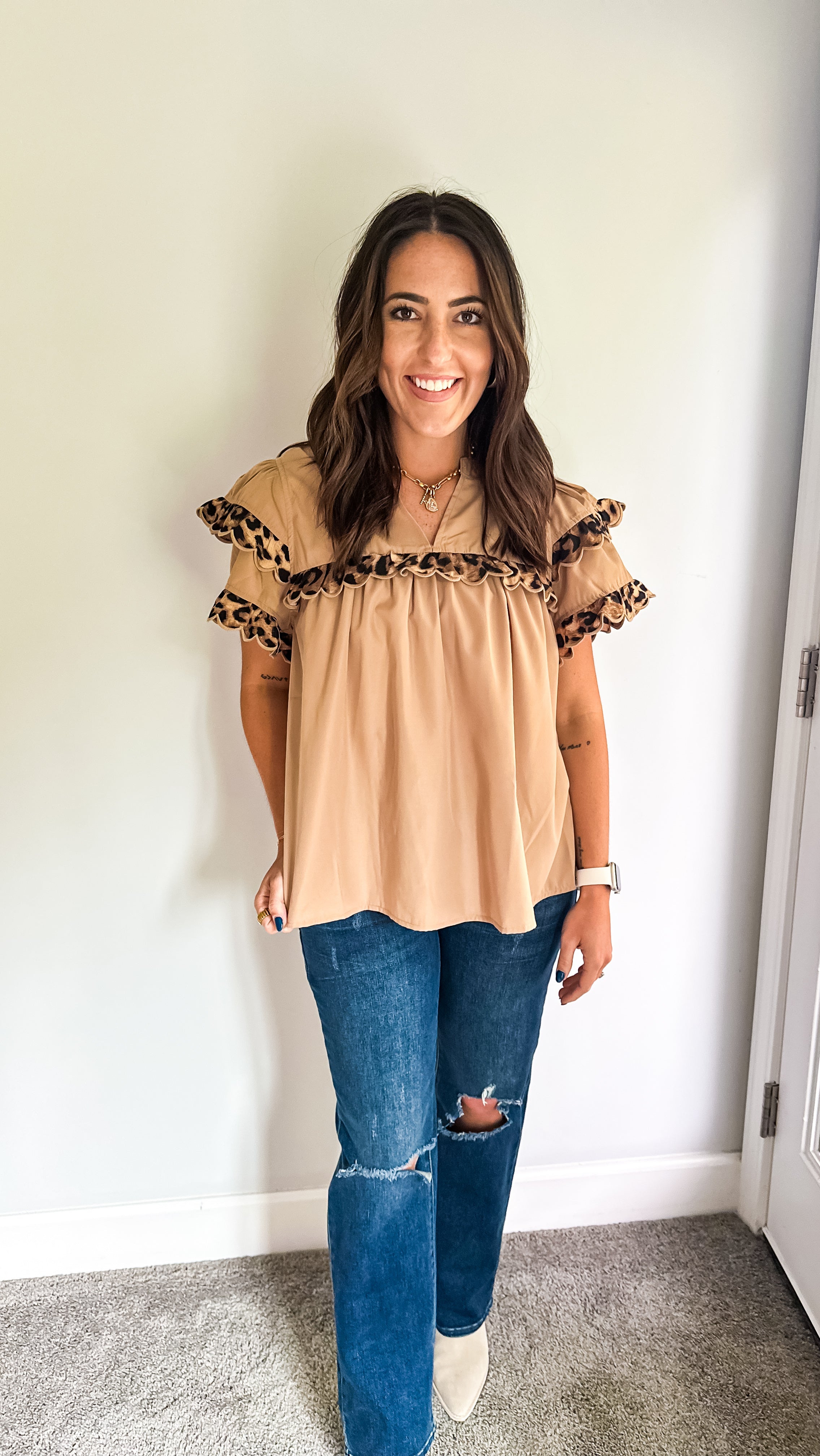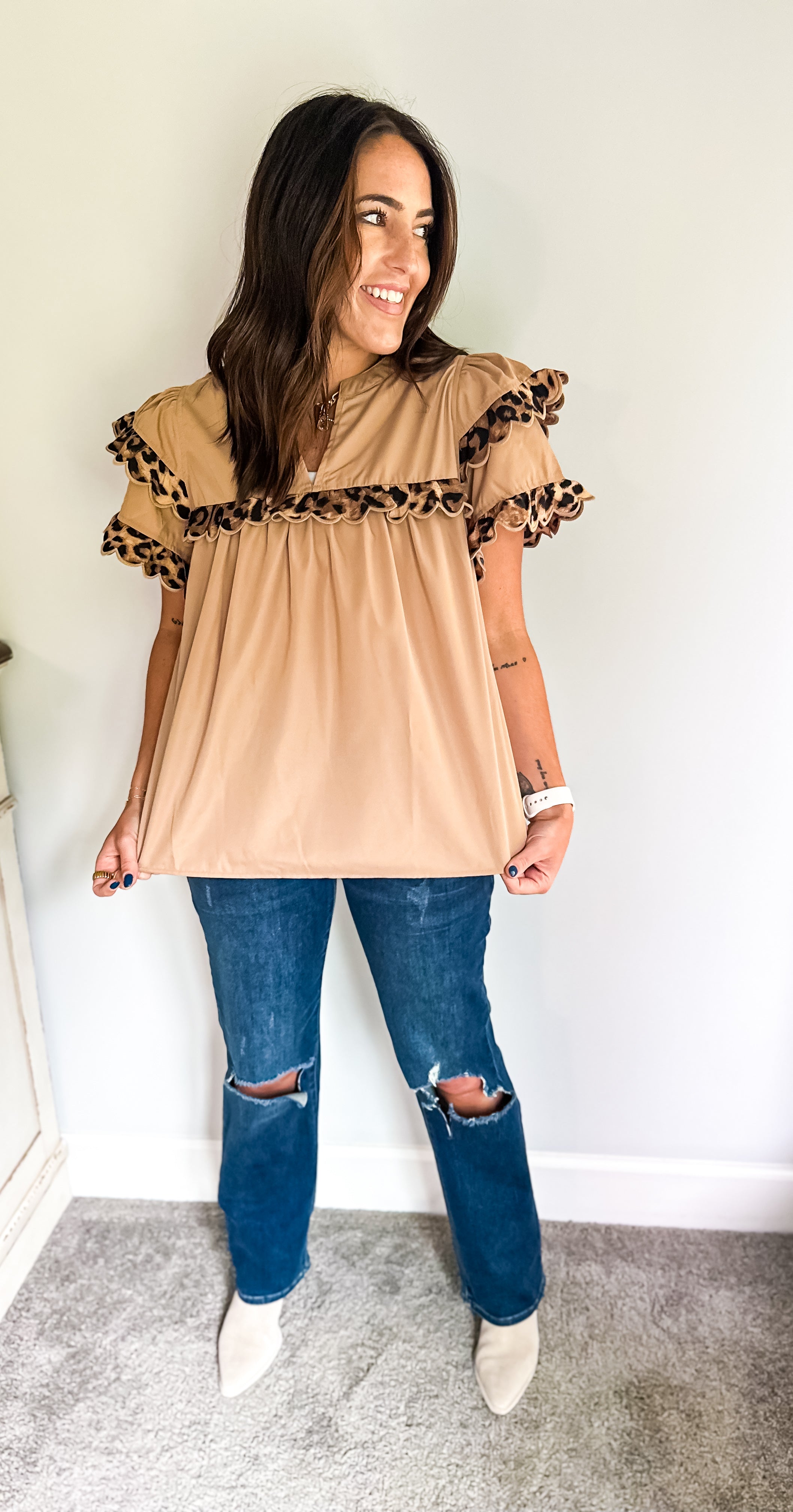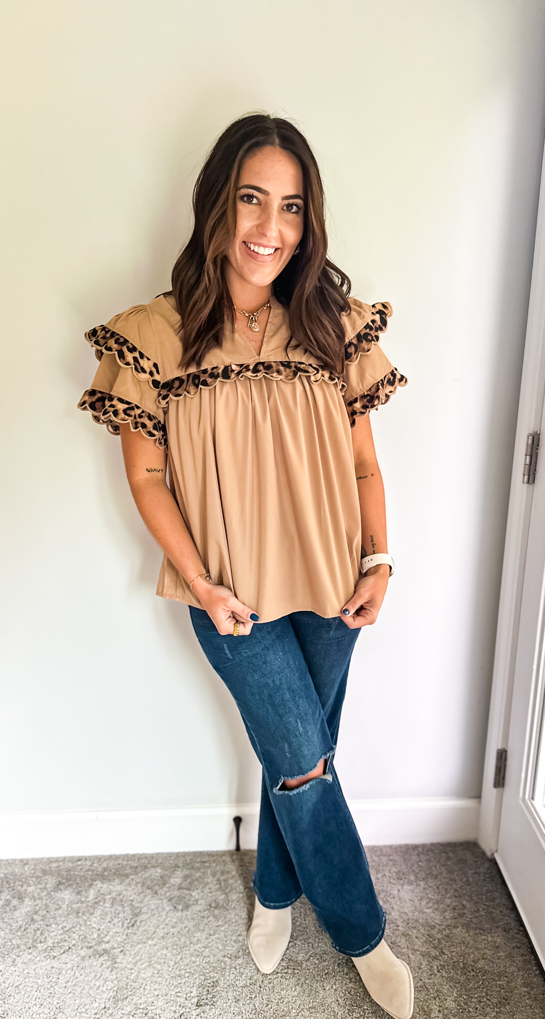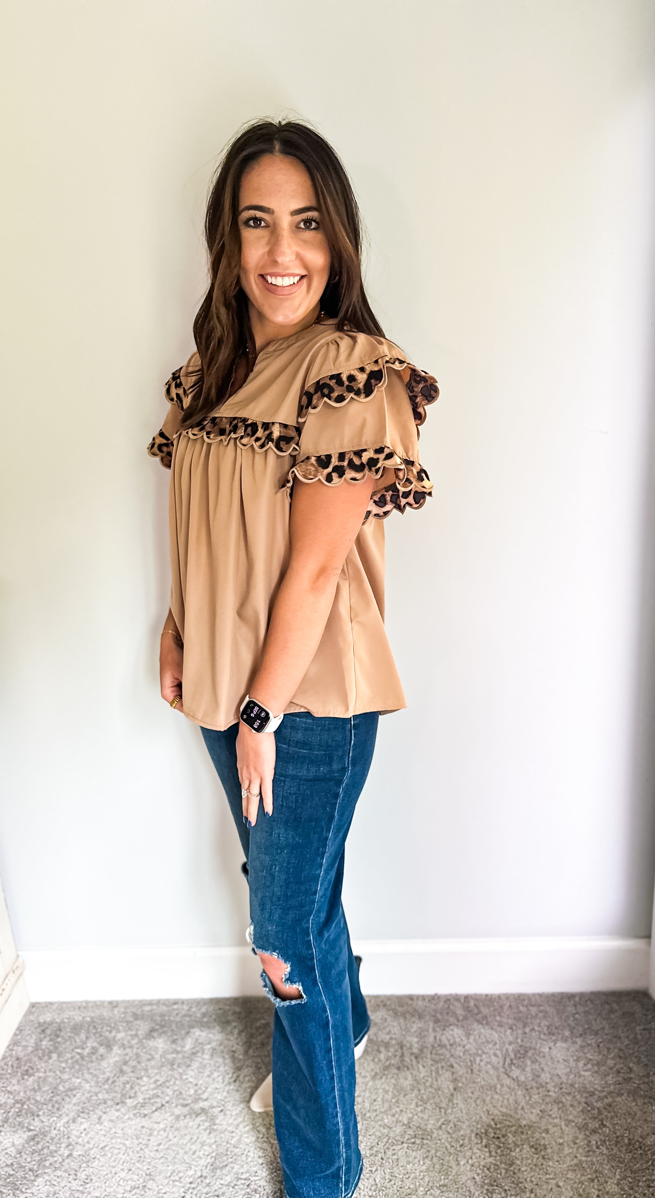 Sold tiered short sleeve v neck top featuring contrasting scalloped cheetah print trim detail. Unlined. Woven. Non-sheer. Lightweight.