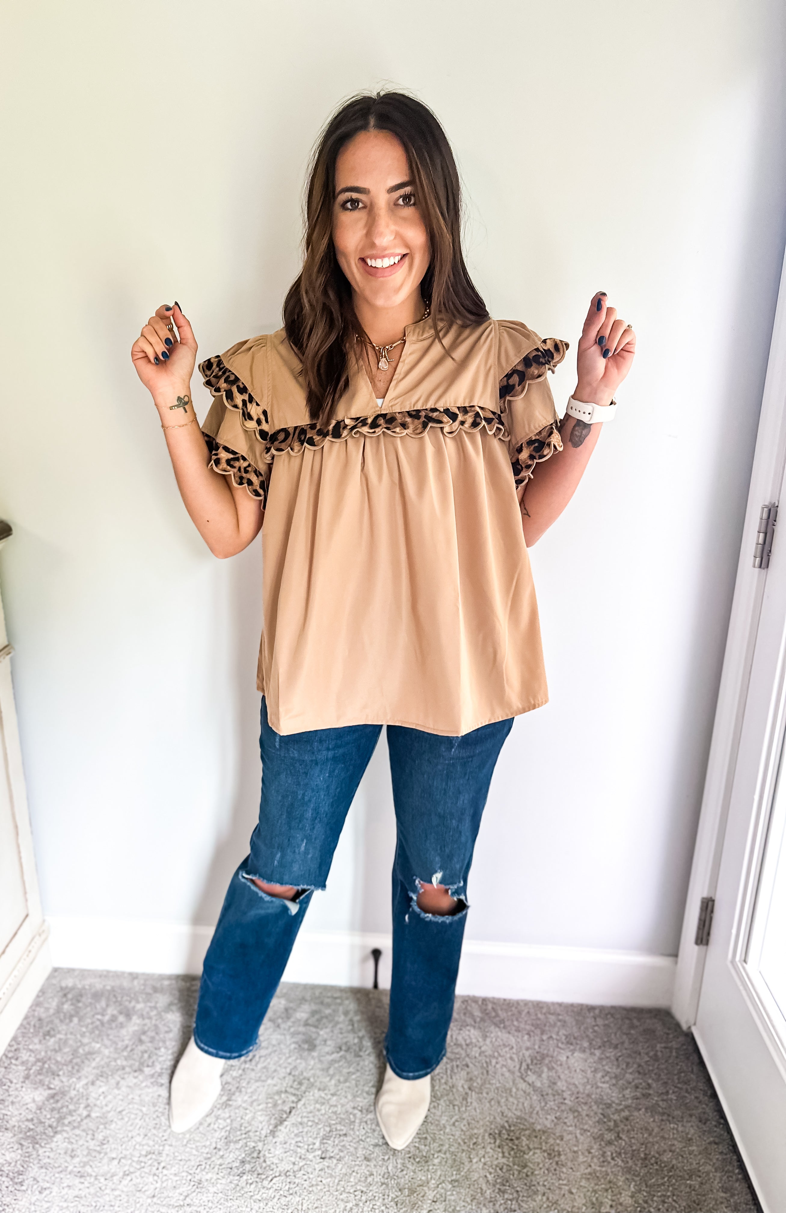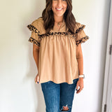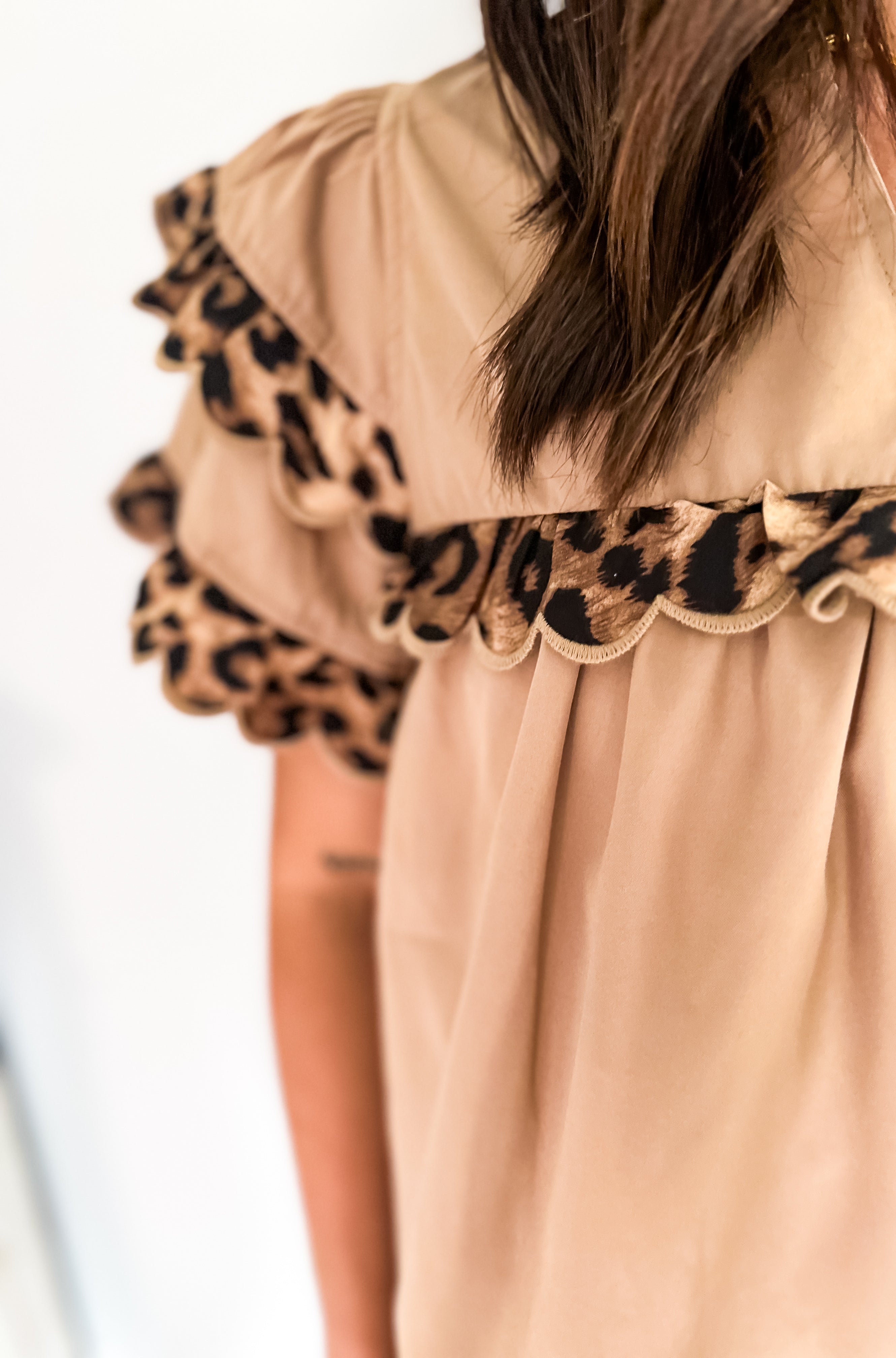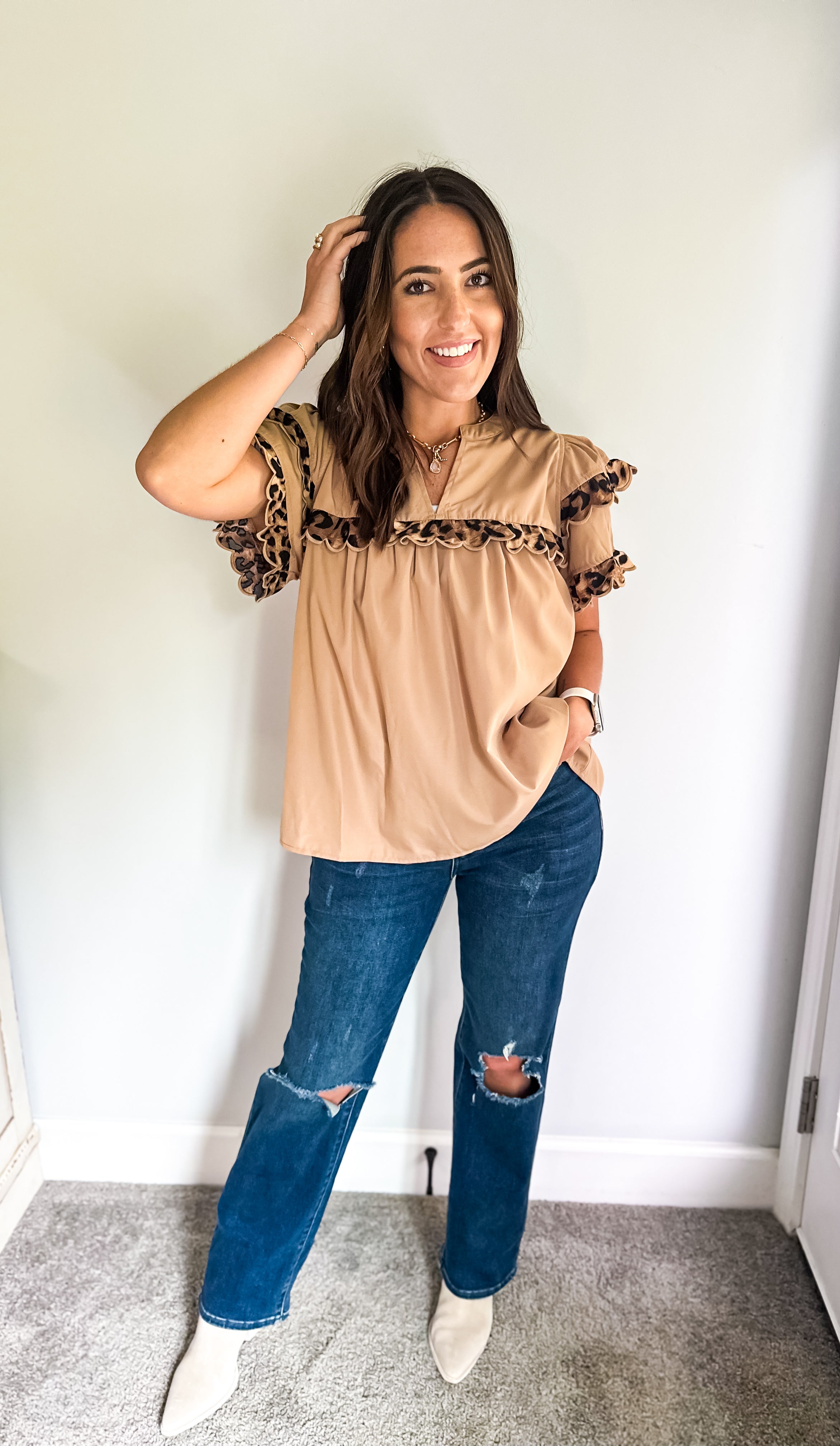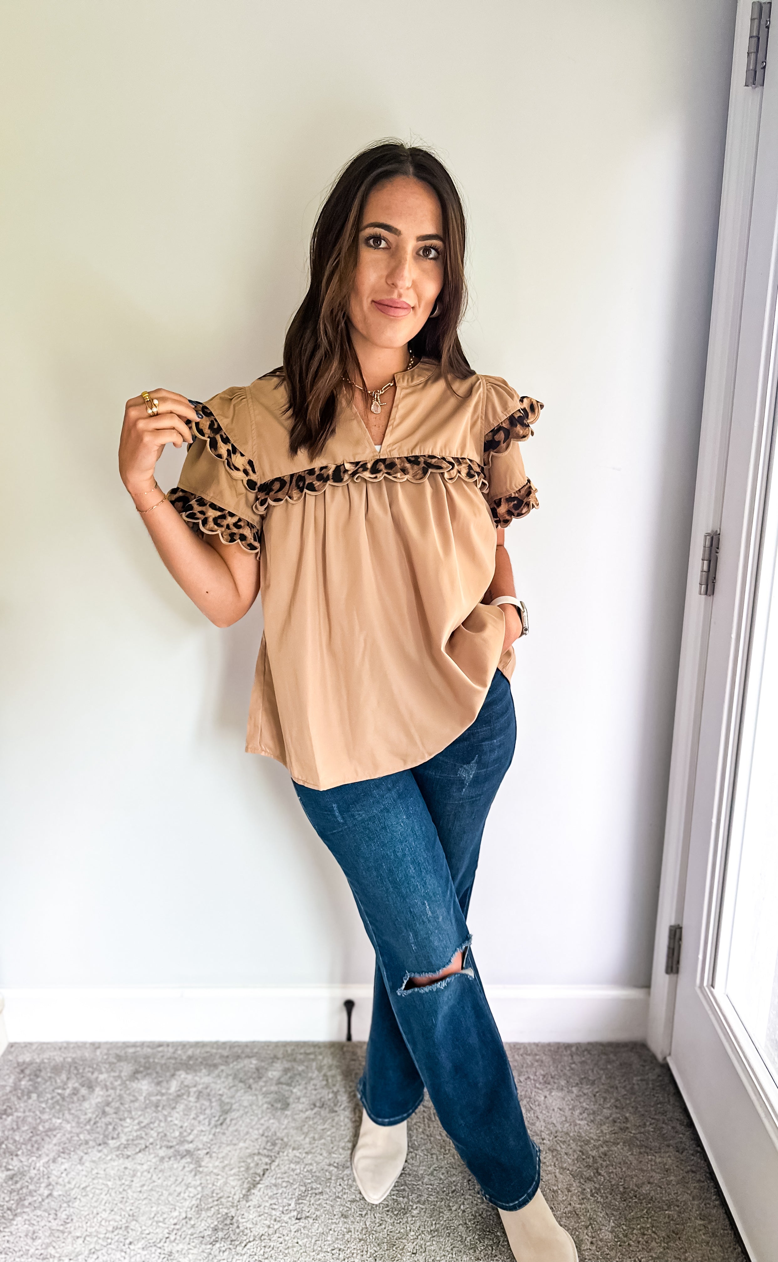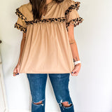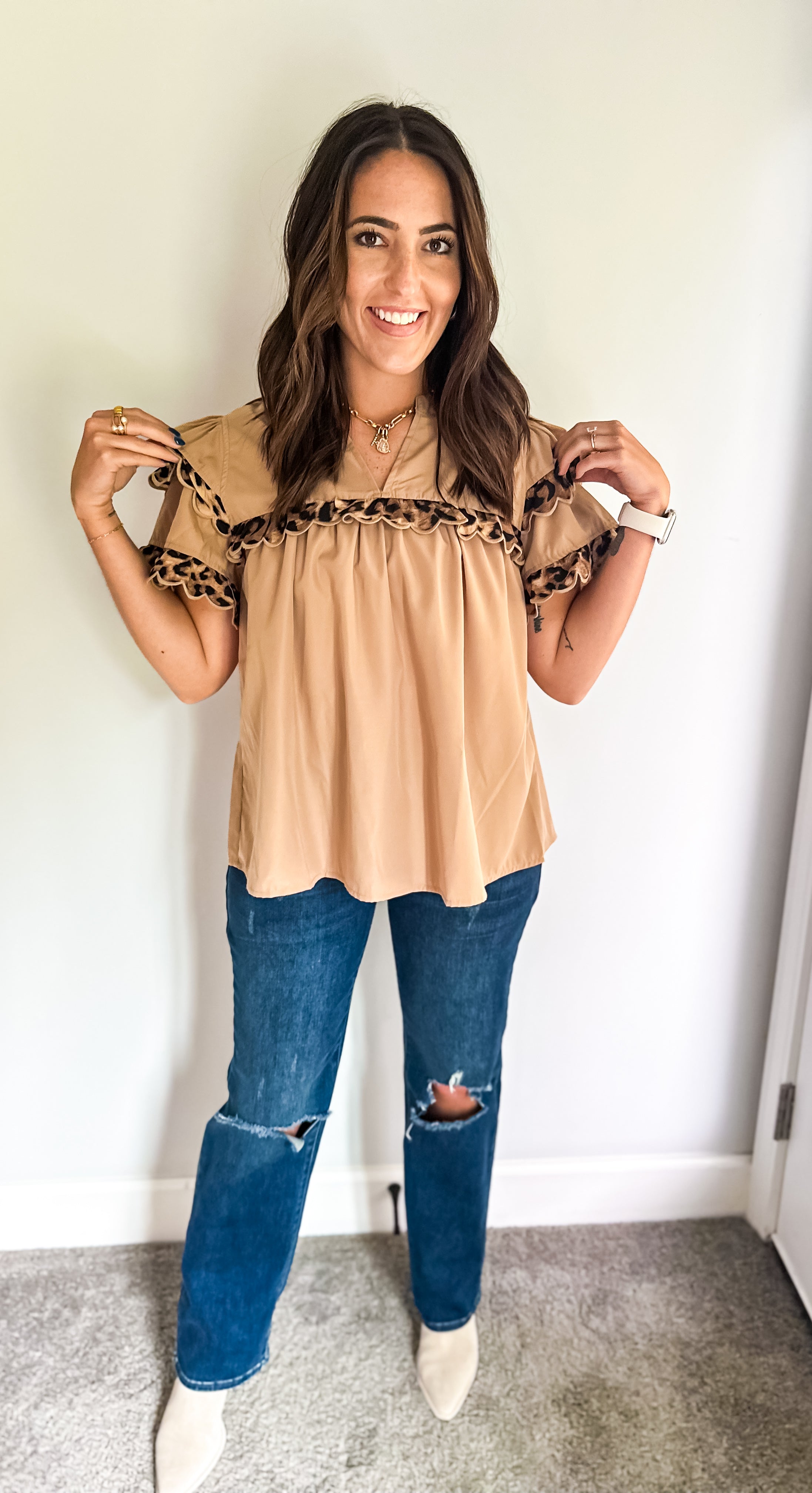 Sold tiered short sleeve v neck top featuring contrasting scalloped cheetah print trim detail. Unlined. Woven. Non-sheer. Lightweight.