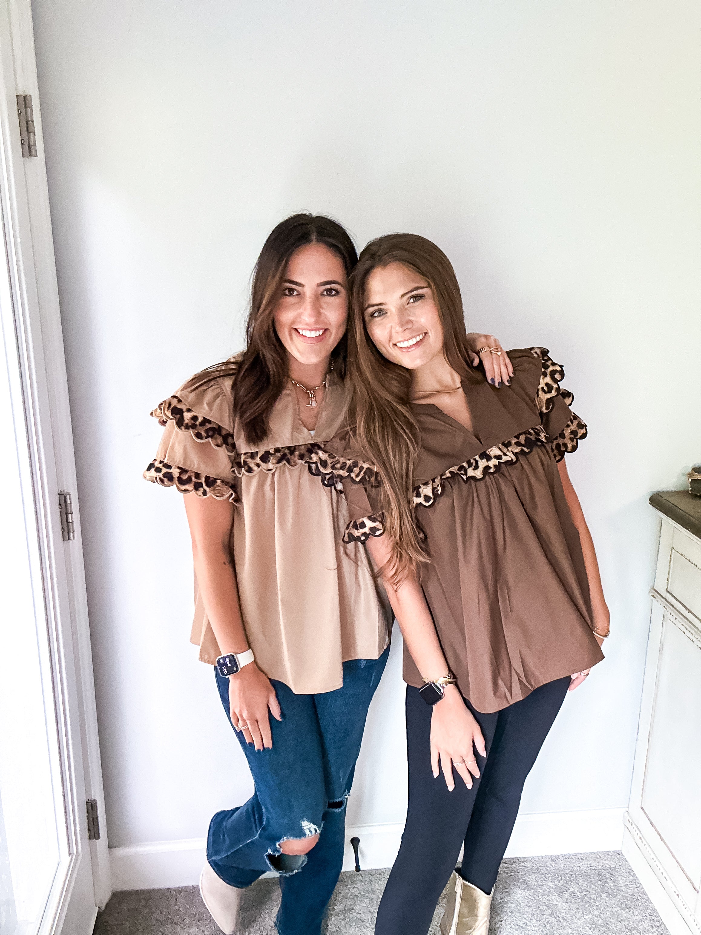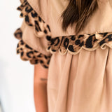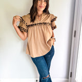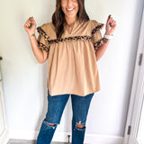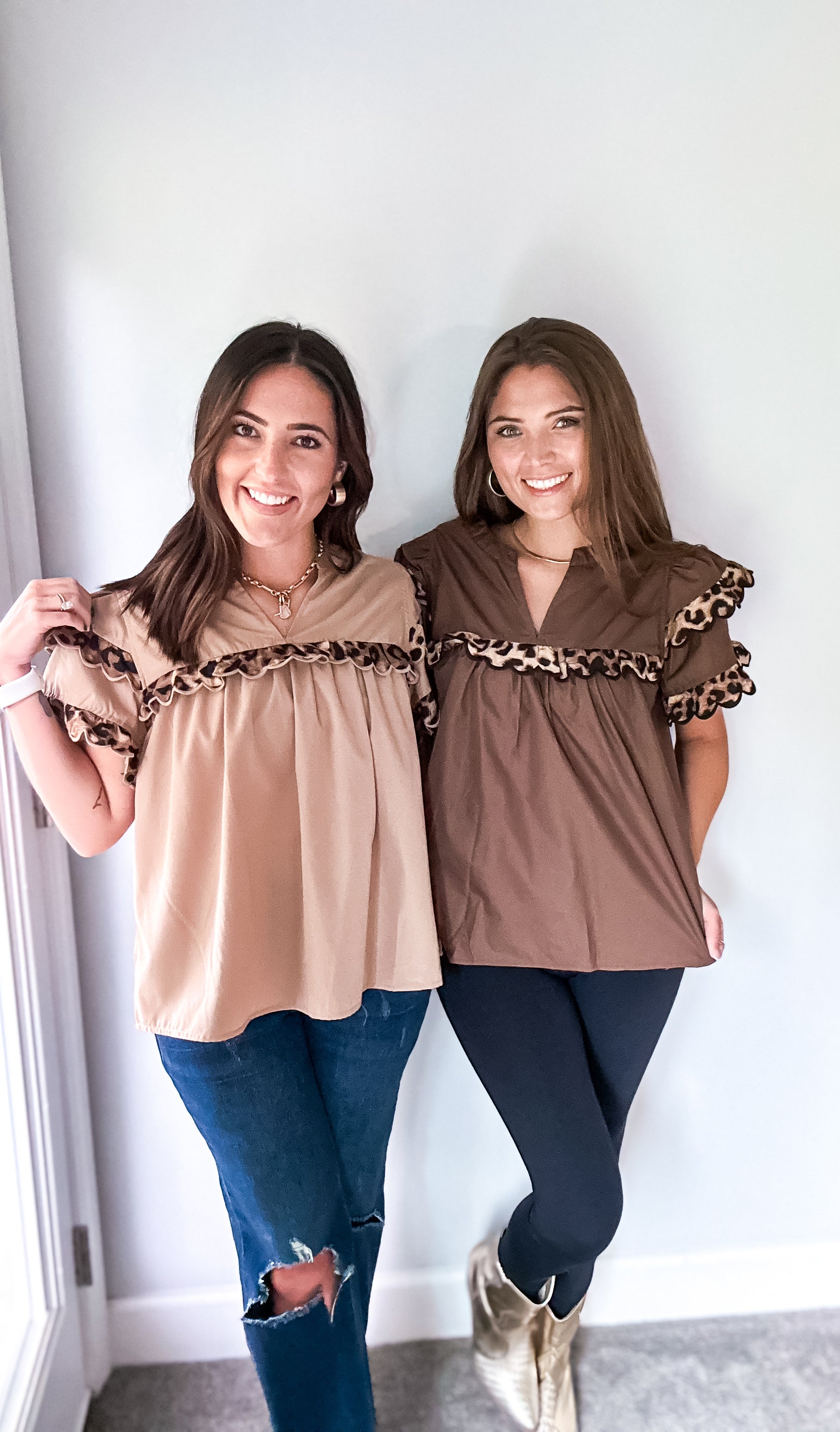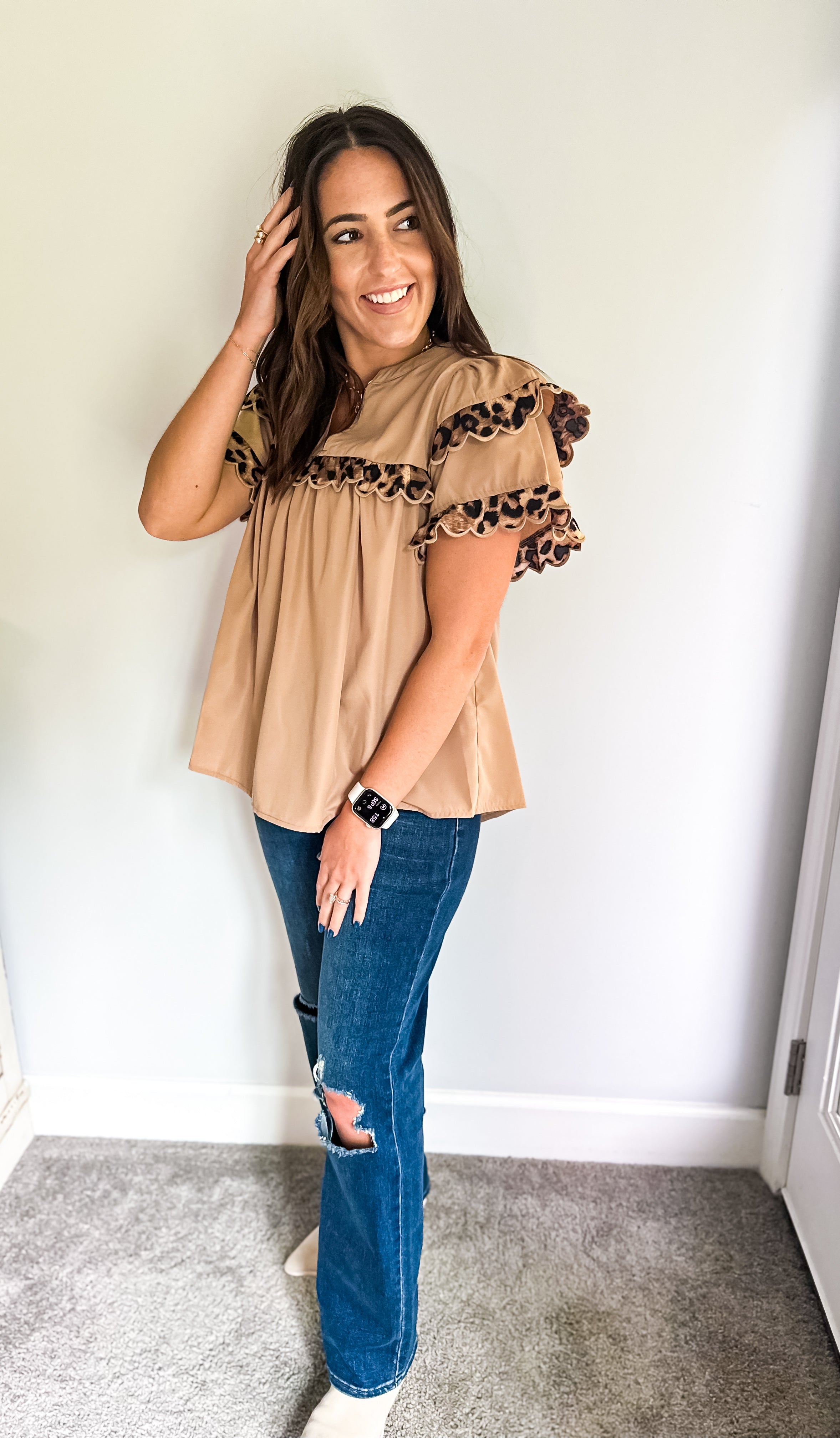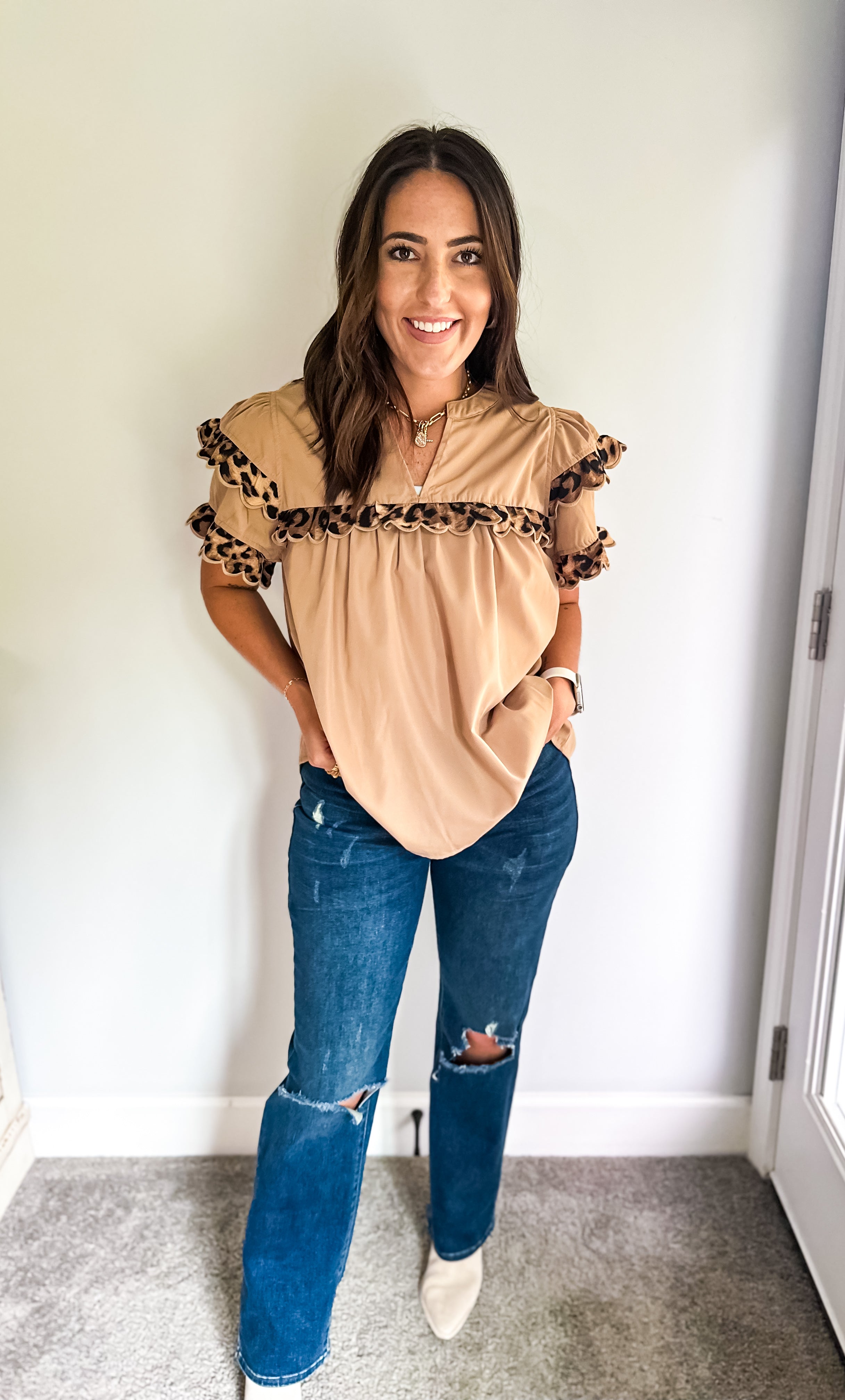 Sold tiered short sleeve v neck top featuring contrasting scalloped cheetah print trim detail. Unlined. Woven. Non-sheer. Lightweight.