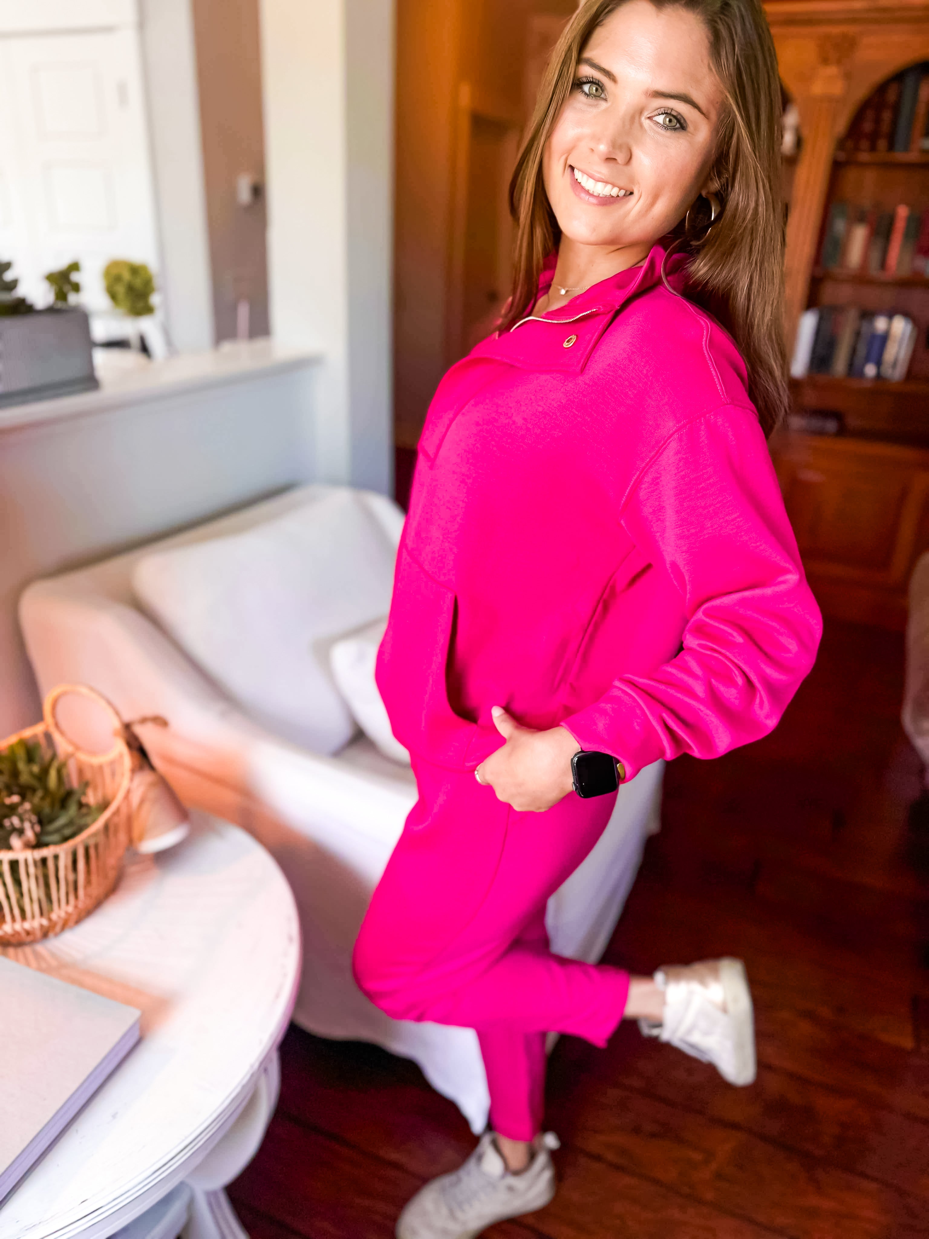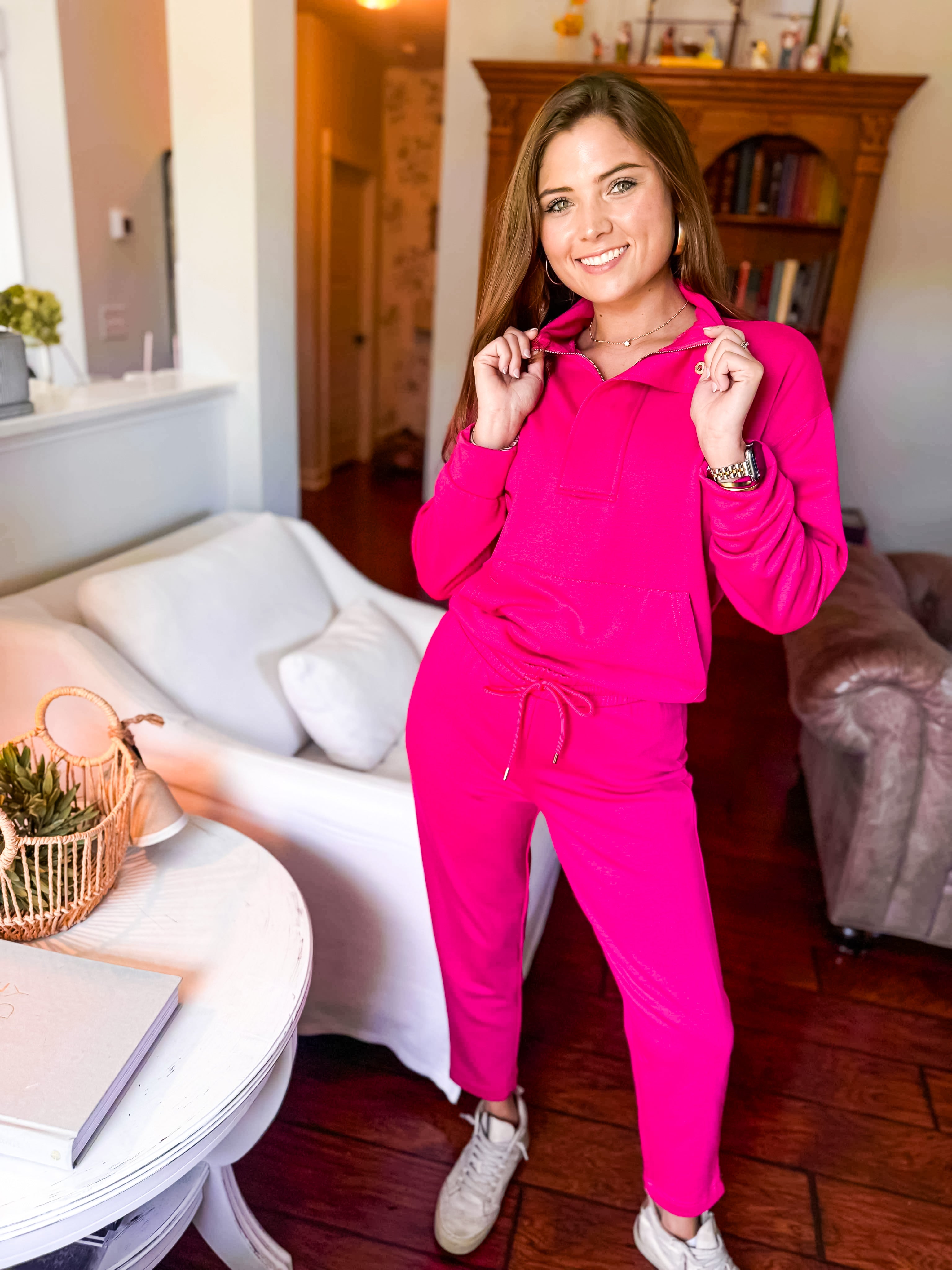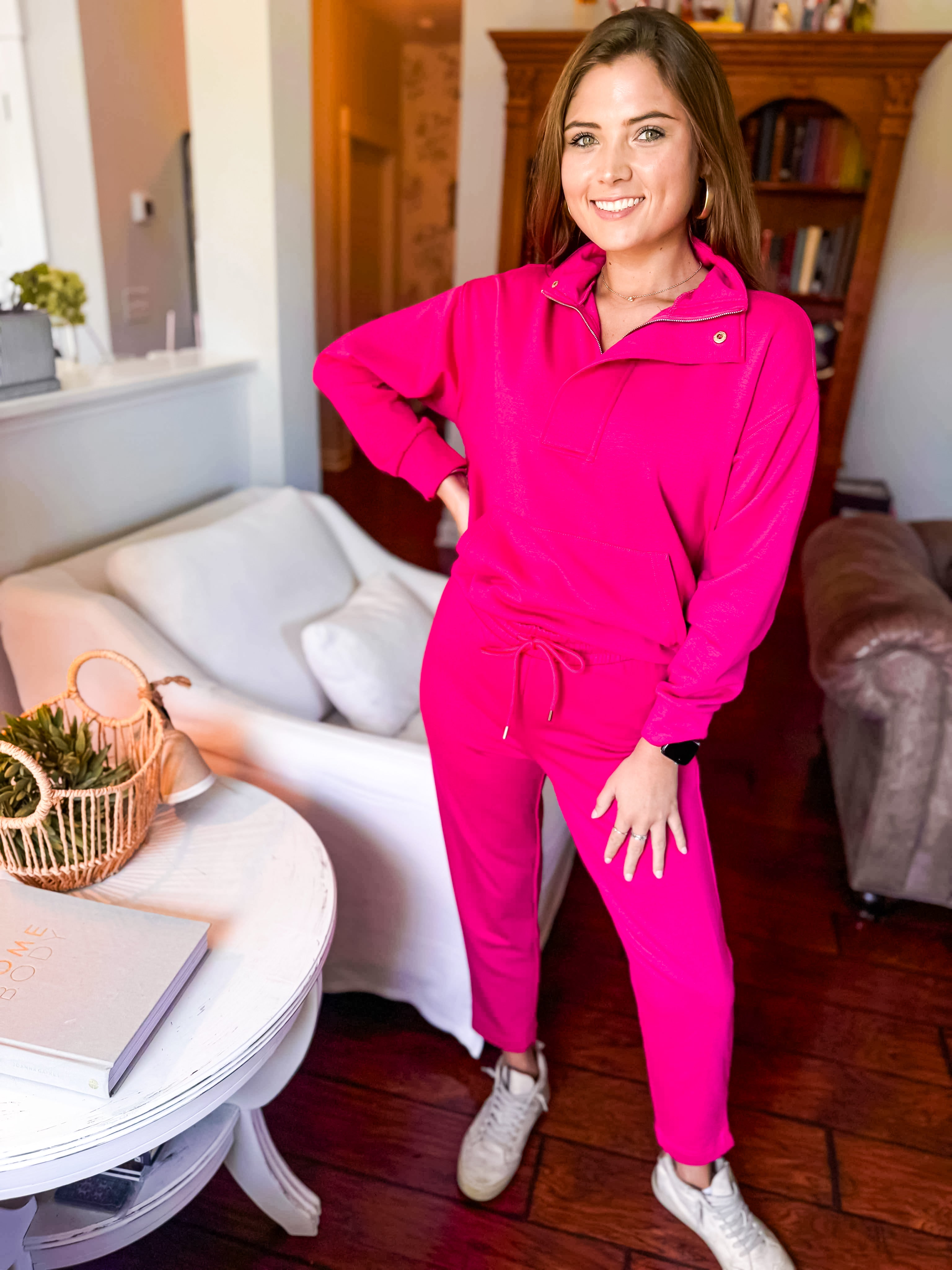 Introducing a Carson Set in Hot Pink. The top is a sweatshirt with a kangaroo pocket and it is paired with pants that are a crop length. A great set to wear wherever!