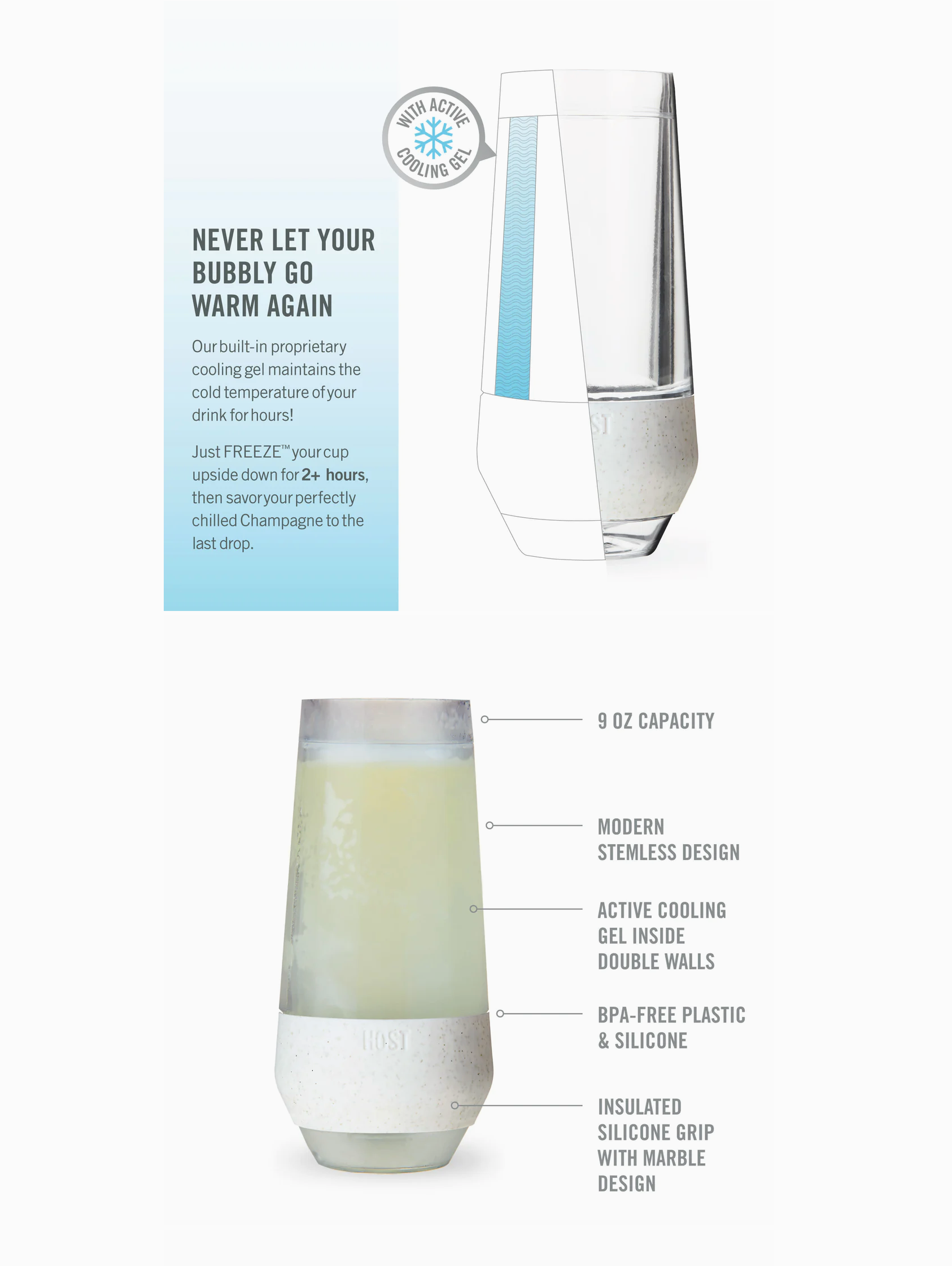 Quantity: 4 cups Capacity: 9 oz. Materials: BPA-free plastic, active cooling gel, silicone Design: insulated walls with active cooling gel Care: hand wash Directions: stash your champagne freeze upside down in the freezer for refreshingly cold wine or cocktails.