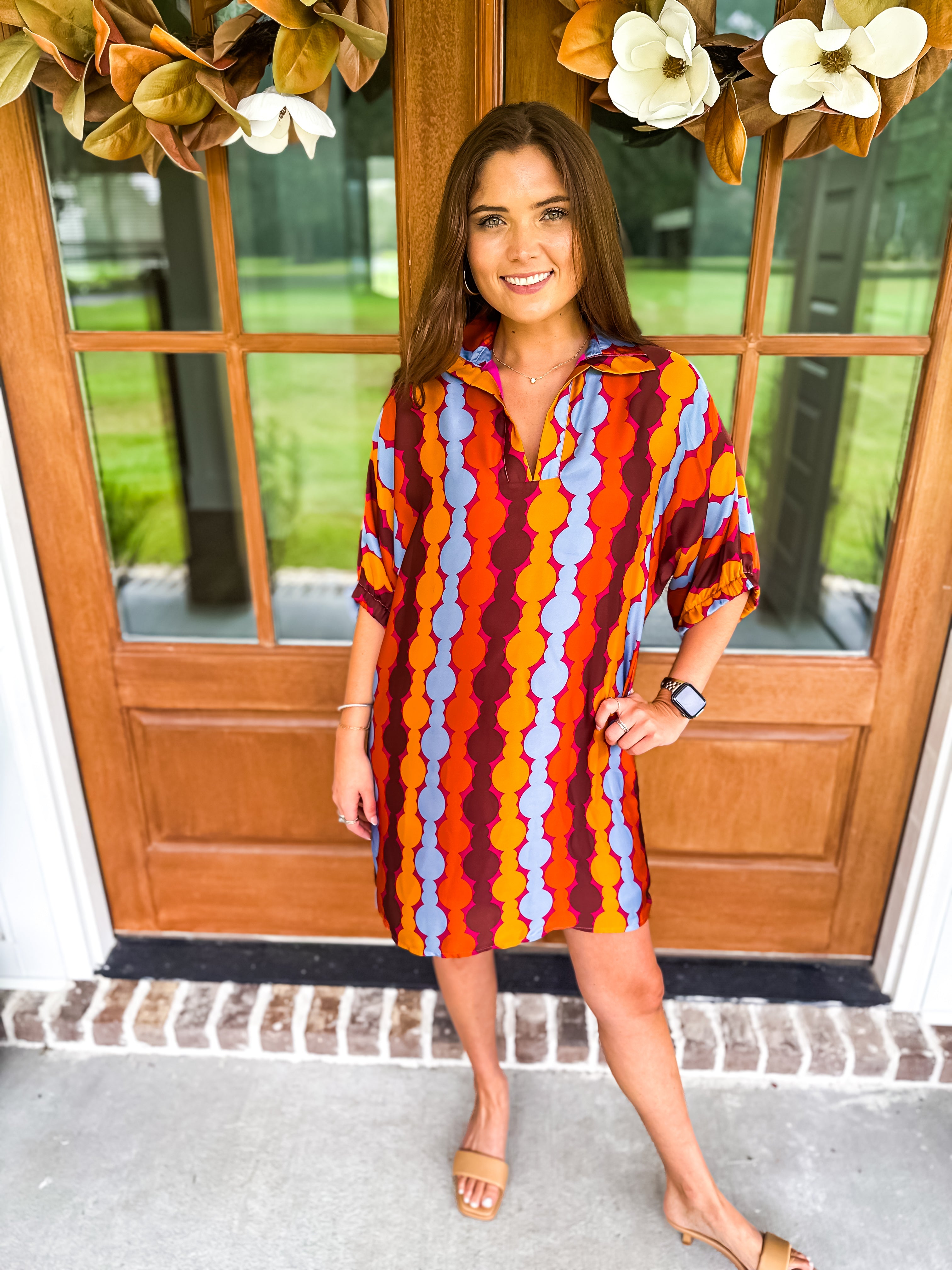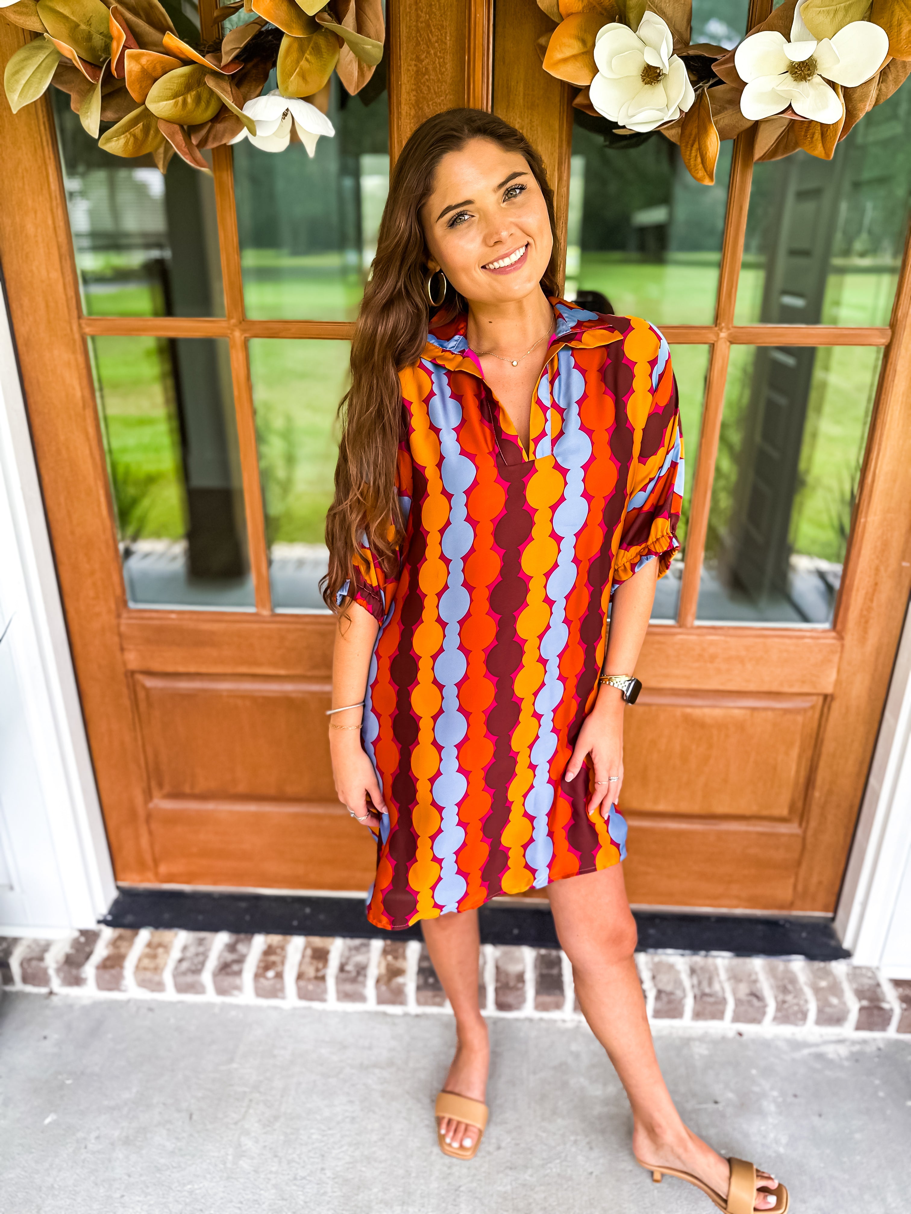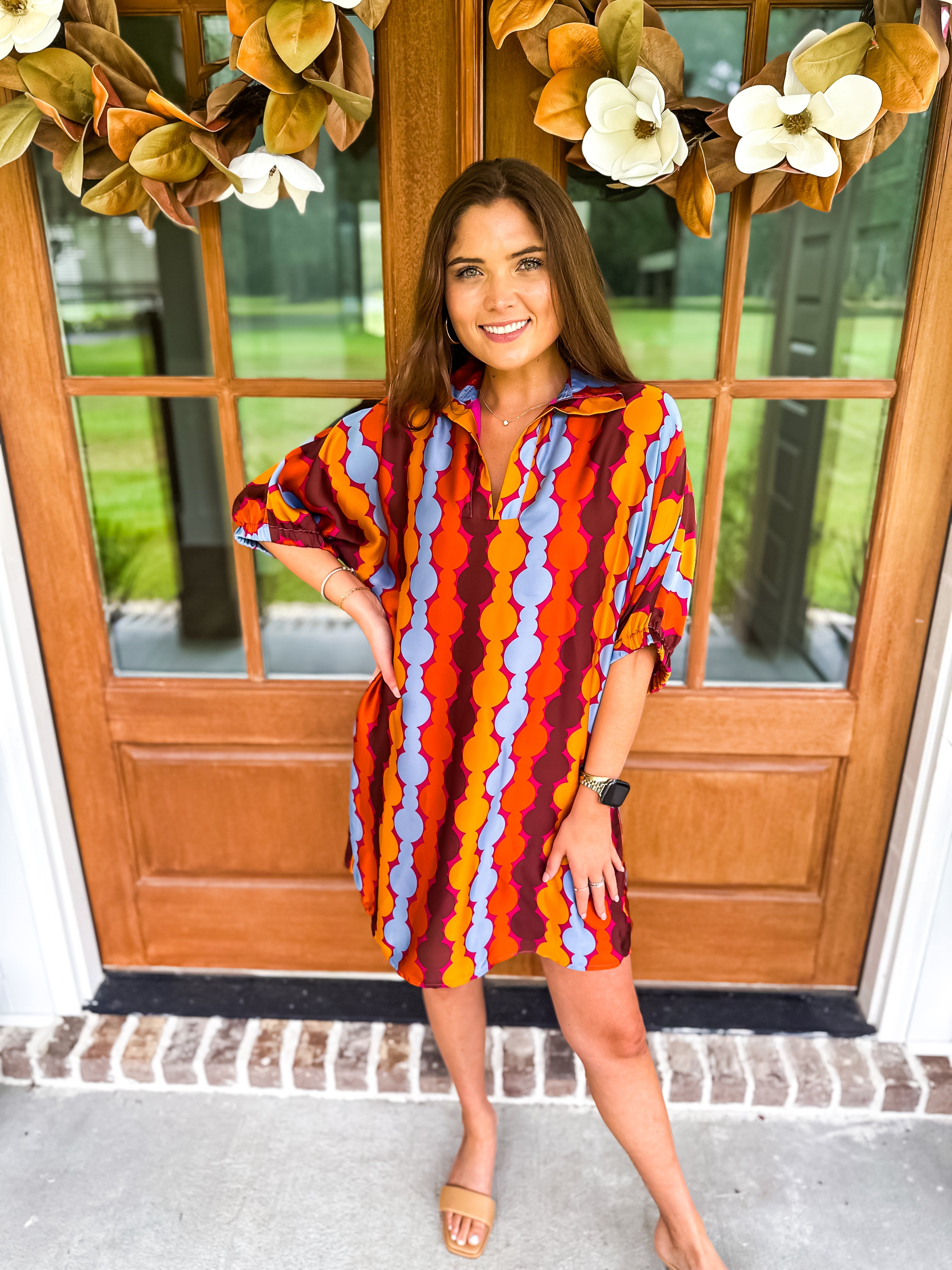 Embrace autumn vibes with our mini dress, showcasing deep fall tones in a stunning strung bead pattern. Perfect for making a statement wherever you go!