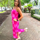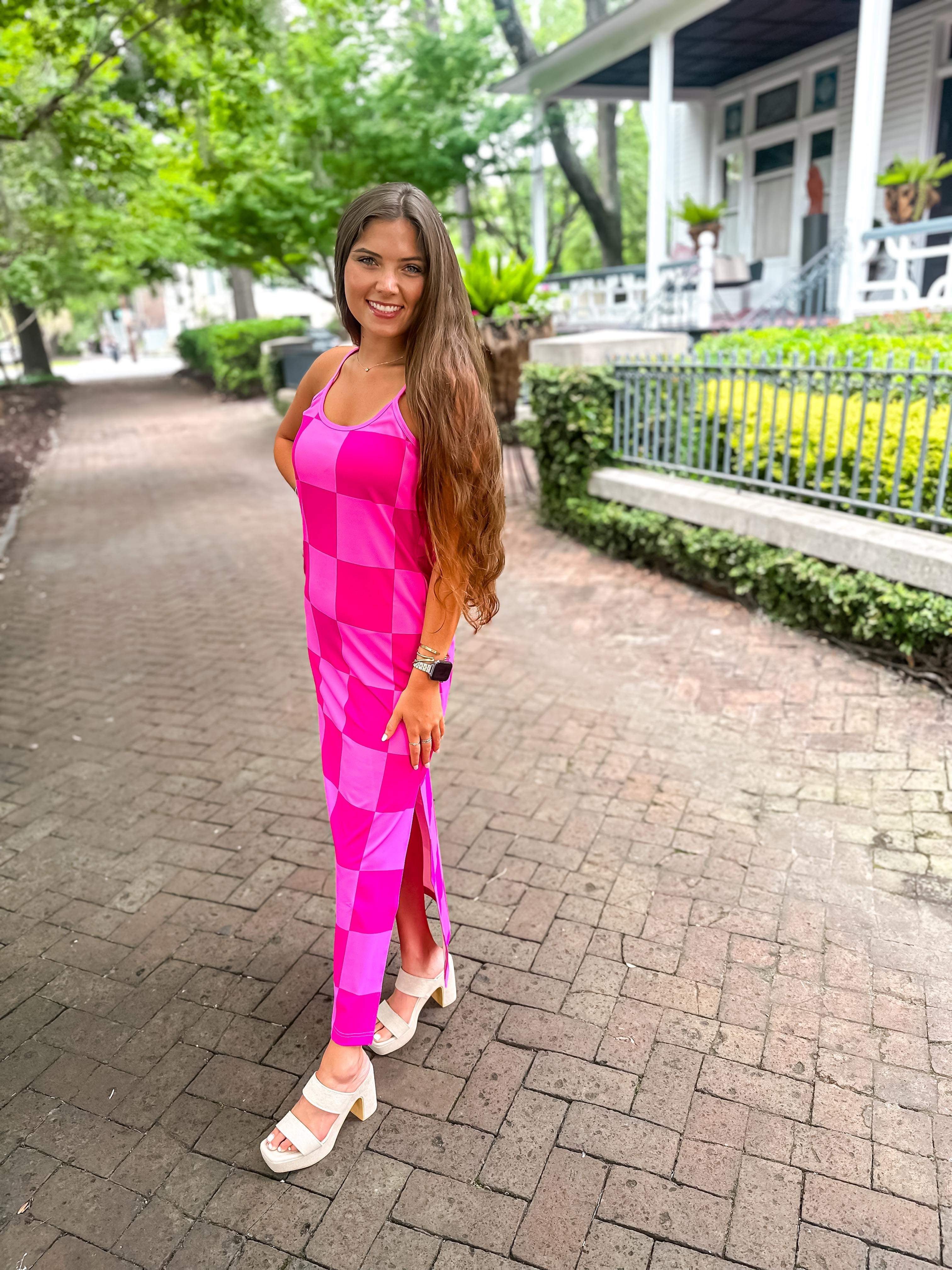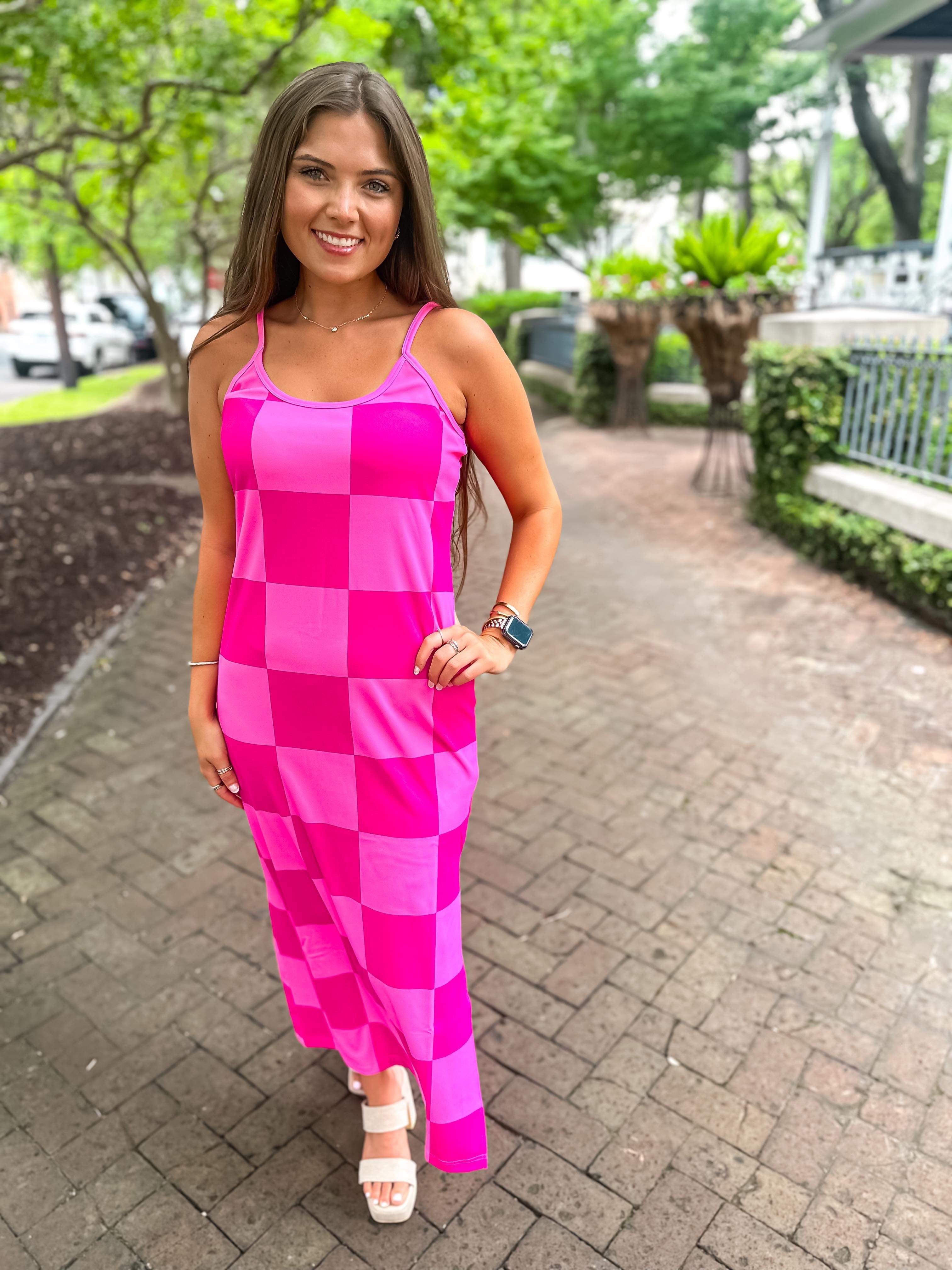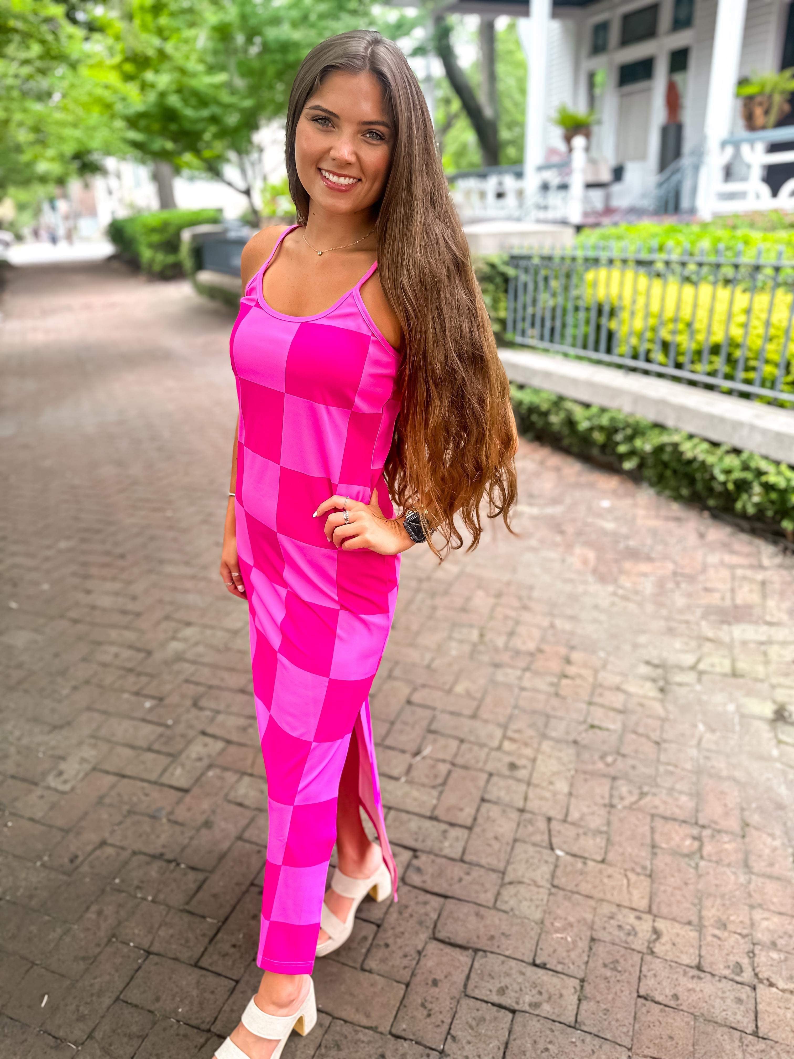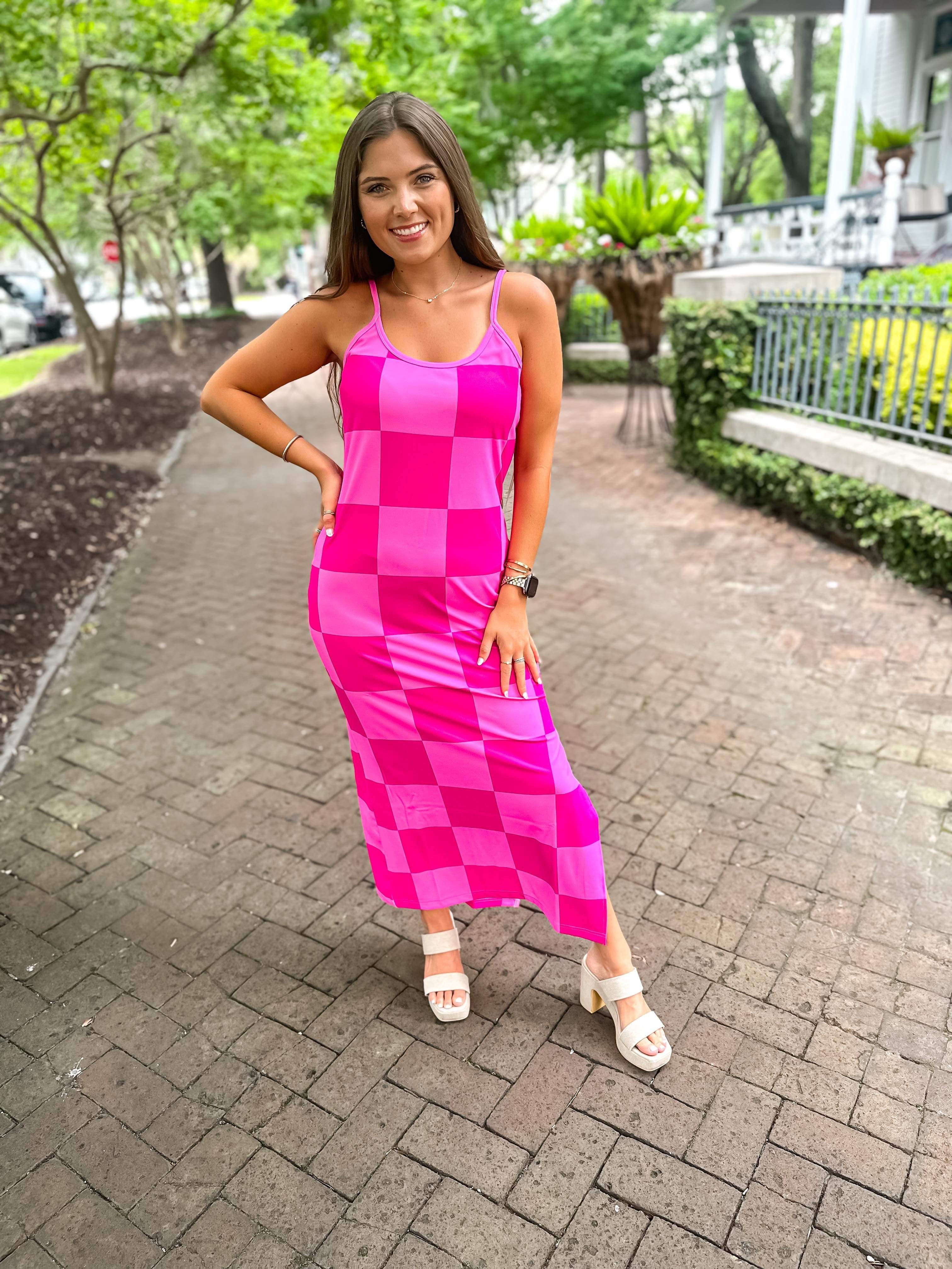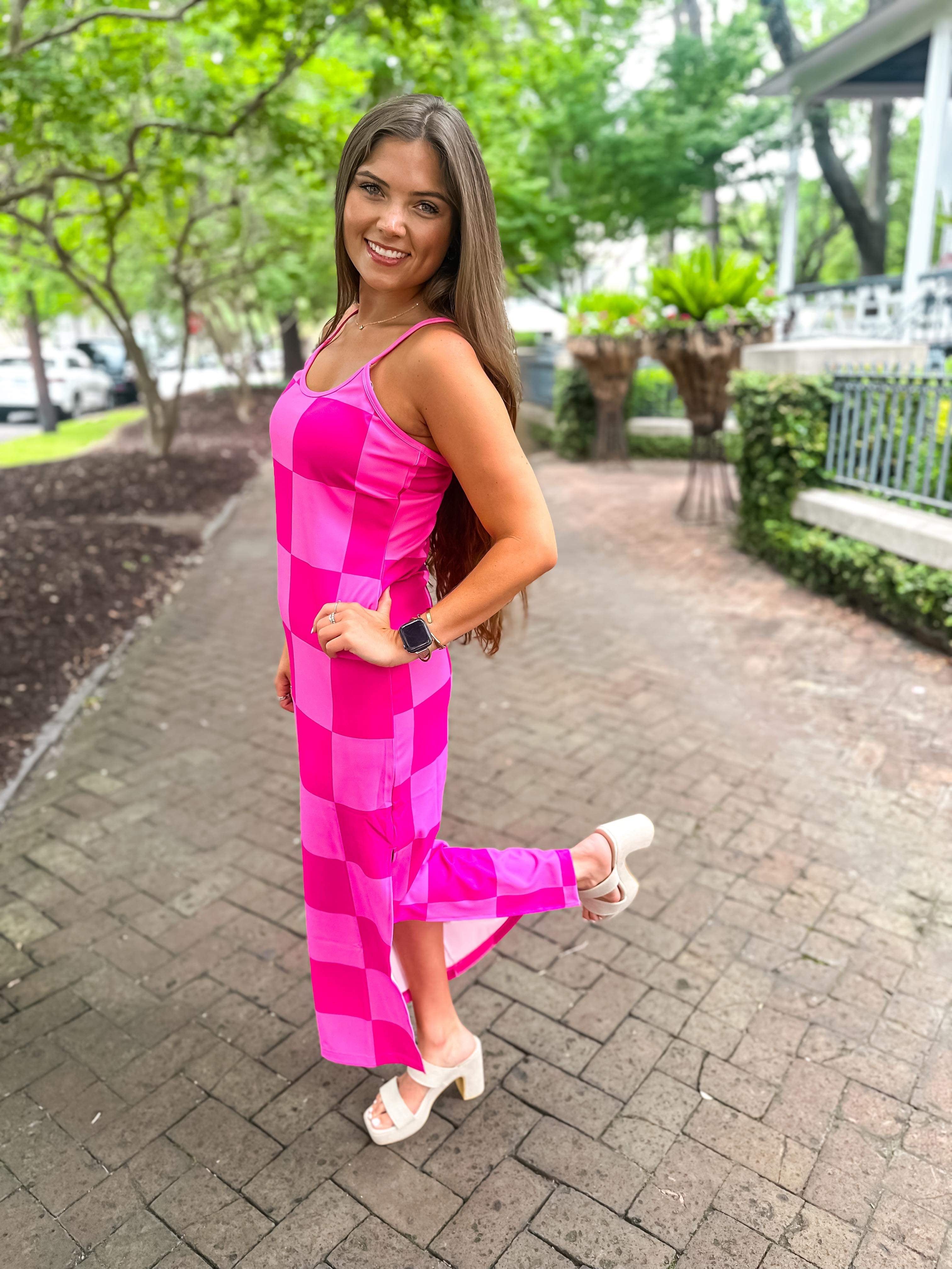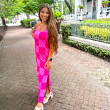 Get ready to be checked out in this Checked Out Checkered Dress! This stretchy pink dress features a side slit and adjustable straps, perfect for wearing as a dress or coverup. Stand out with playful style in this unique and versatile dress.