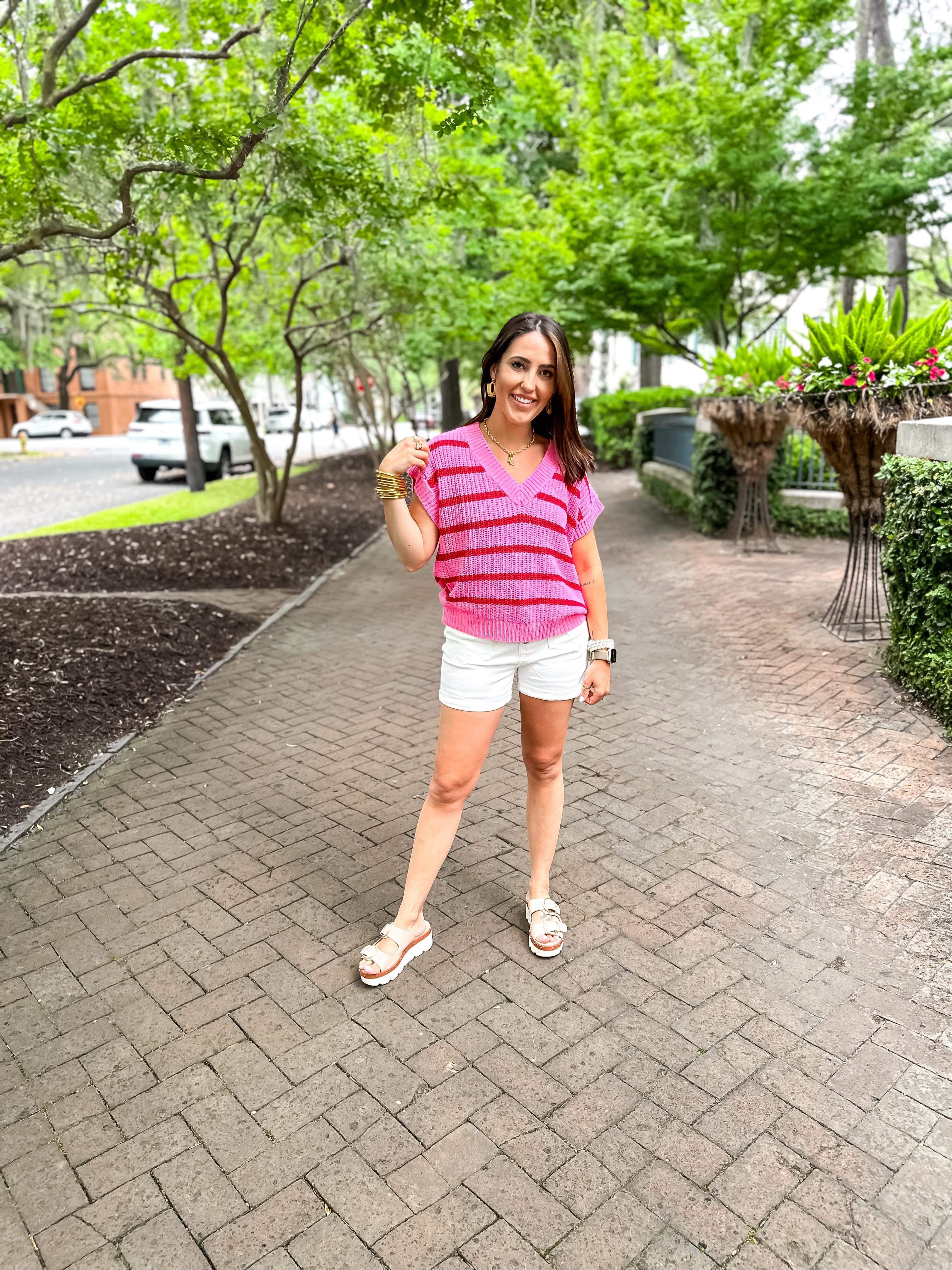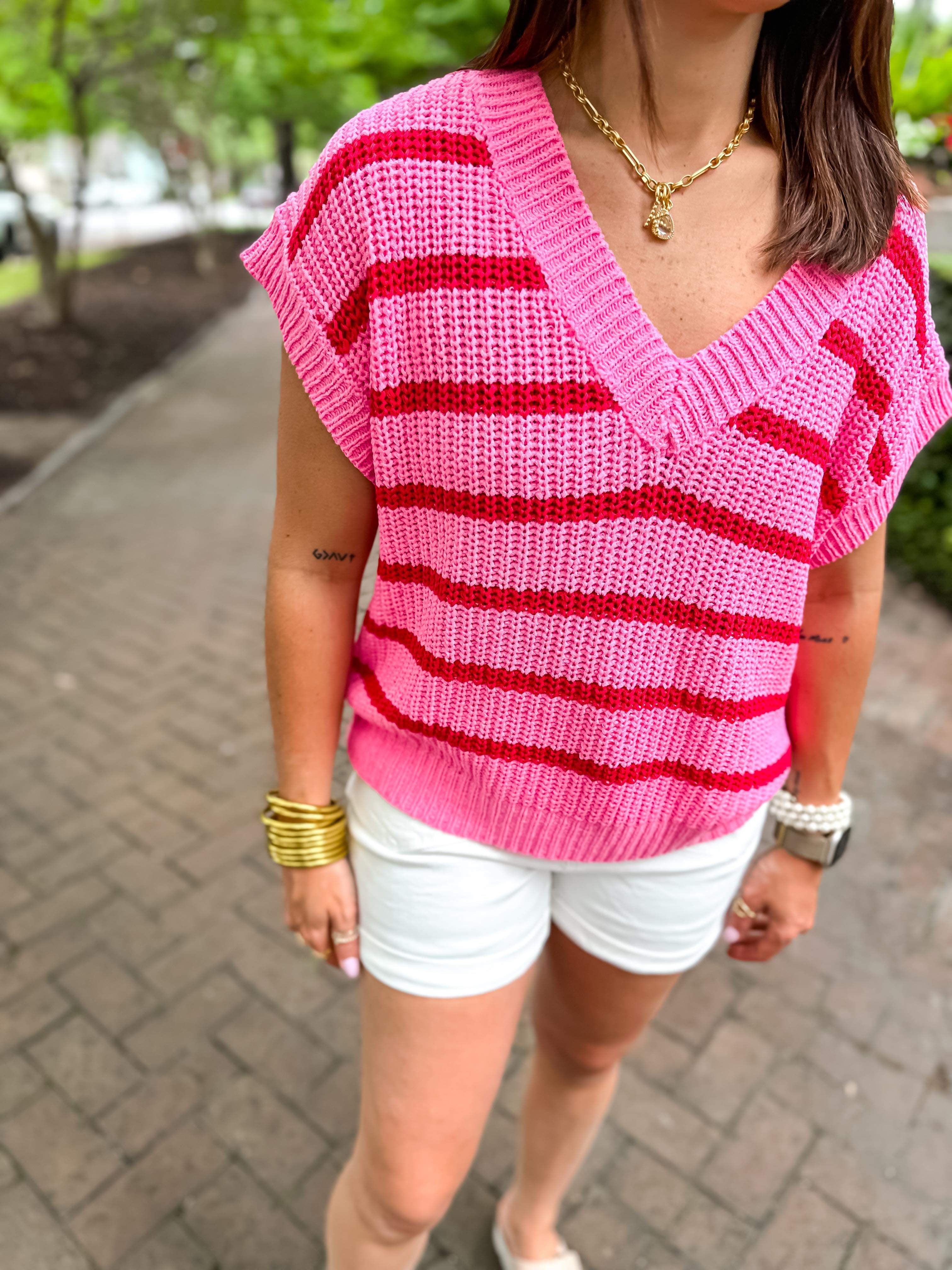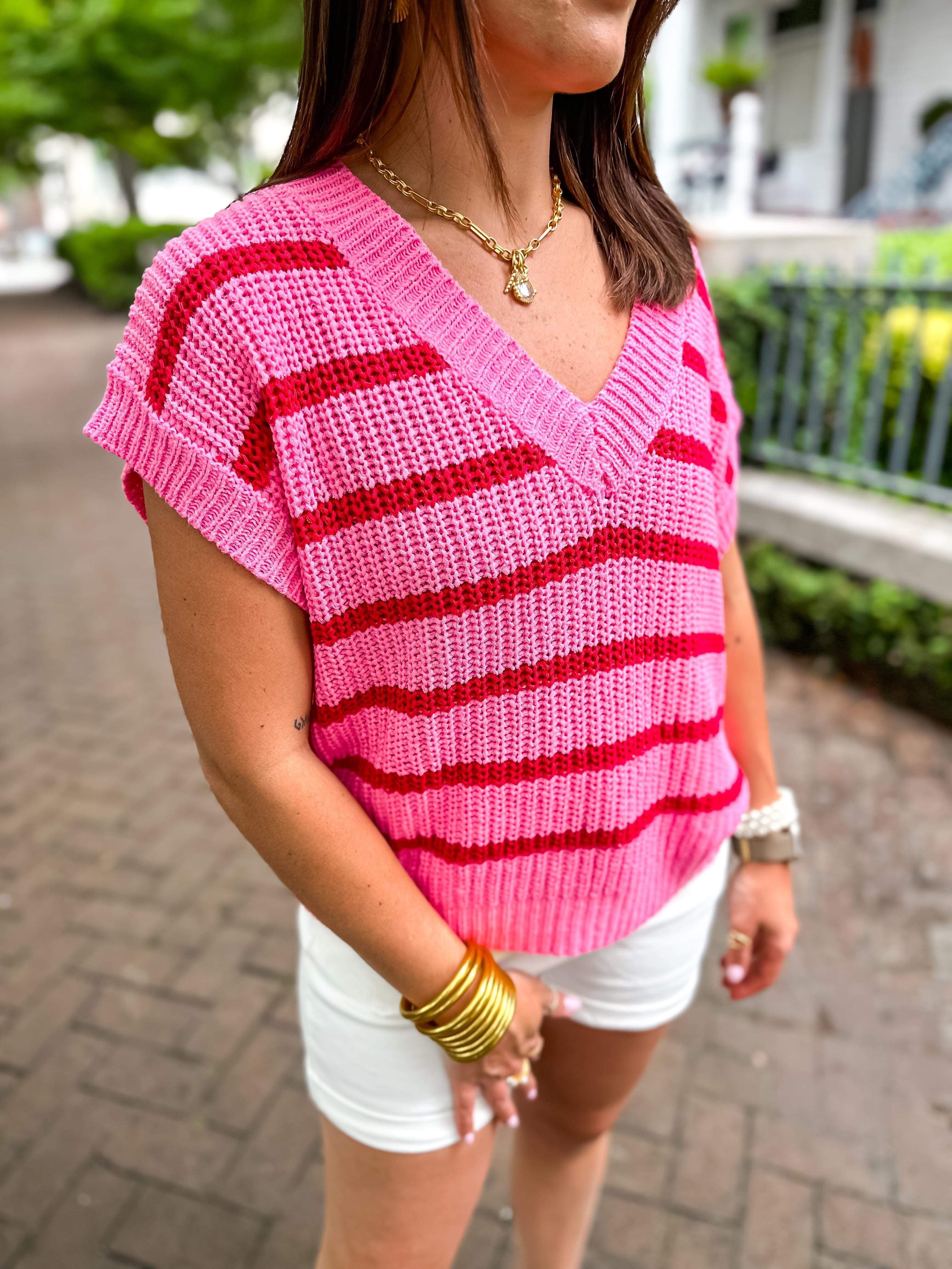 Striped knit short sleeve v-neck top featuring ribbed detail. Unlined. Knit. Semi-sheer. Lightweight.