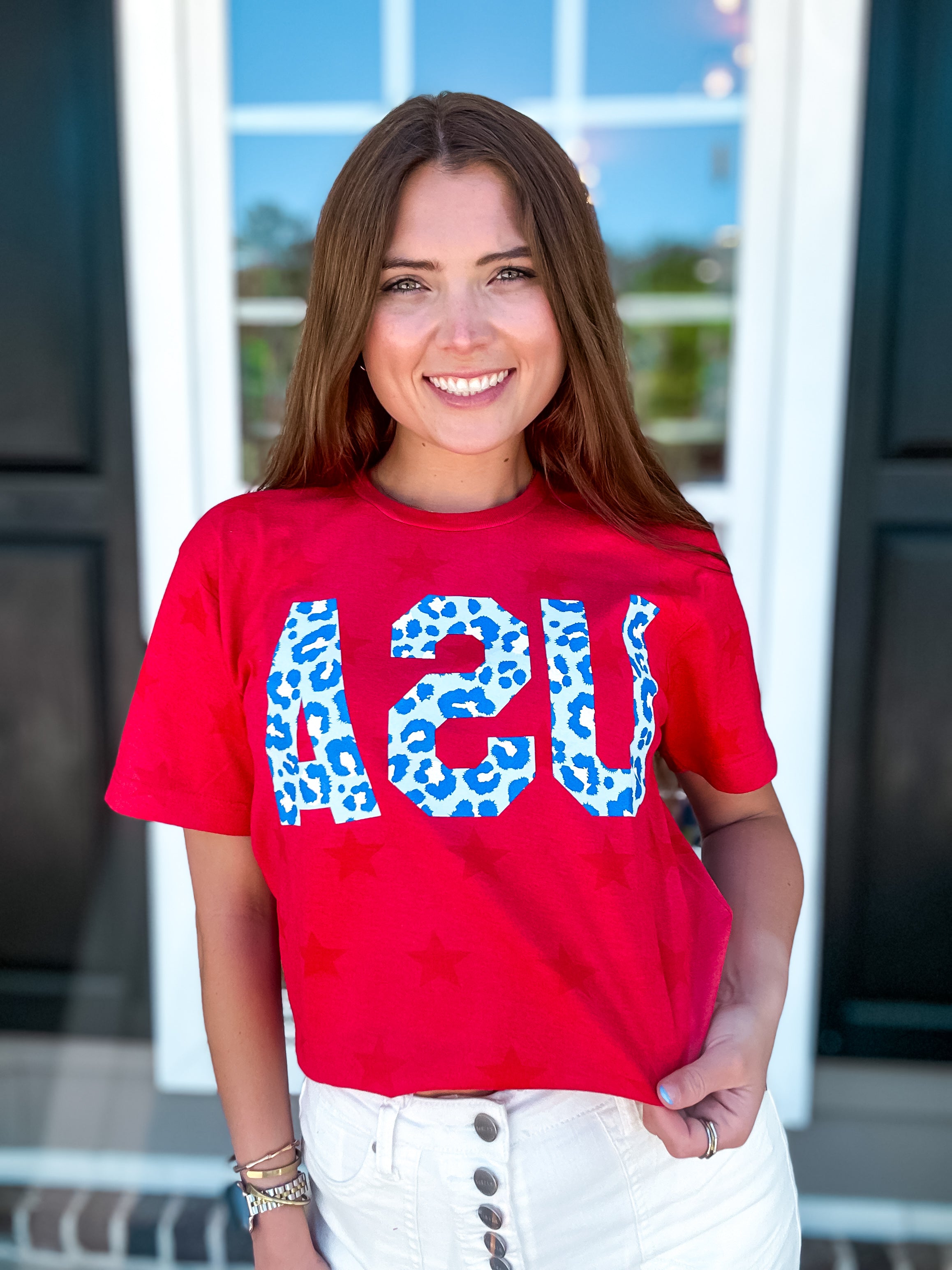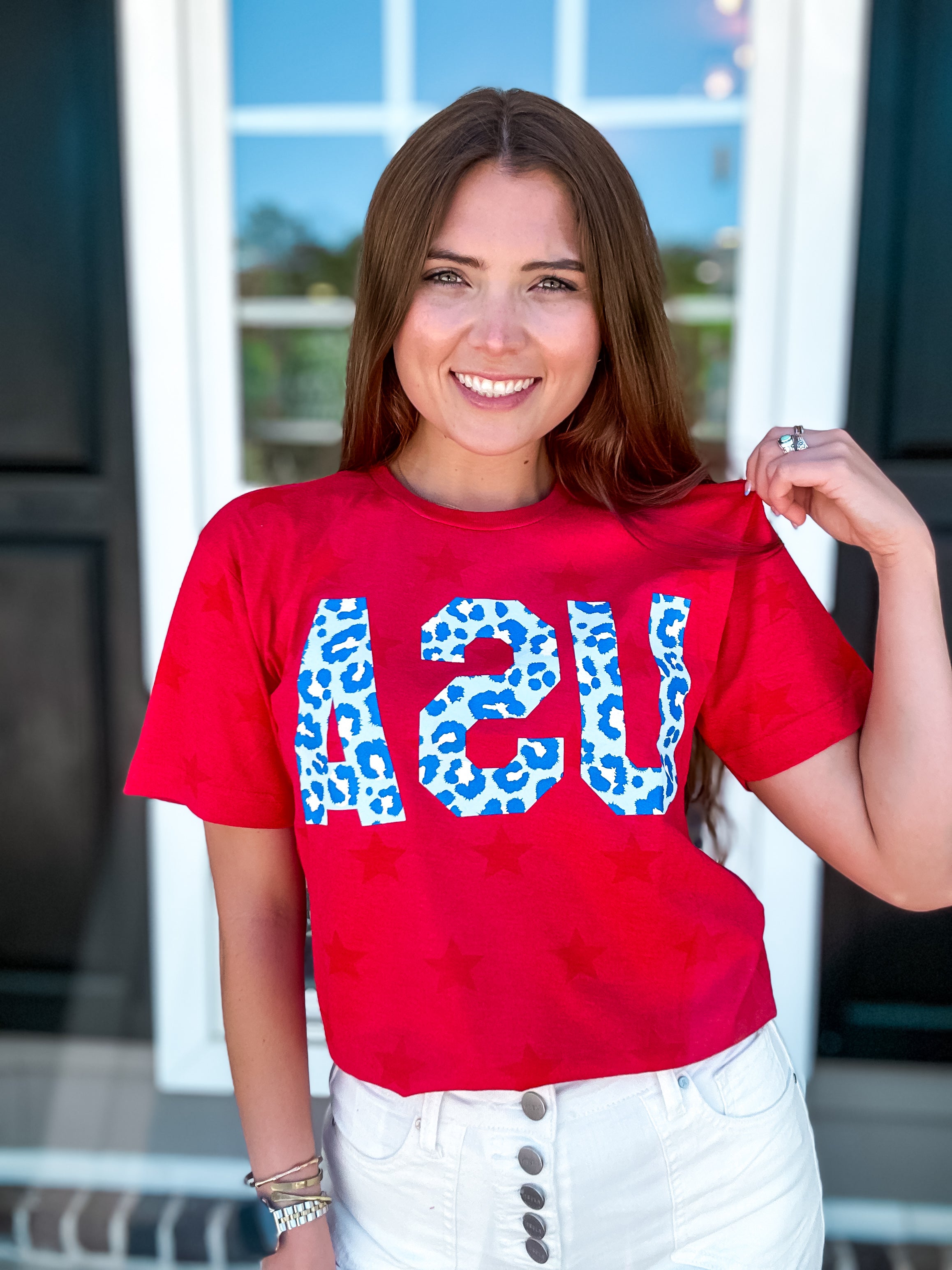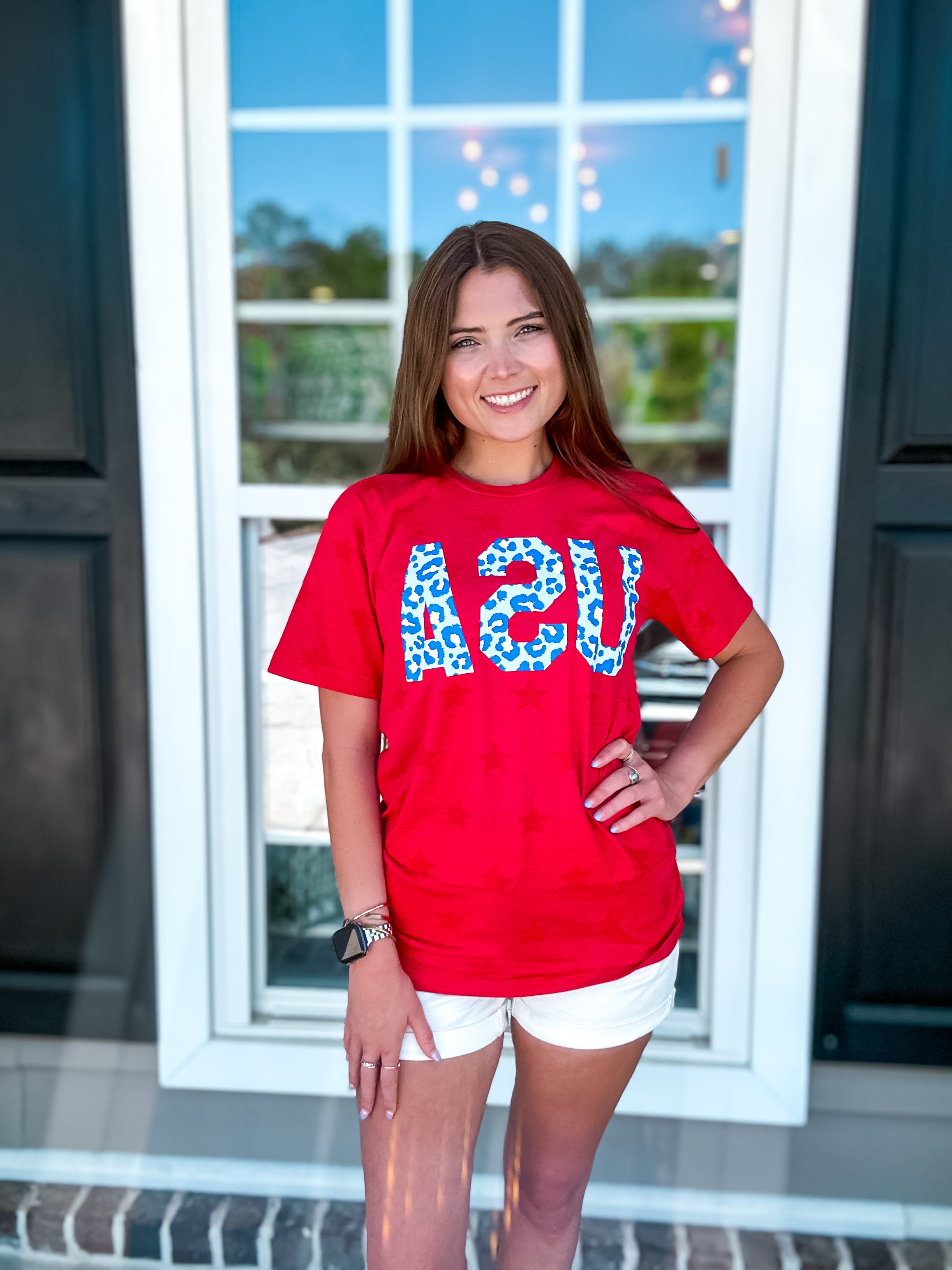 We are loving this tee. Let's get WILD about the USA! It is red with the stars in the background. It features a cheetah print in the background of 'USA'. It would pair perfectly with any and all denim bottoms. Wear it over your bathing suits and go to lunch or dinner after a day in the sun!
