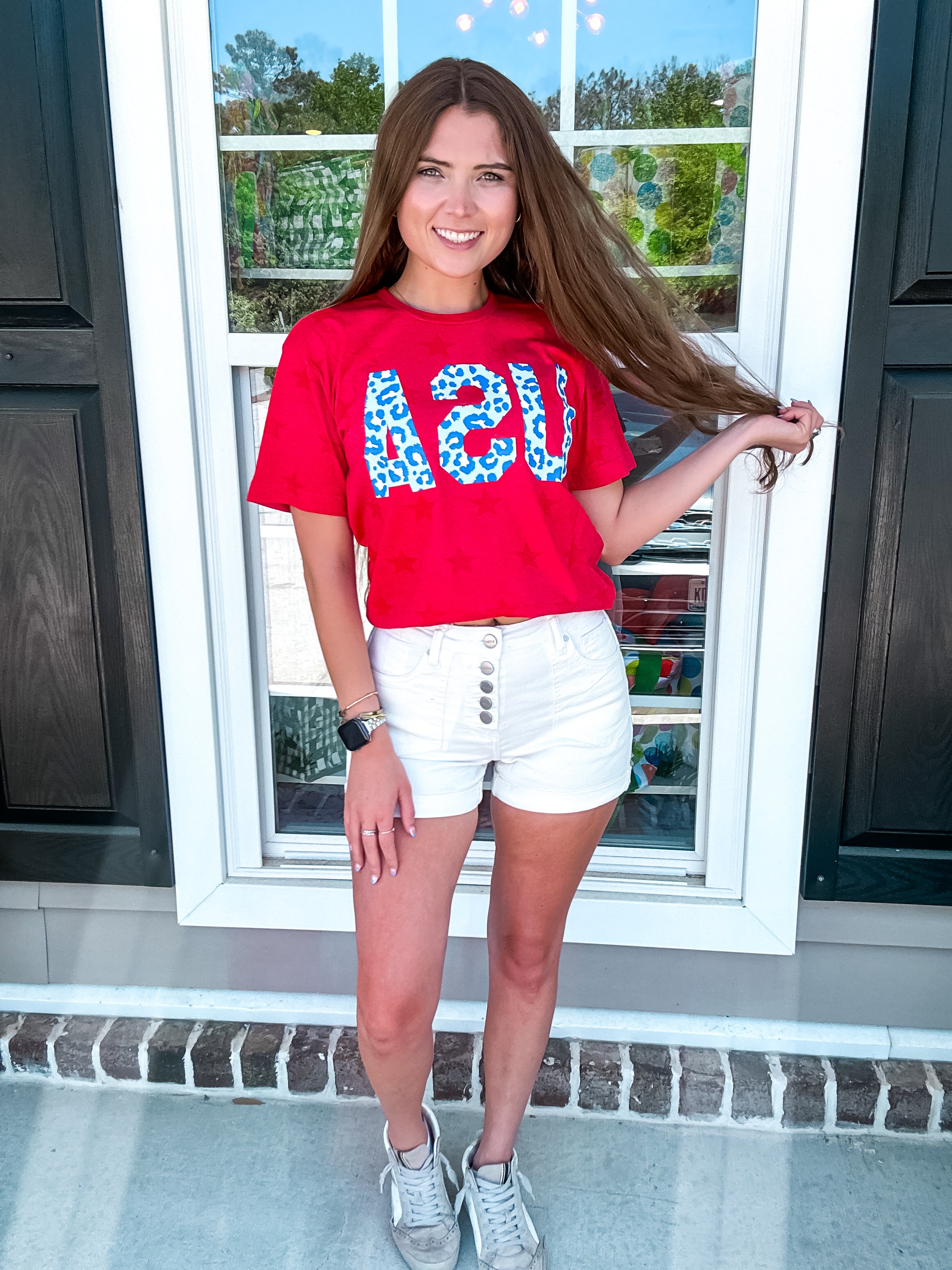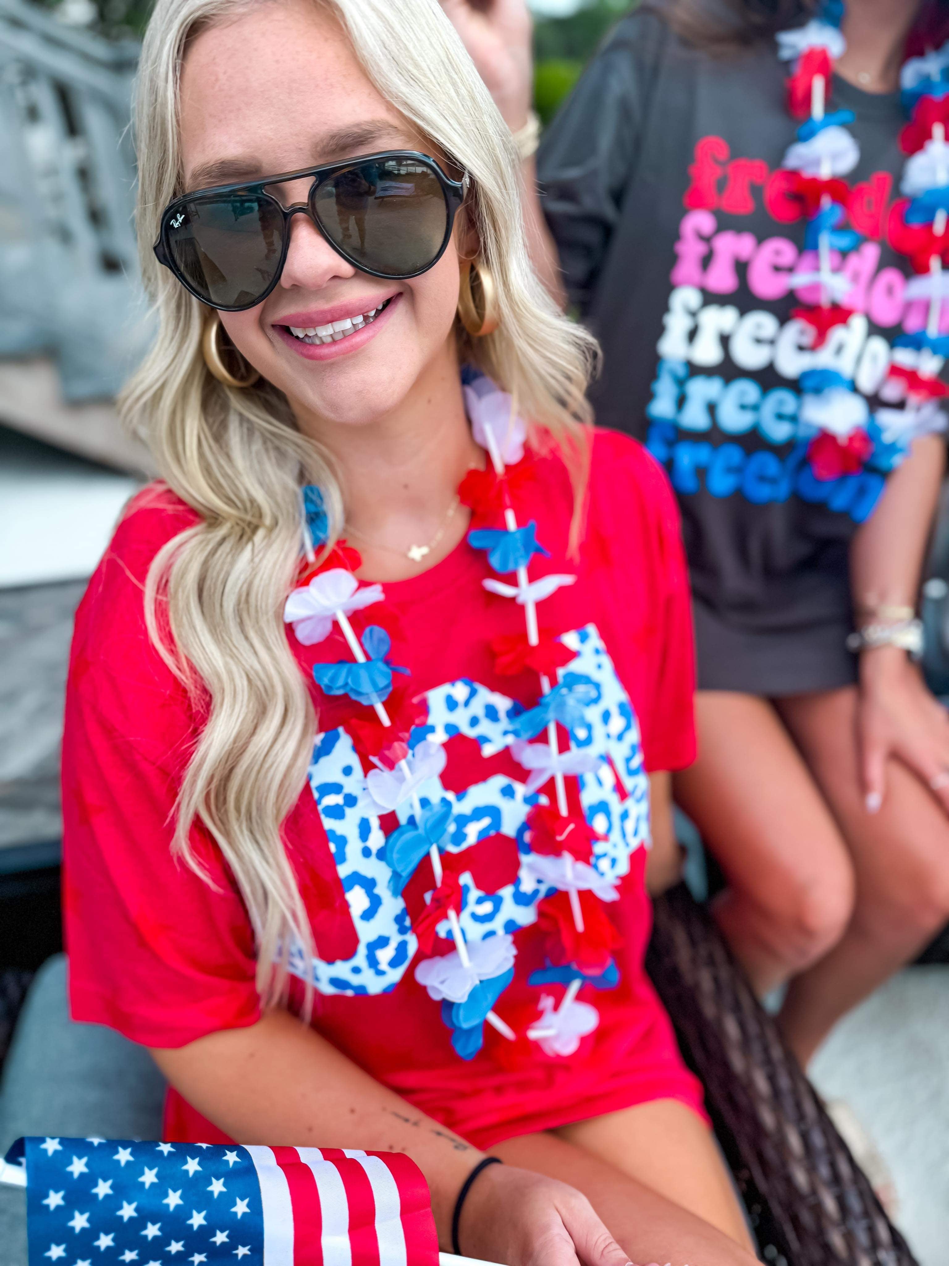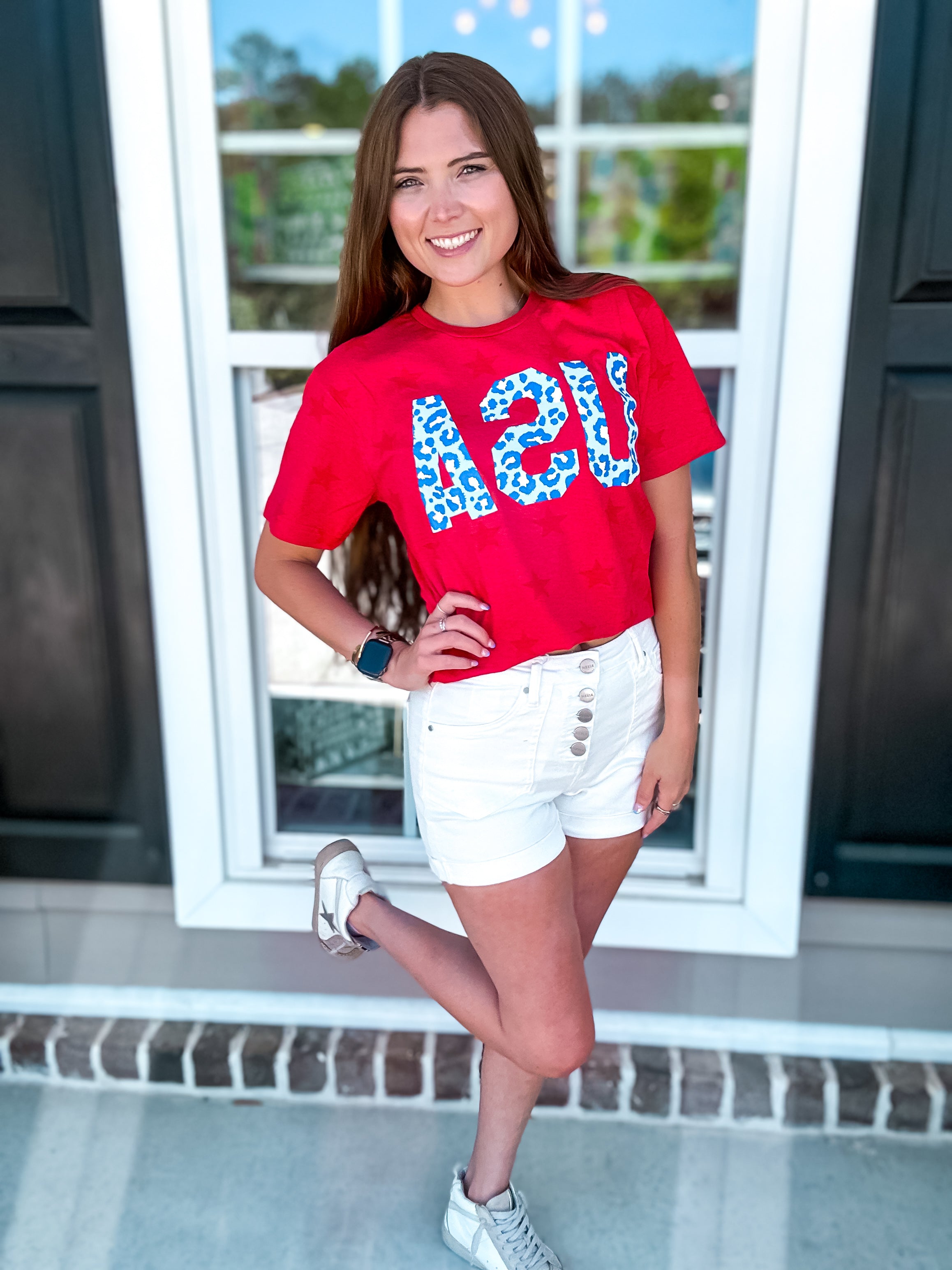 We are loving this tee. Let's get WILD about the USA! It is red with the stars in the background. It features a cheetah print in the background of 'USA'. It would pair perfectly with any and all denim bottoms. Wear it over your bathing suits and go to lunch or dinner after a day in the sun!