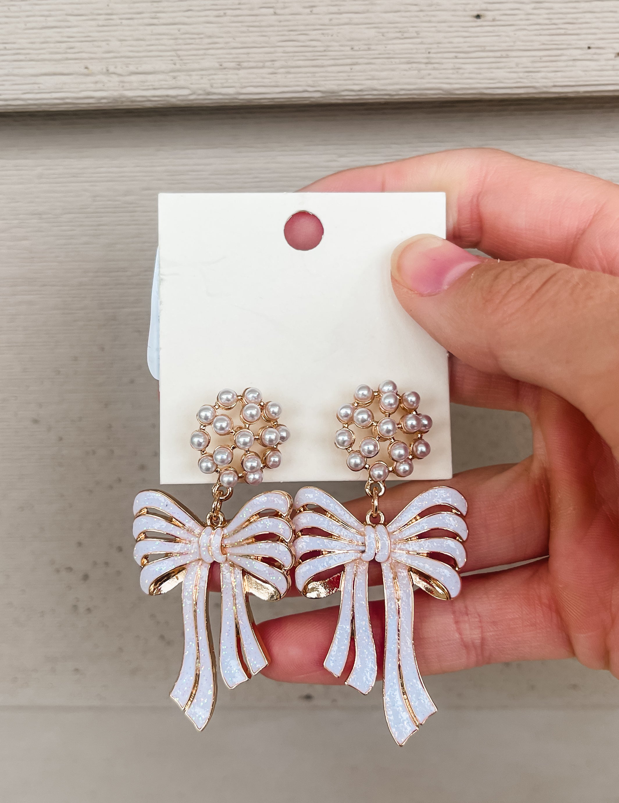 Get in the Holiday Spirit and have these while you sport all your favorite Holiday items. They have a white bow dangling with a pearl stud piece. They would look great with everything.