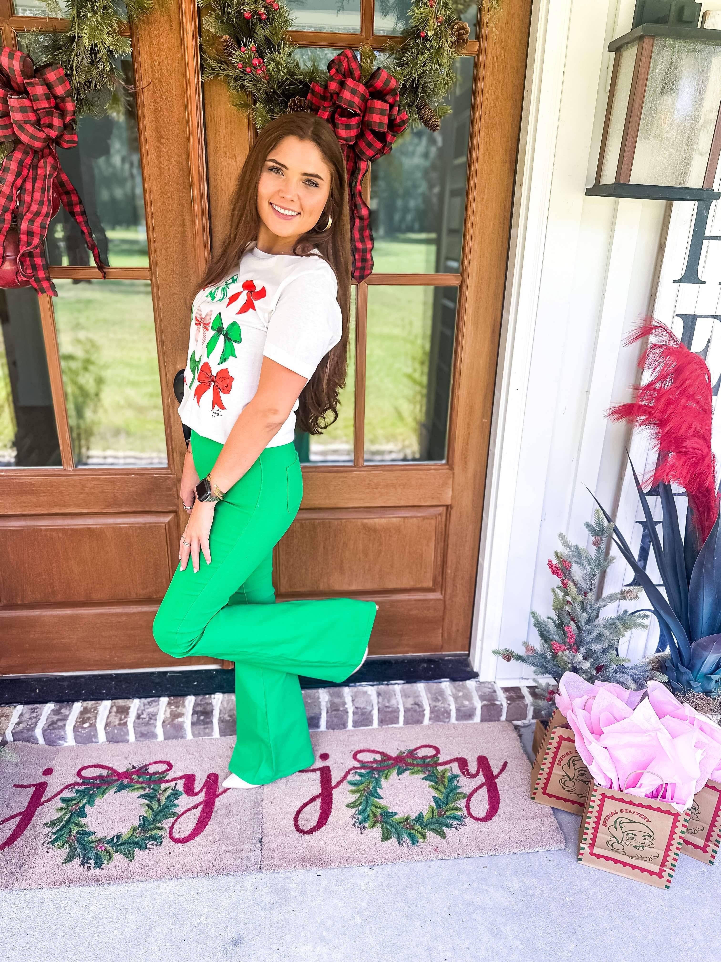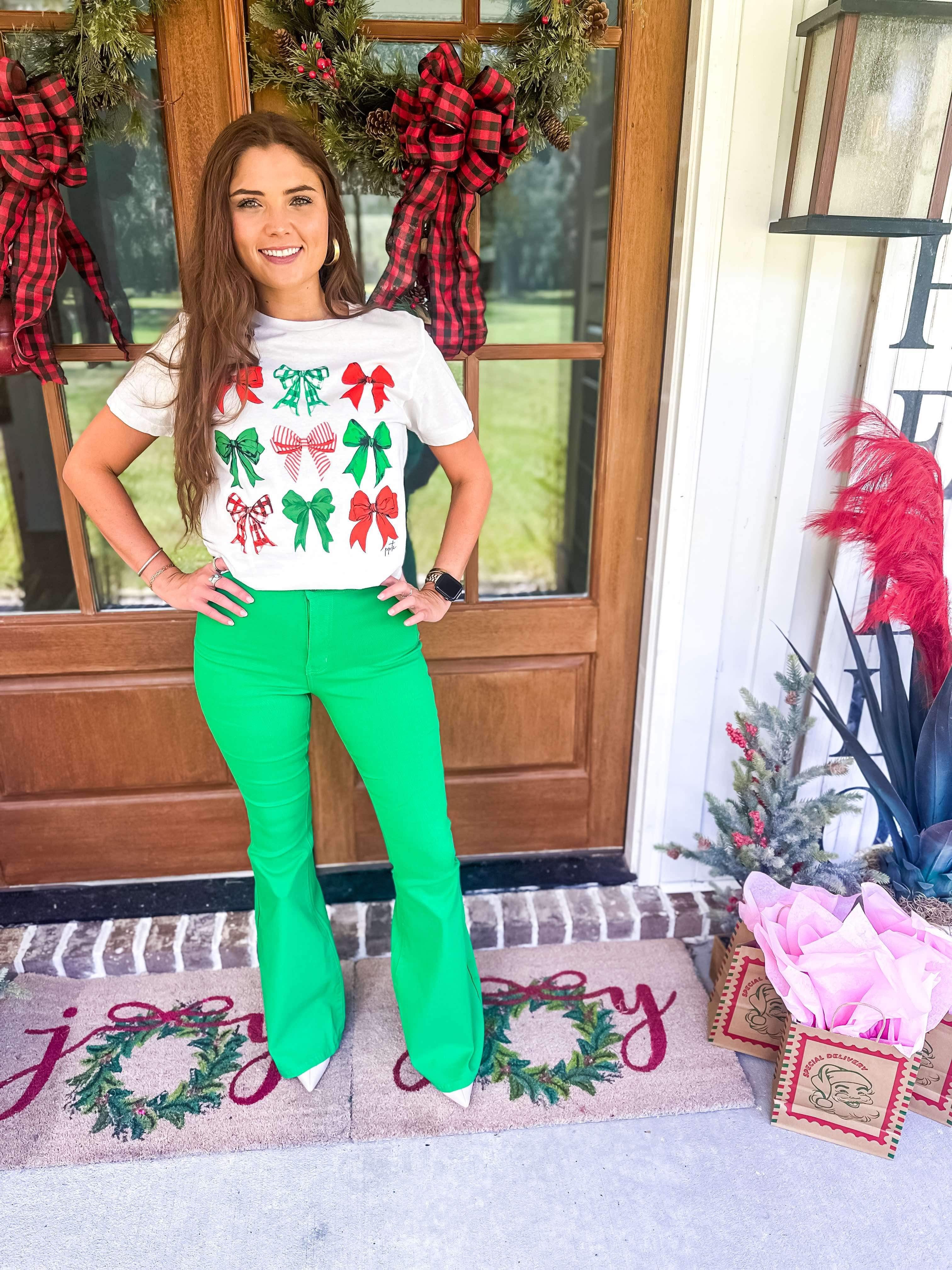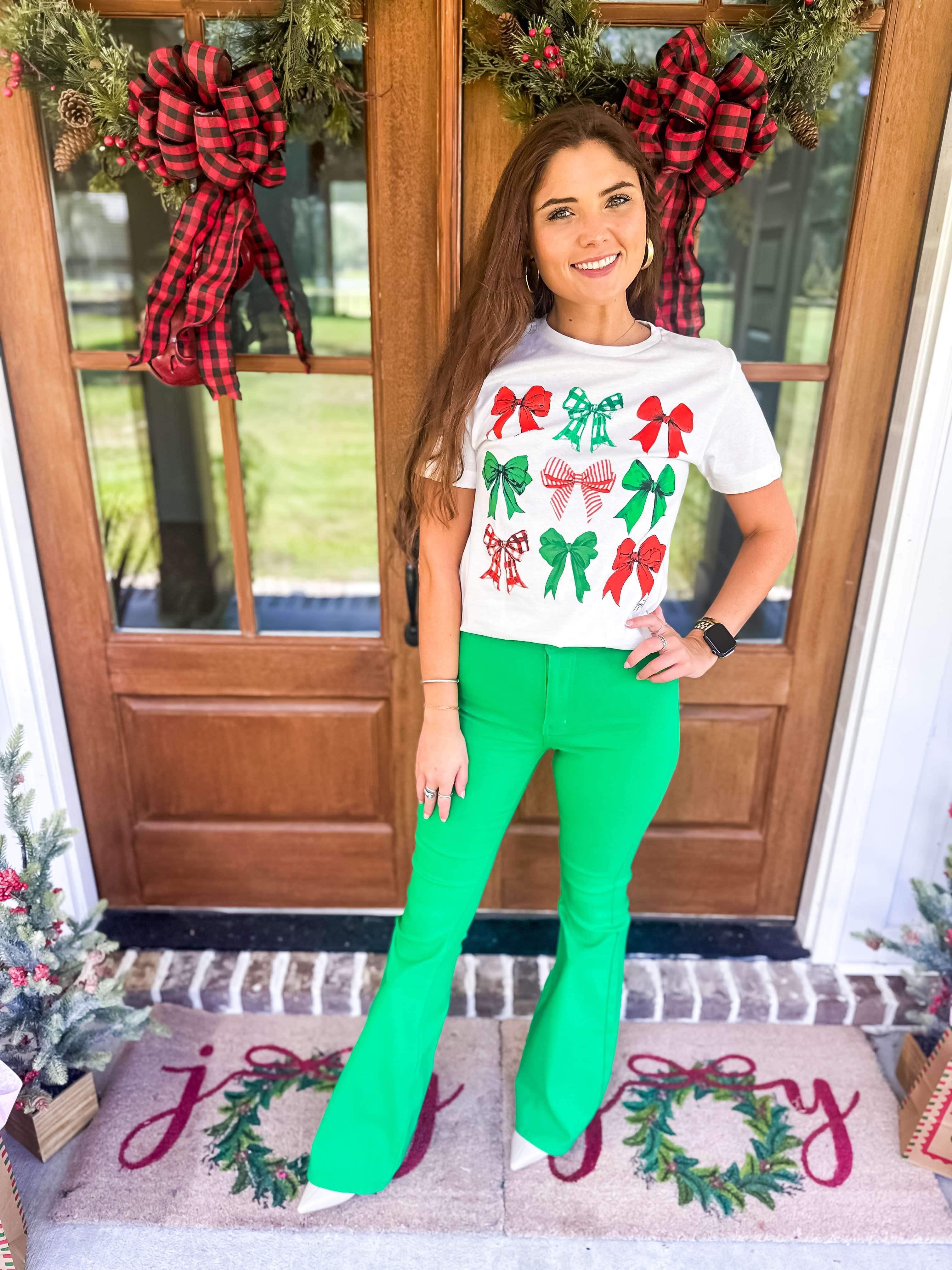 Let your festive spirit shine with our Christmas Bow Tee! With adorable red and green bows, this graphic tee is perfect for decking the halls. Add some holiday cheer to your wardrobe with this quirky and playful shirt. (No ugly sweaters here!)