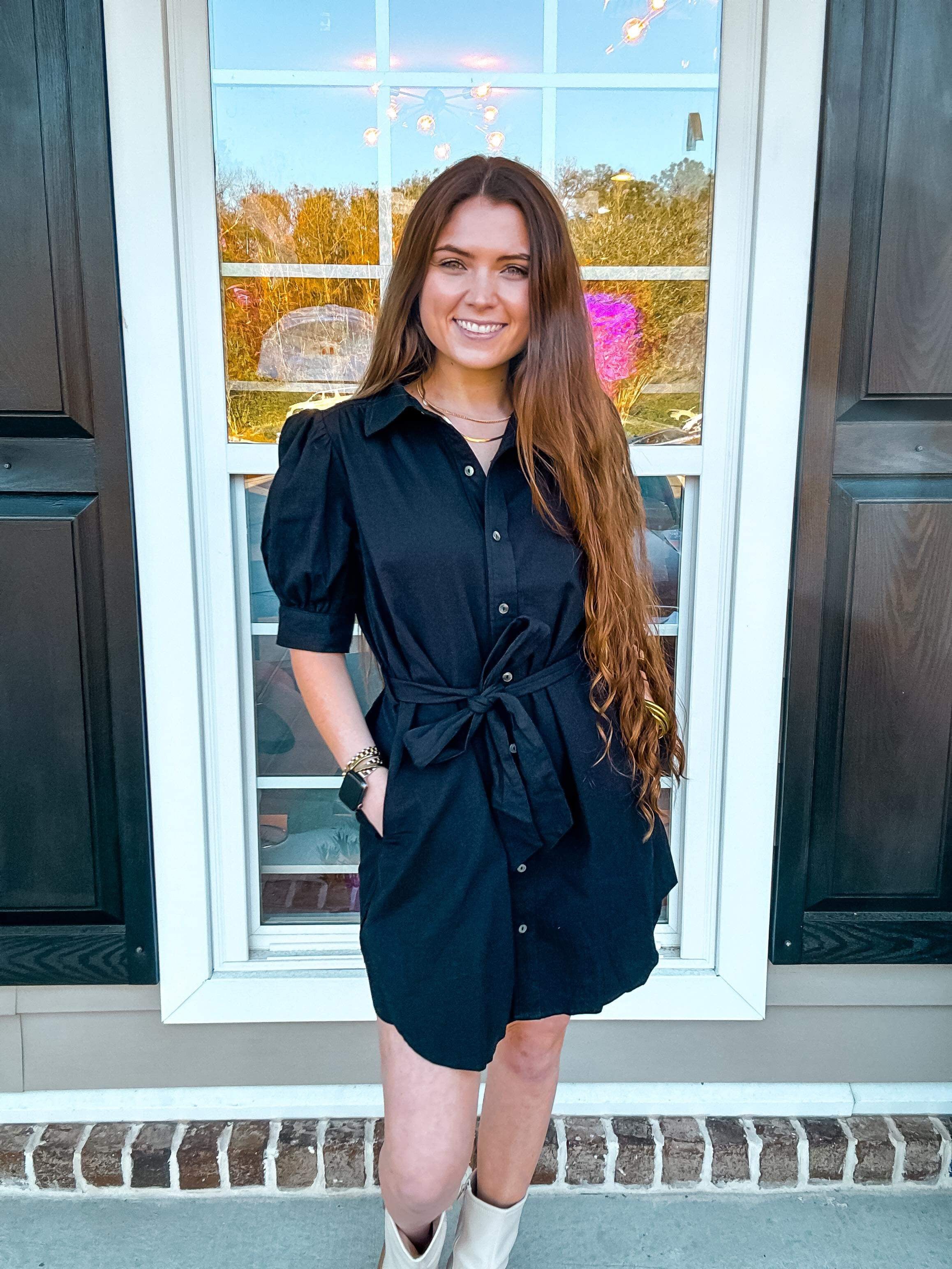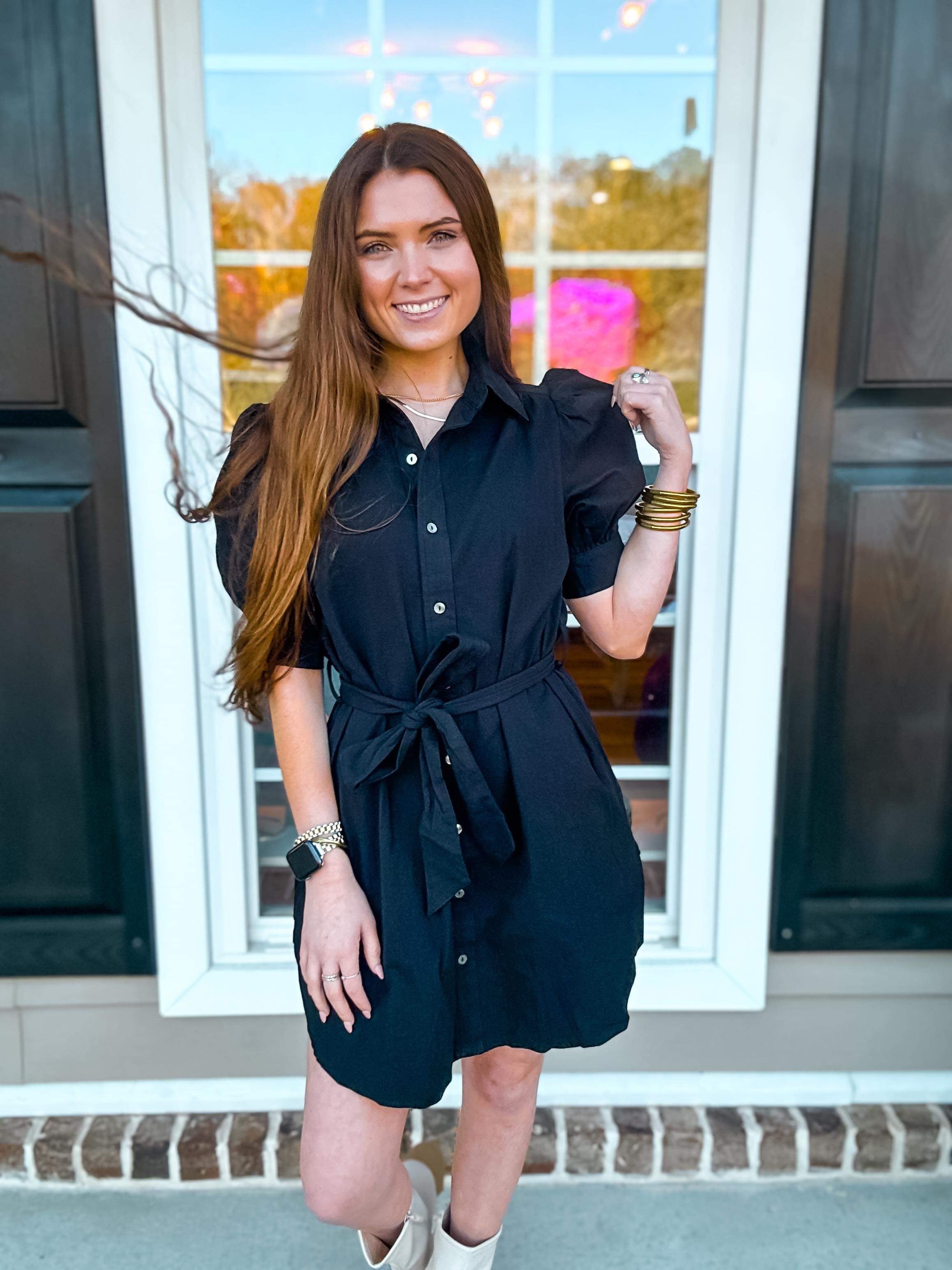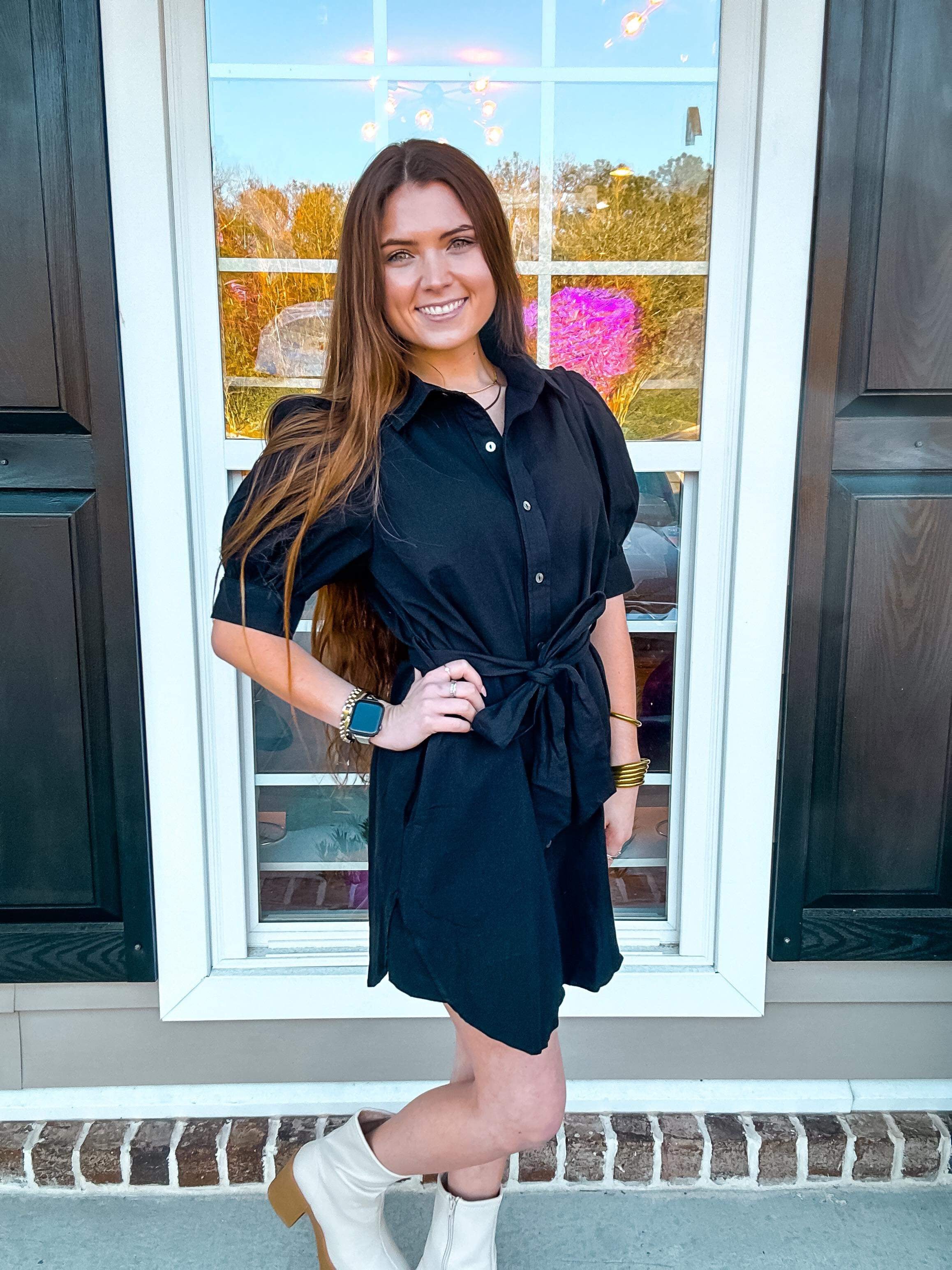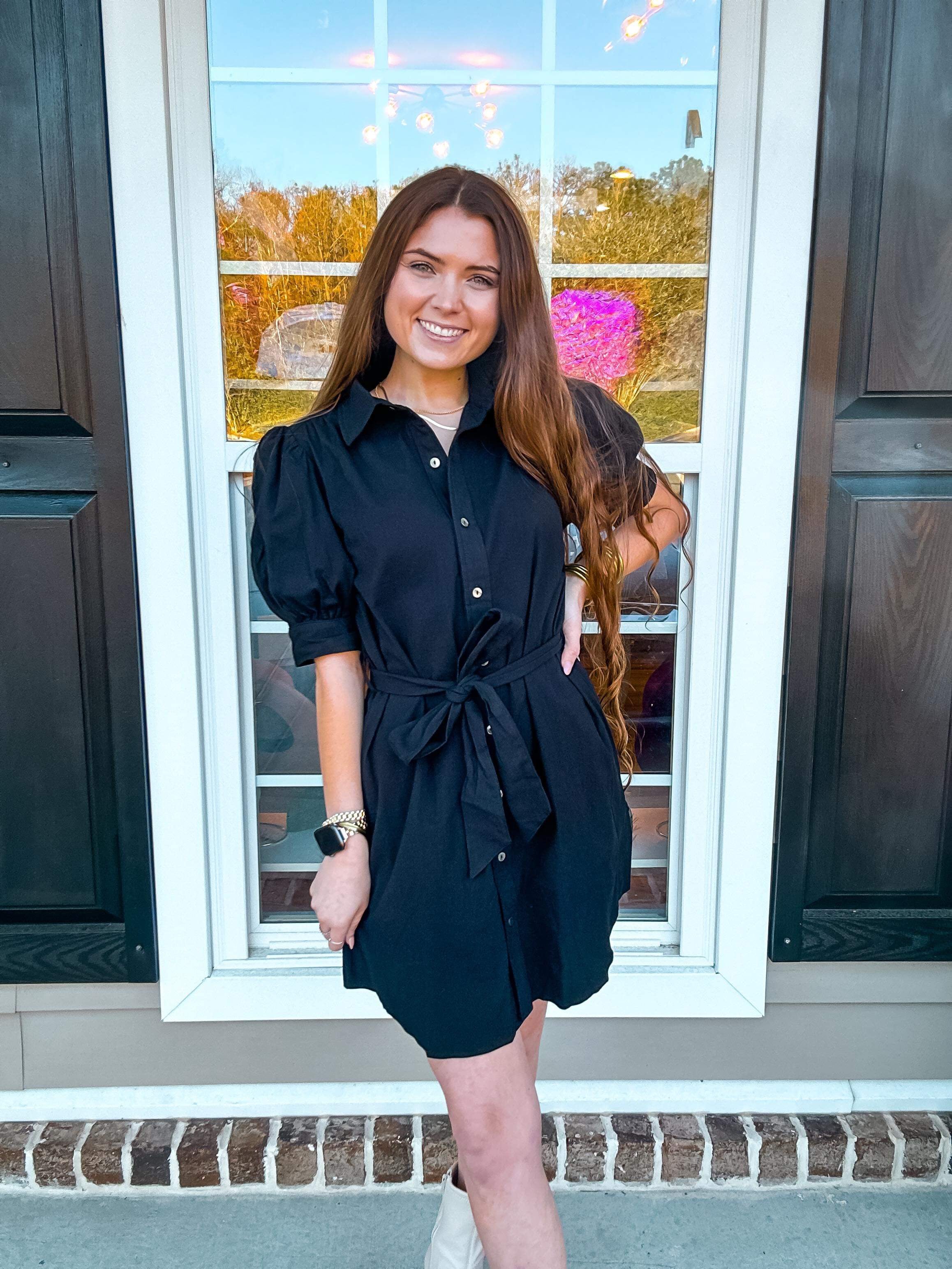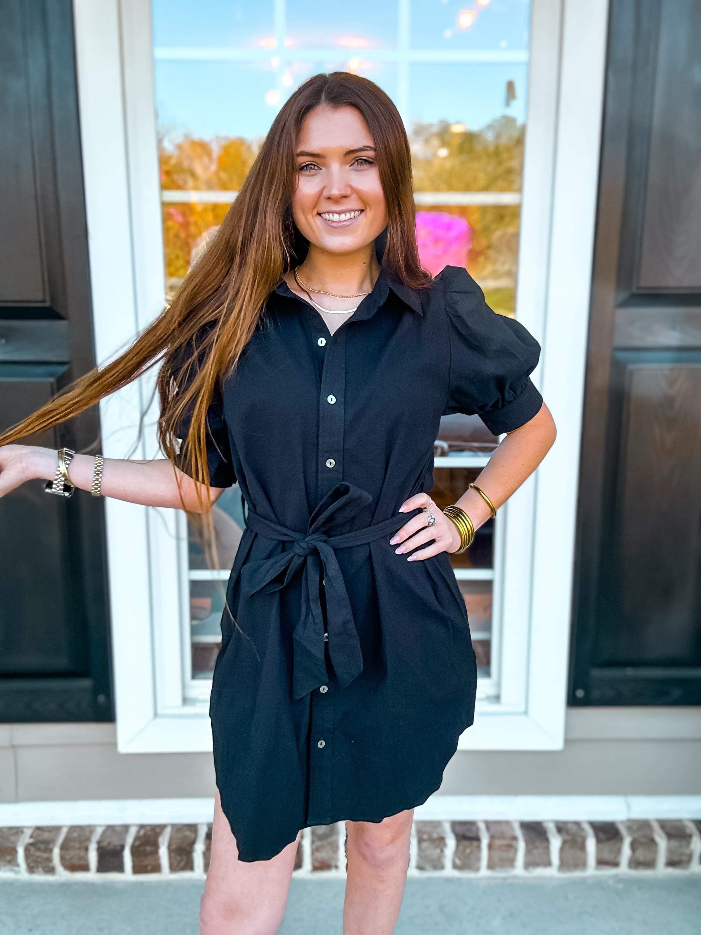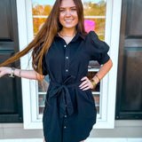 Solid collared button-up short sleeve mini dress featuring self-tie at waist. Belt loops at side. Pockets at side. Button closure at cuff. Unlined. Woven. Non-sheer. Lightweight.