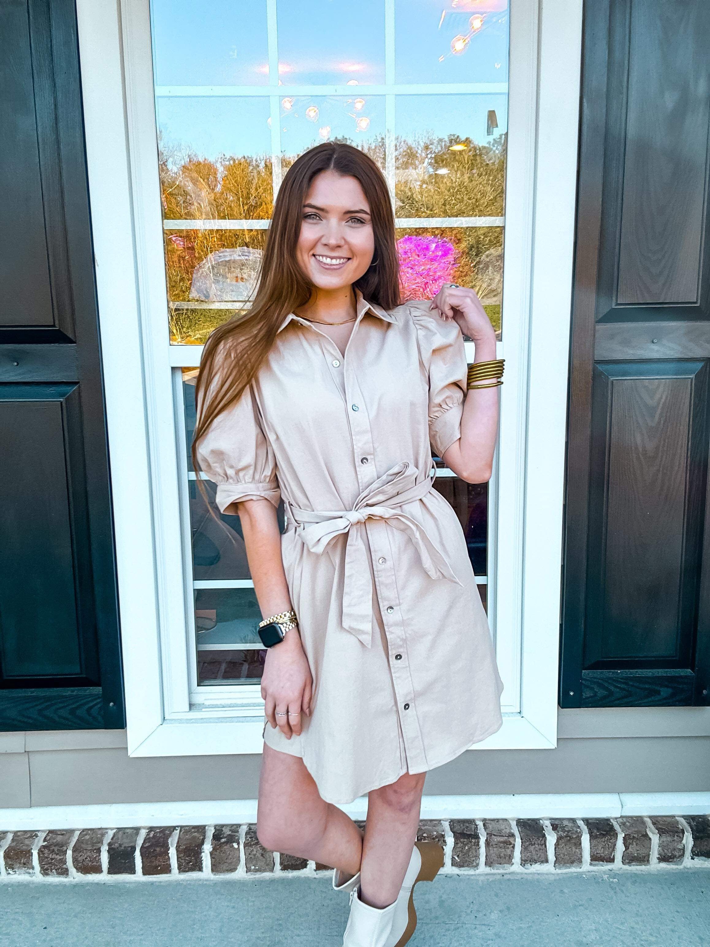Solid collared button-up short sleeve mini dress featuring self-tie at waist. Belt loops at side. Pockets at side. Button closure at cuff. Unlined. Woven. Non-sheer. Lightweight.
