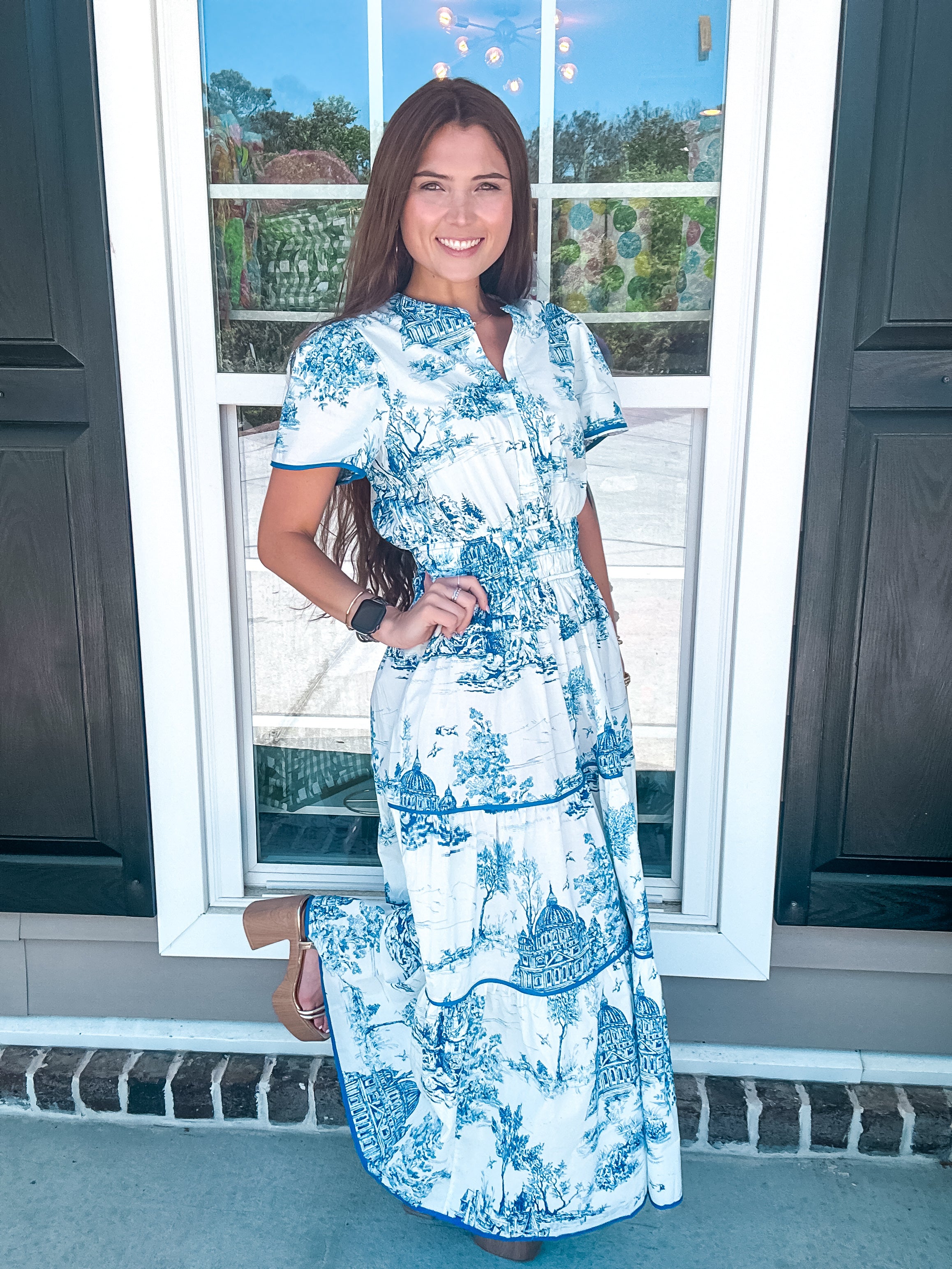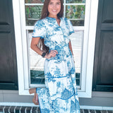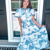Introducing our Coastal Serenity Toile Midi Dress, where timeless elegance meets coastal charm. Crafted with a delicate toile print in soothing shades of blue, this midi-length dress effortlessly captures the essence of seaside tranquility. Whether strolling along the shore or attending a garden party, embrace the epitome of relaxed sophistication with every step. Elevate your wardrobe with this quintessential piece that exudes effortless style and coastal vibes.